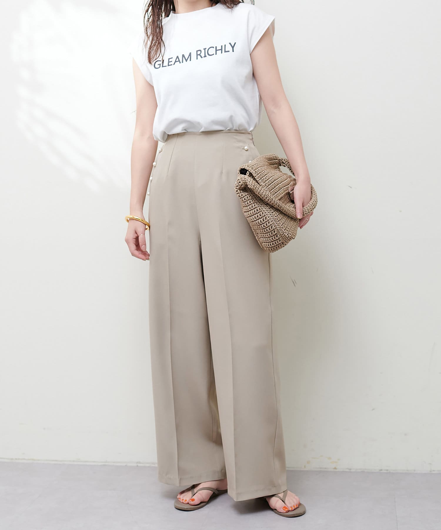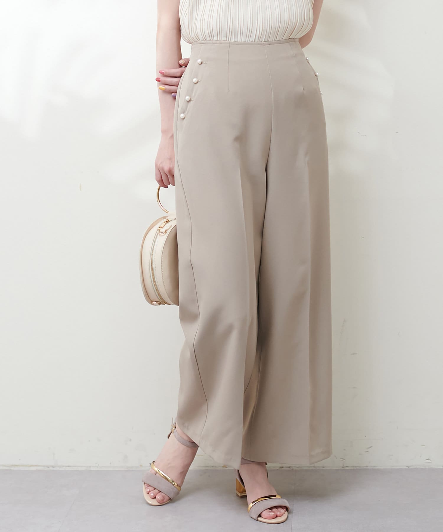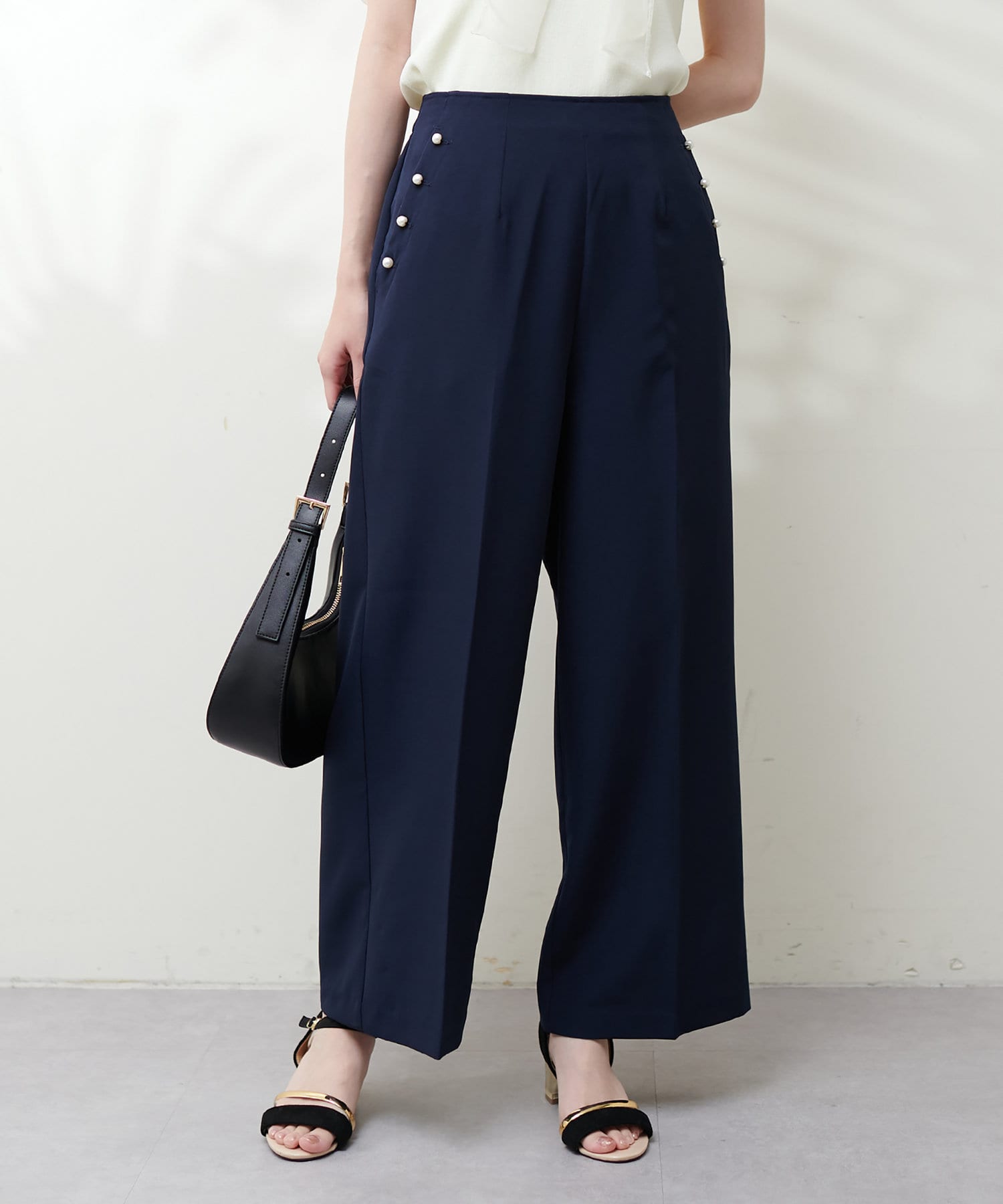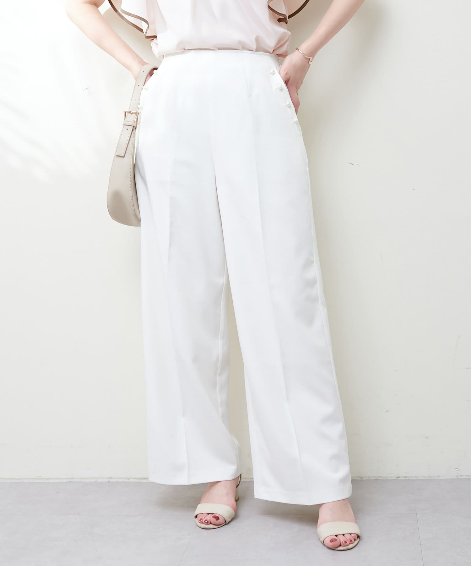 フロントのポケットに沿って施したパールがスタイリングに華やかさをプラスしてくれるストレートパンツ。