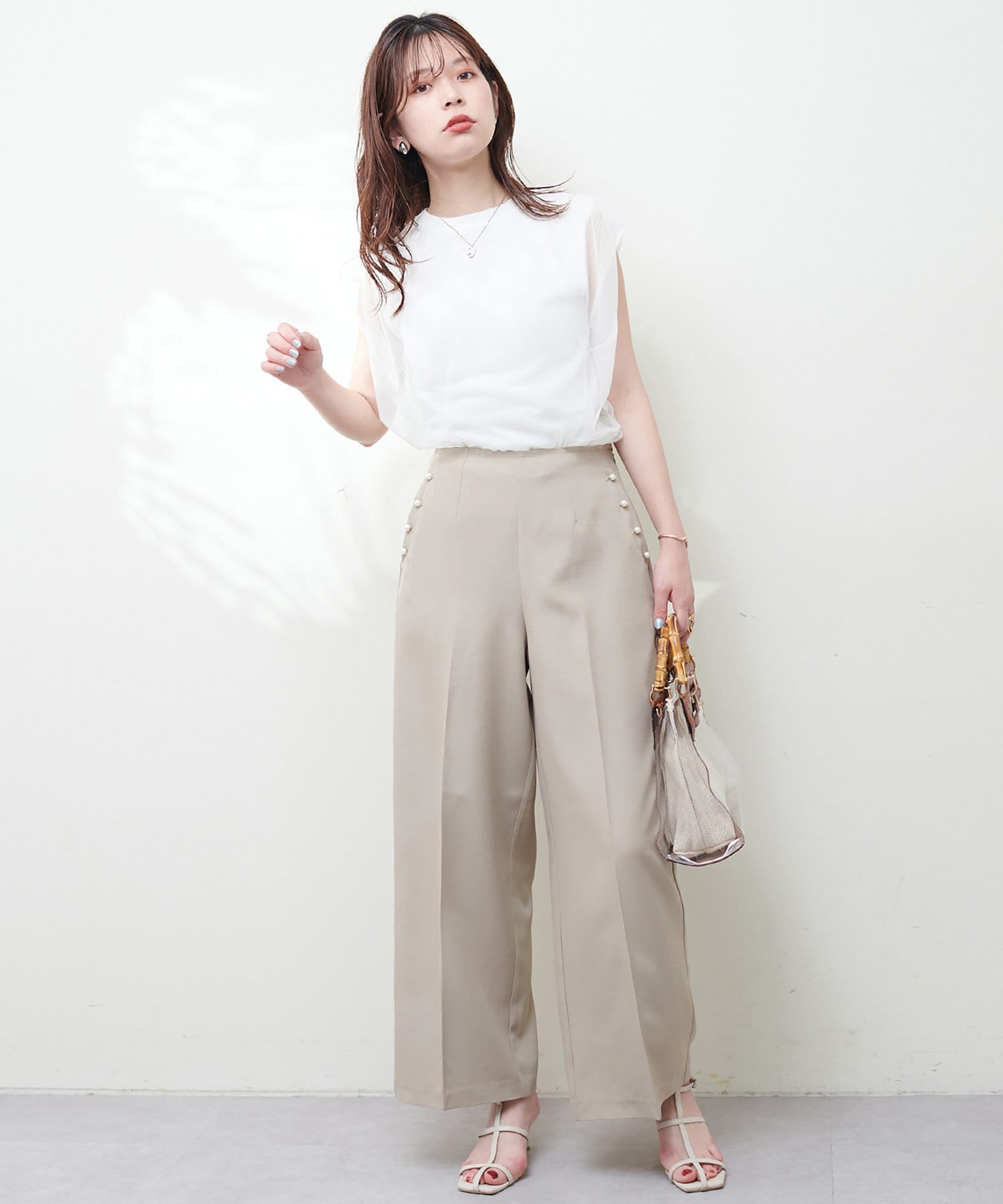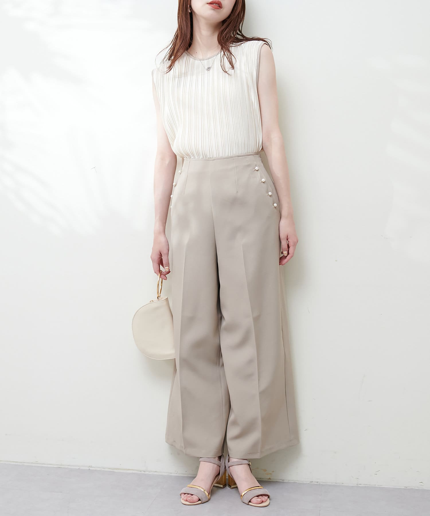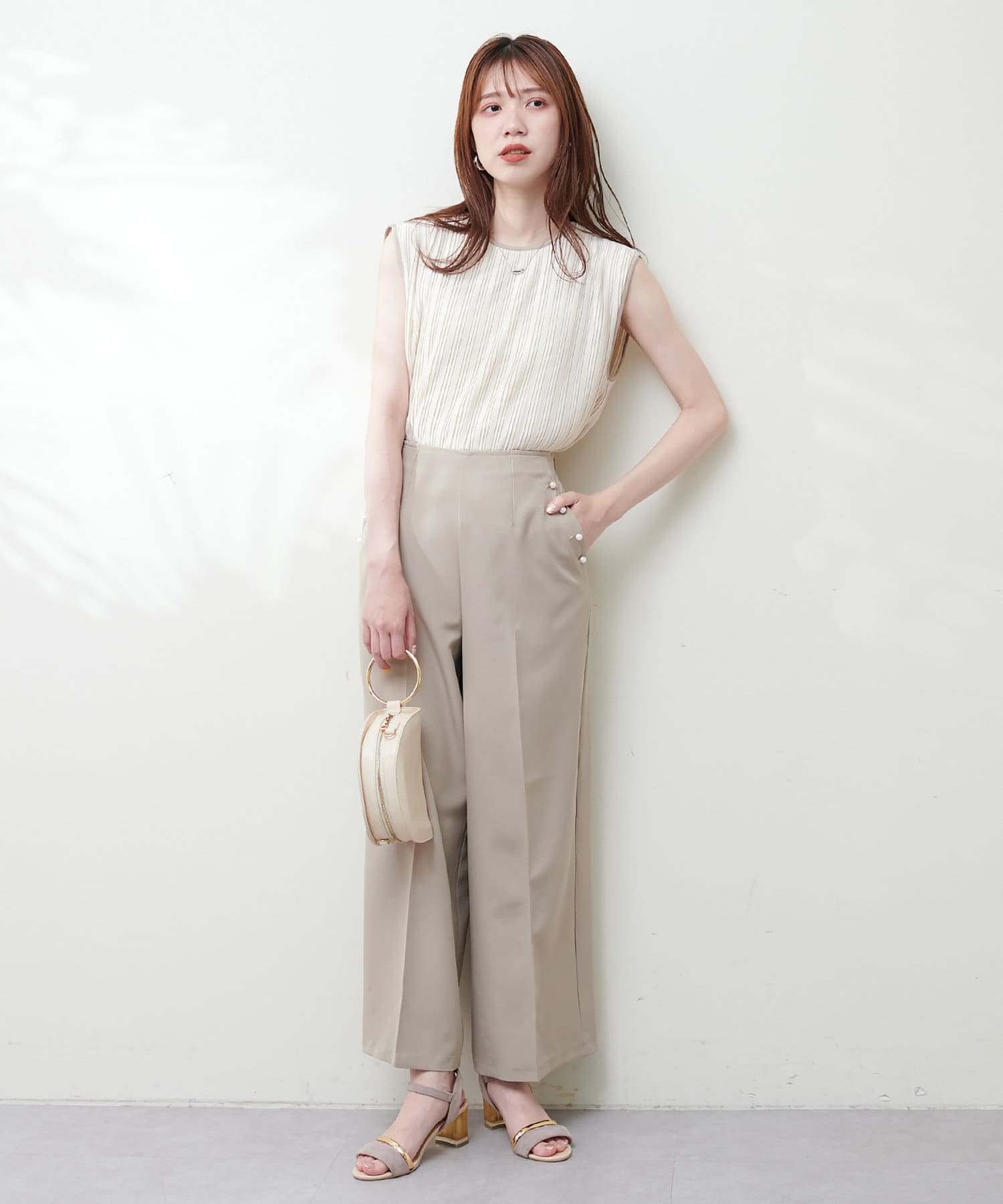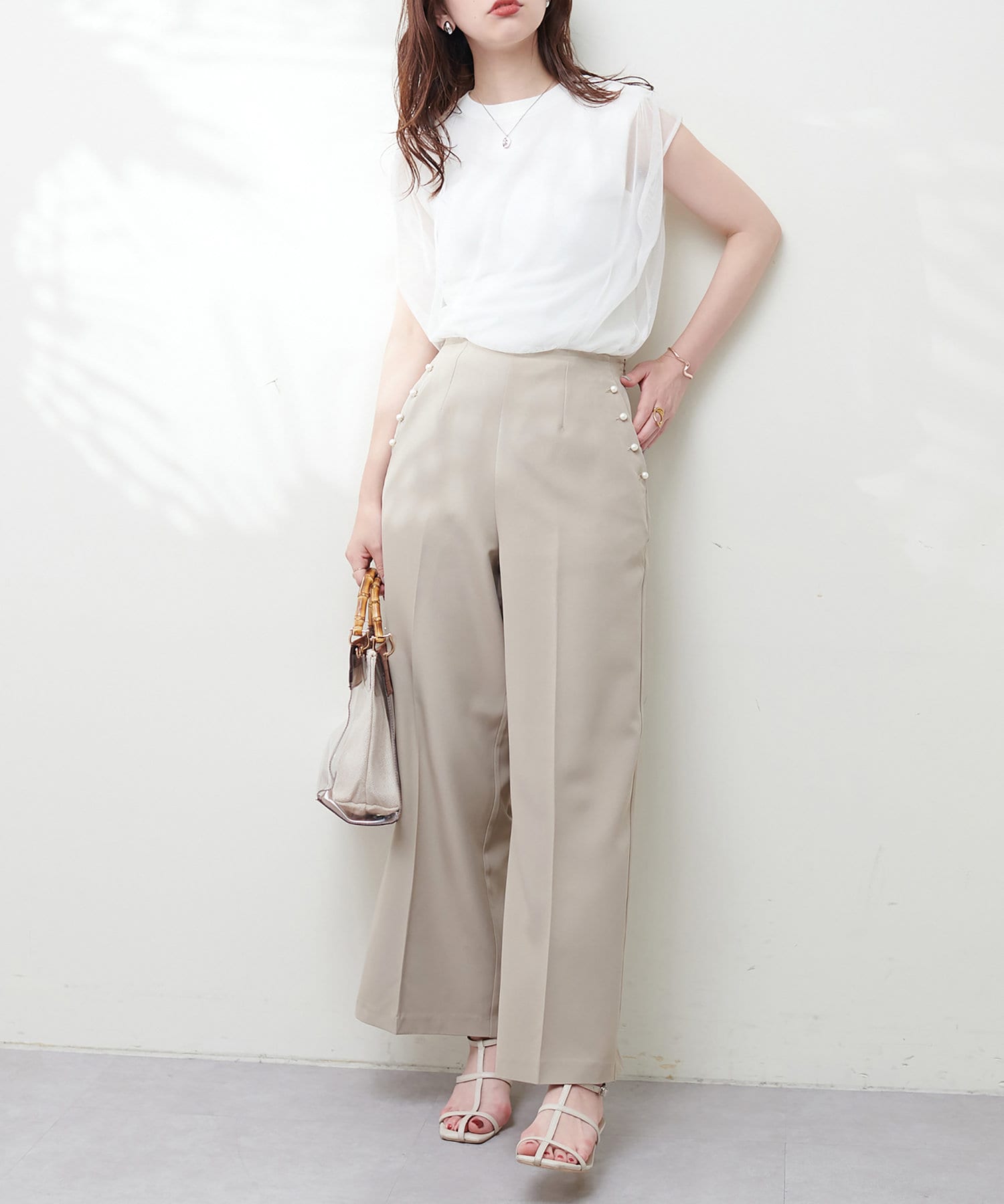 フロントのポケットに沿って施したパールがスタイリングに華やかさをプラスしてくれるストレートパンツ。