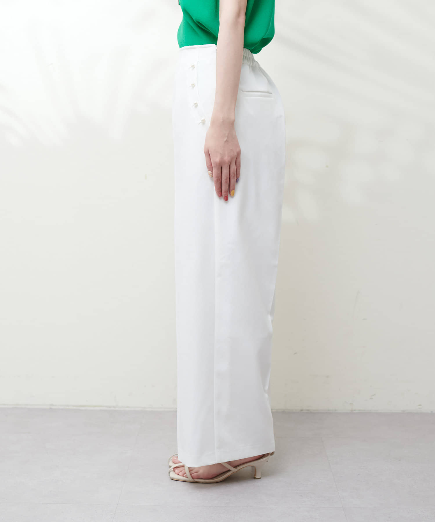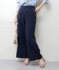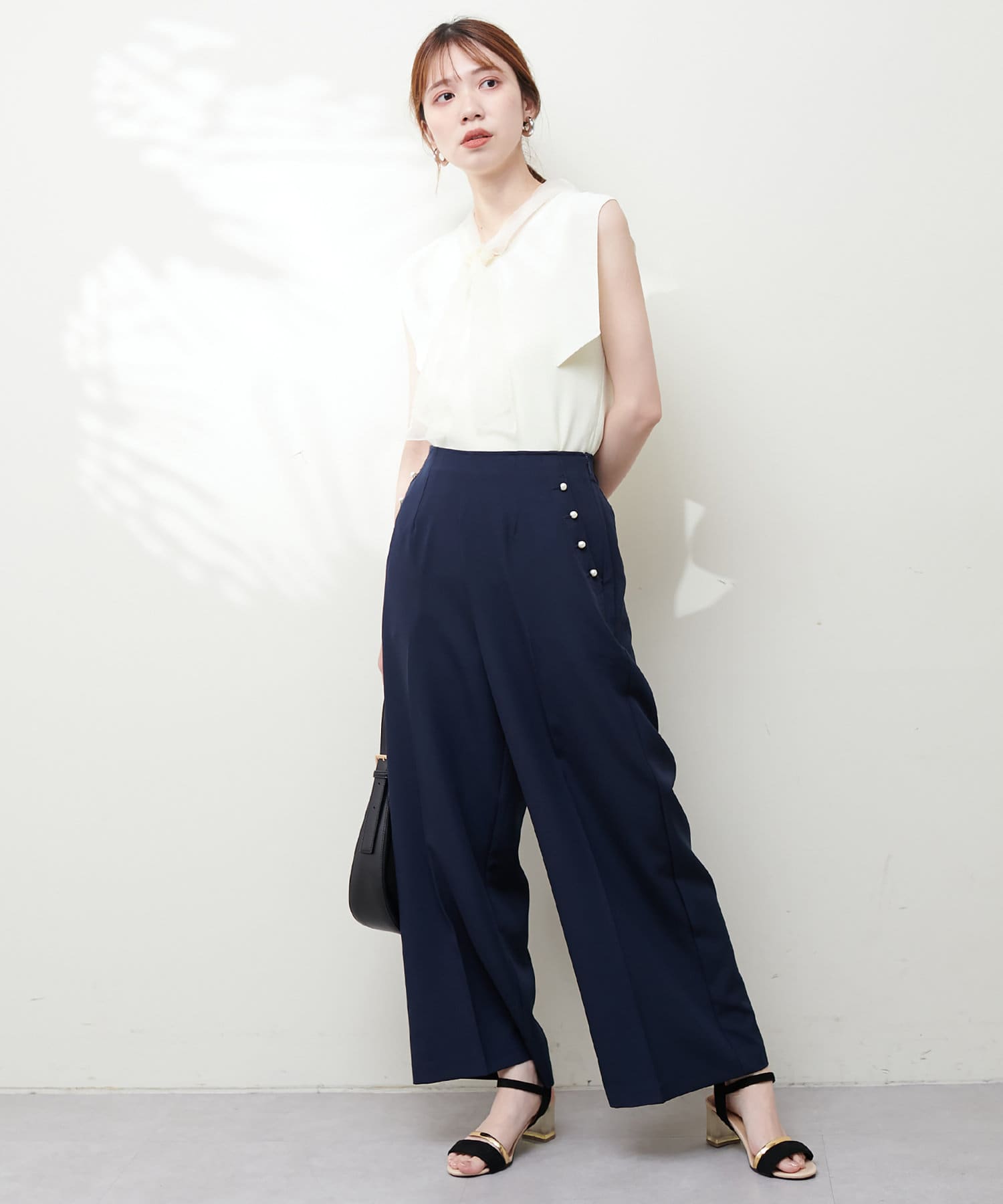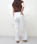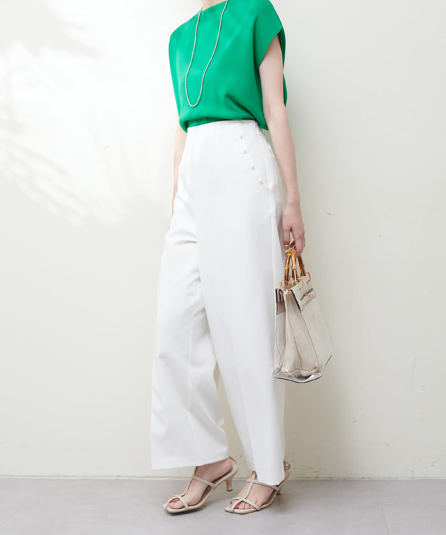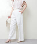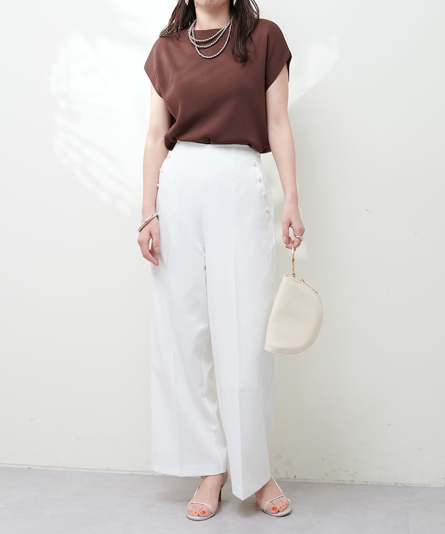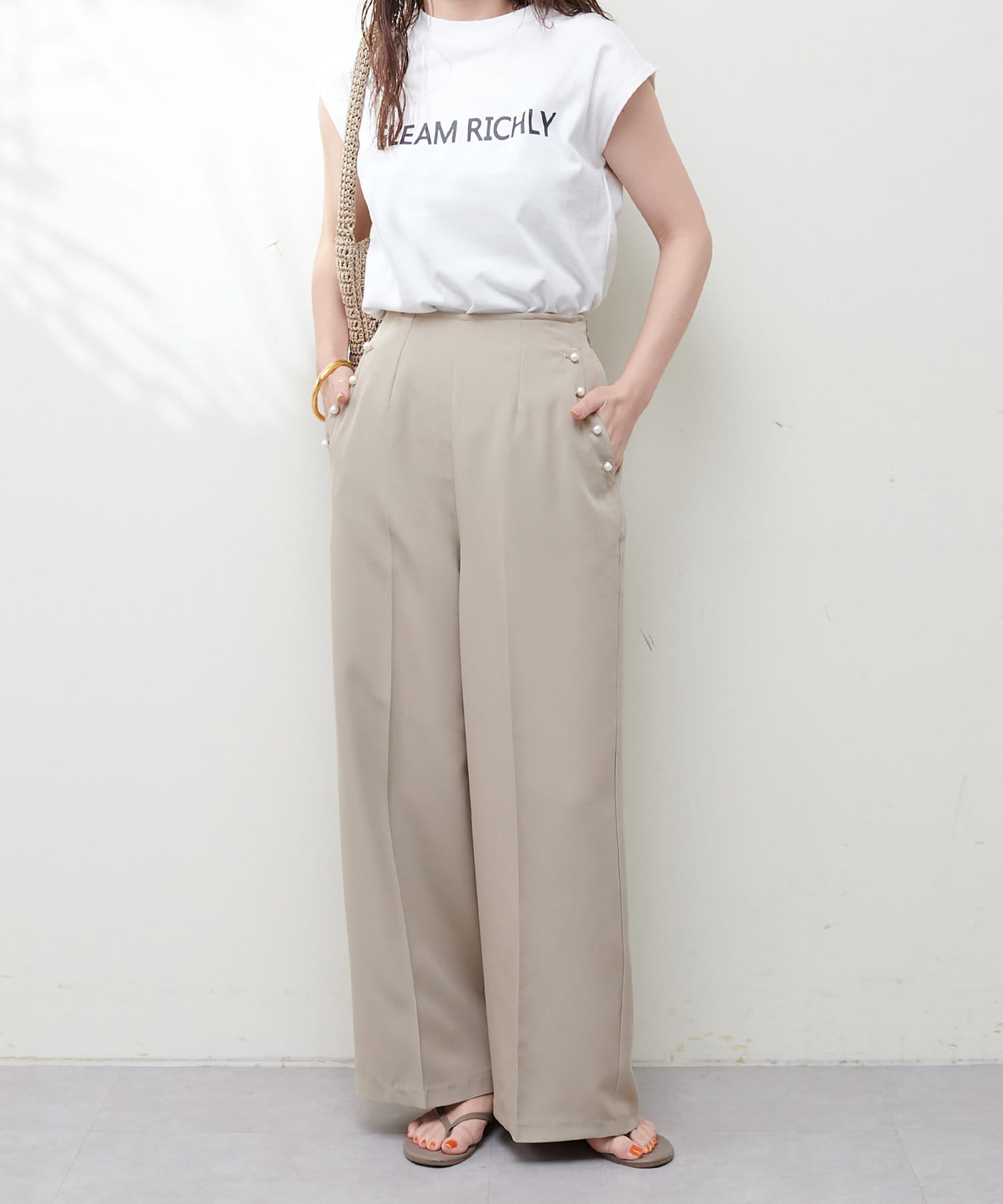 フロントのポケットに沿って施したパールがスタイリングに華やかさをプラスしてくれるストレートパンツ。