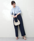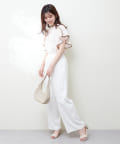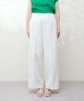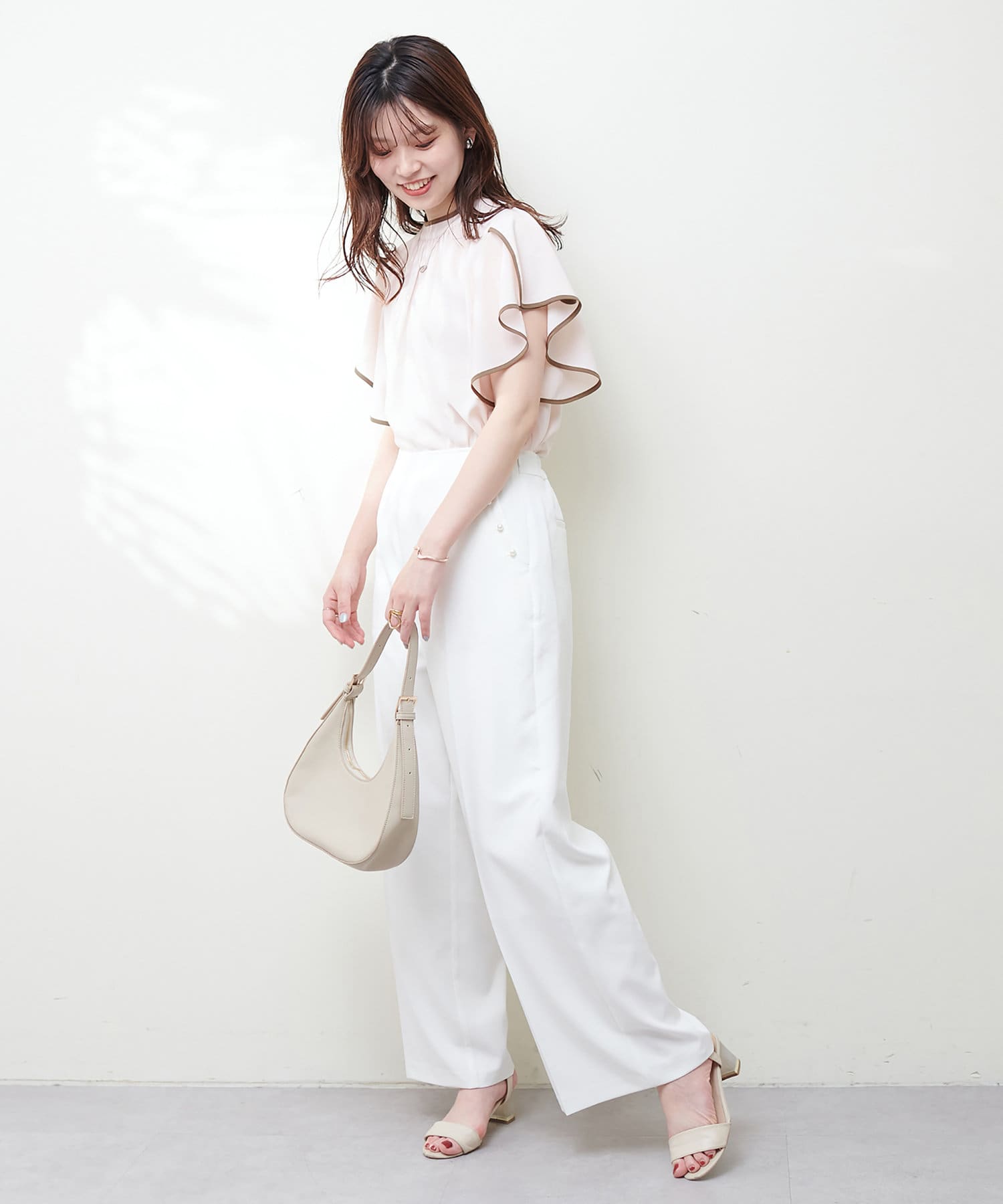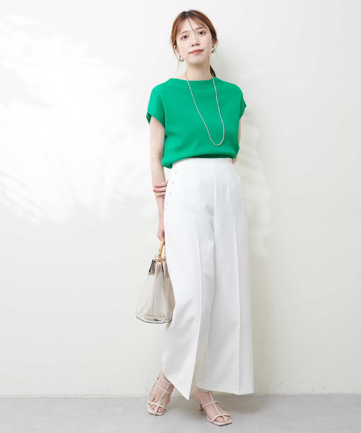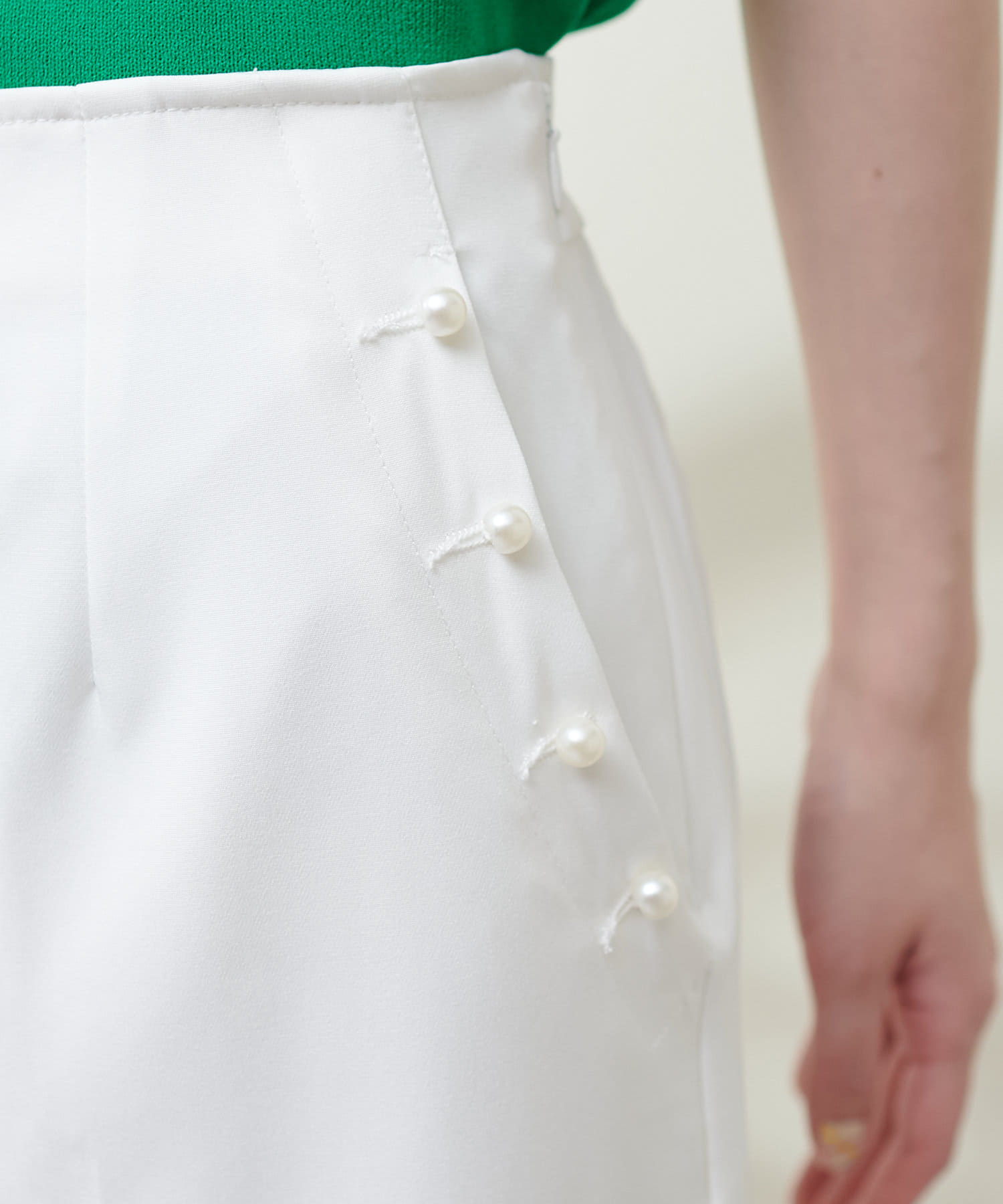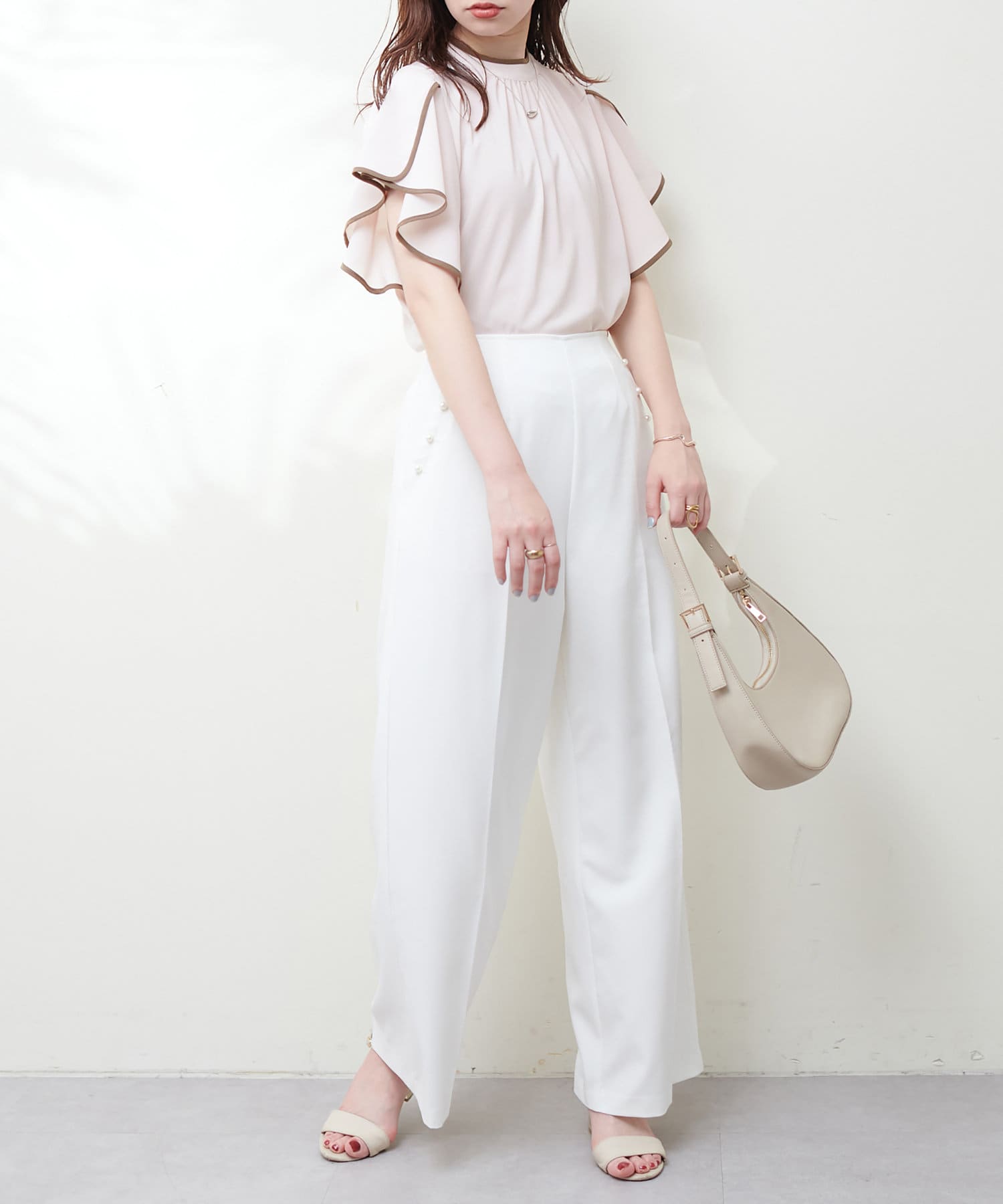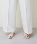 フロントのポケットに沿って施したパールがスタイリングに華やかさをプラスしてくれるストレートパンツ。