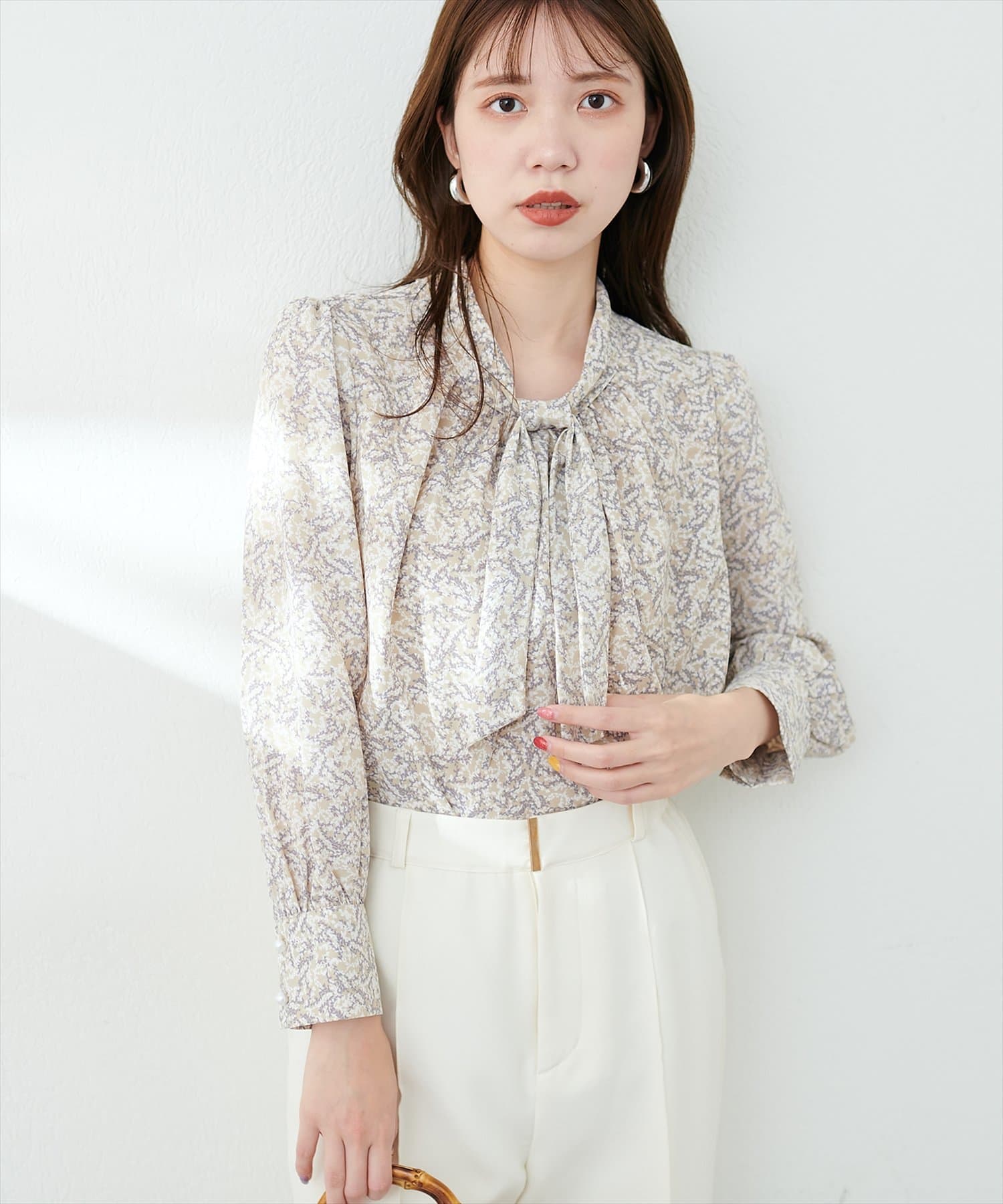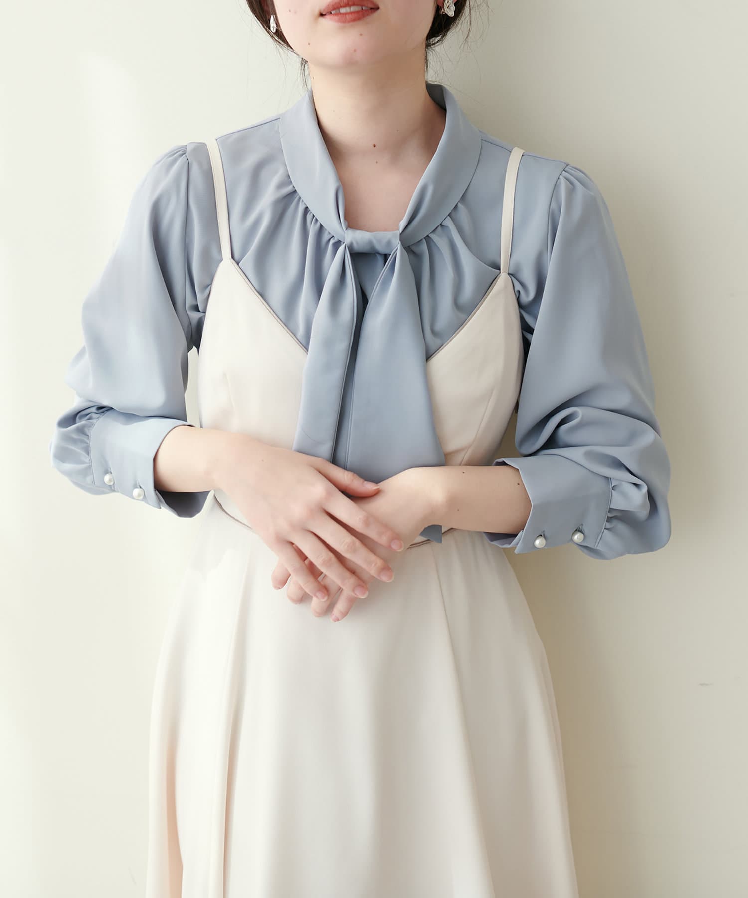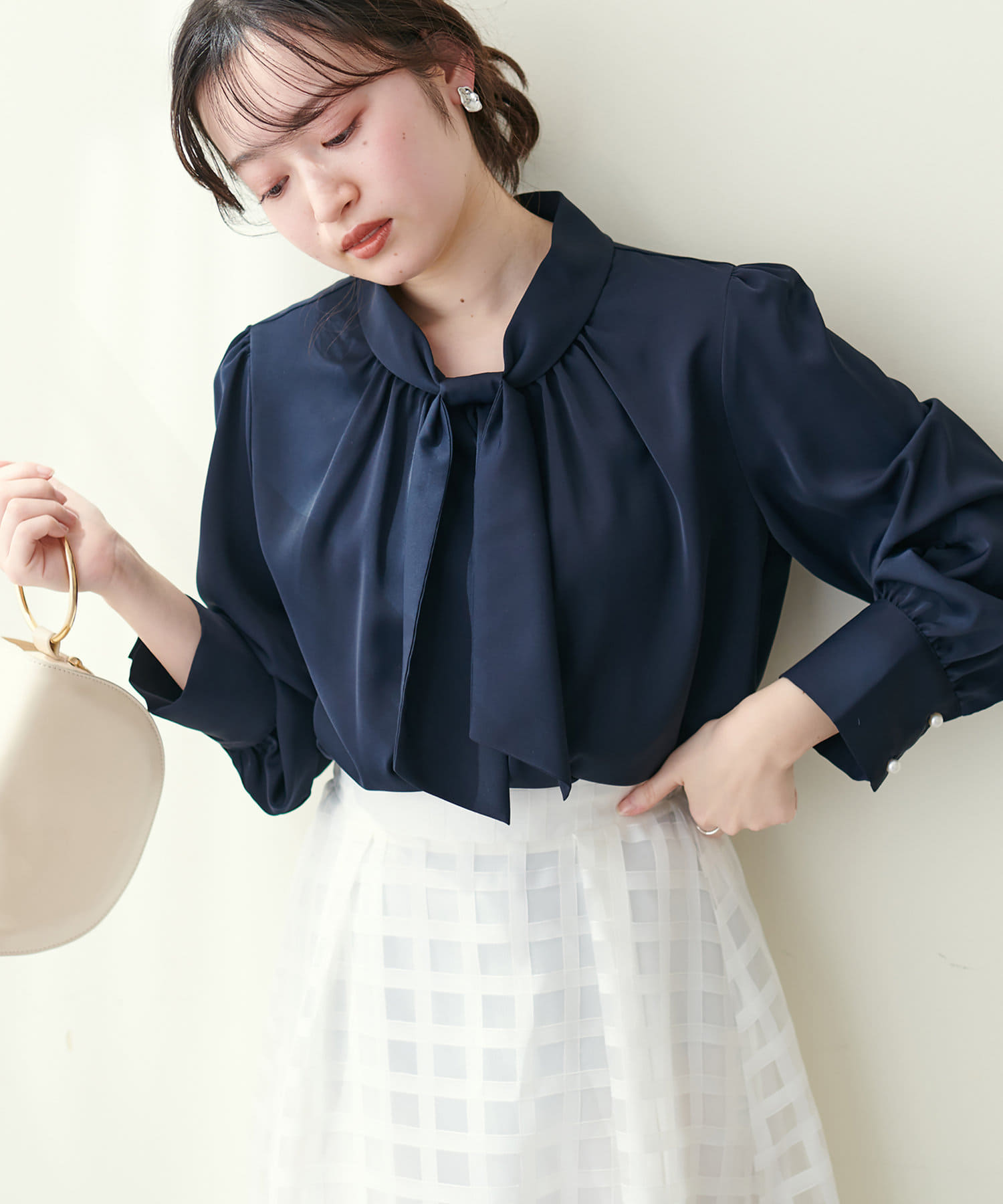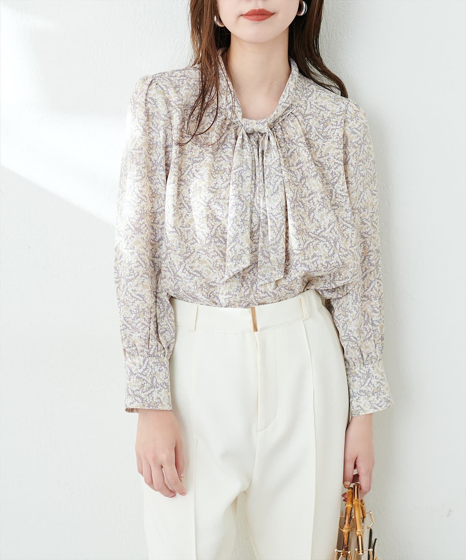 351310100 袖口パールノット結びボータイブラウス