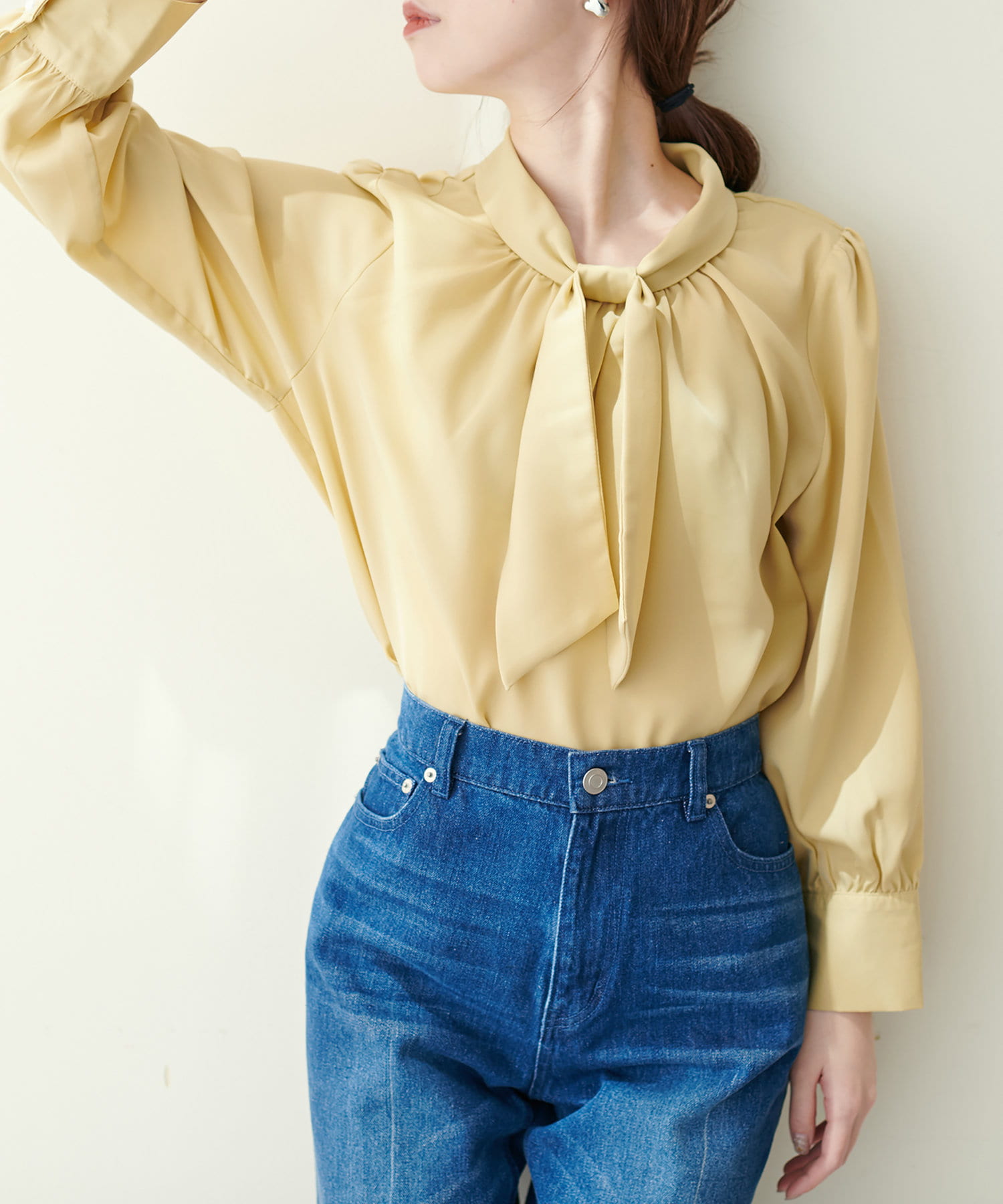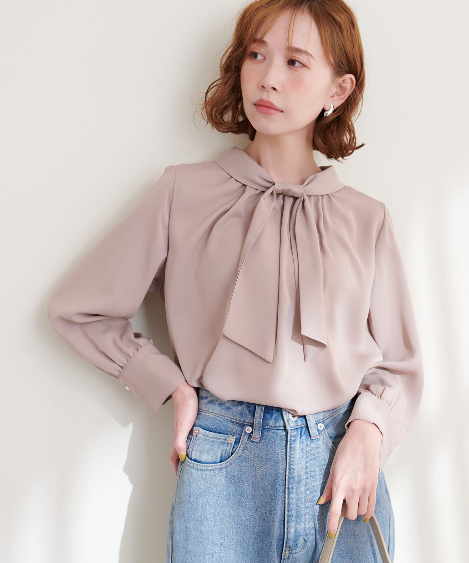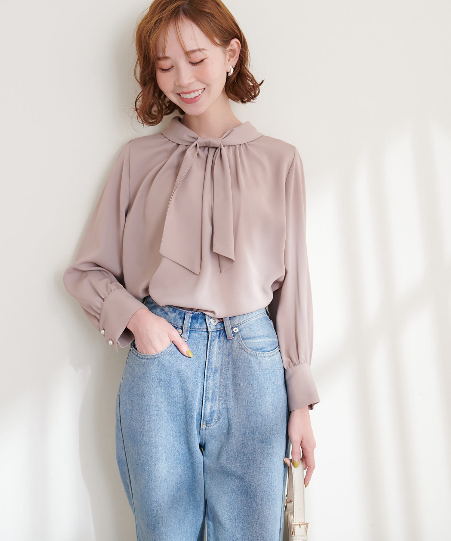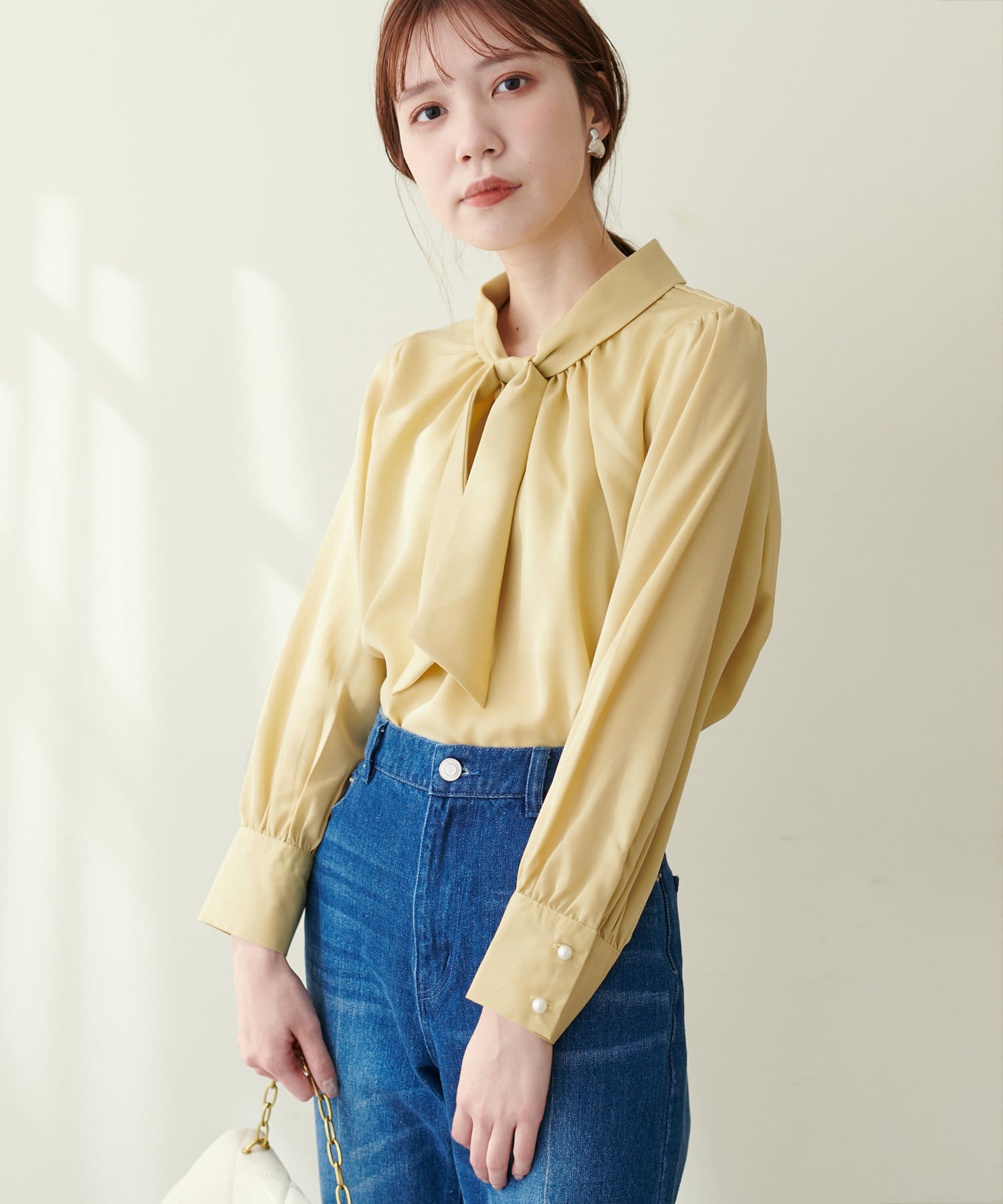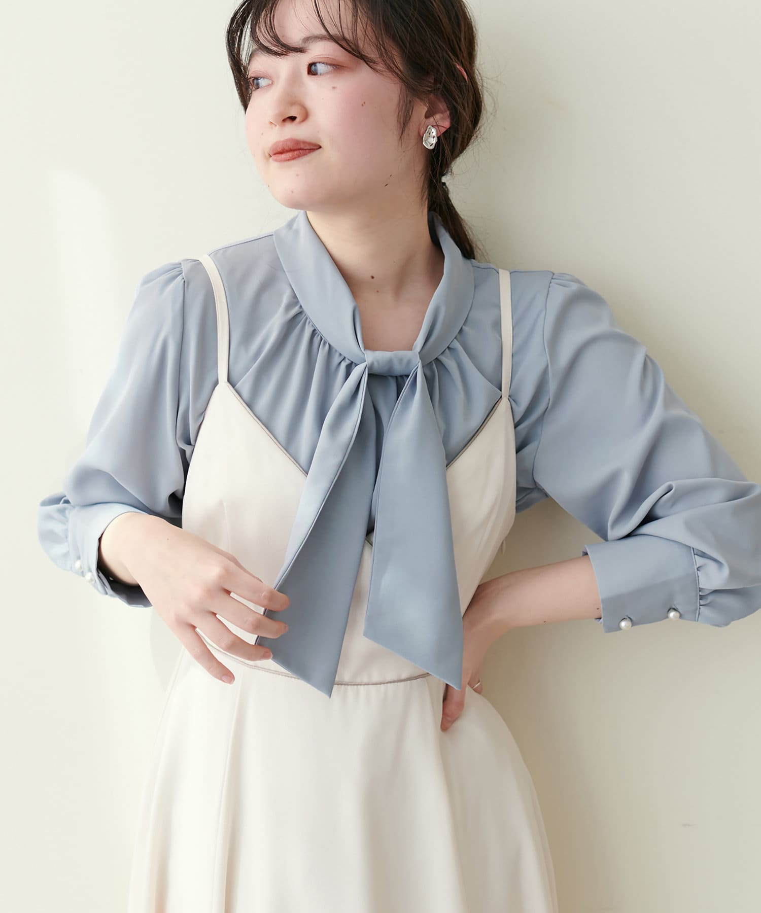 351310100 袖口パールノット結びボータイブラウス