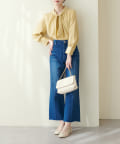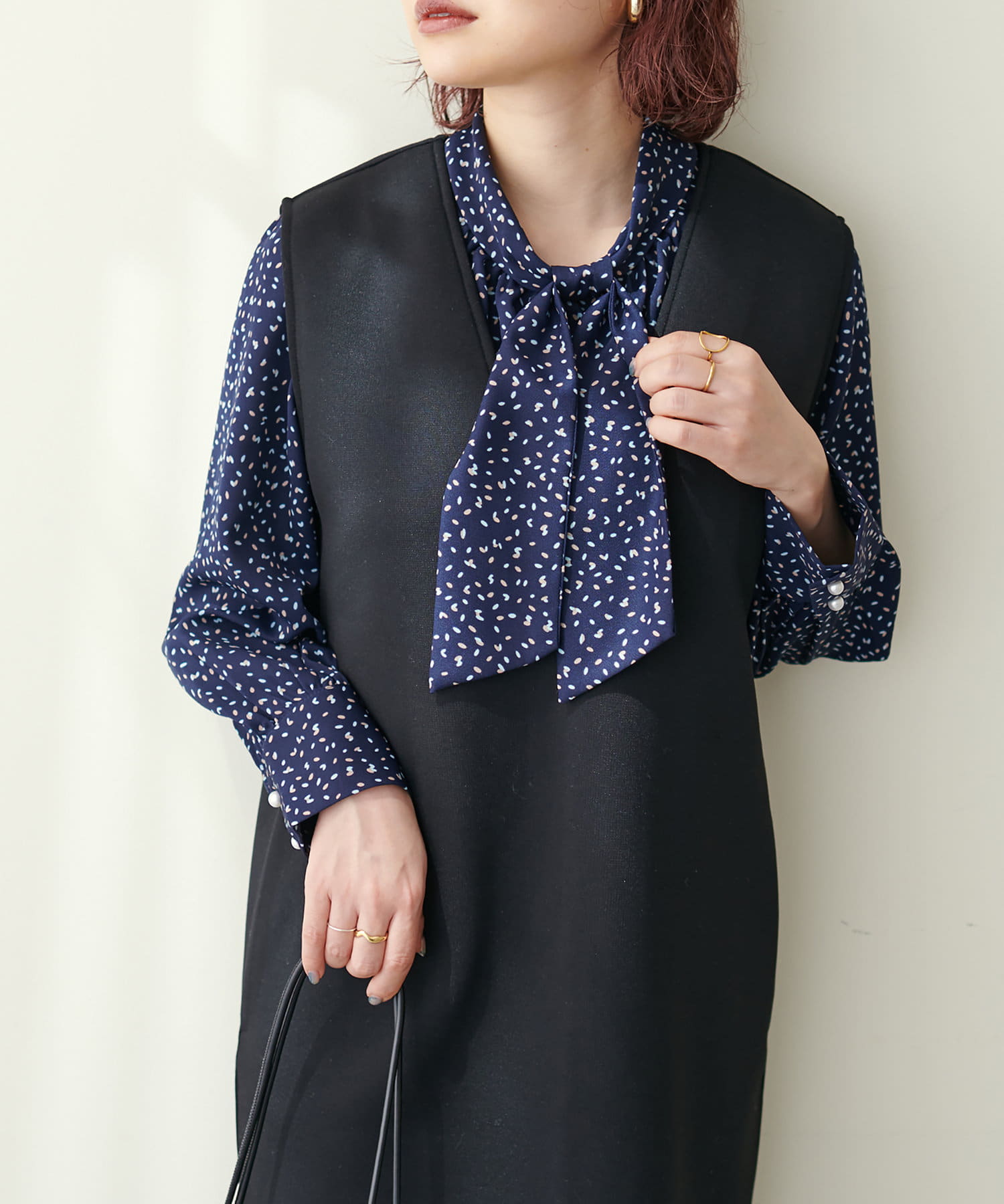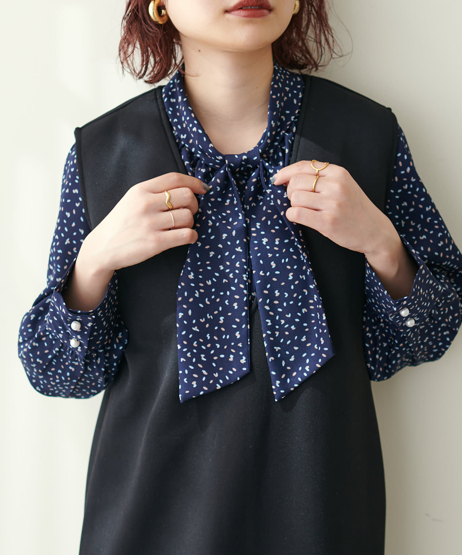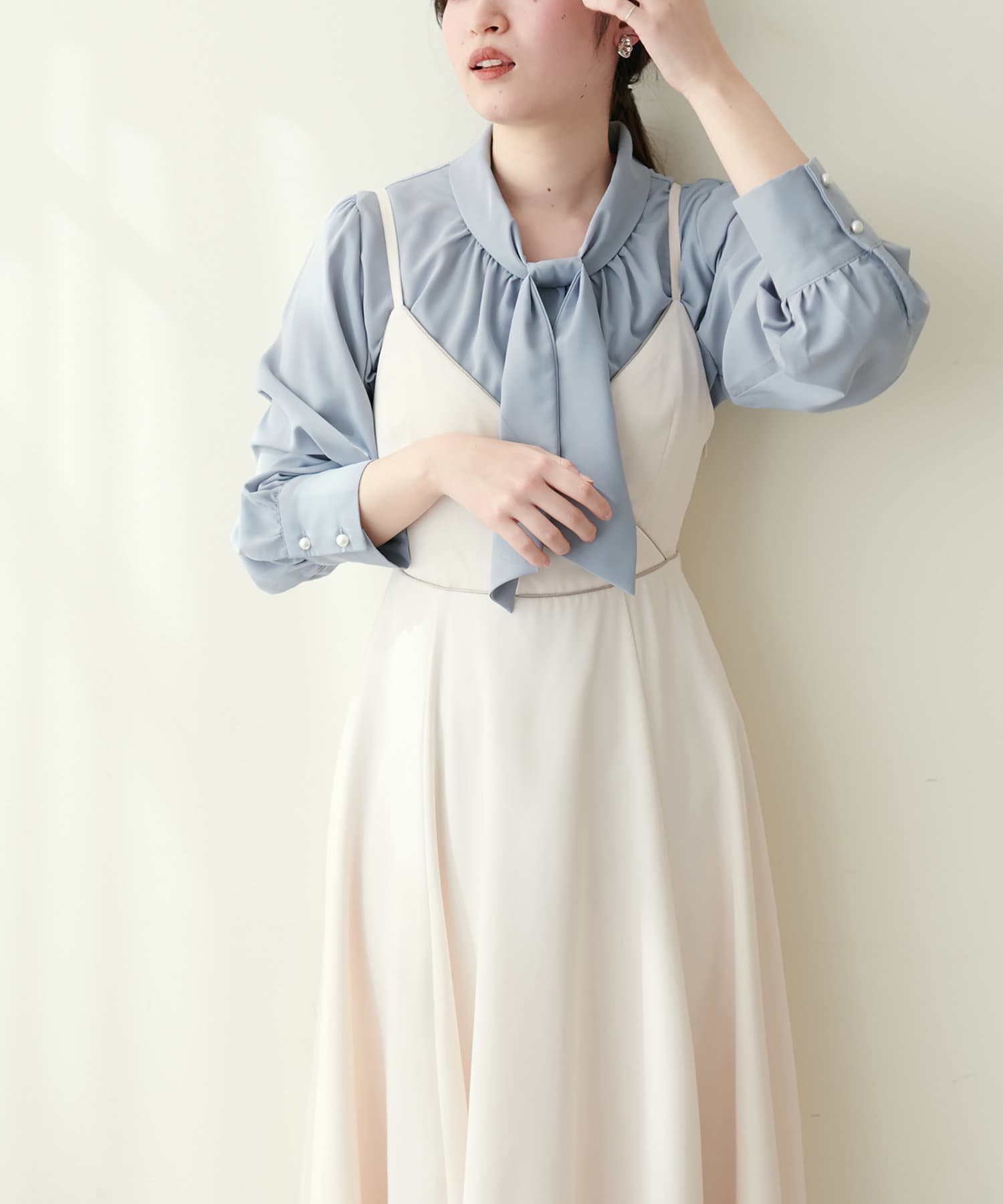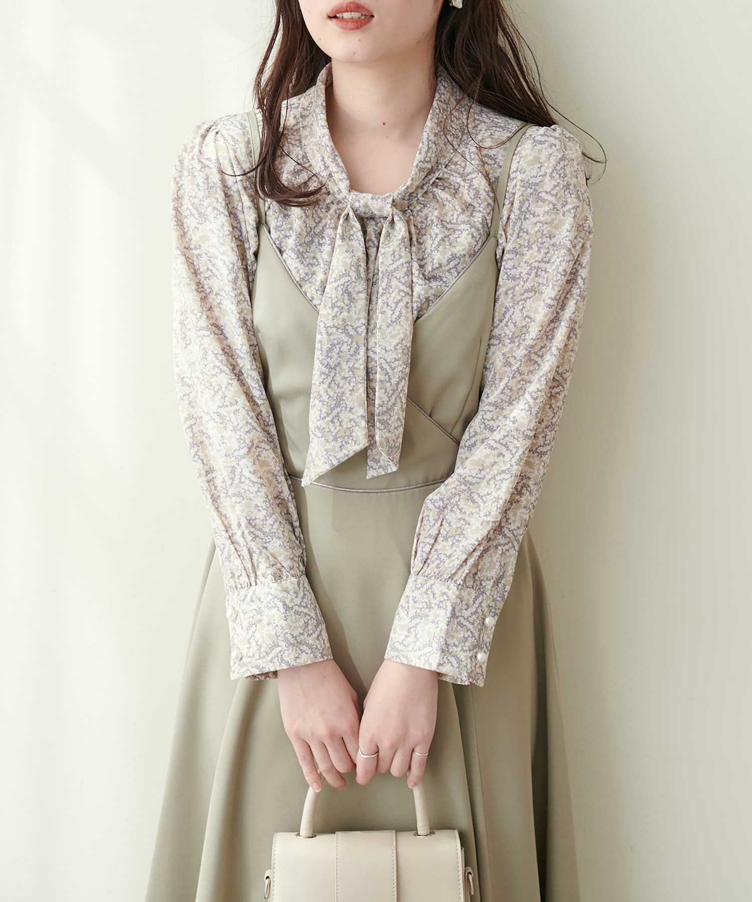 351310100 袖口パールノット結びボータイブラウス