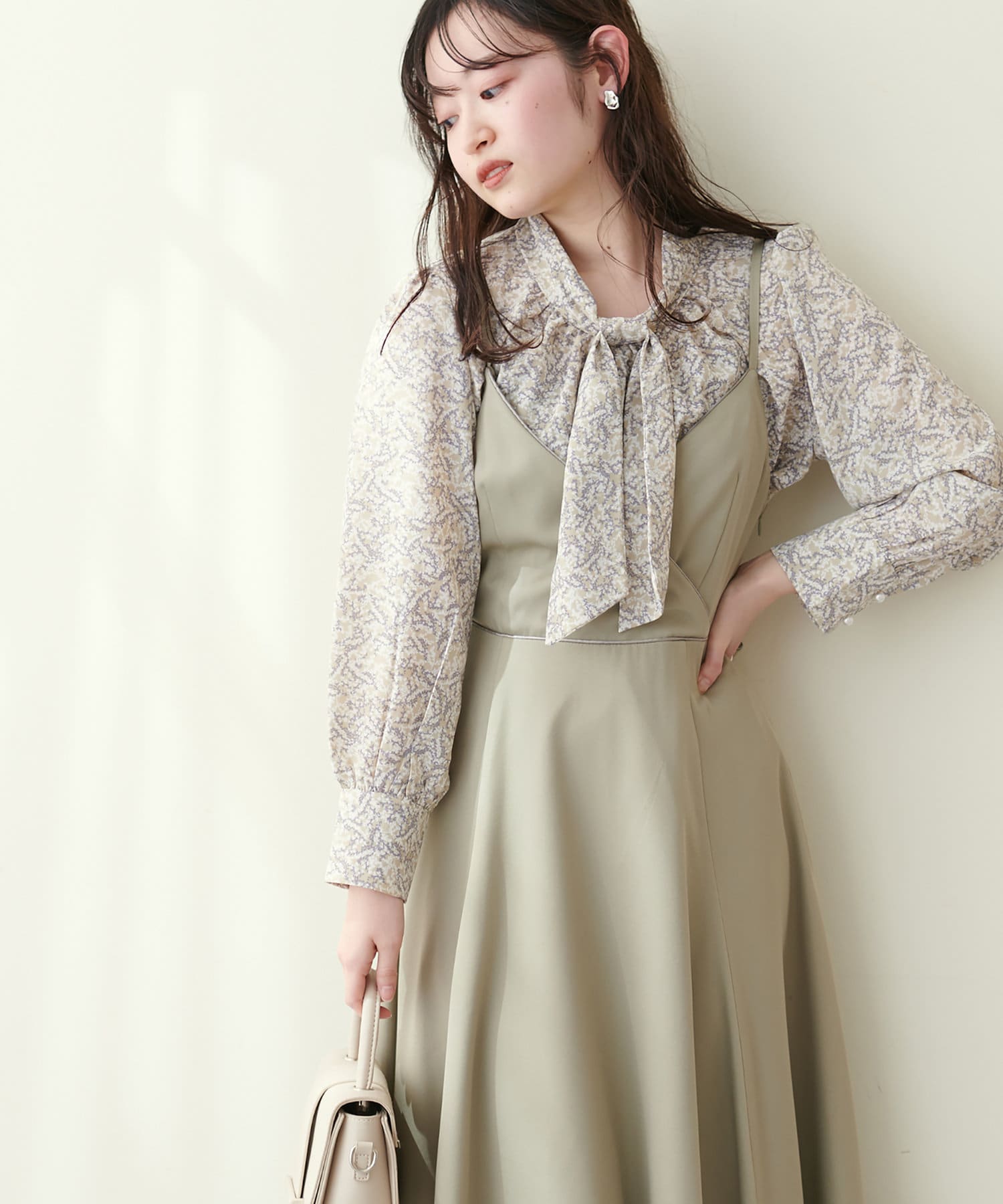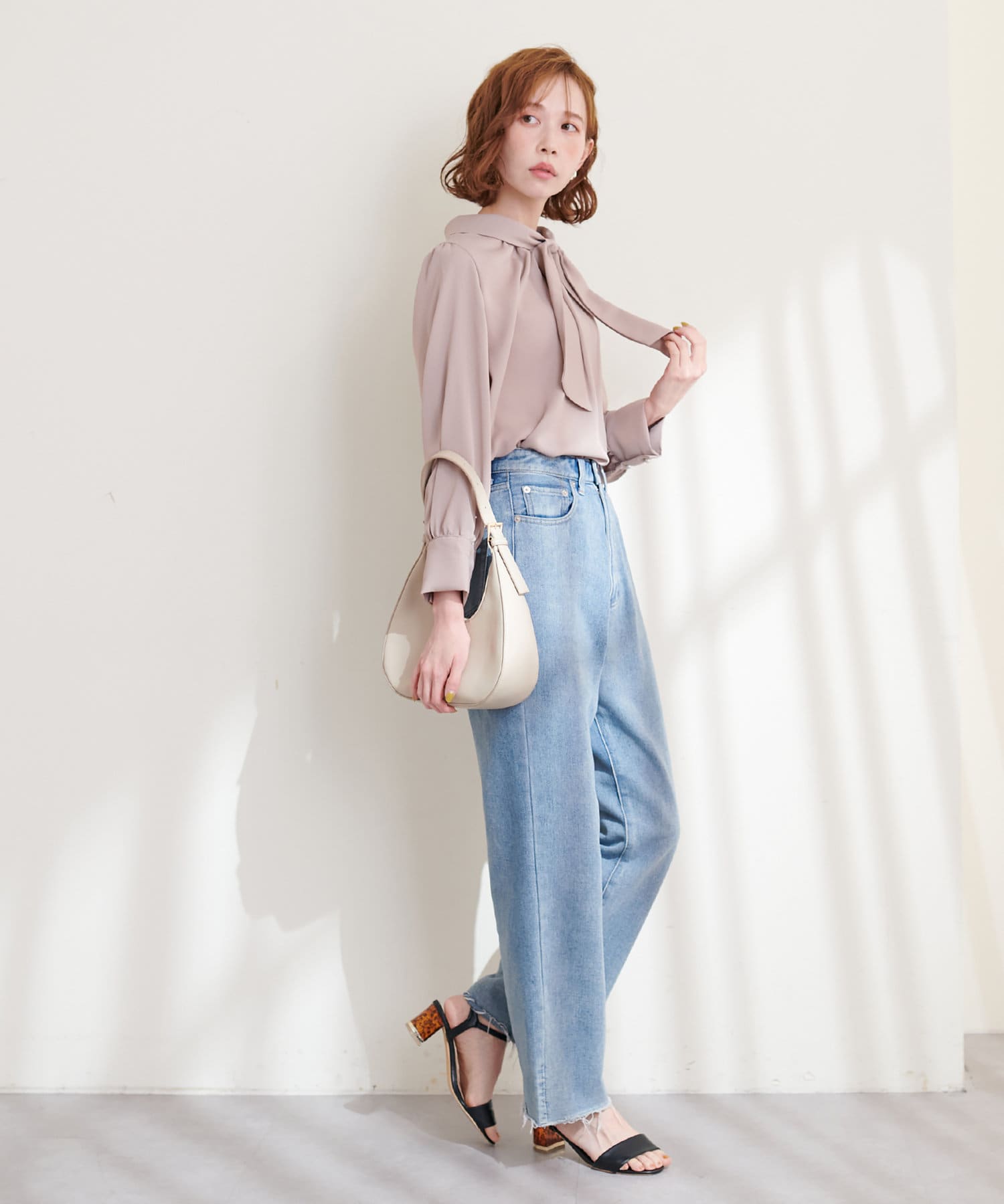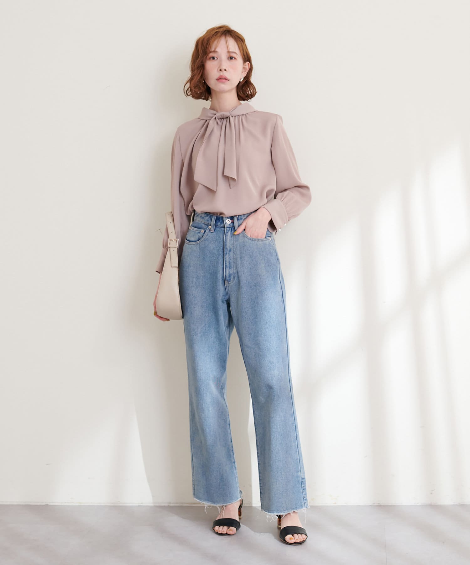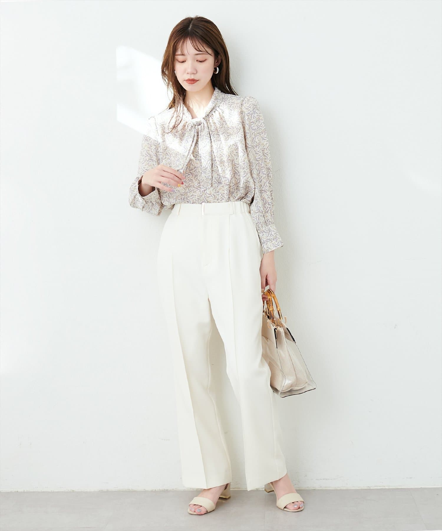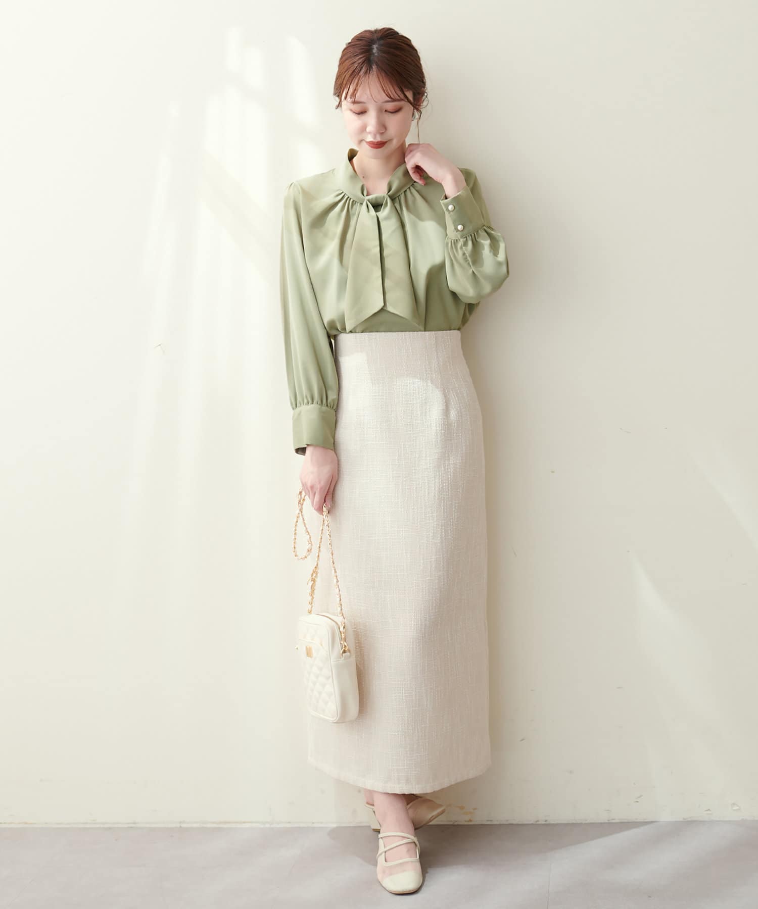 351310100 袖口パールノット結びボータイブラウス