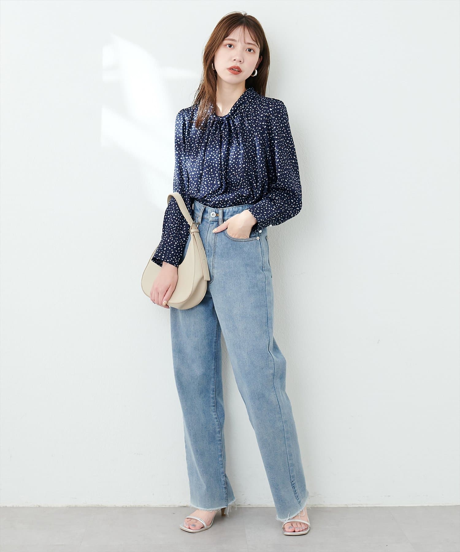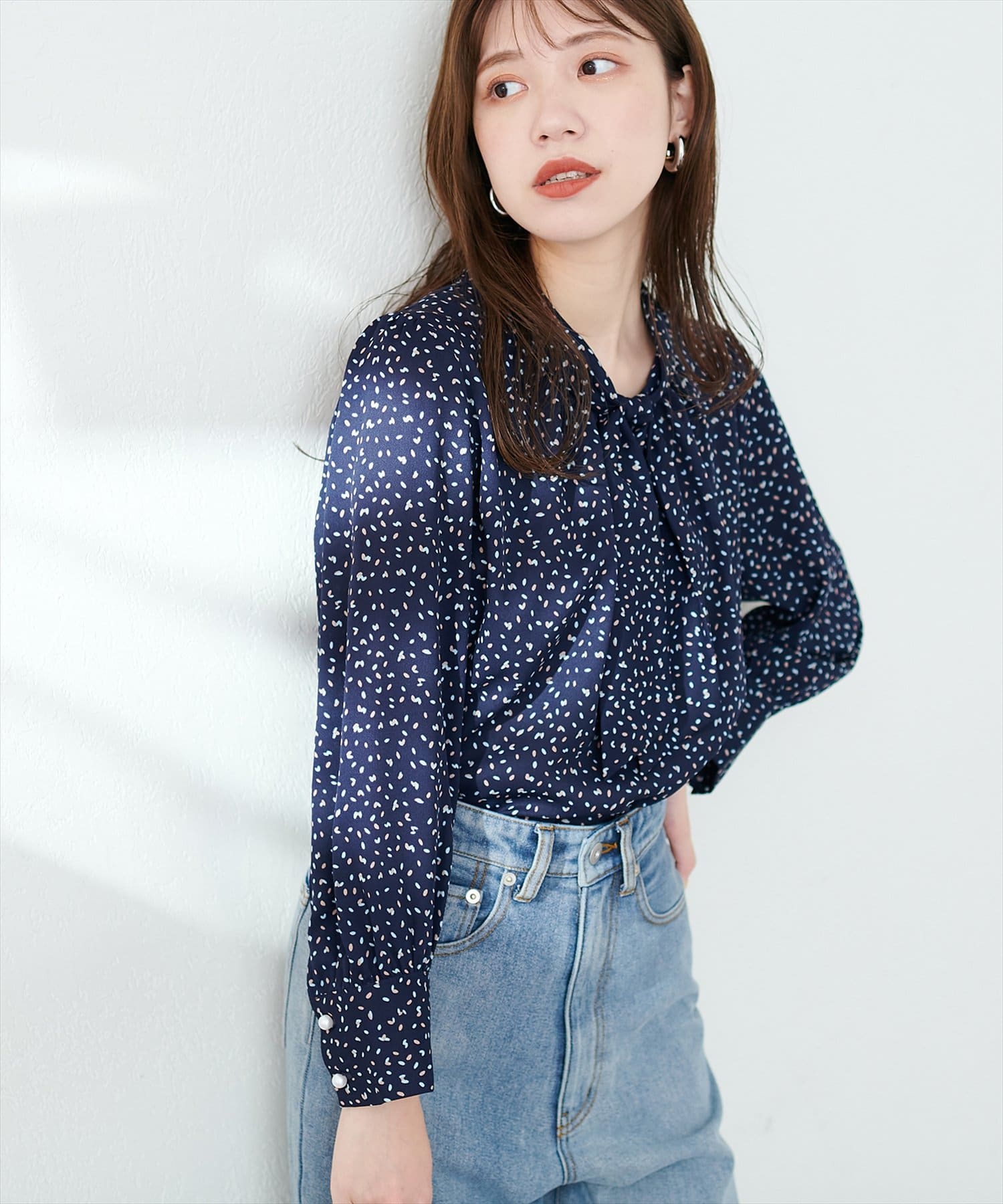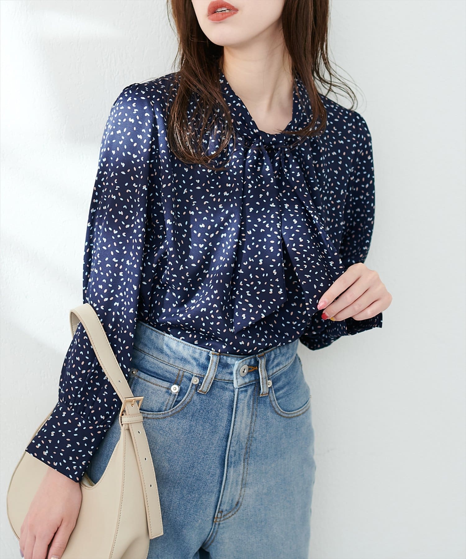 0322040220 袖口パールノット結びボータイブラウス