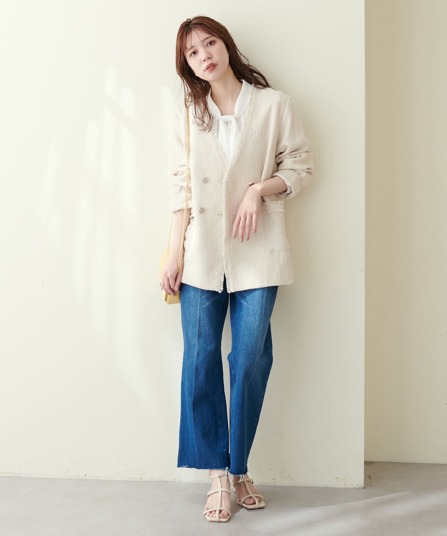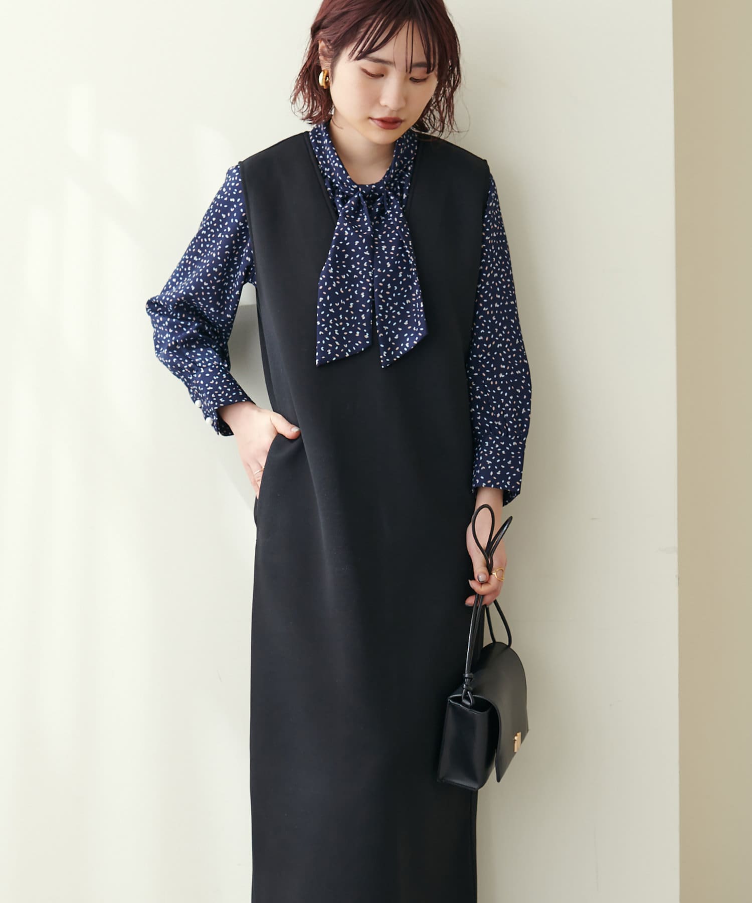 ニットベストやプルオーバーとレイヤードして、トレンド感のあるスタイリングも楽しめます。