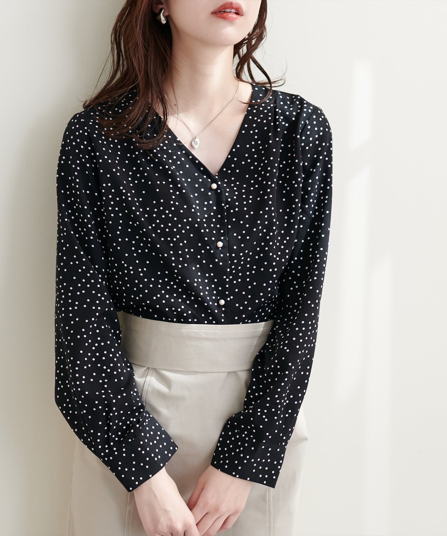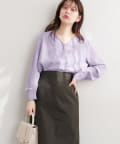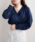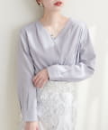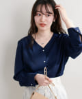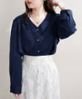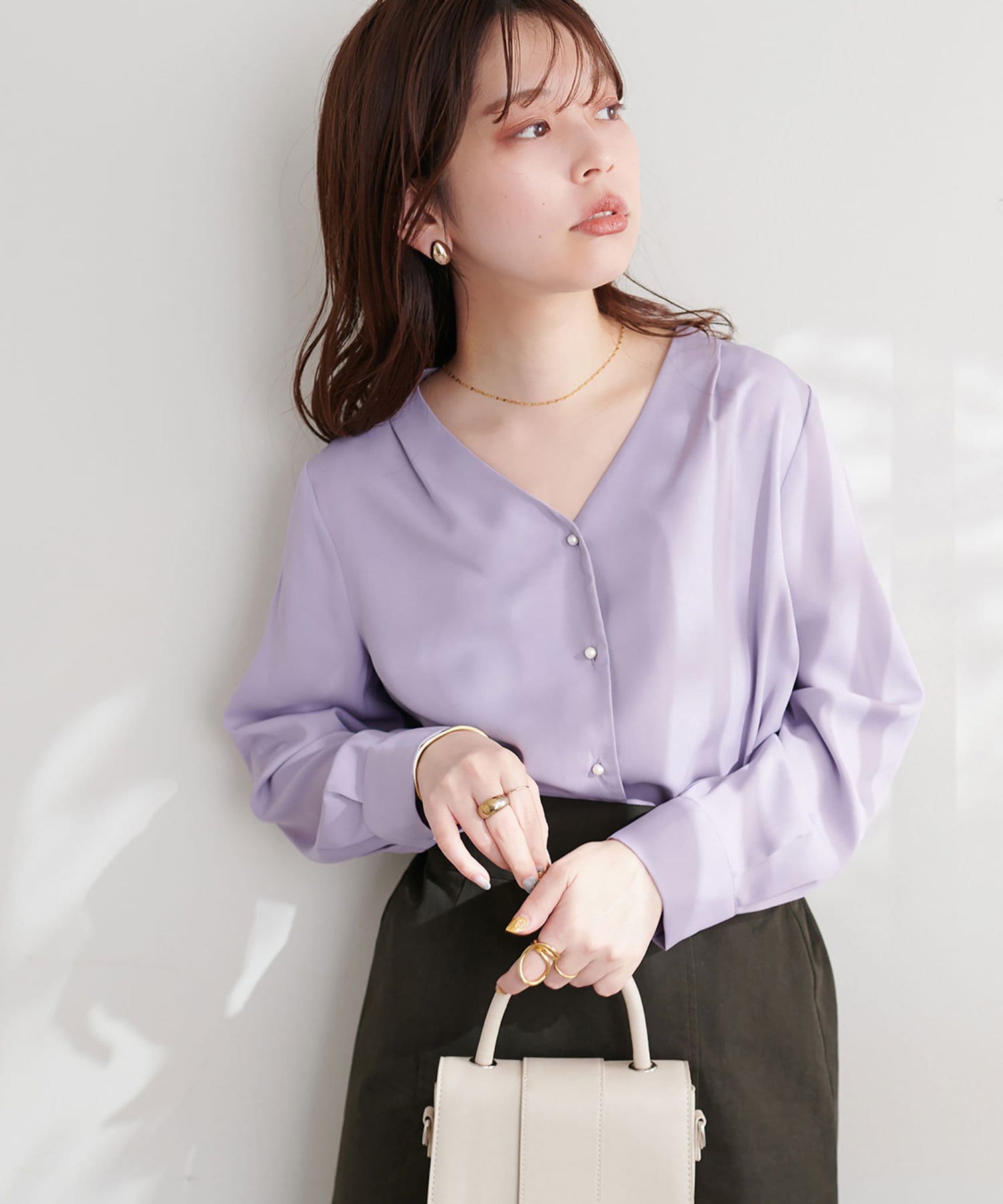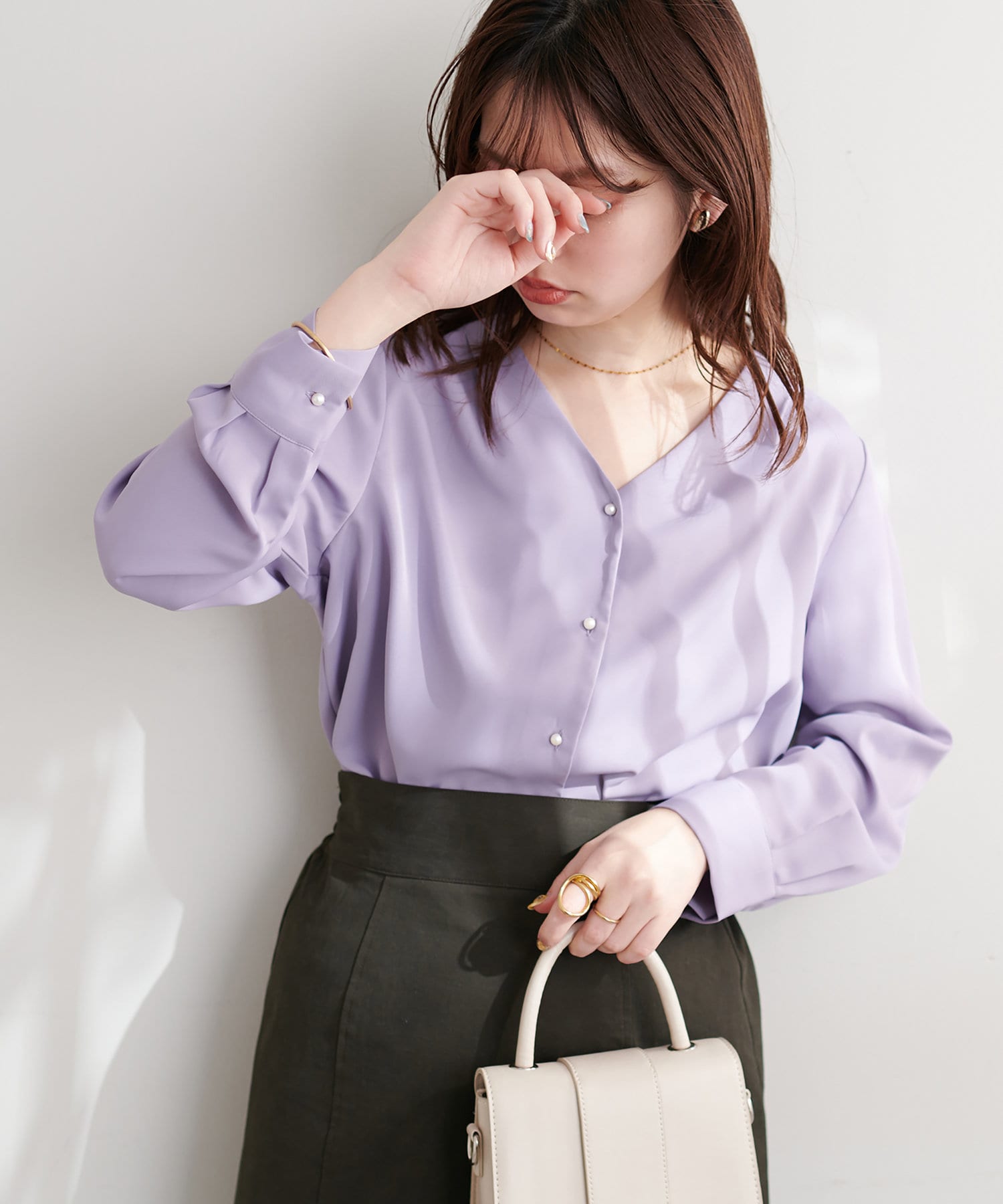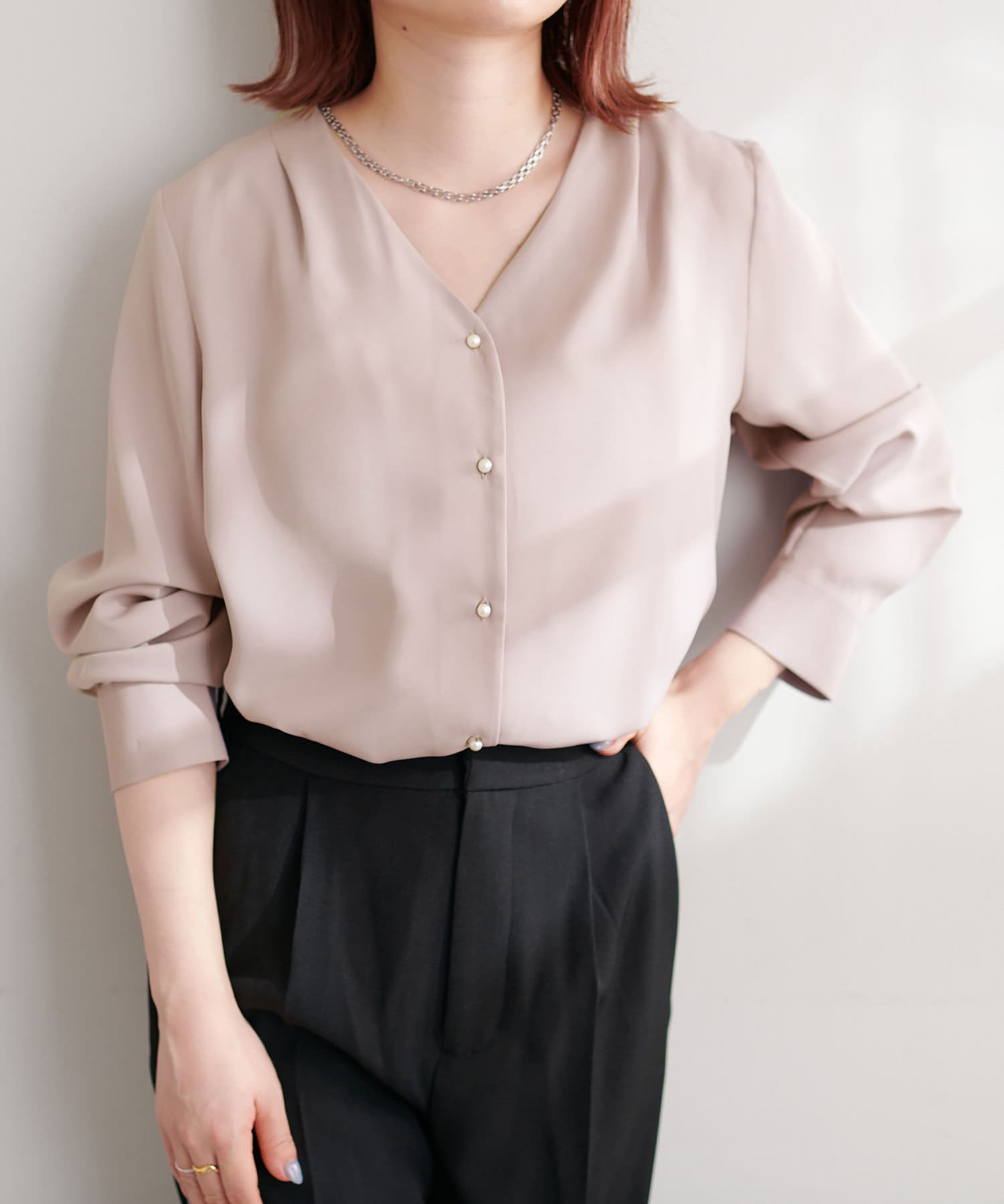 滑らかで落ち感のある着心地の良い生地に、フロントをパール釦使いに仕上げた、大人上品なブラウス。