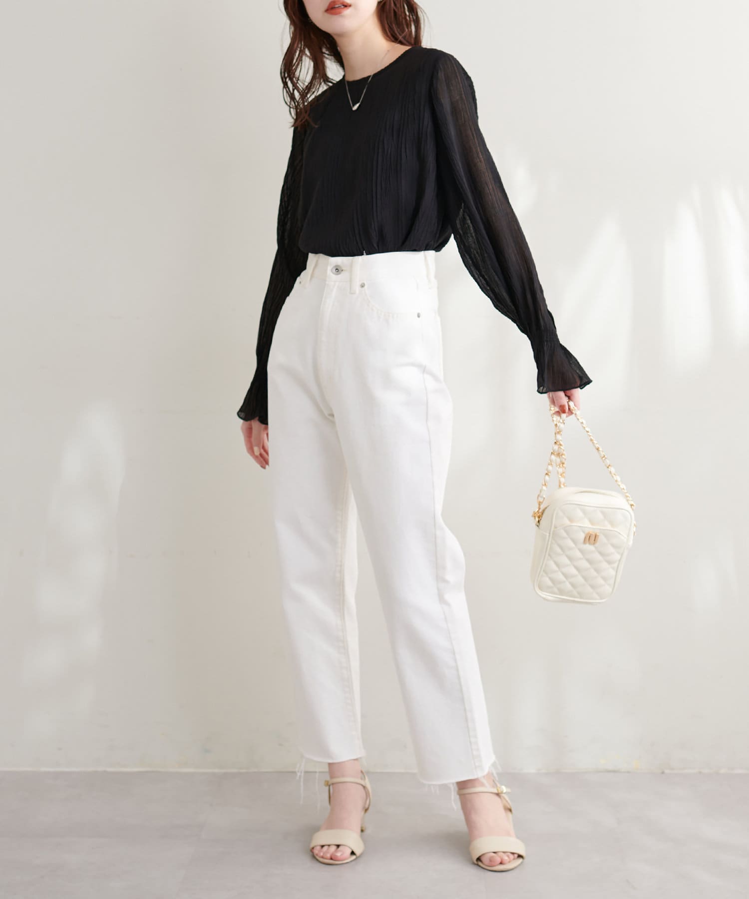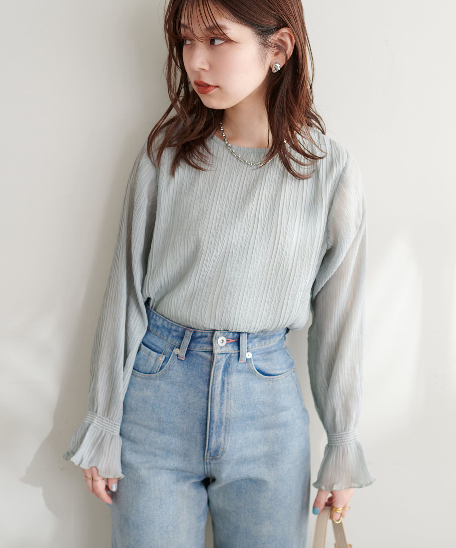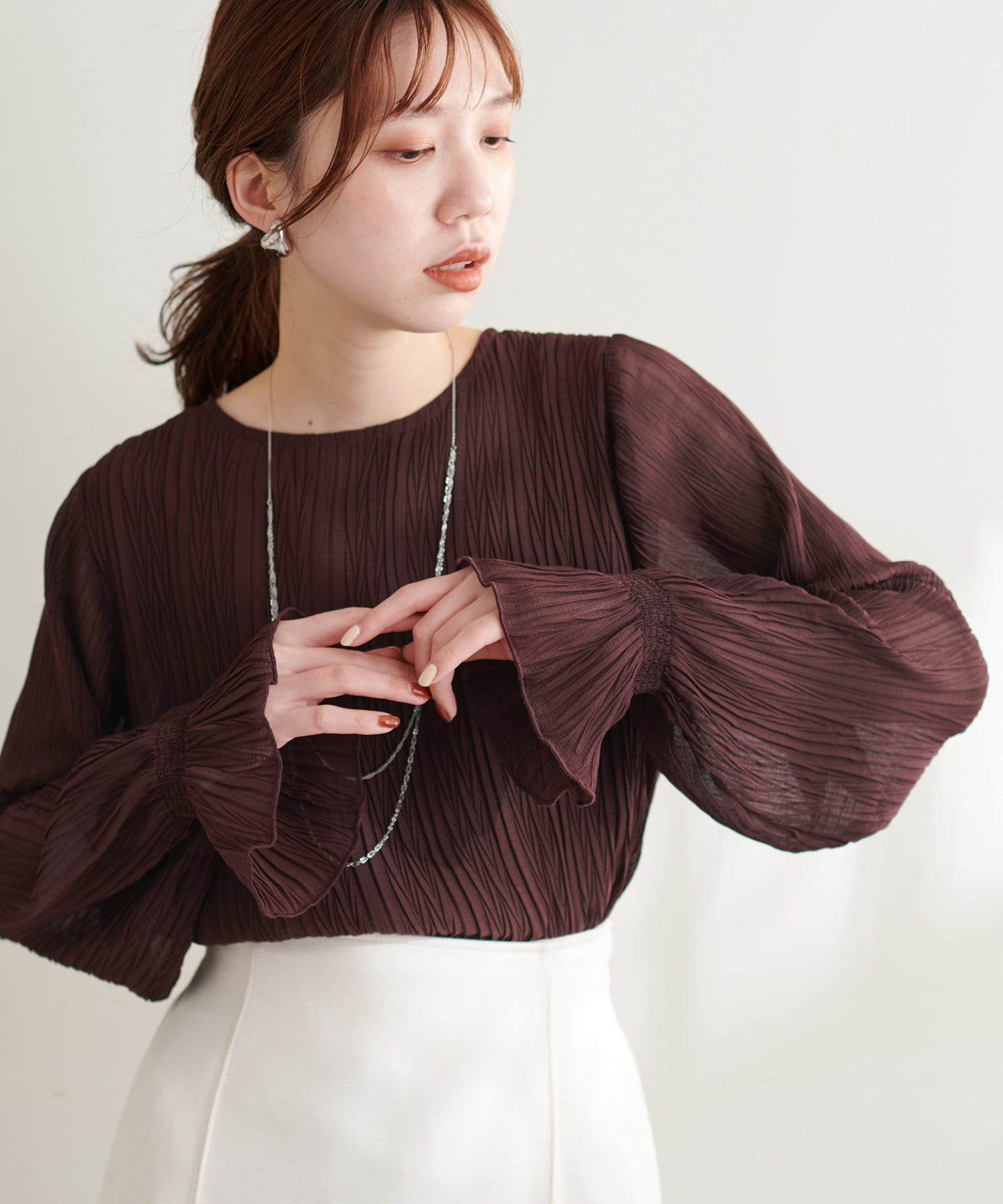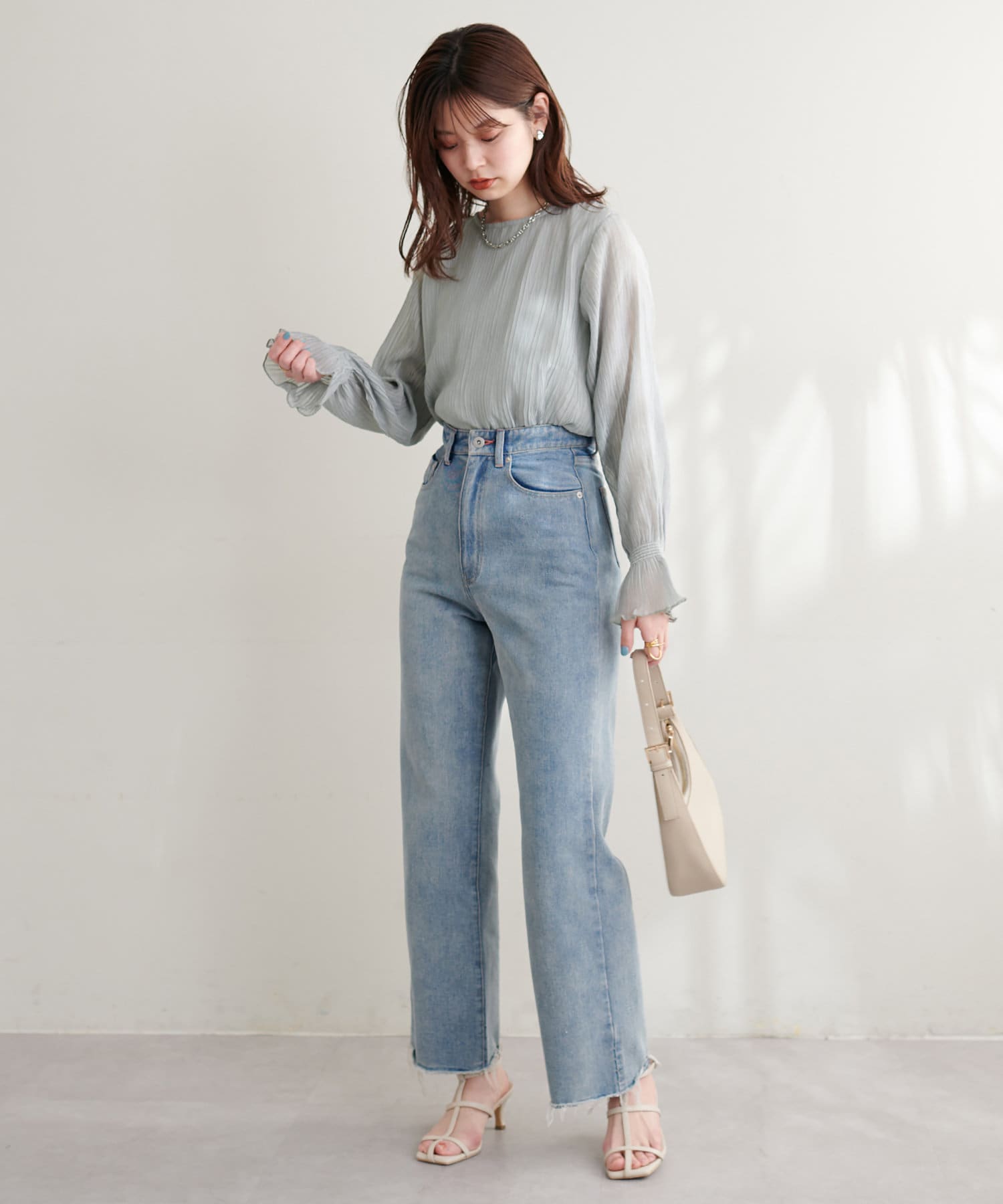ブラウスの素材感が引き立つコーデに仕上がります。