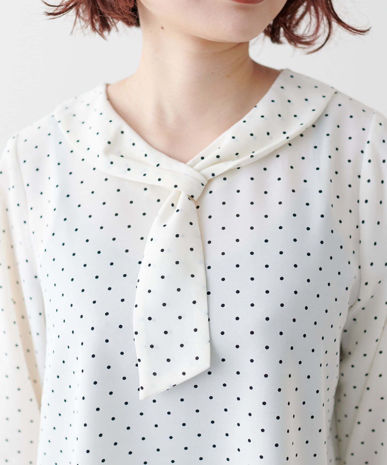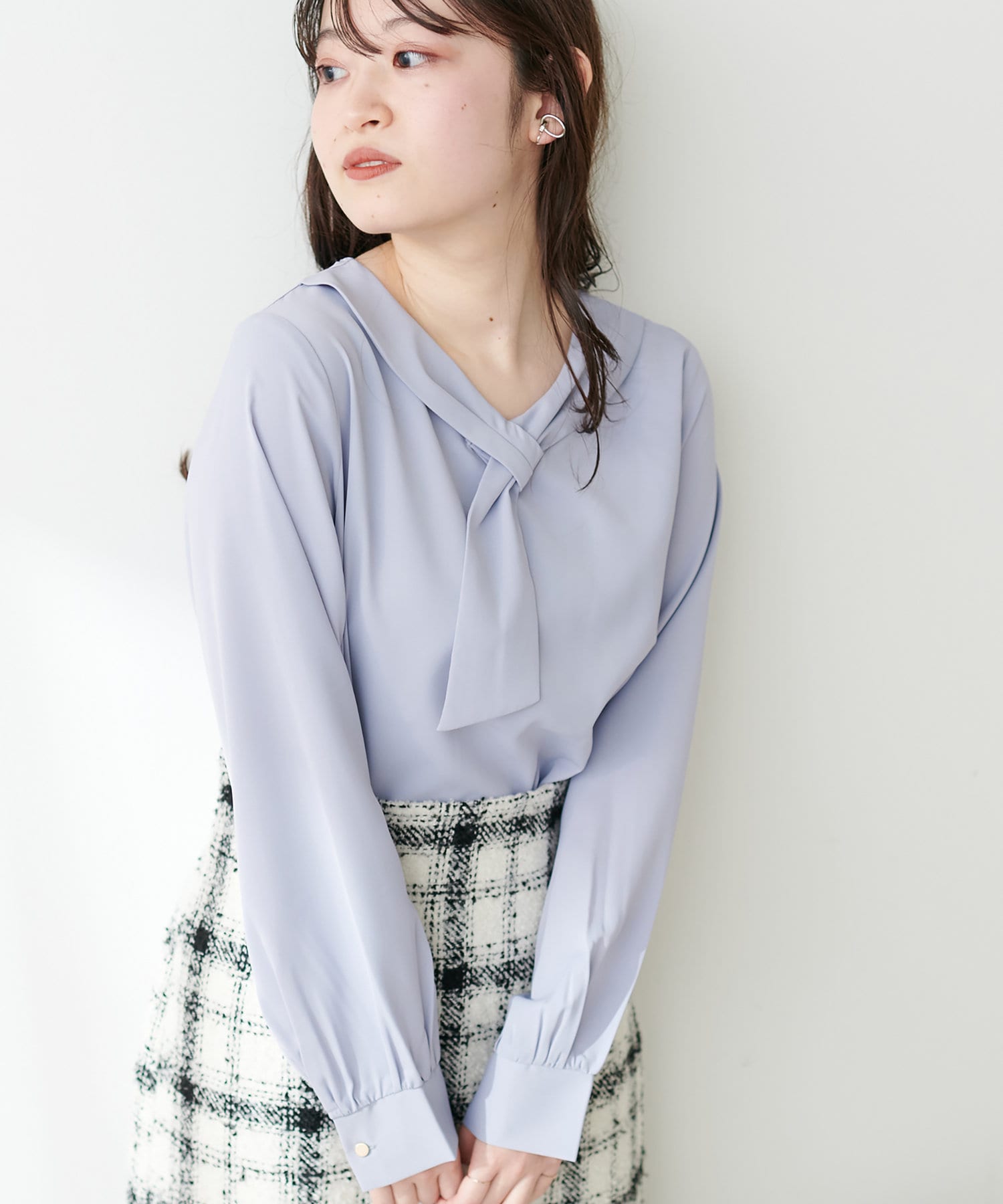 滑らかで落ち感のある着心地の良い生地に、アシメスカーフがアクセントになった大人上品なブラウス。