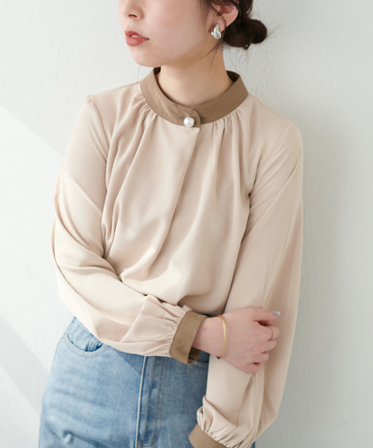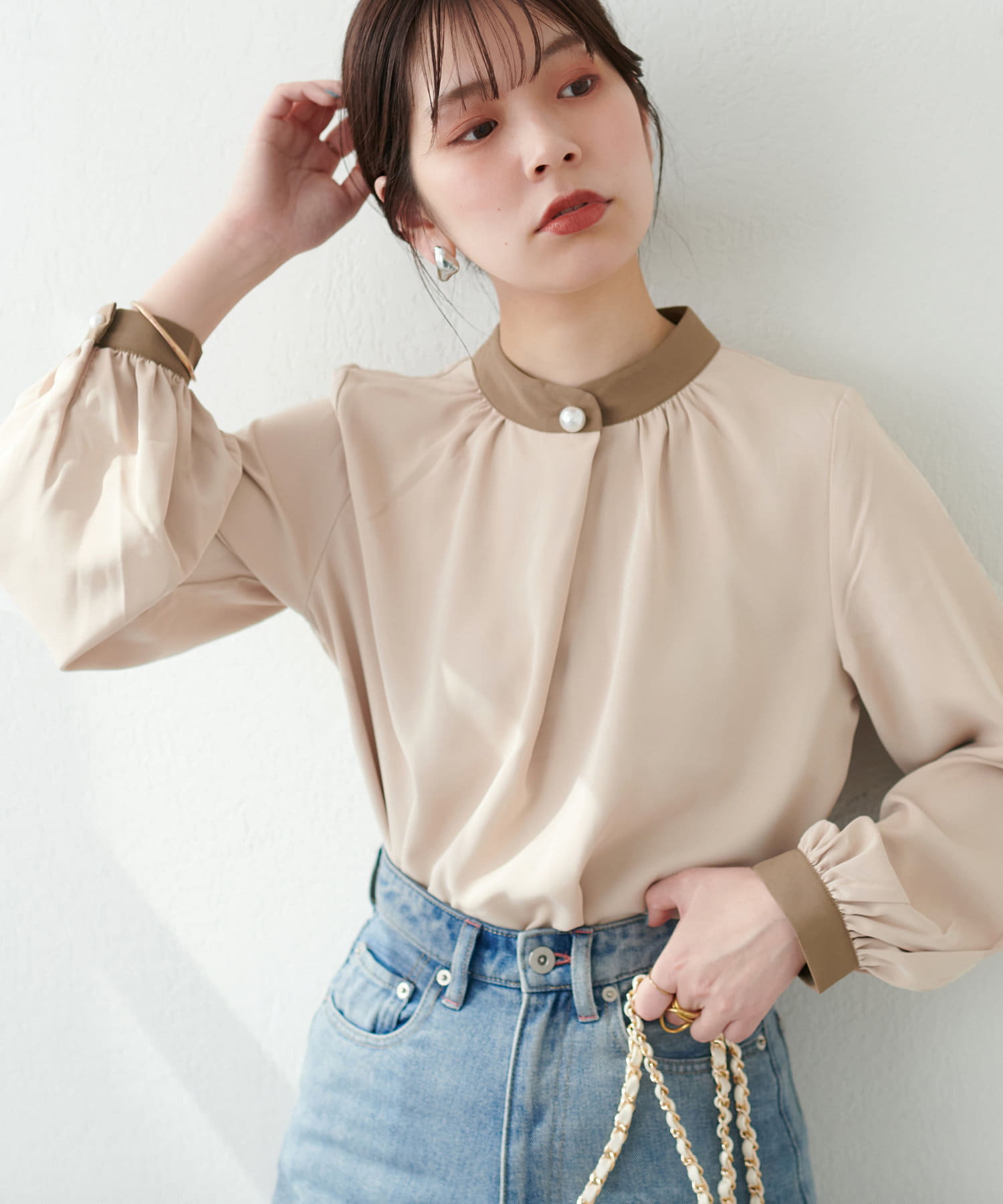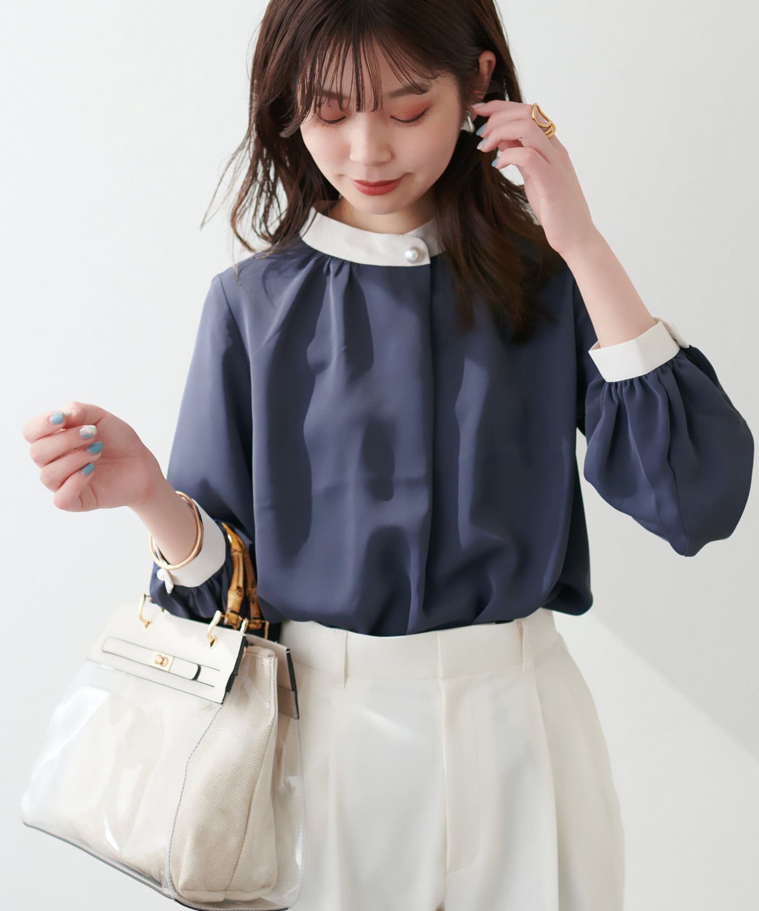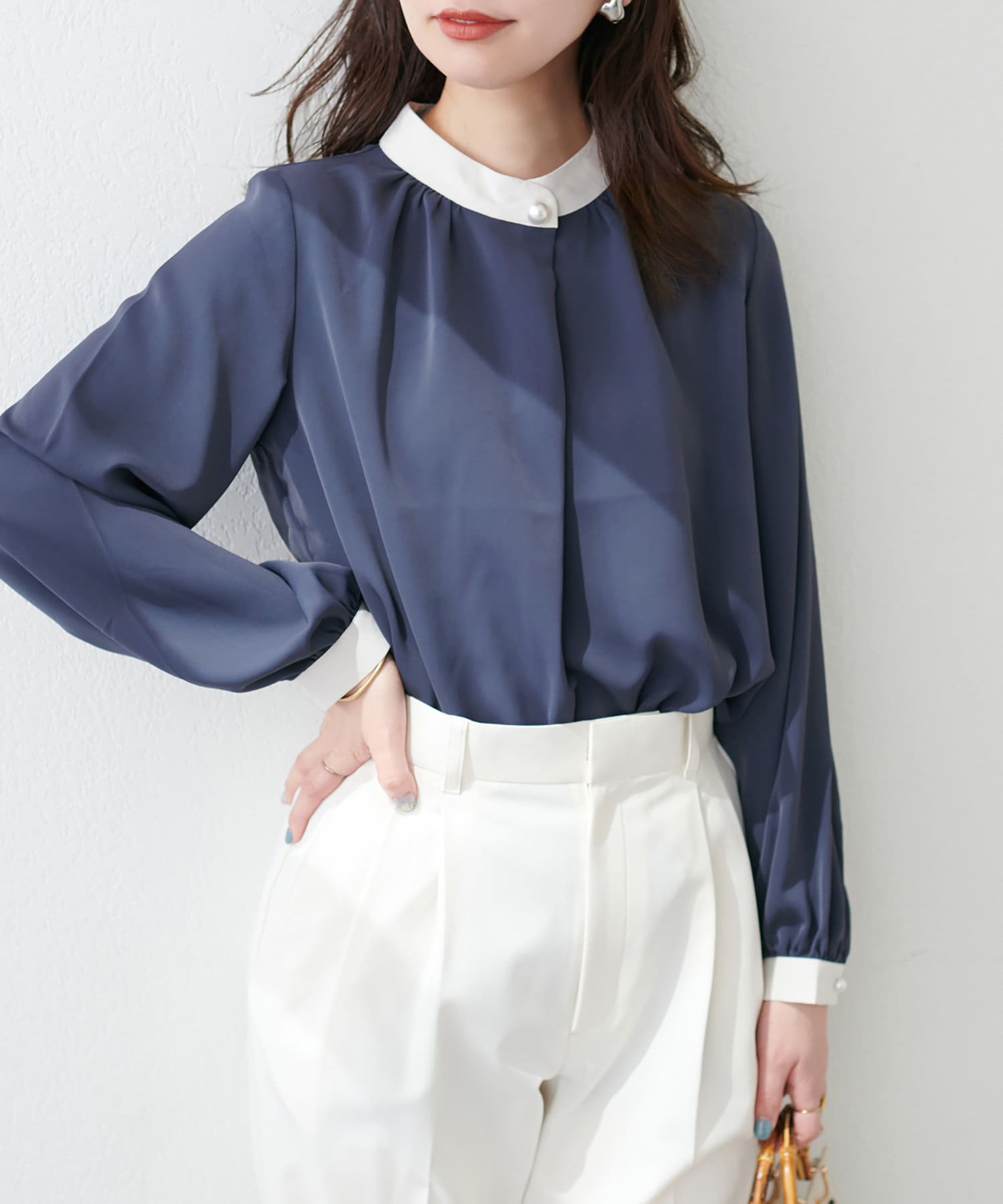 襟元のパールが華やかで女性らしい雰囲気のフェミニンブラウス。