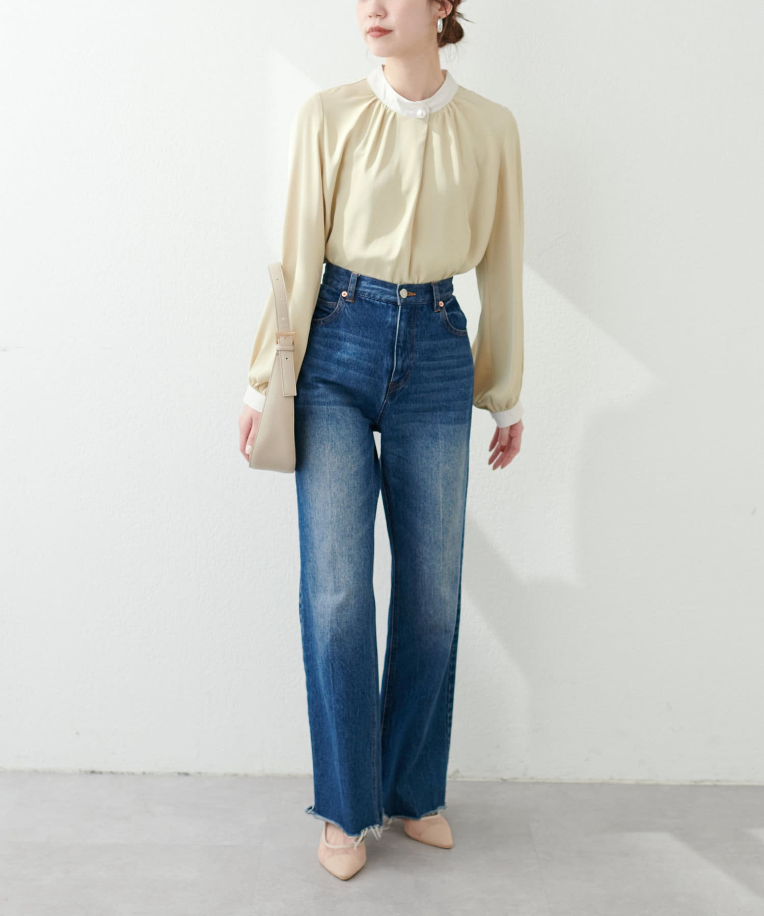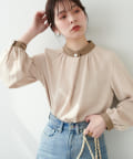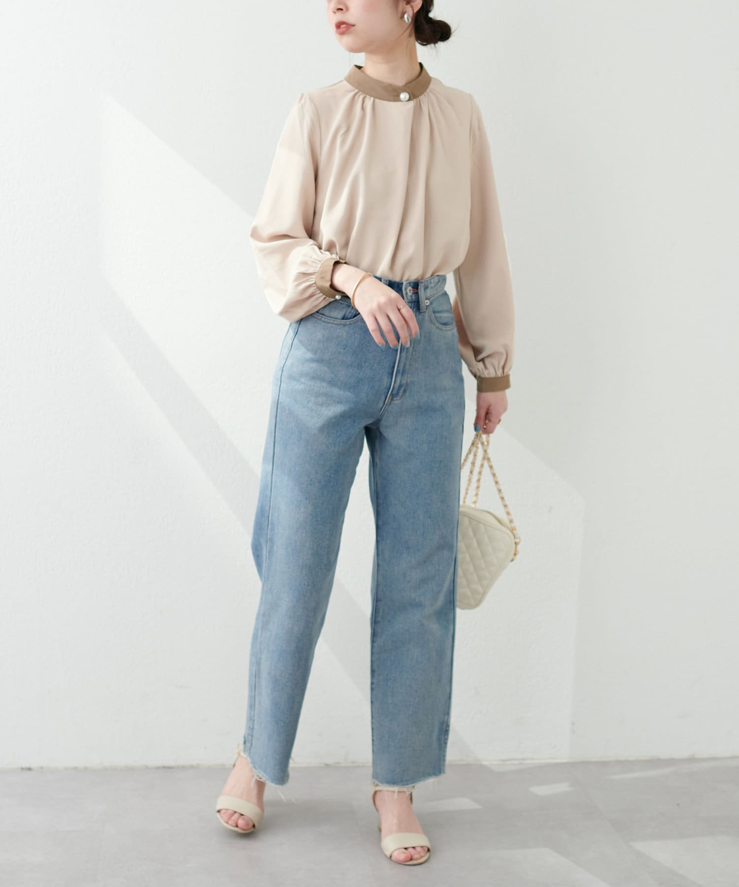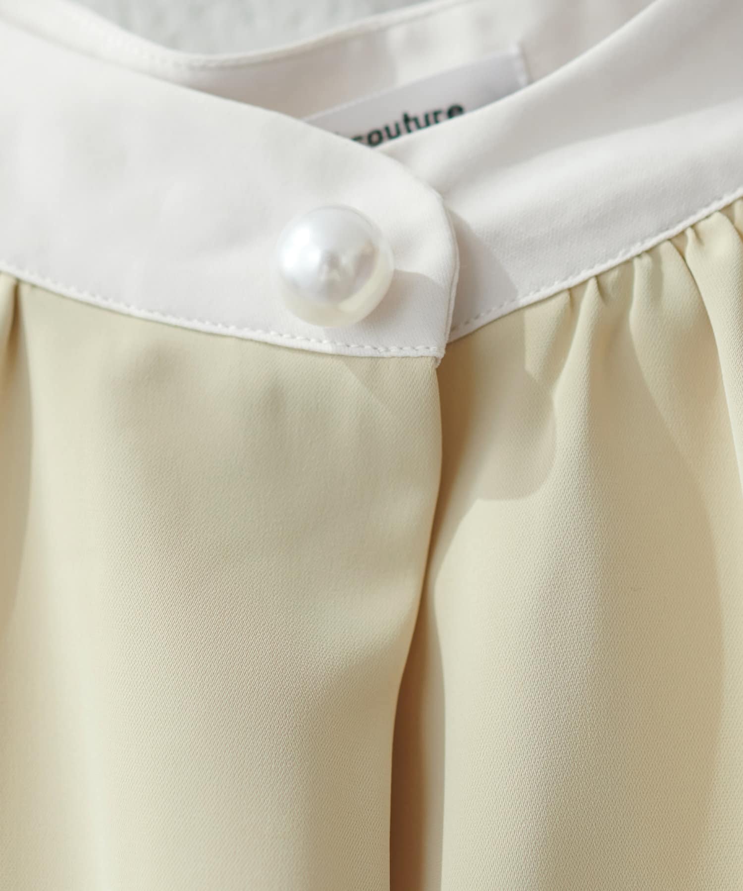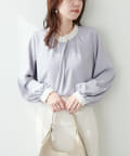 襟元のパールが華やかで女性らしい雰囲気のフェミニンブラウス。