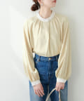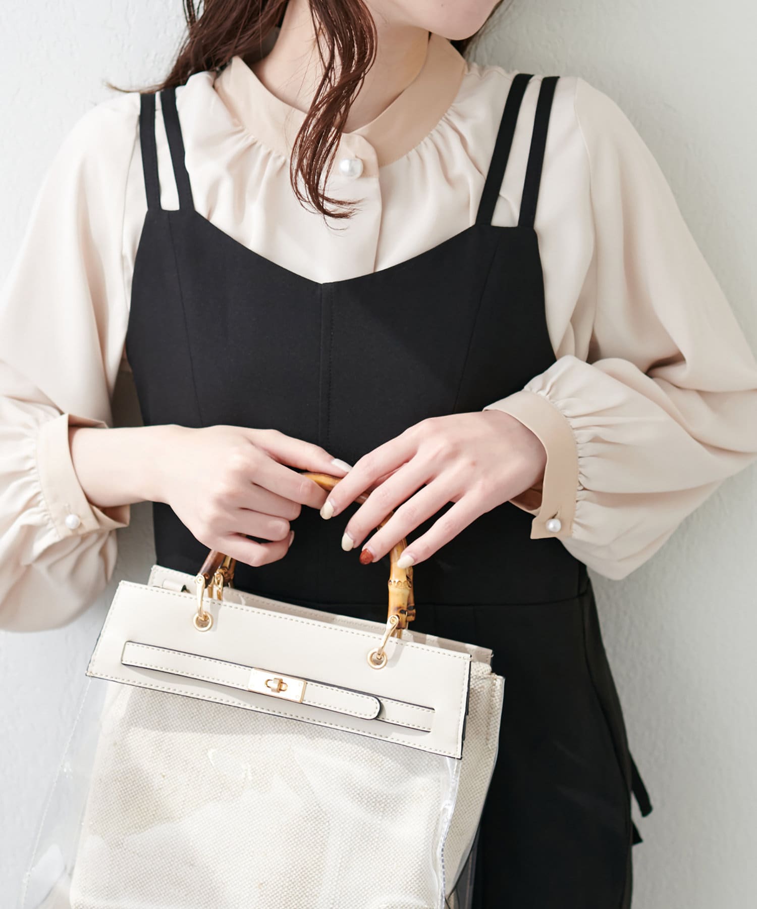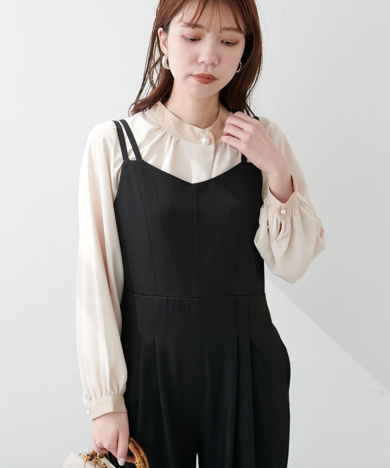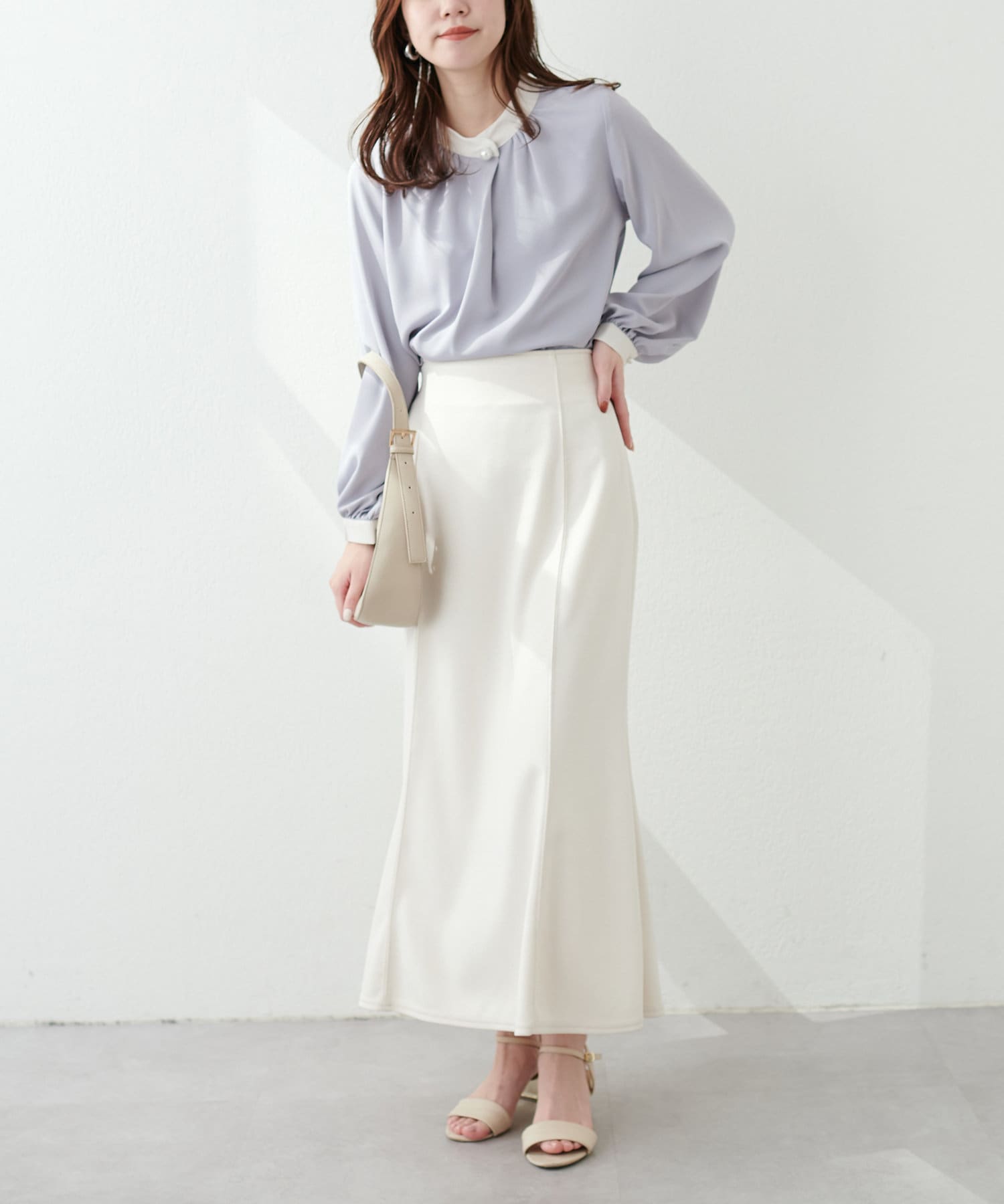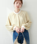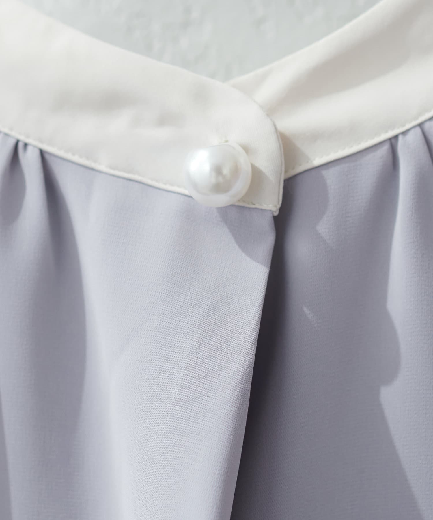 襟元のパールが華やかで女性らしい雰囲気のフェミニンブラウス。