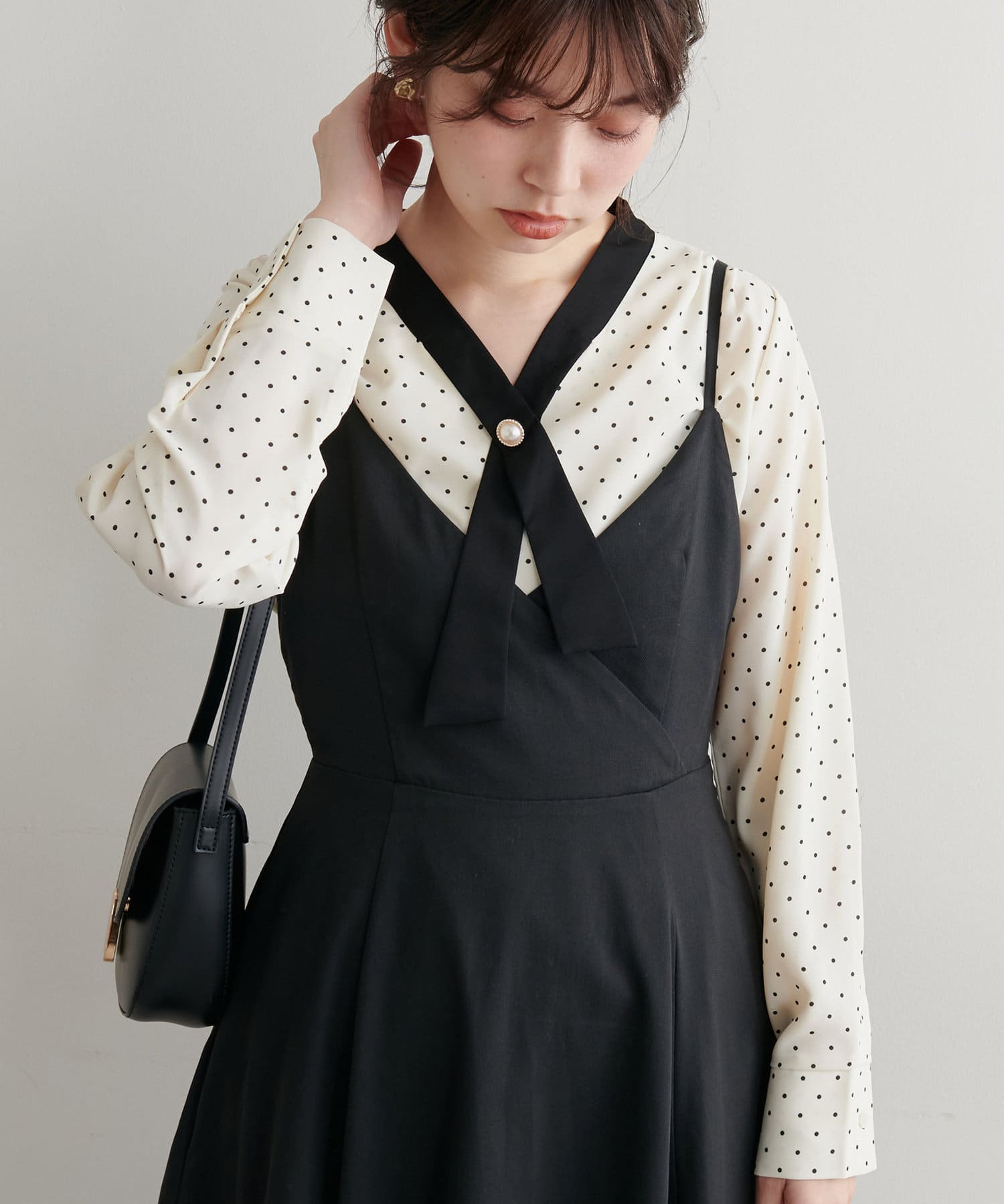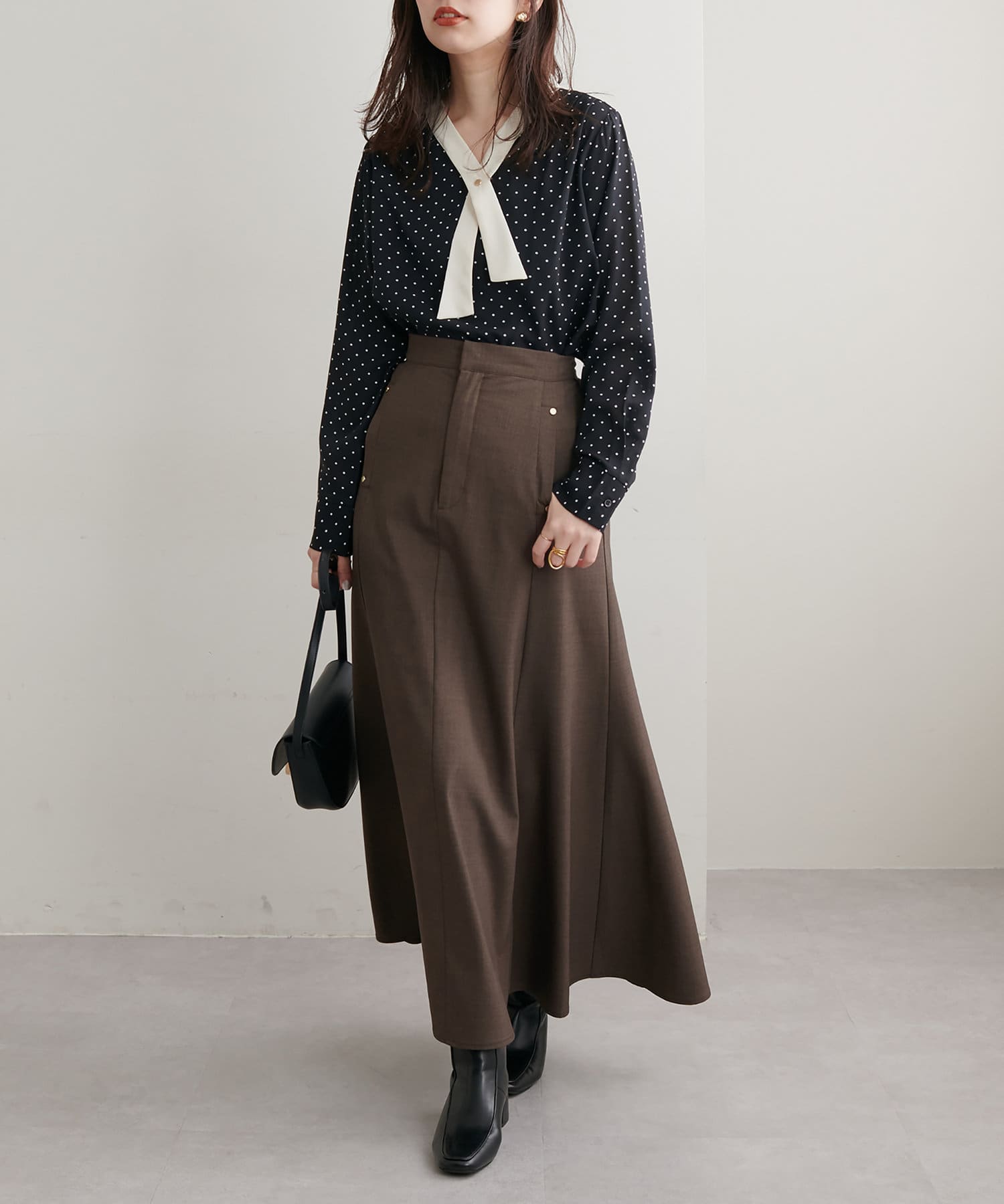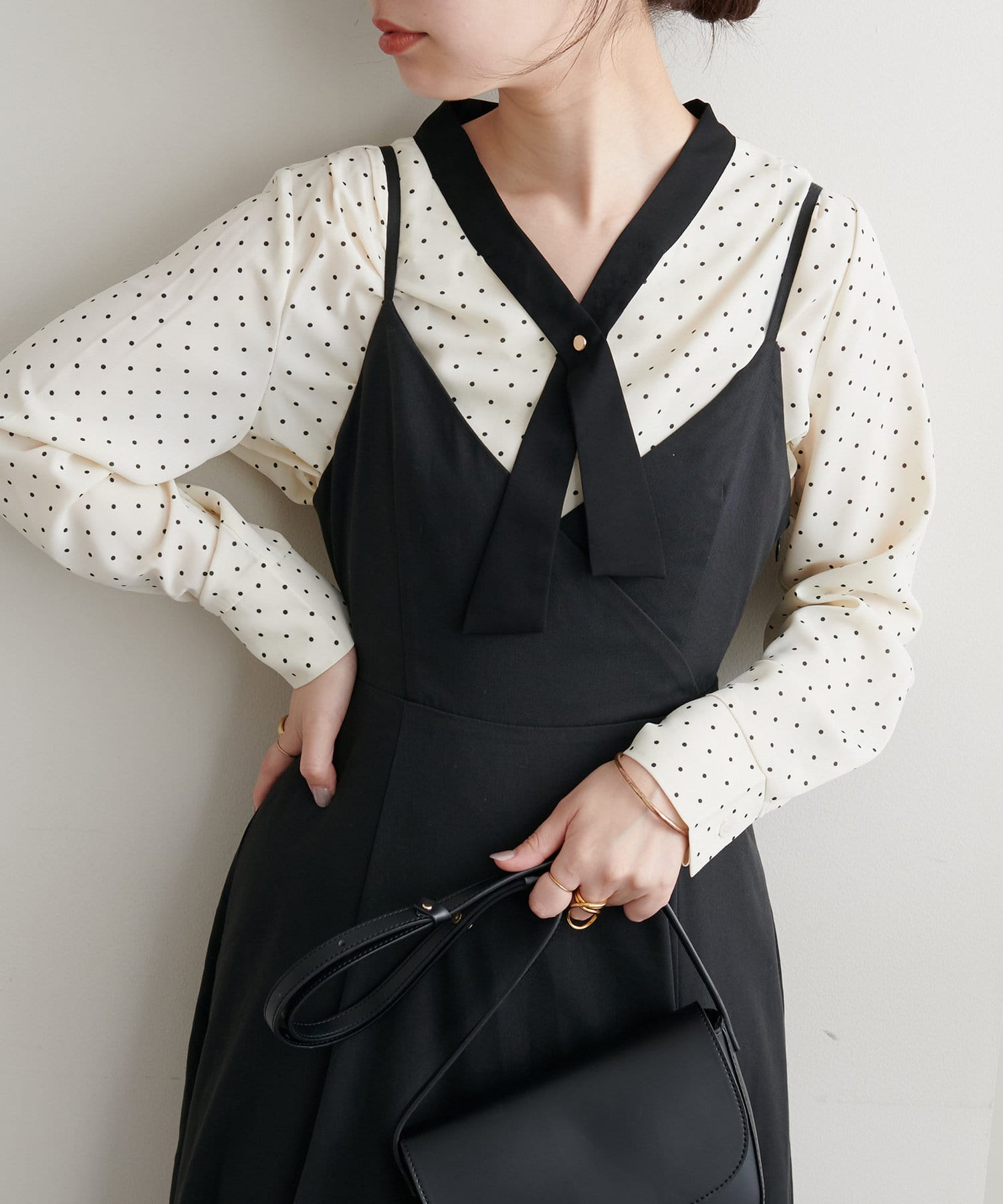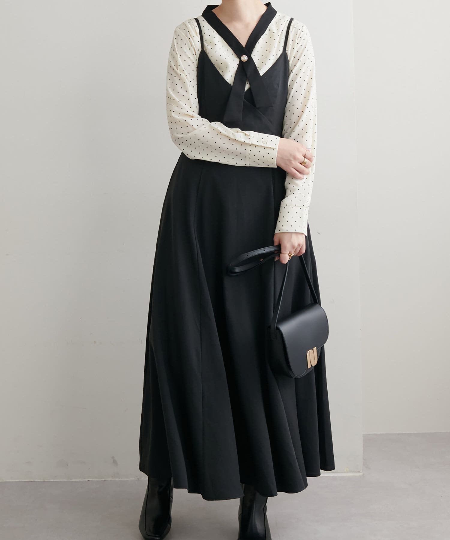 クロスボータイが洗練された印象に仕上げてくれるのでハイウエストのロングスカートやジャンパースカート、