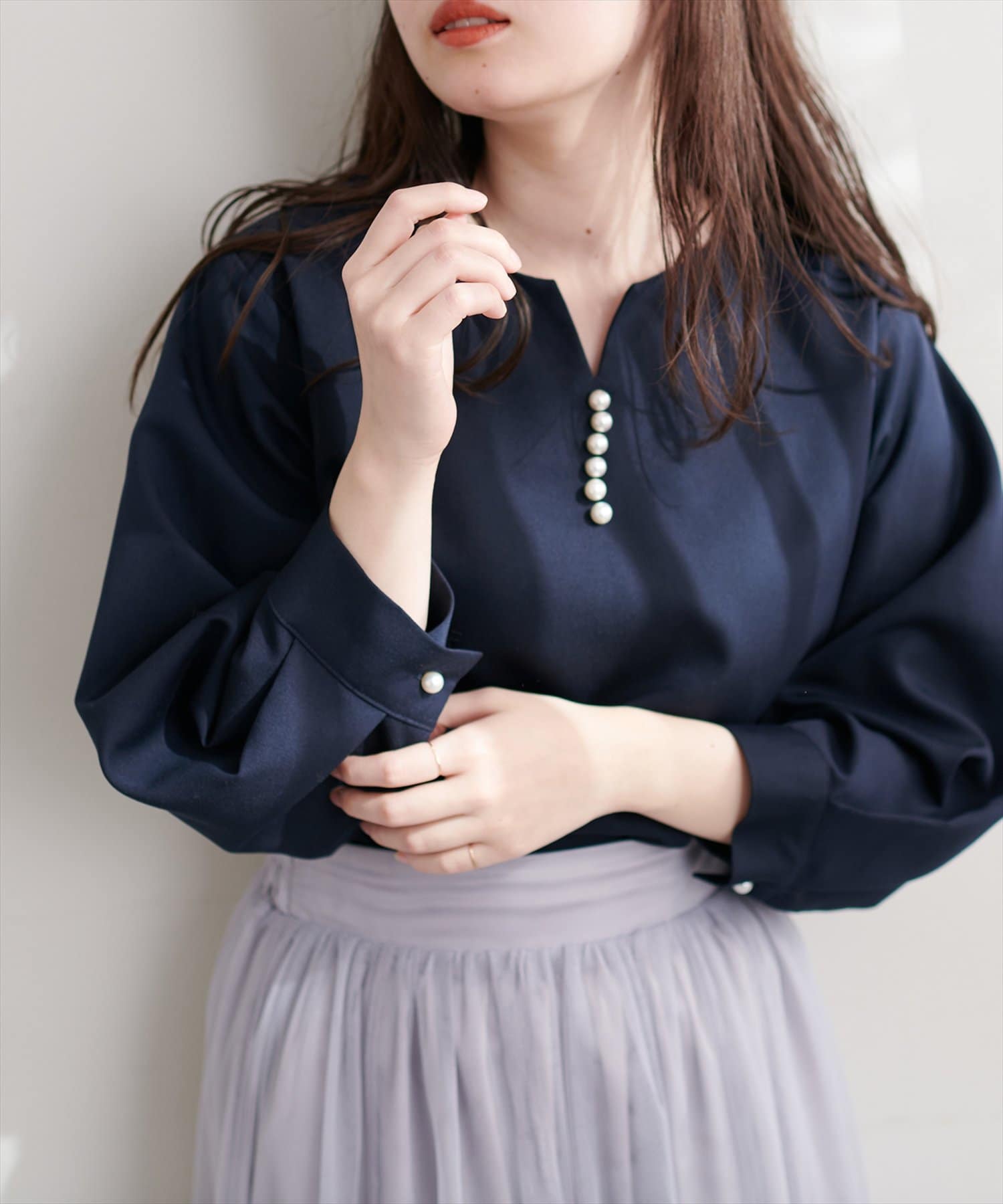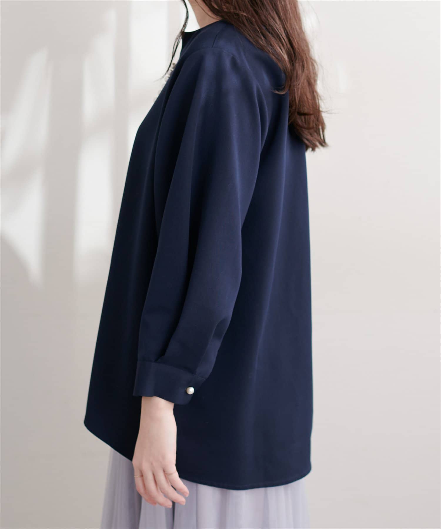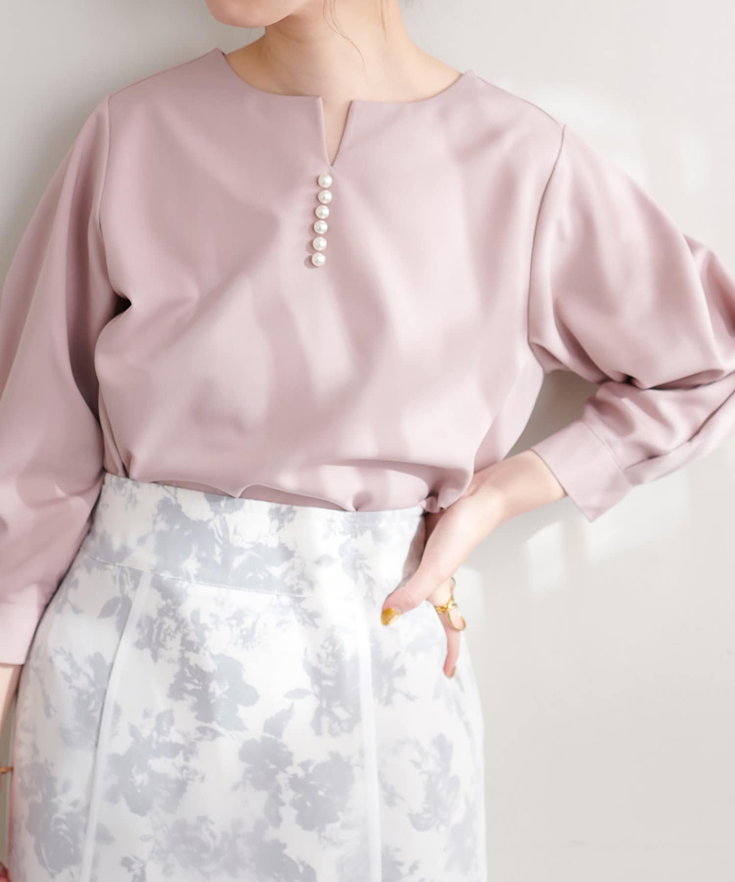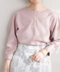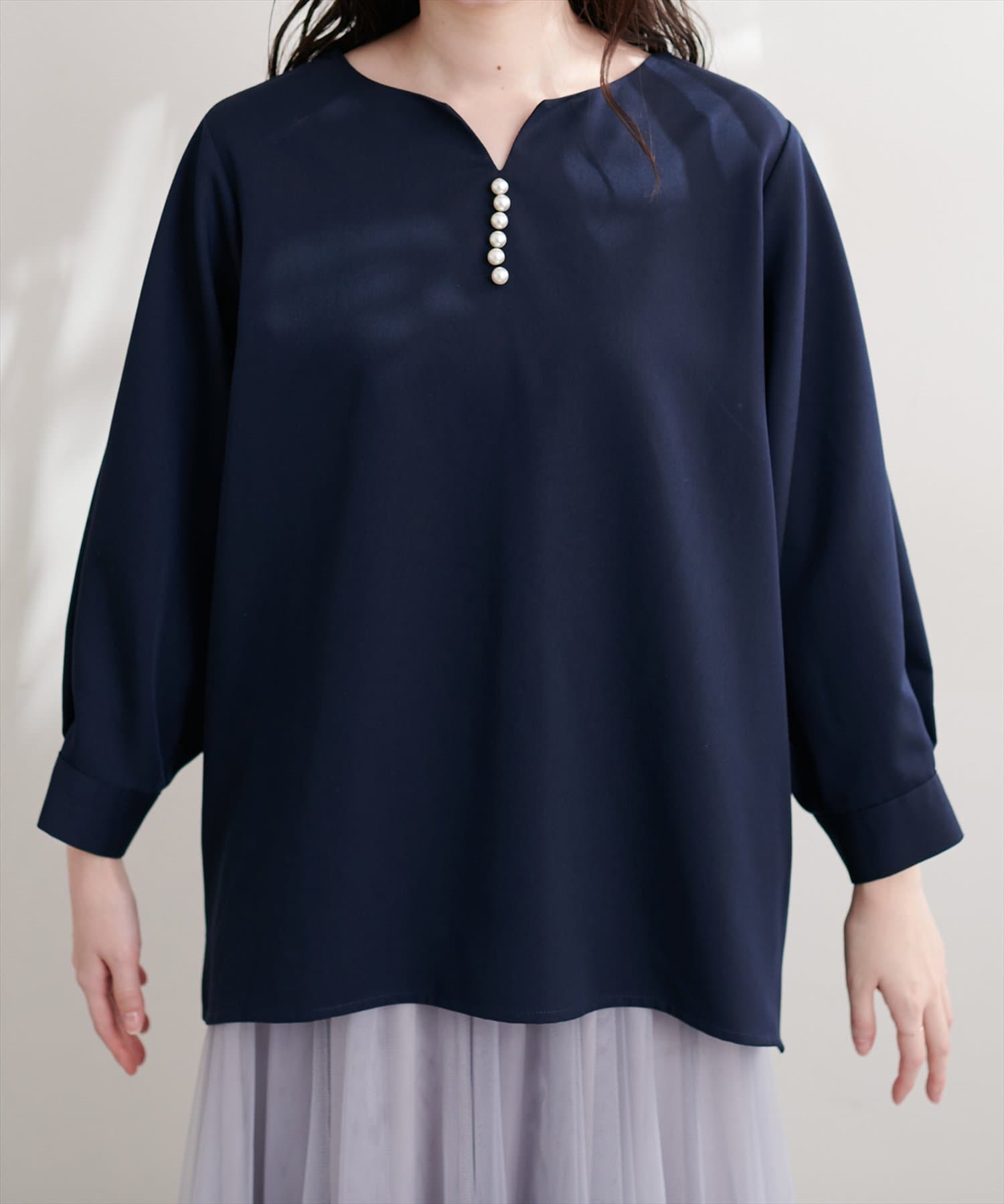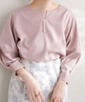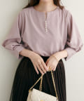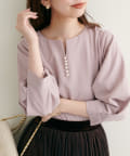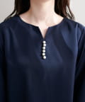 ネックラインをすっきりと見せてくれる程良いスキッパーデザインに、パールを施した大人上品なブラウス。