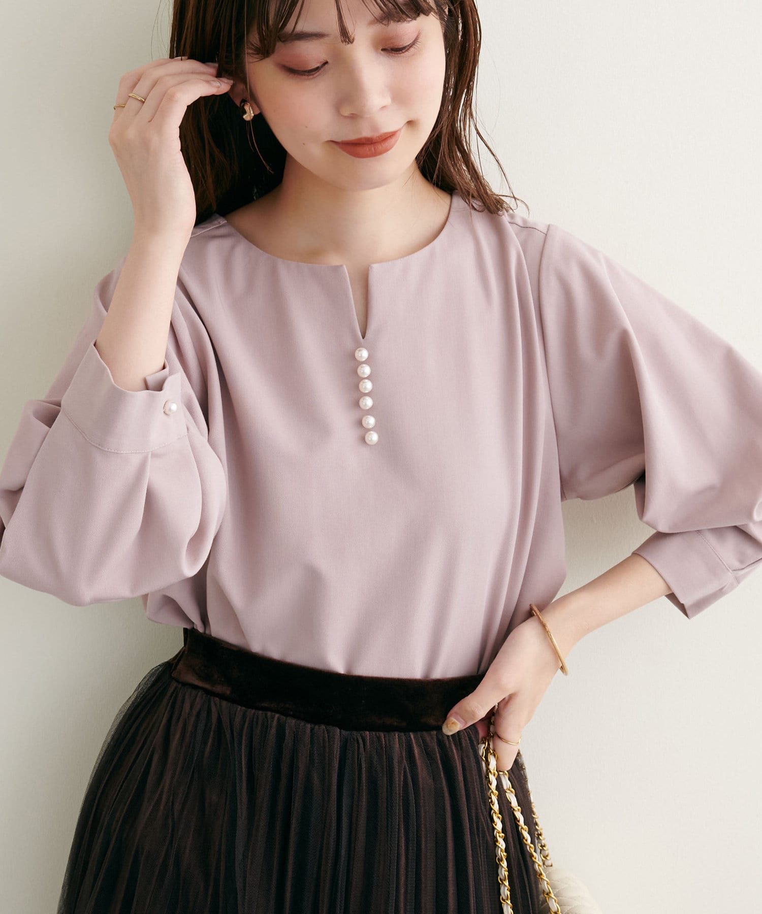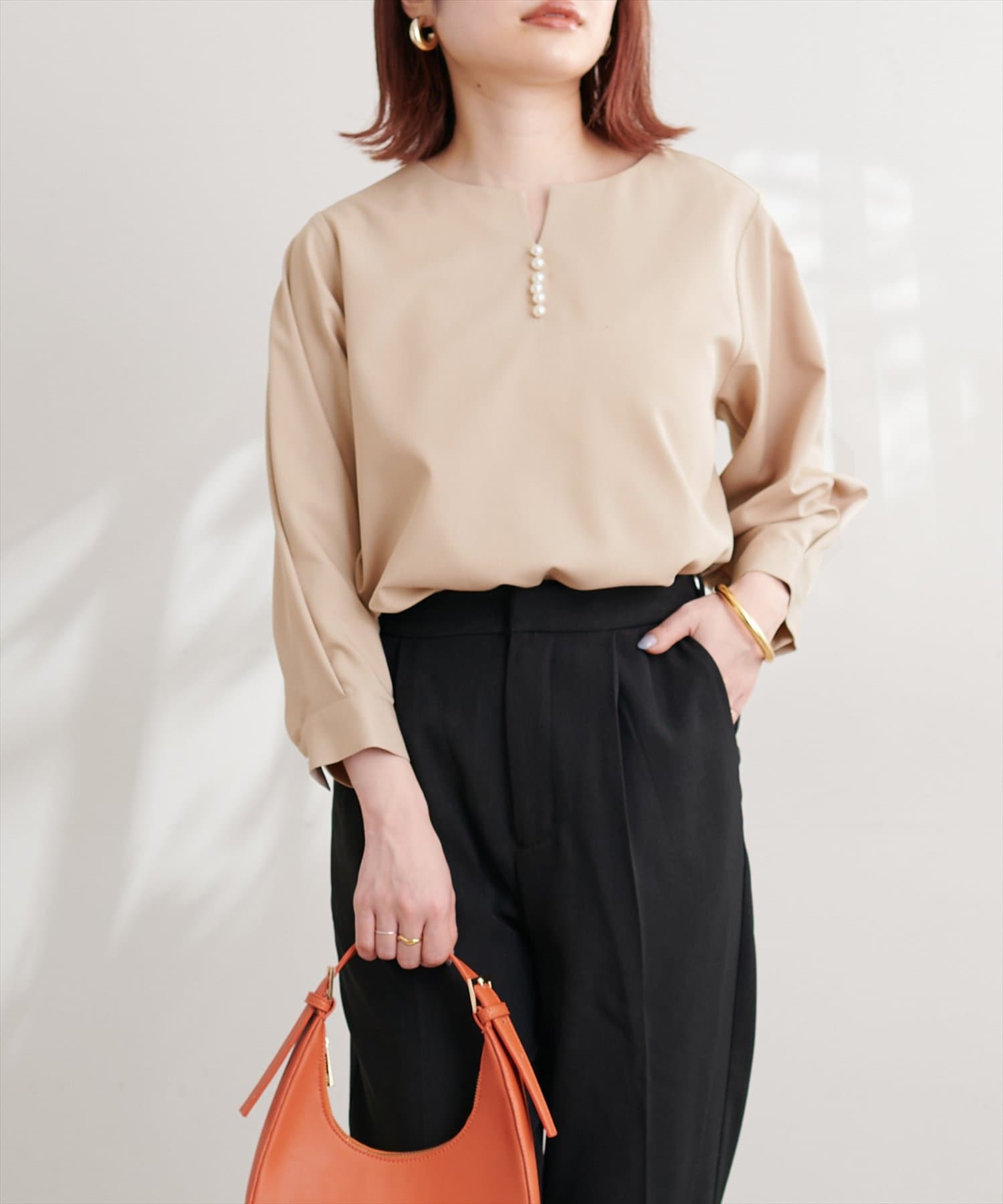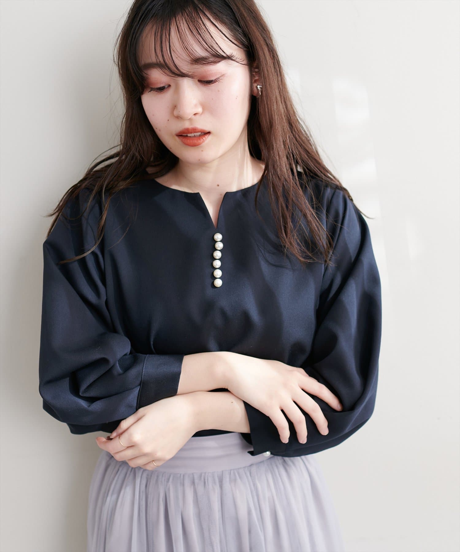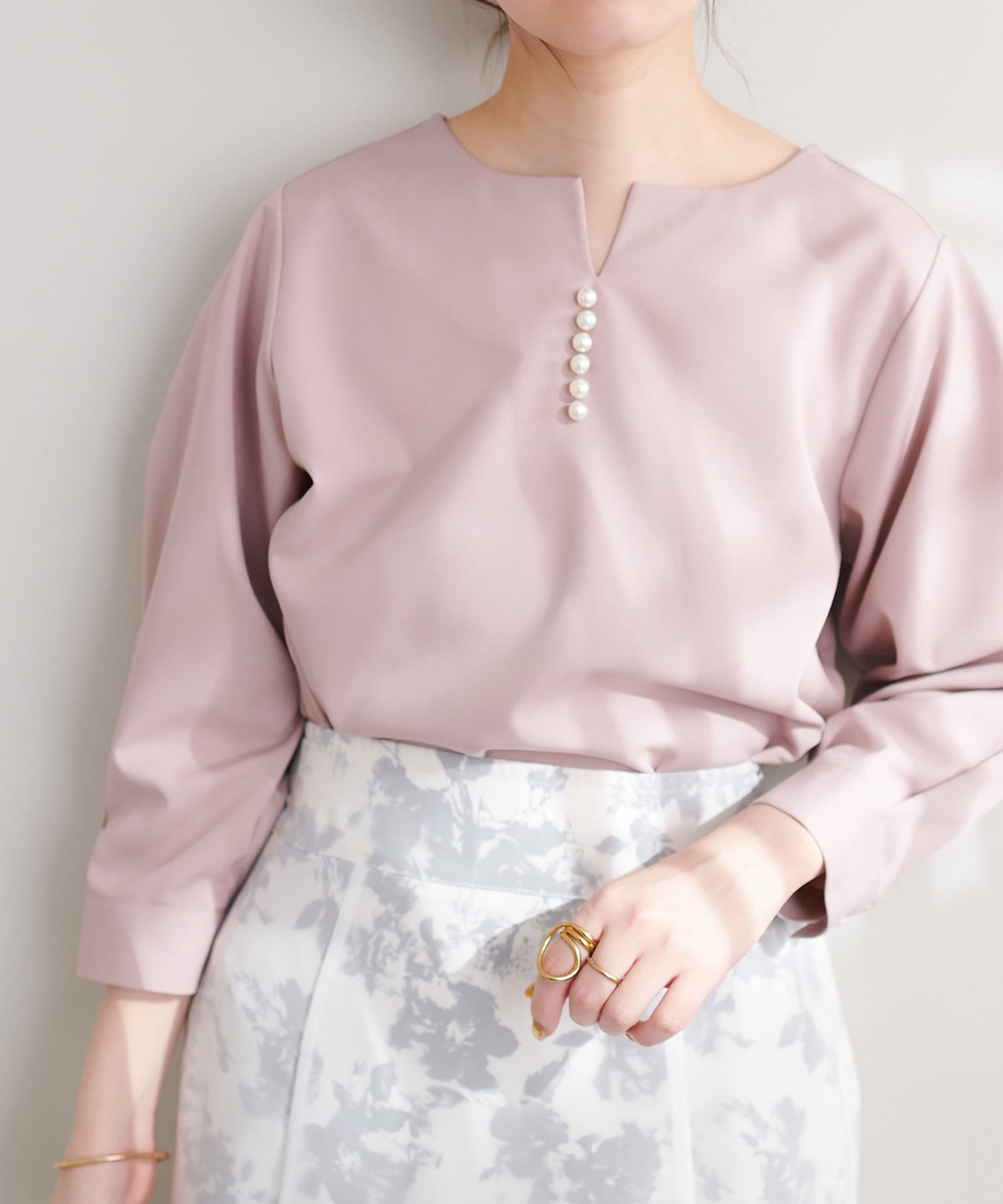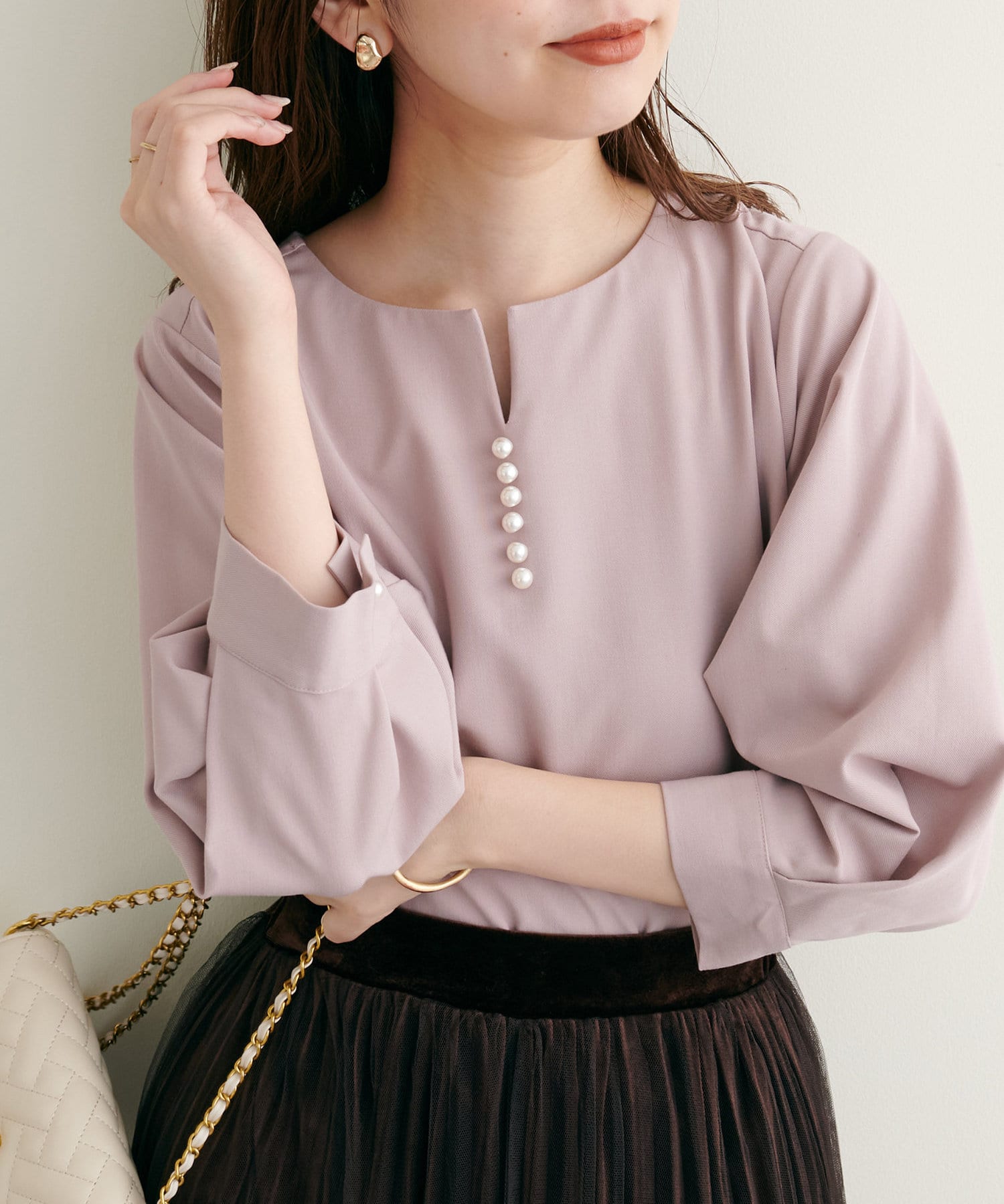 ネックラインをすっきりと見せてくれる程良いスキッパーデザインに、パールを施した大人上品なブラウス。