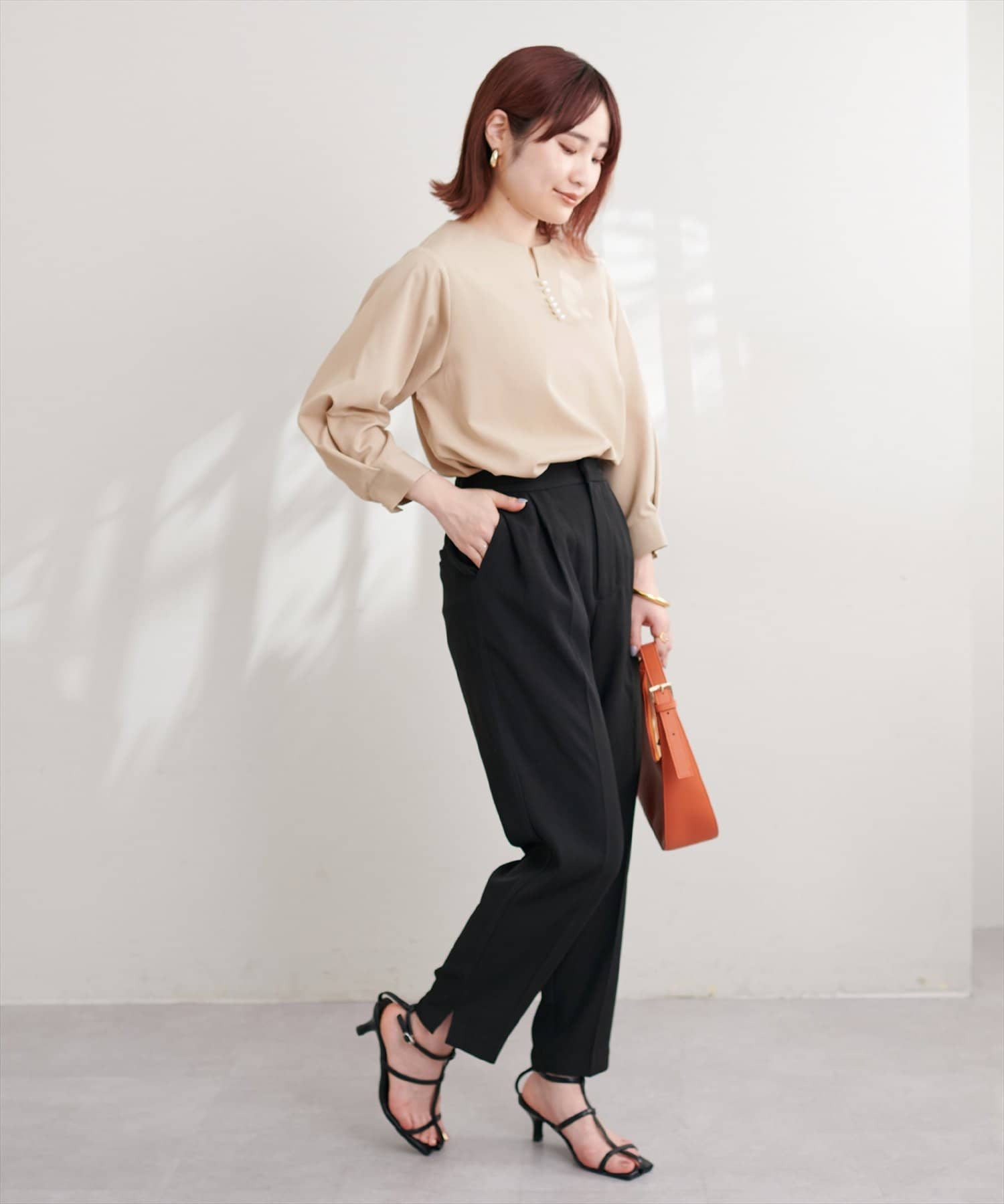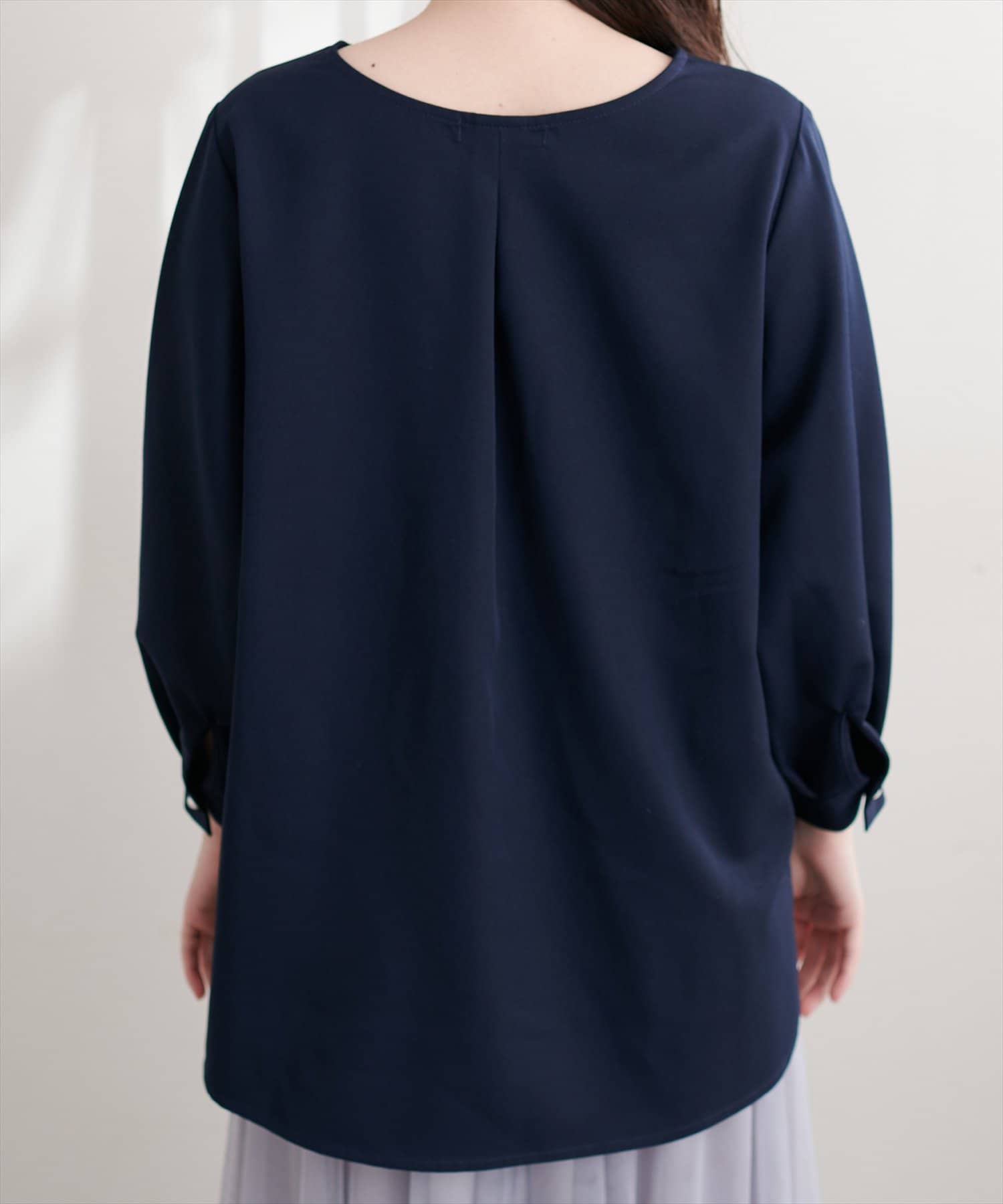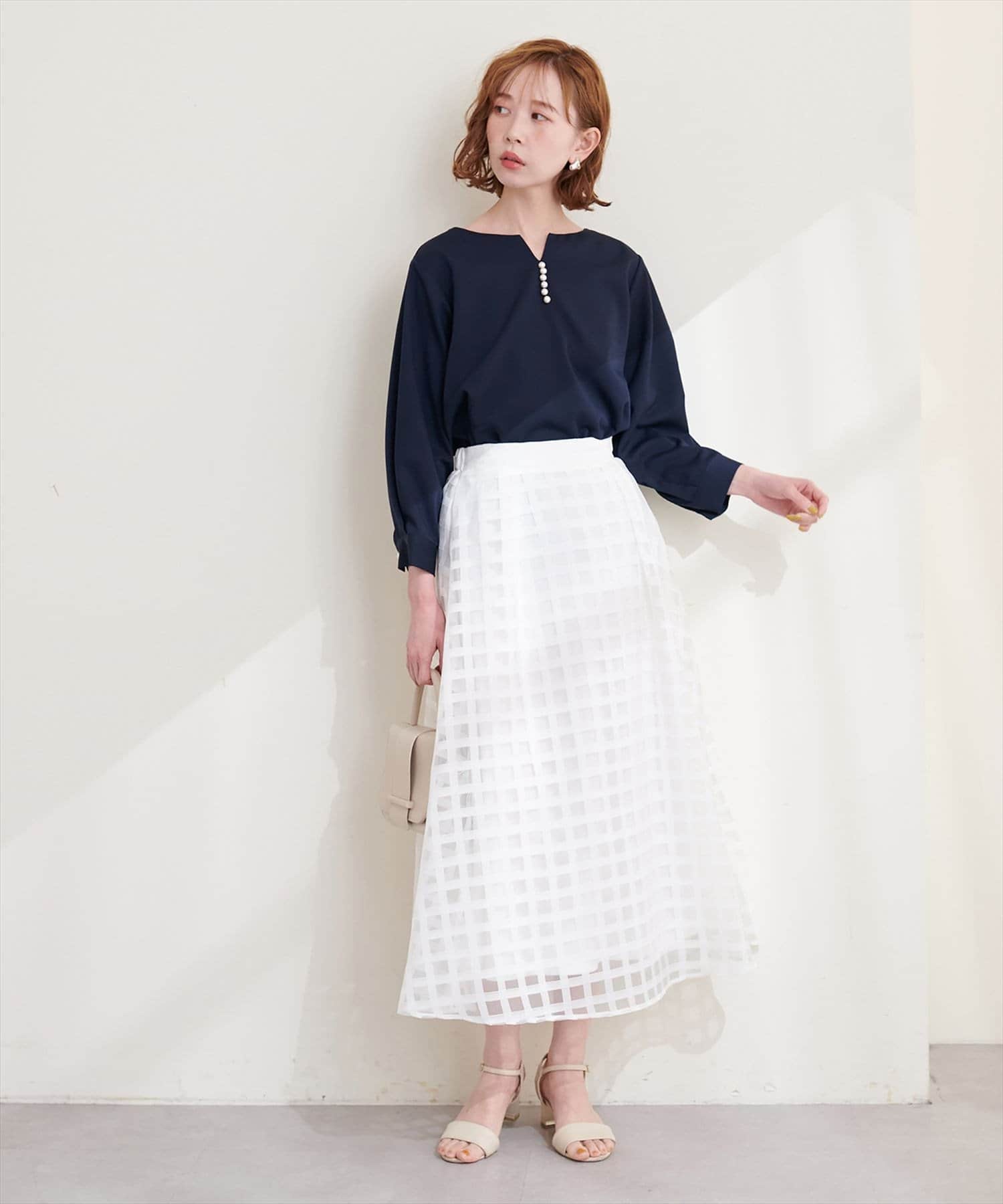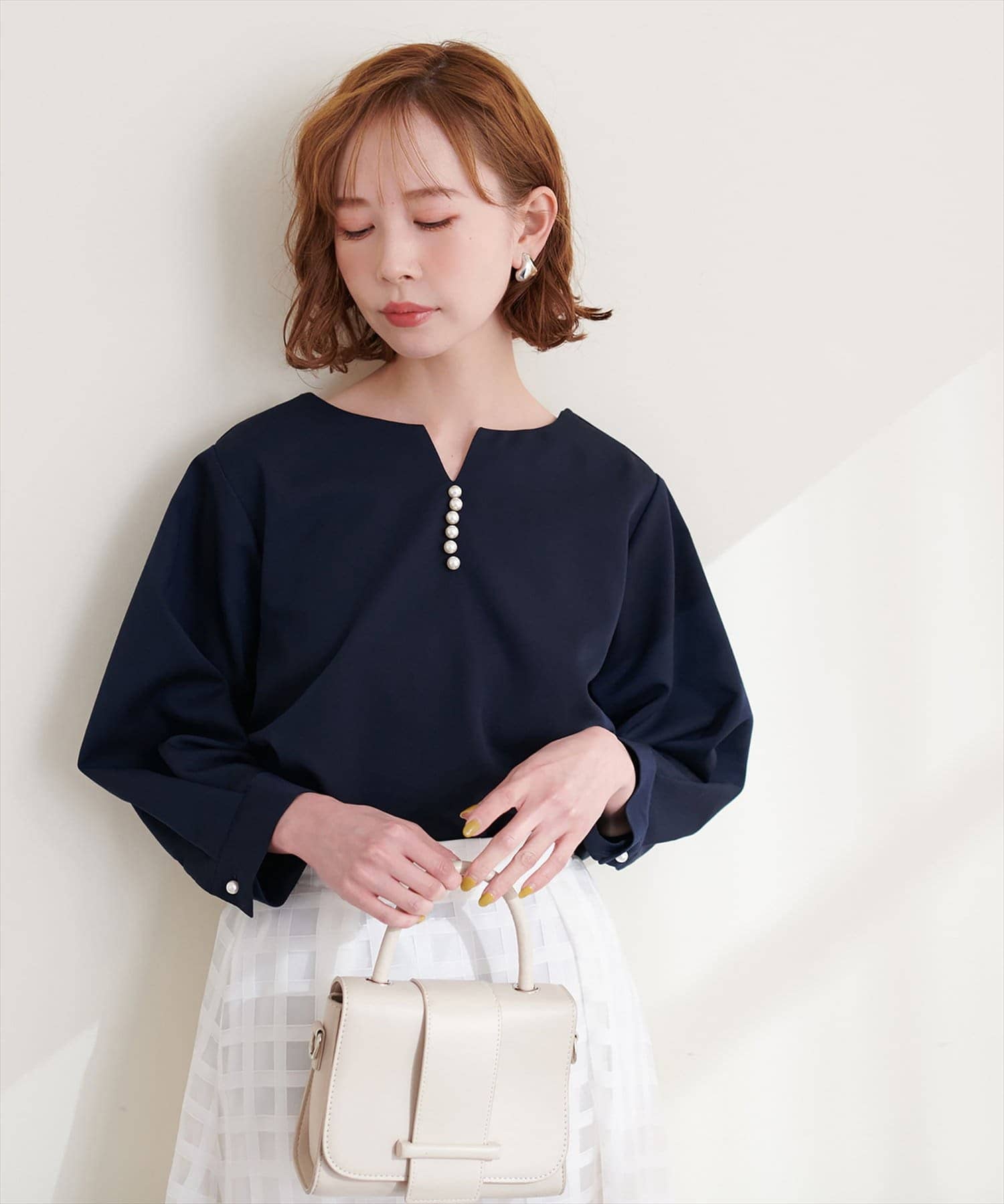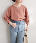 ネックラインをすっきりと見せてくれる程良いスキッパーデザインに、パールを施した大人上品なブラウス。