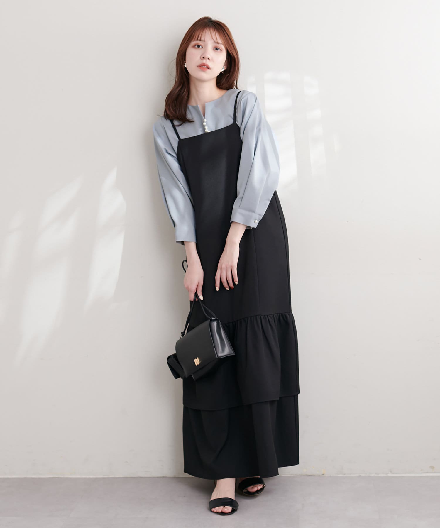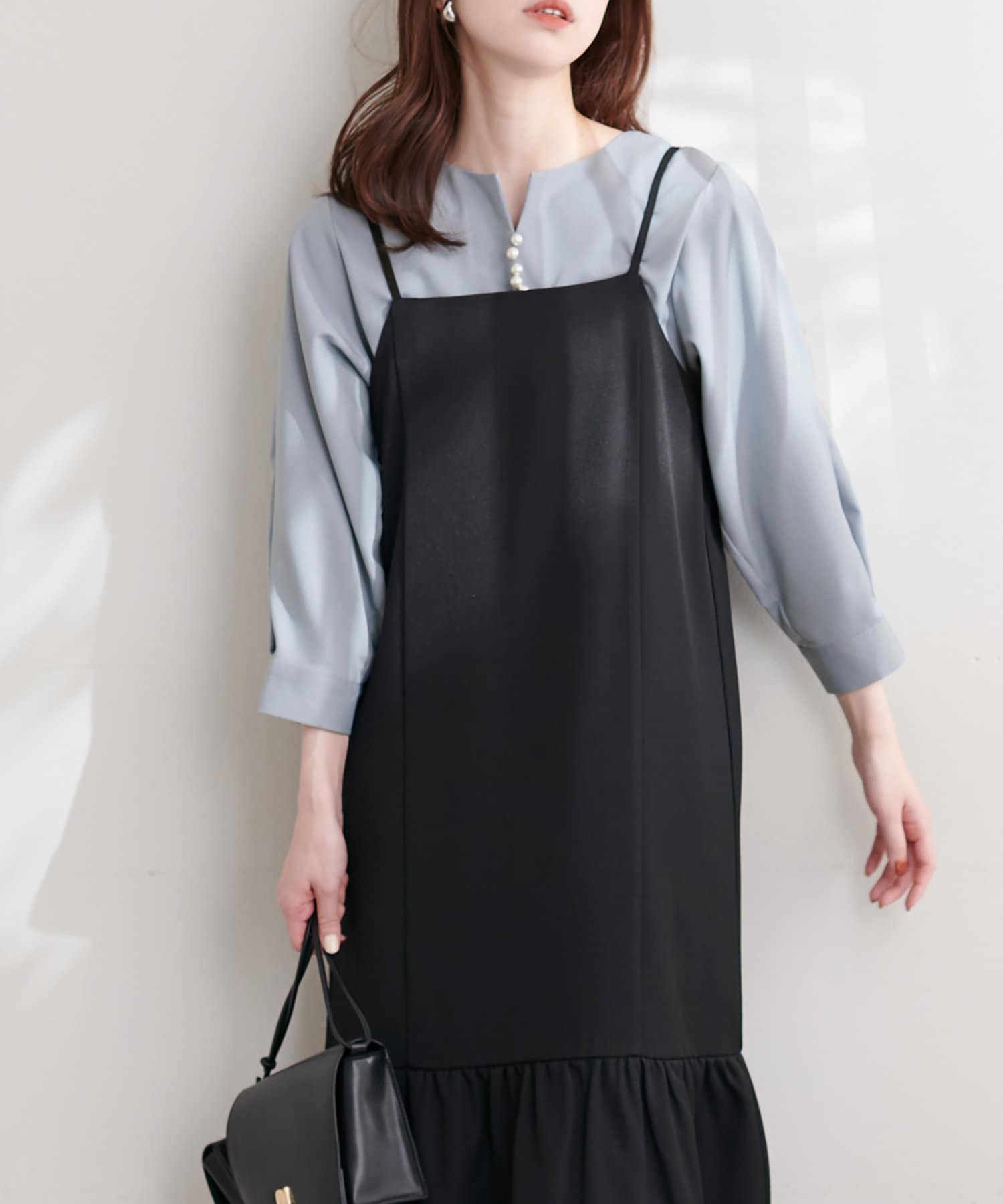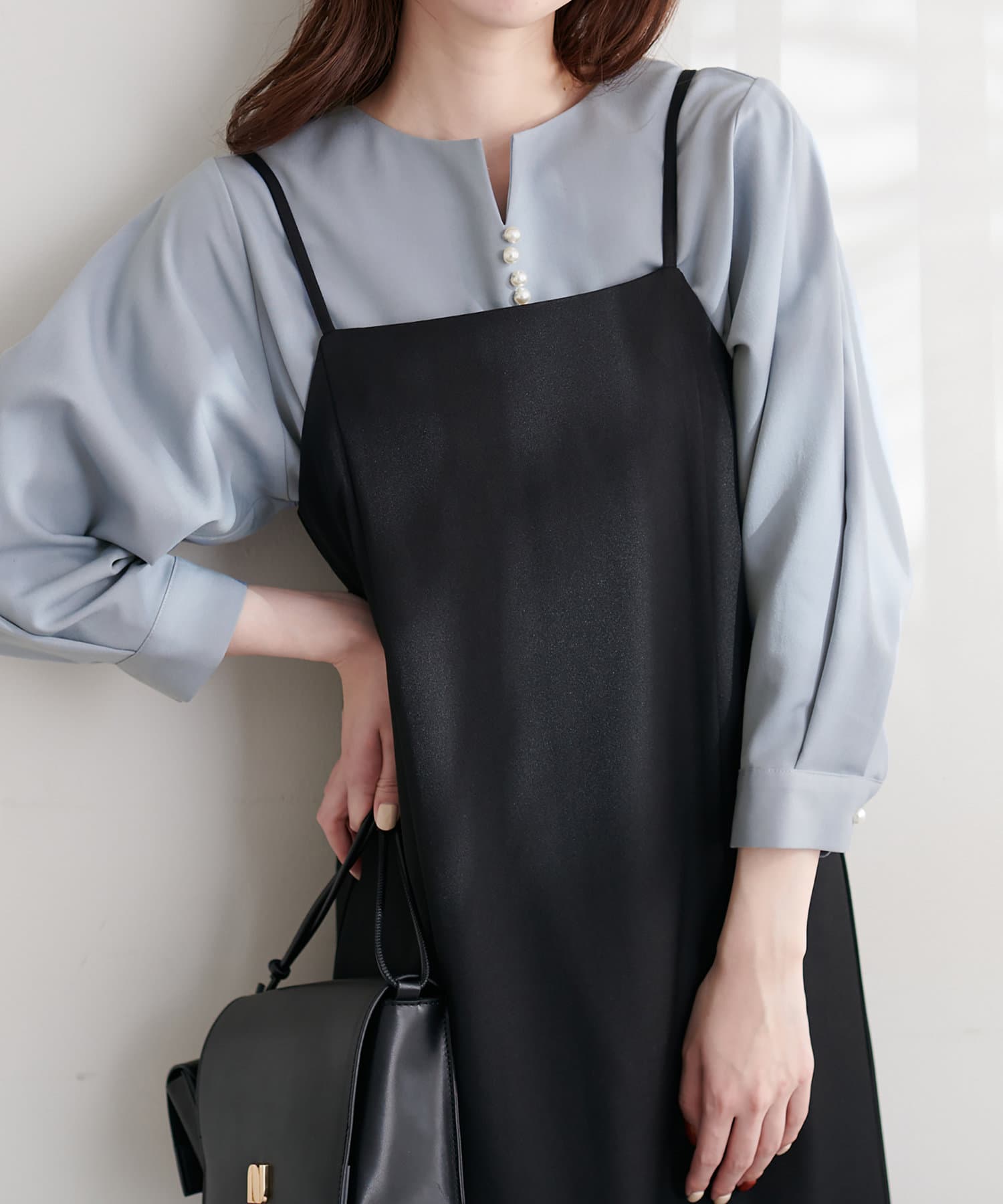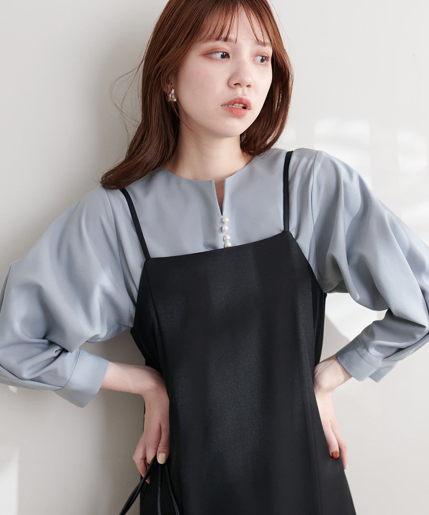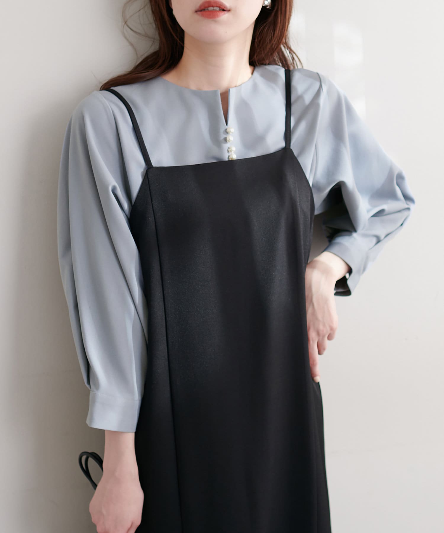 ゆるっとした深Vデザインのサロペットにインナーとして合わせても、フロントのパールがポイント見えして◎
