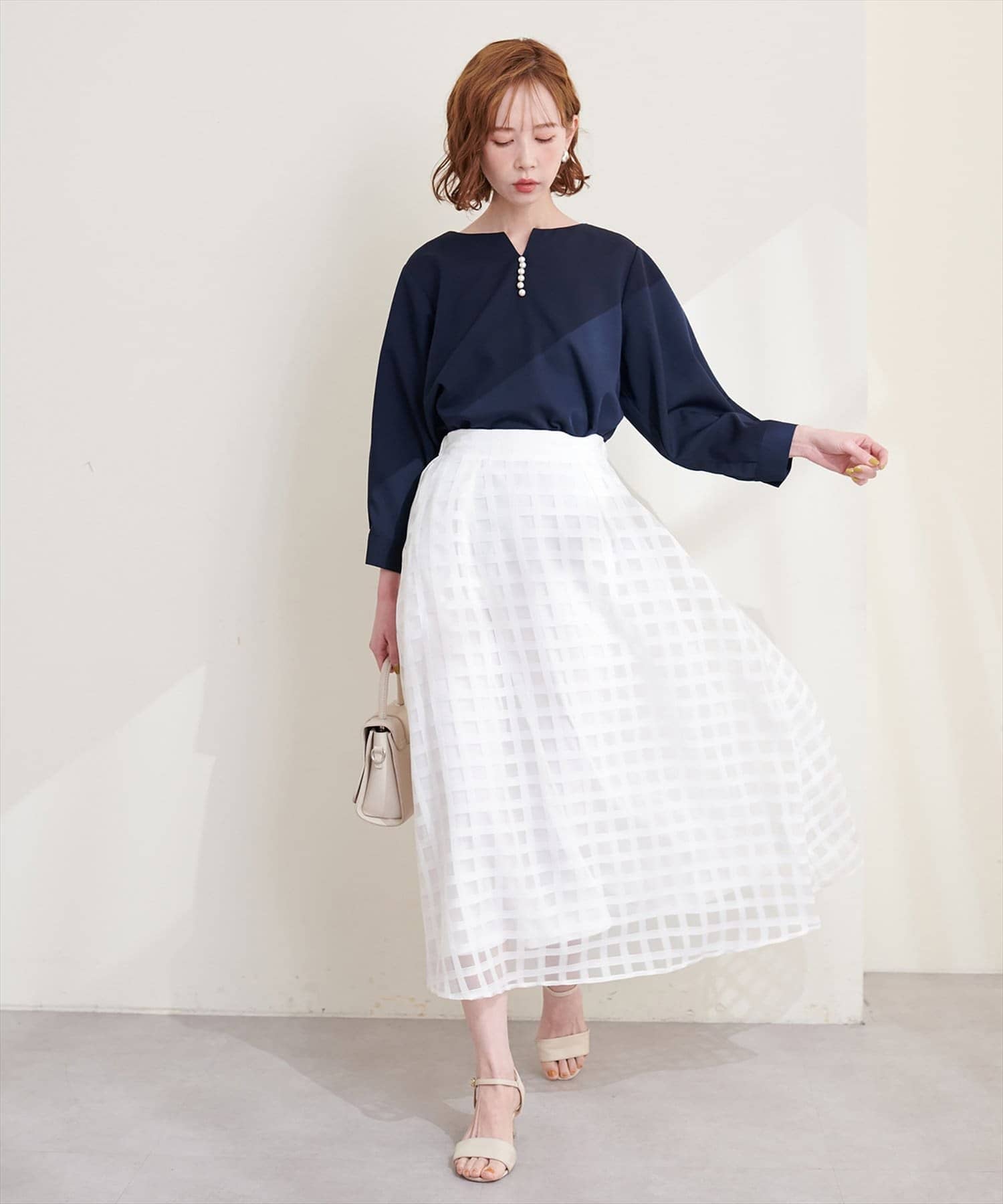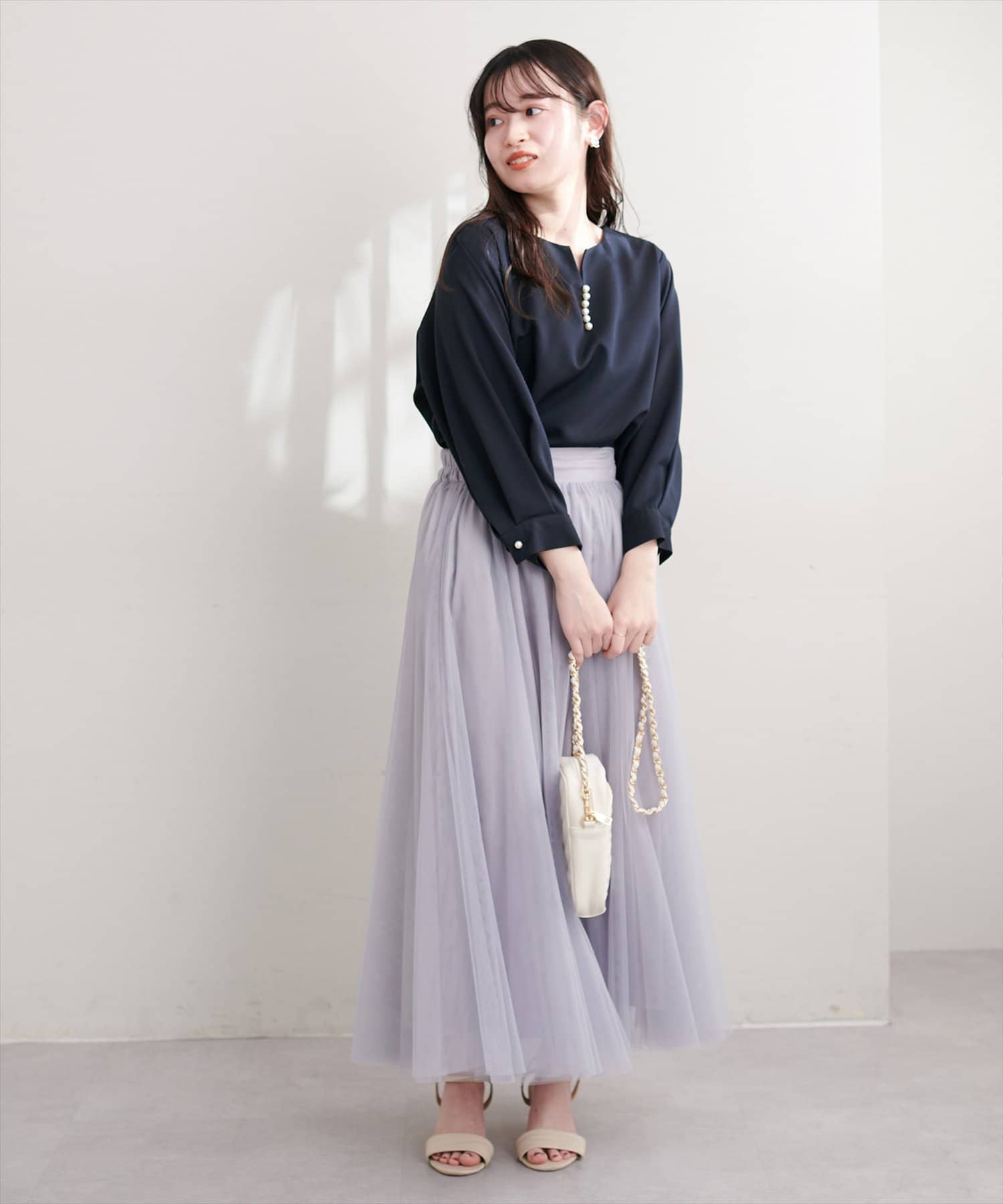 Aラインシルエットのスカートや、レース調のスカートにウエストインしてすっきり上品に合わせて頂くのはもちろん、