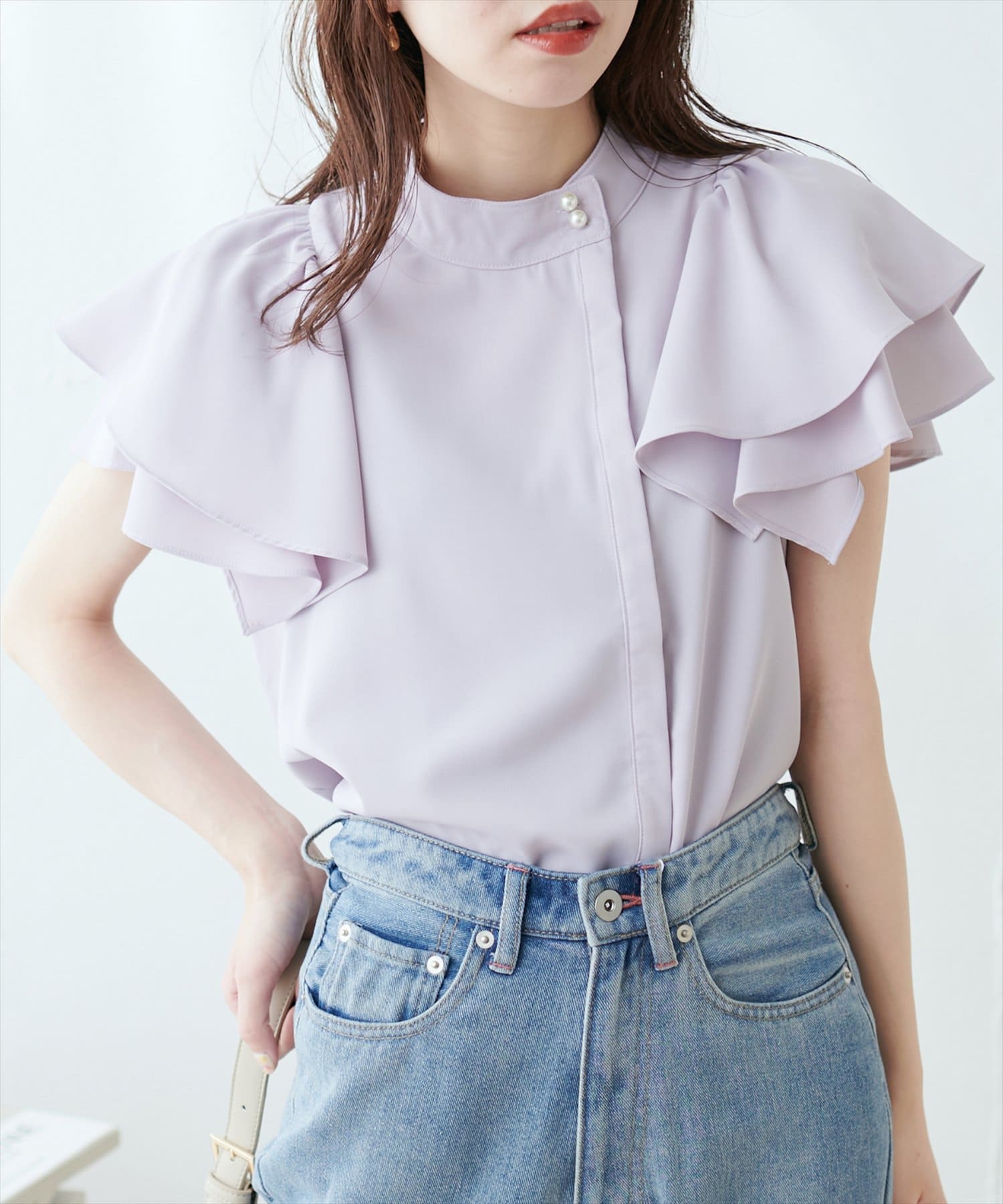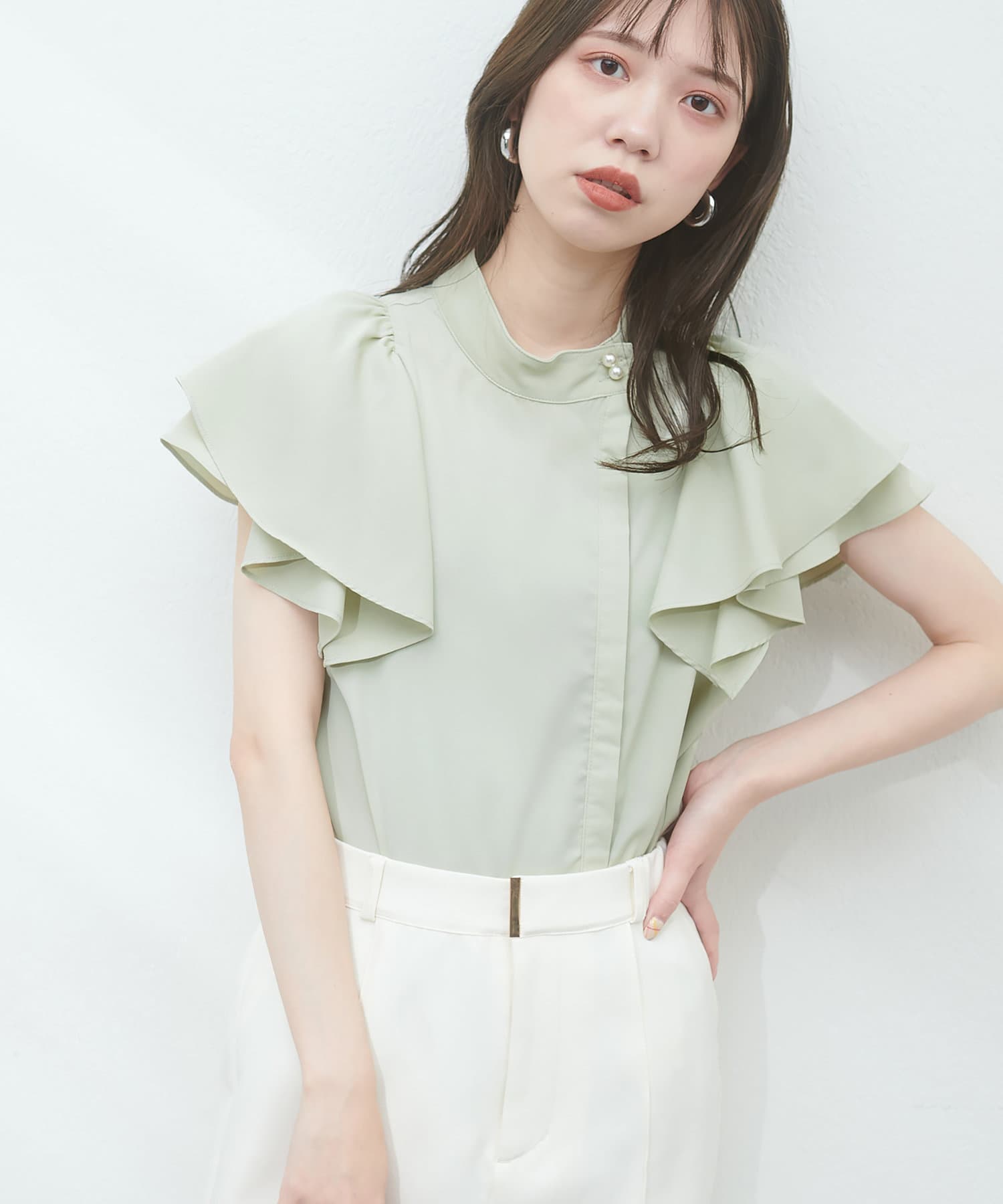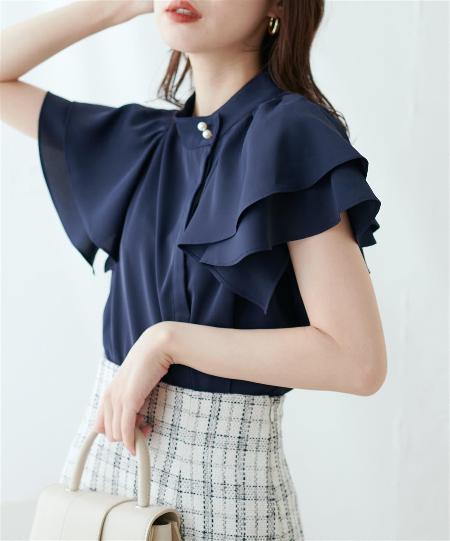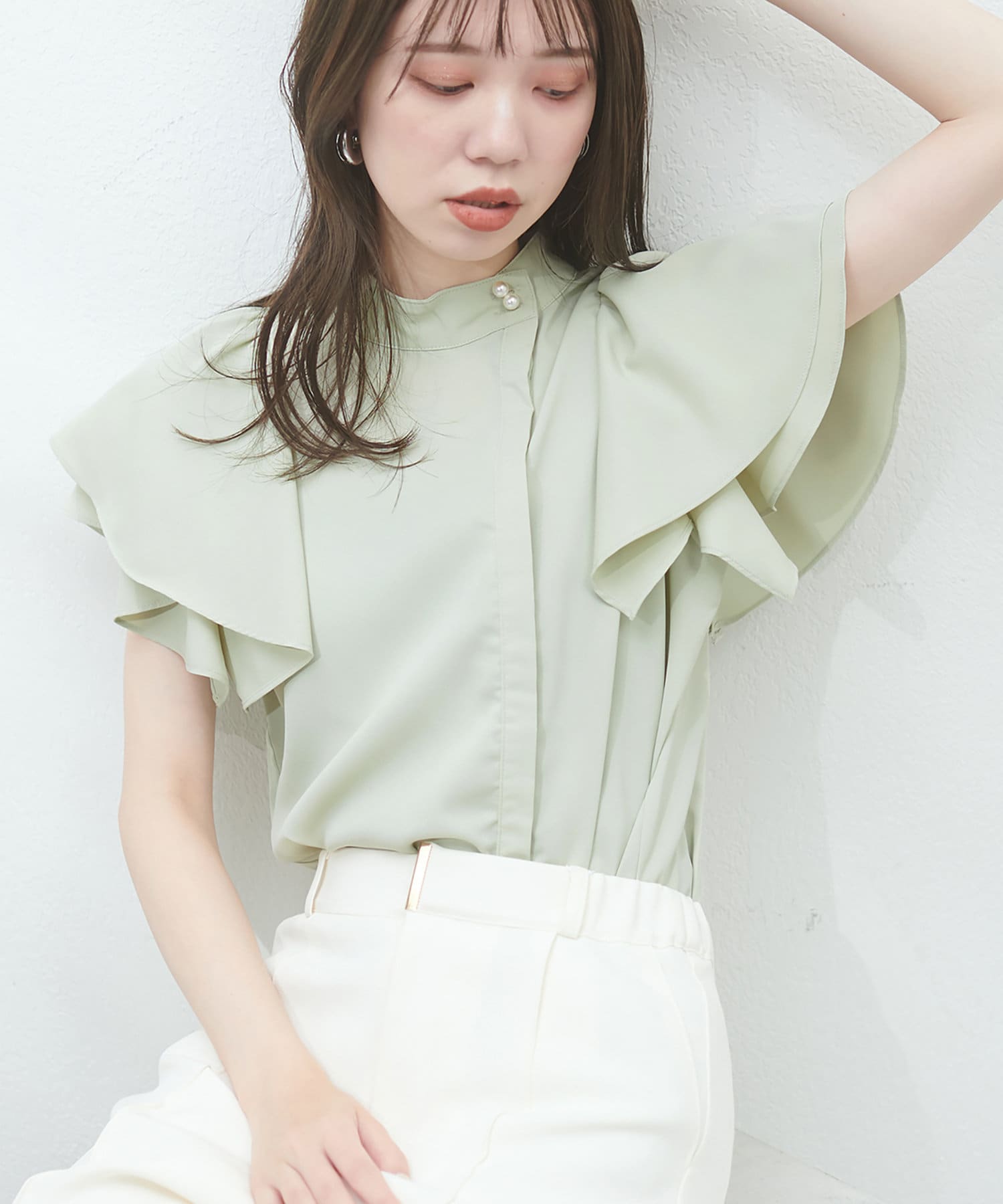 柔らかなラッフルフリルとパール使いが目を惹くブラウス