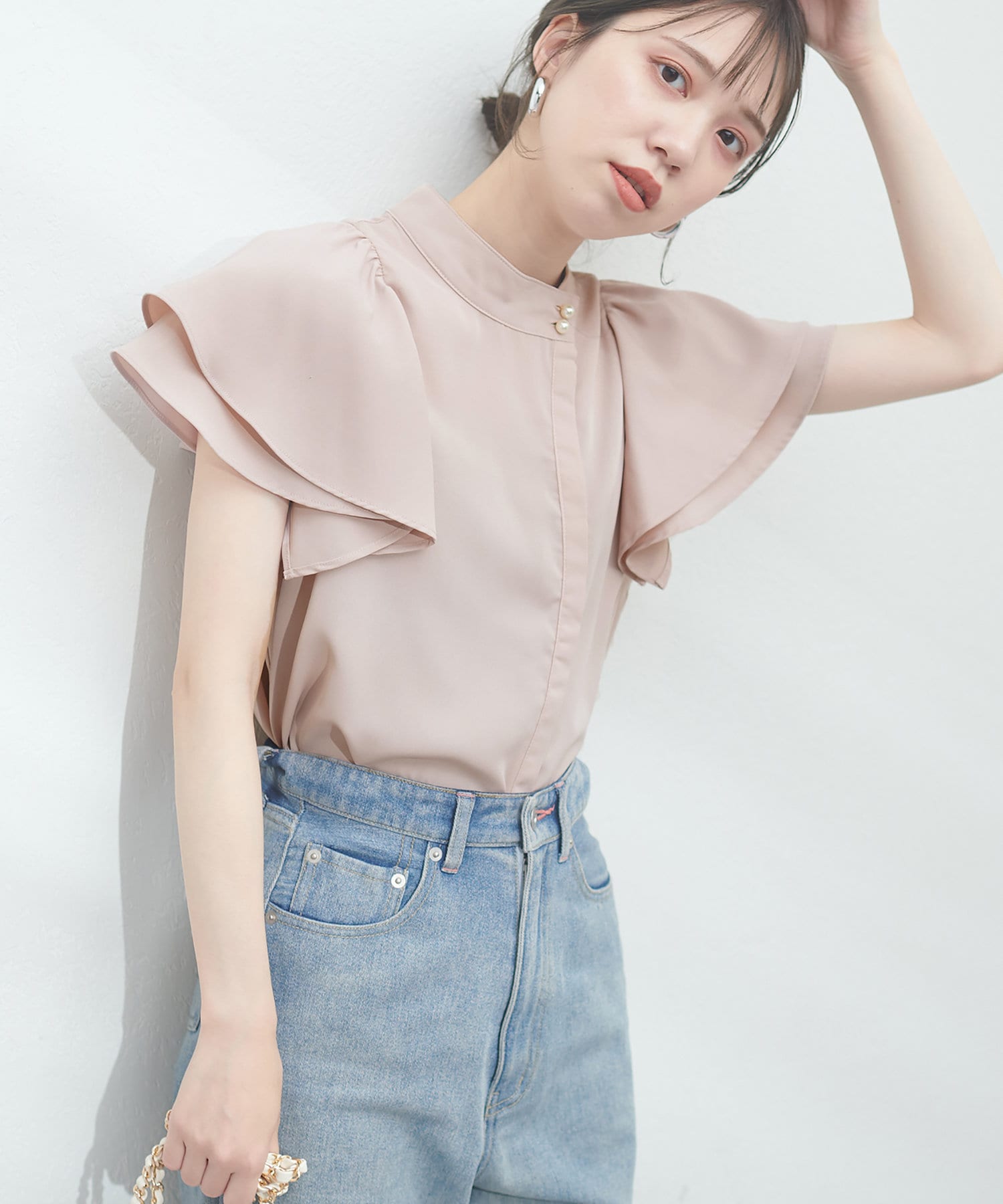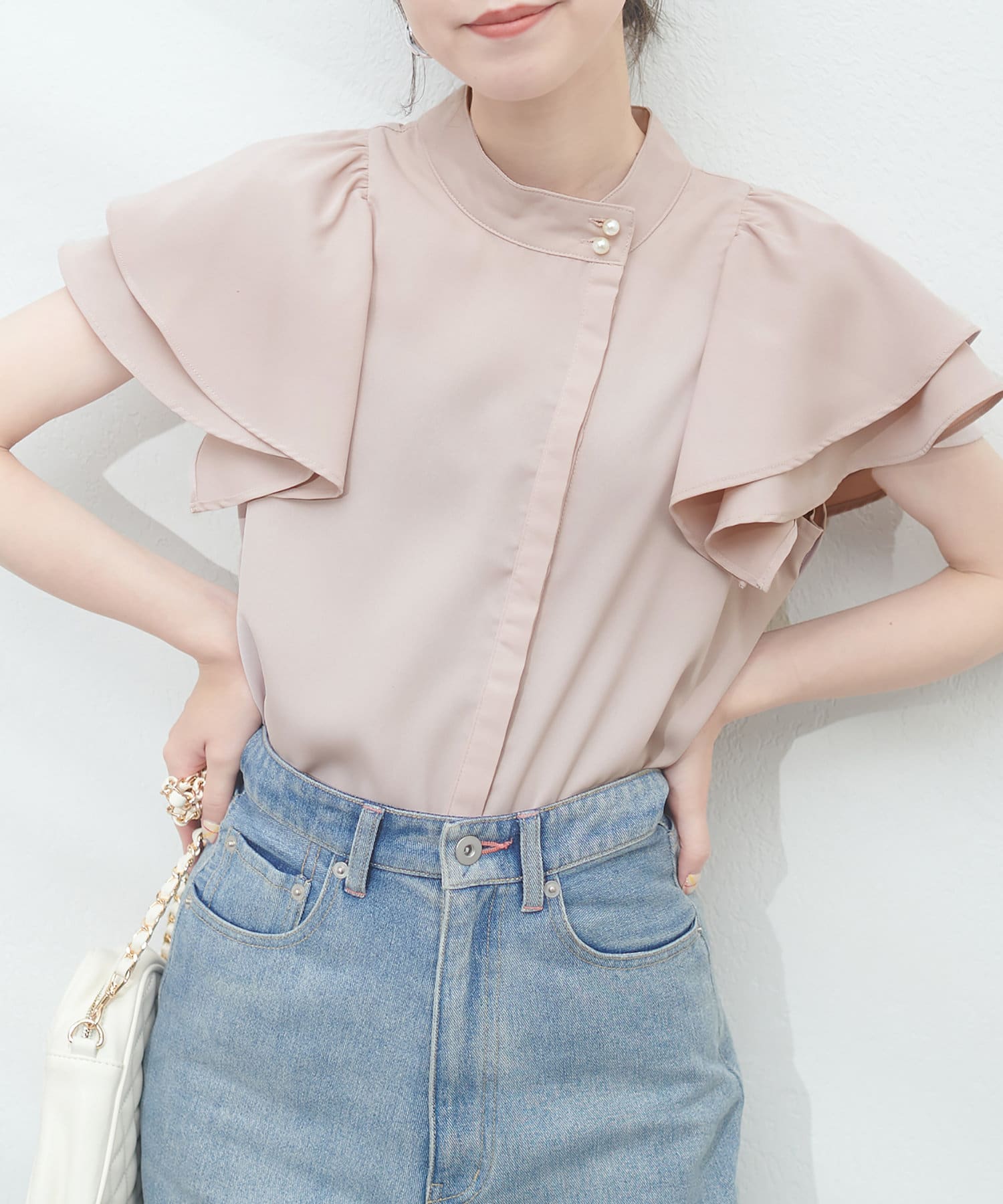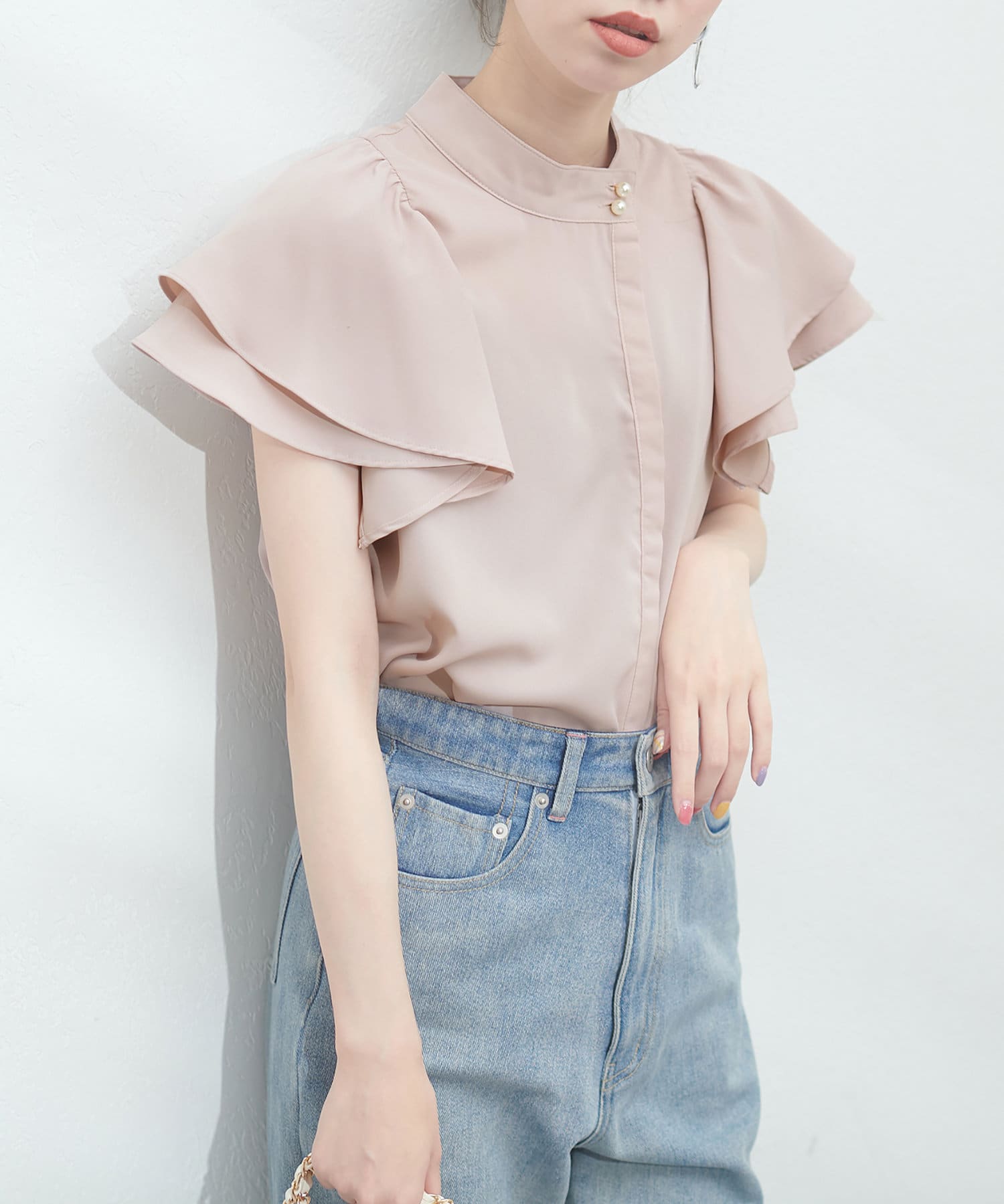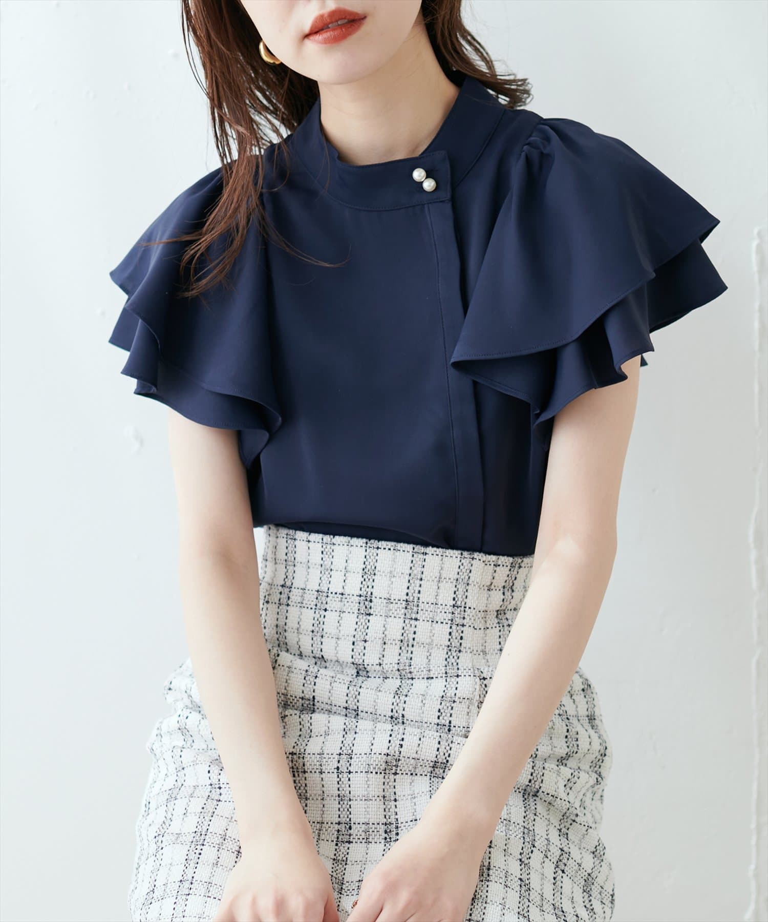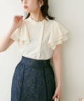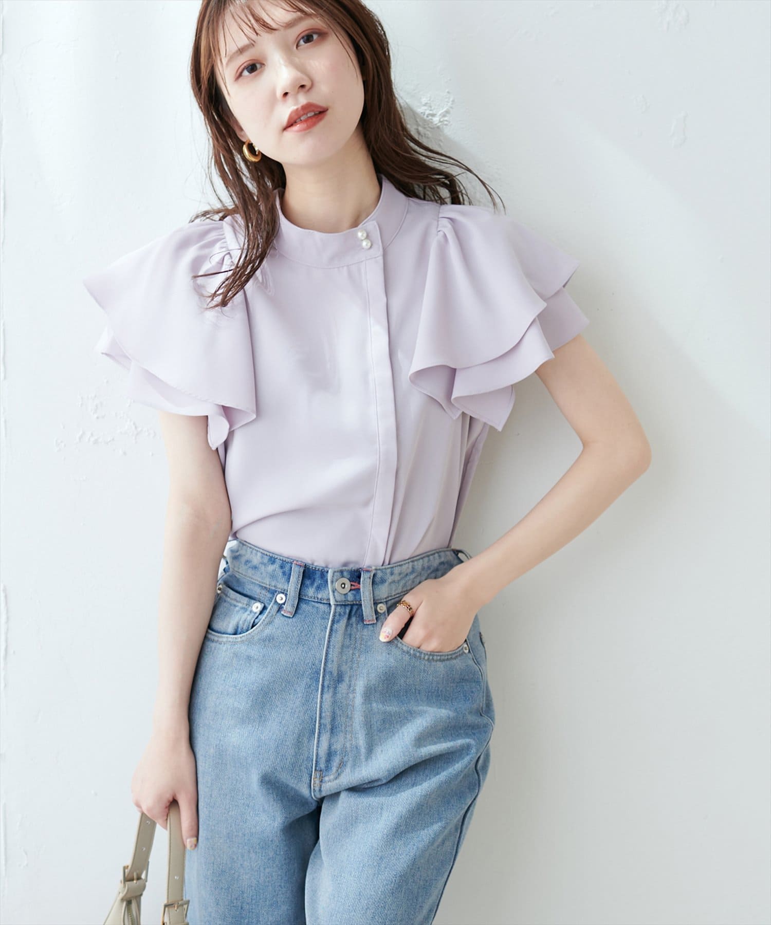柔らかなラッフルフリルとパール使いが目を惹くブラウス