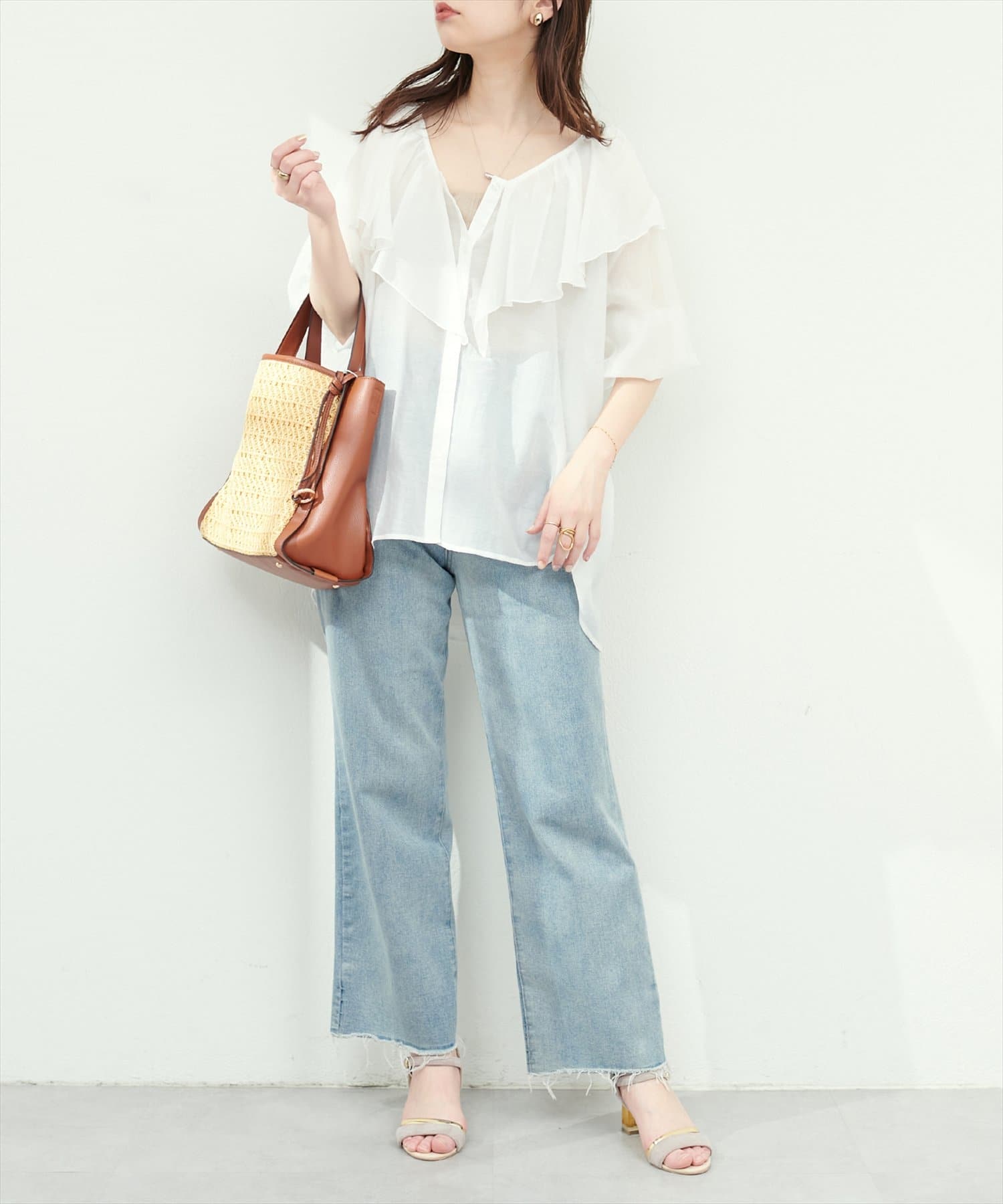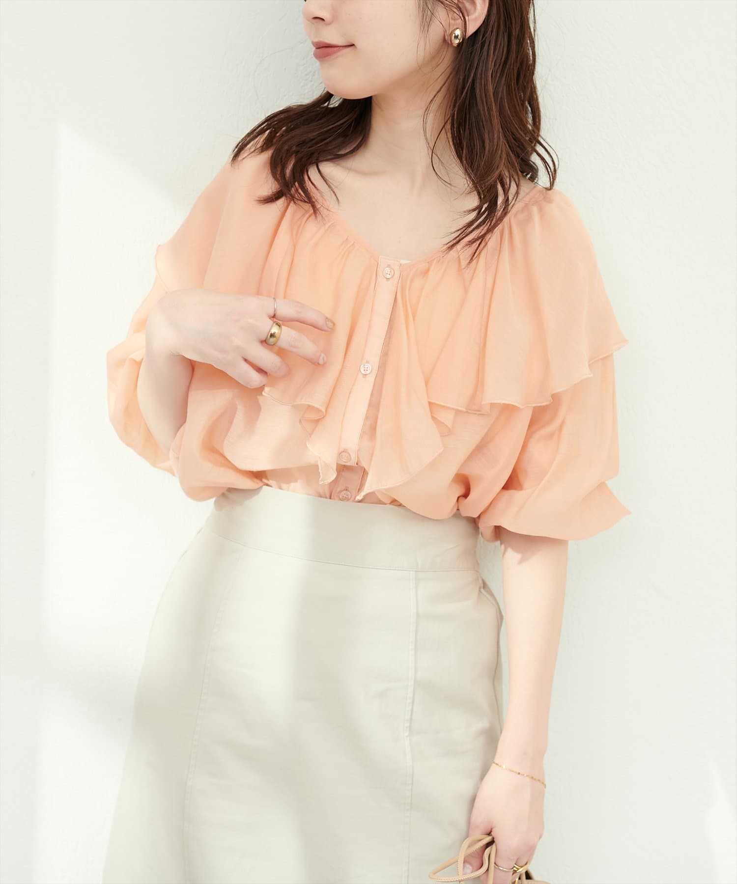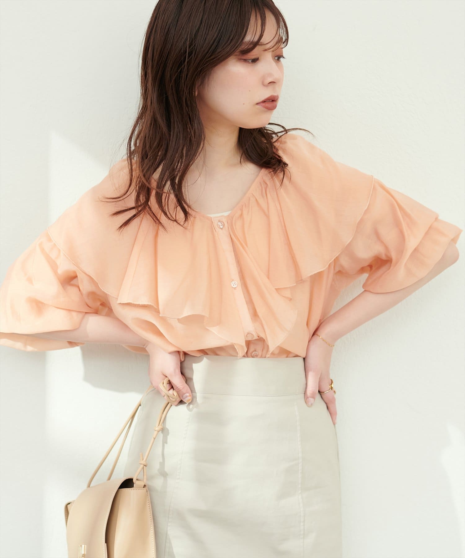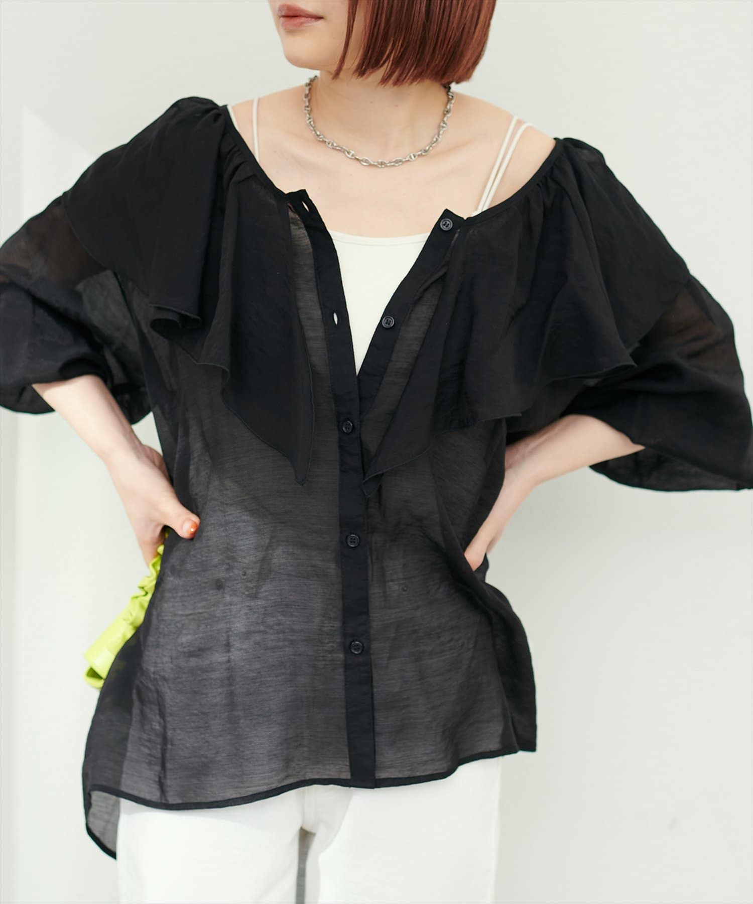 大人なシアー魅せ。ビッグフリル襟ブラウス
