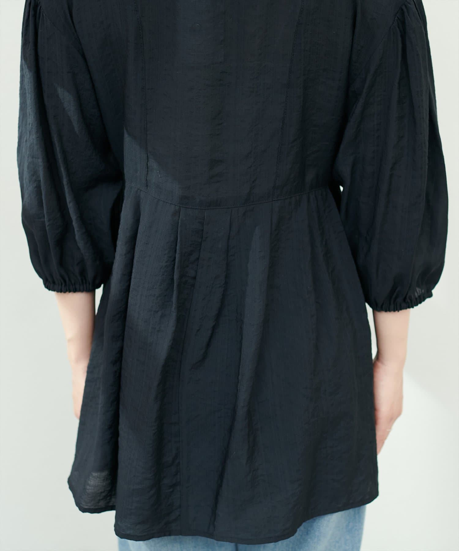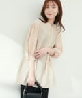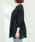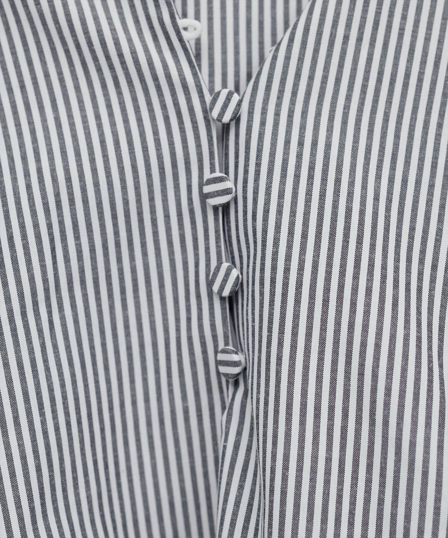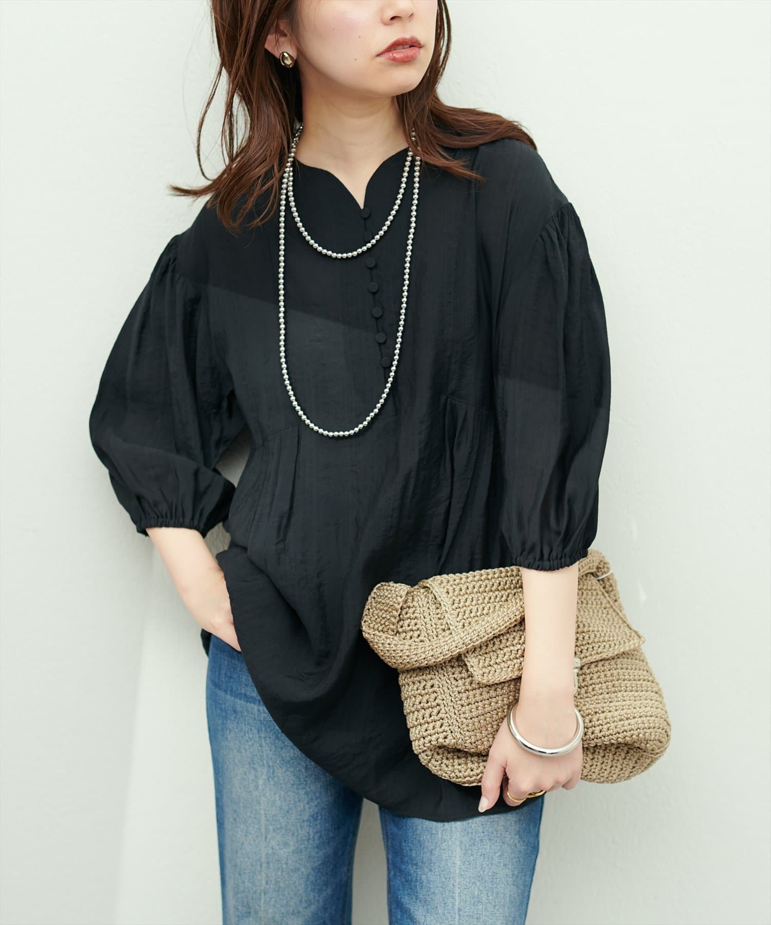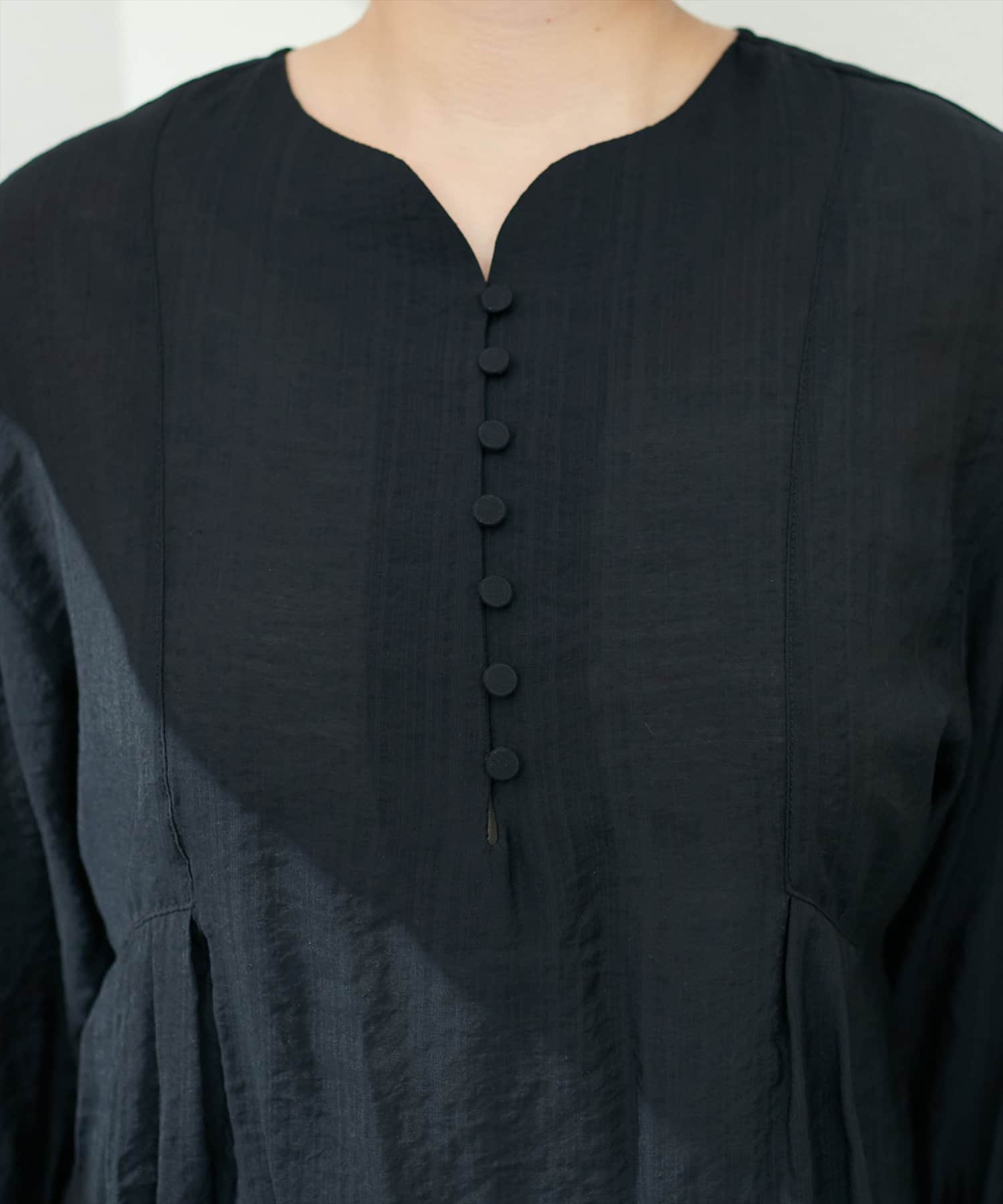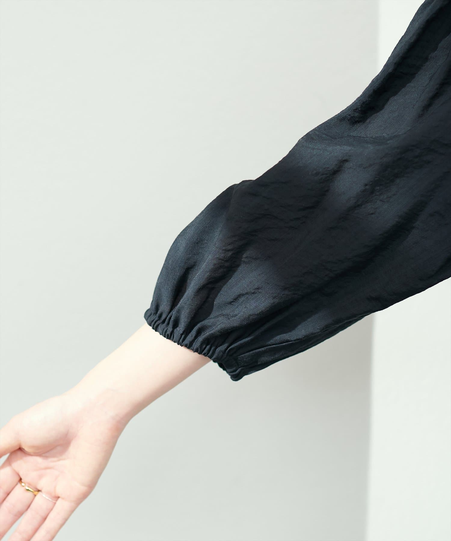 胸元のくるみボタンもブラウスと同色のマット素材に仕上げ、ボタンを少しあけることでデコルテを綺麗に見せてくれます。