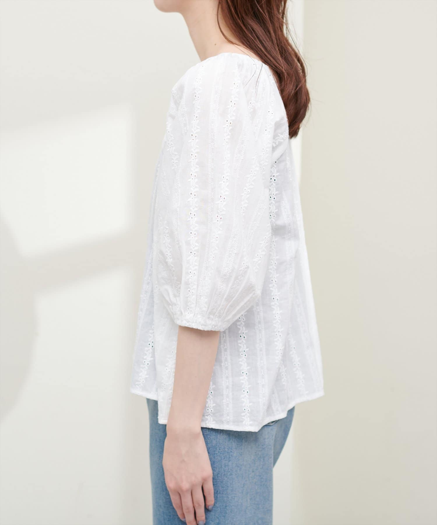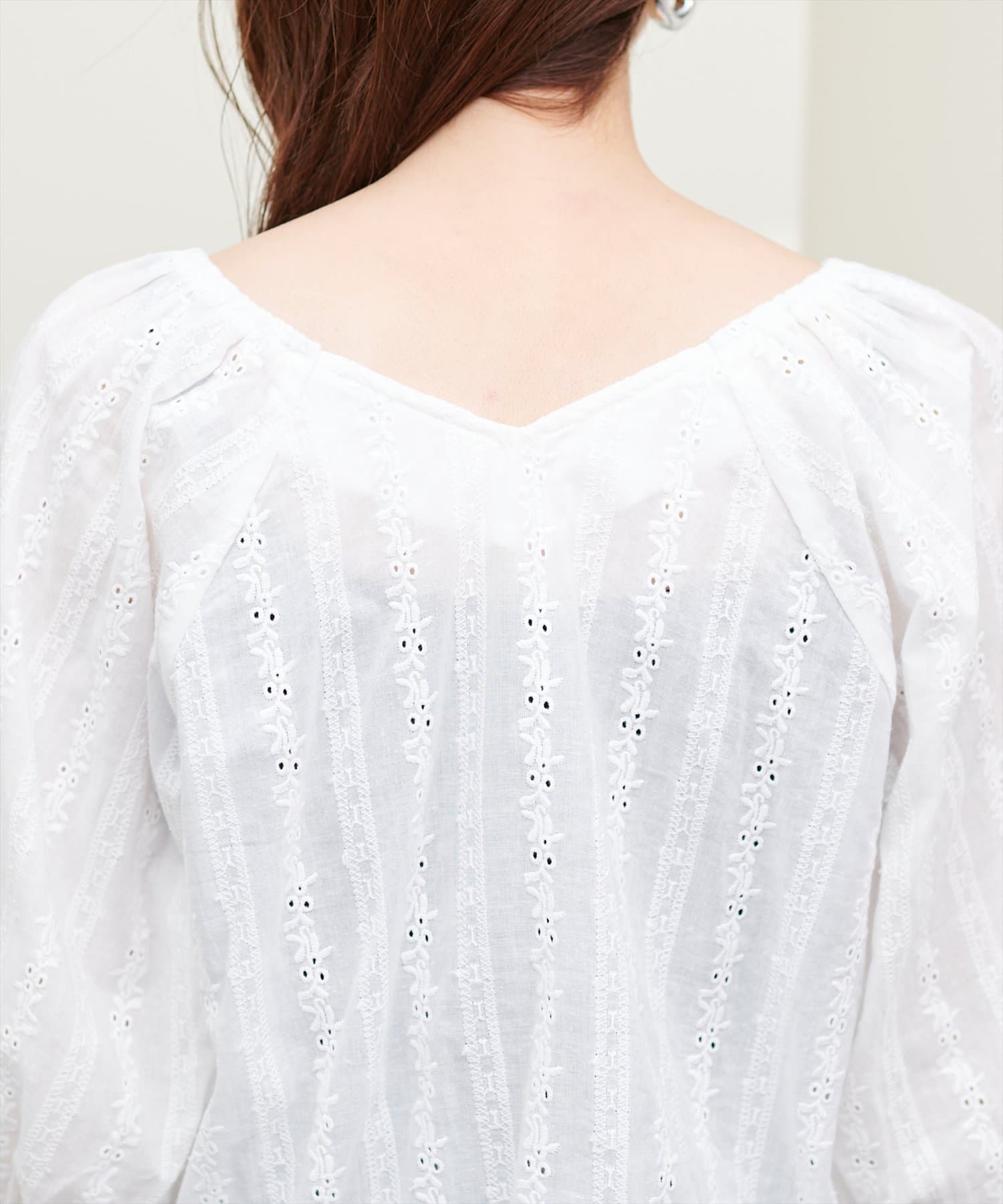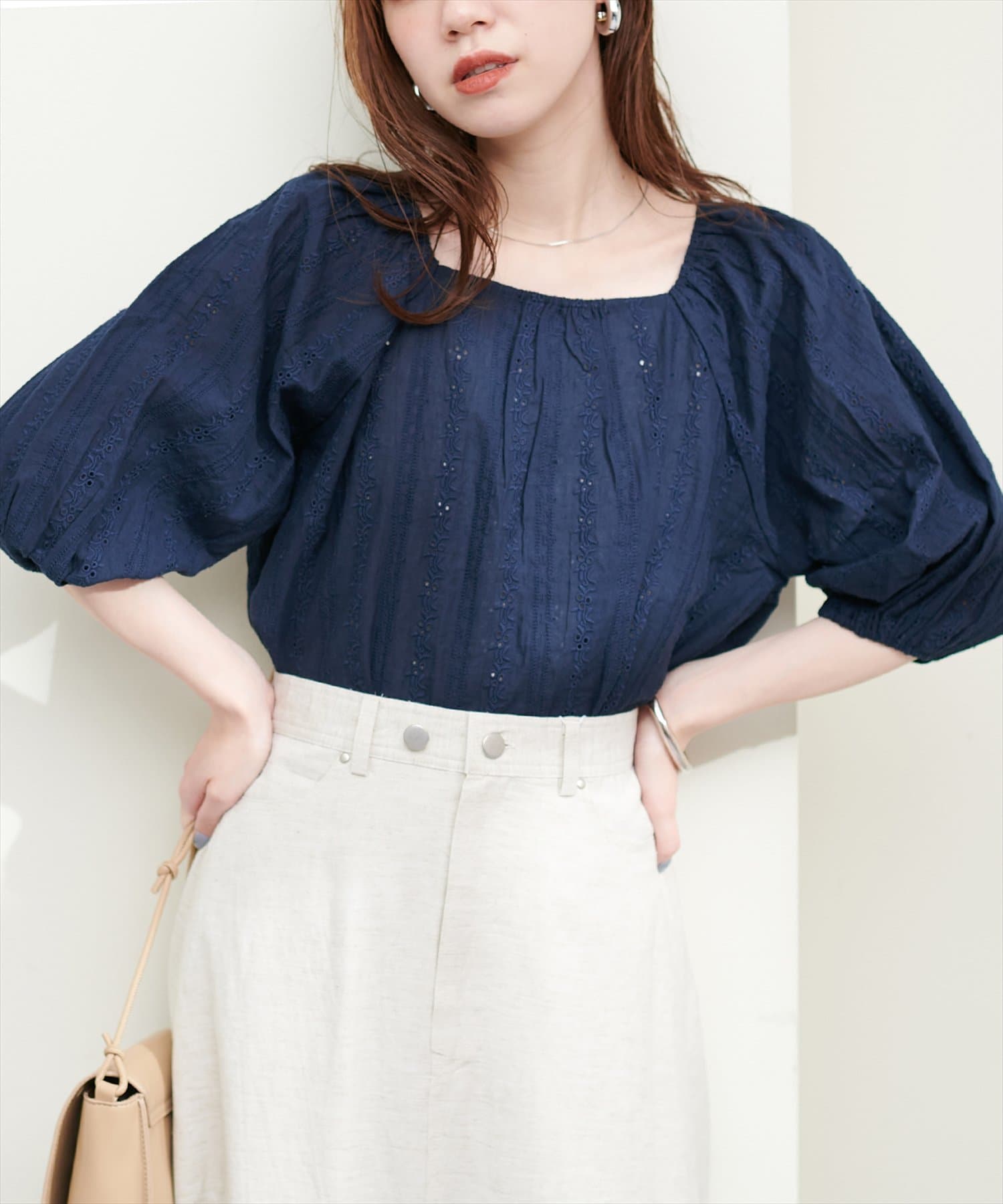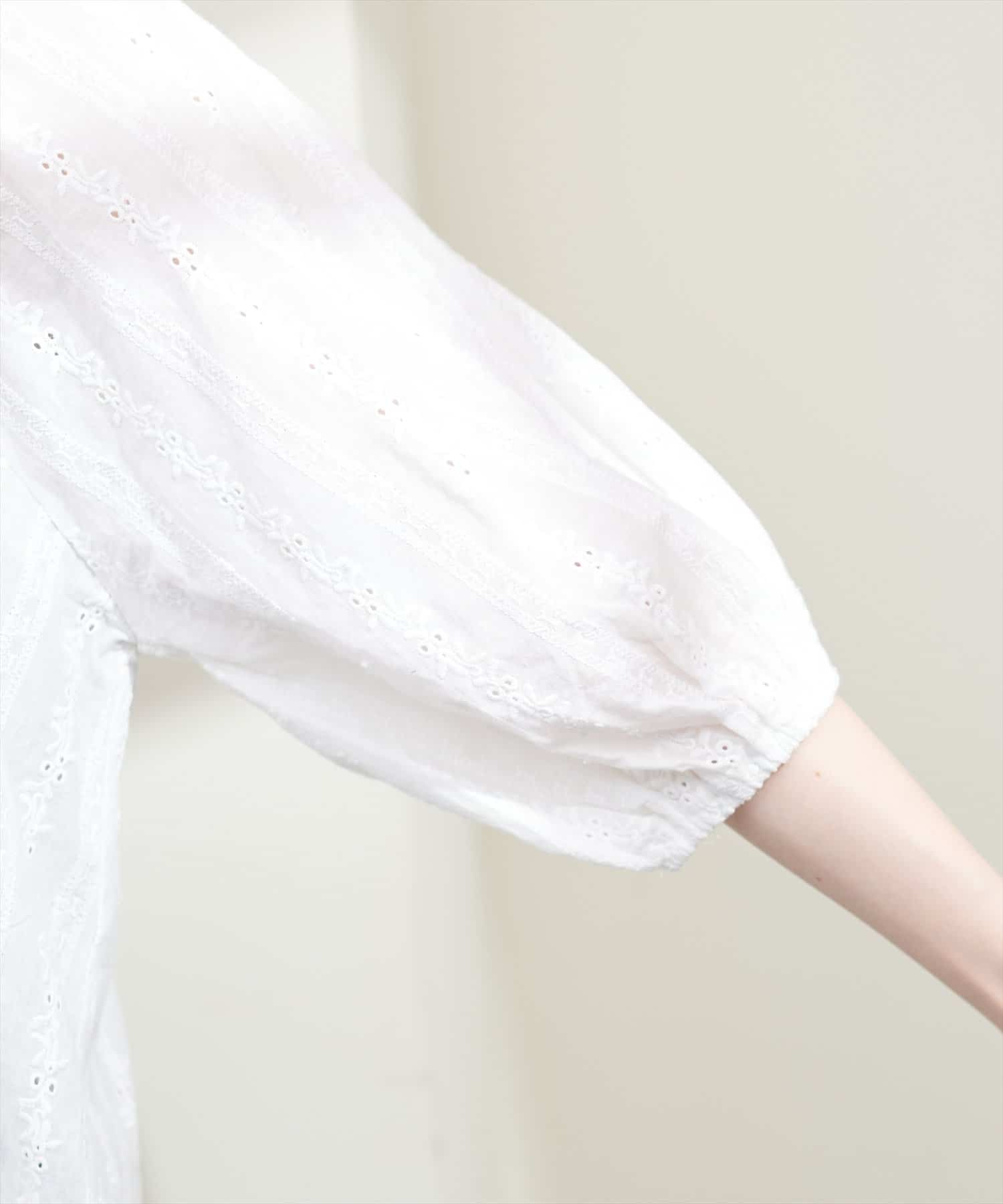 トレンドのボリューム袖に、コットン100%のレースを使用した華やかな1枚。
