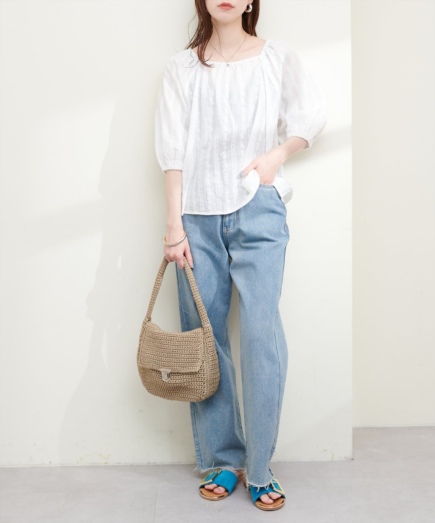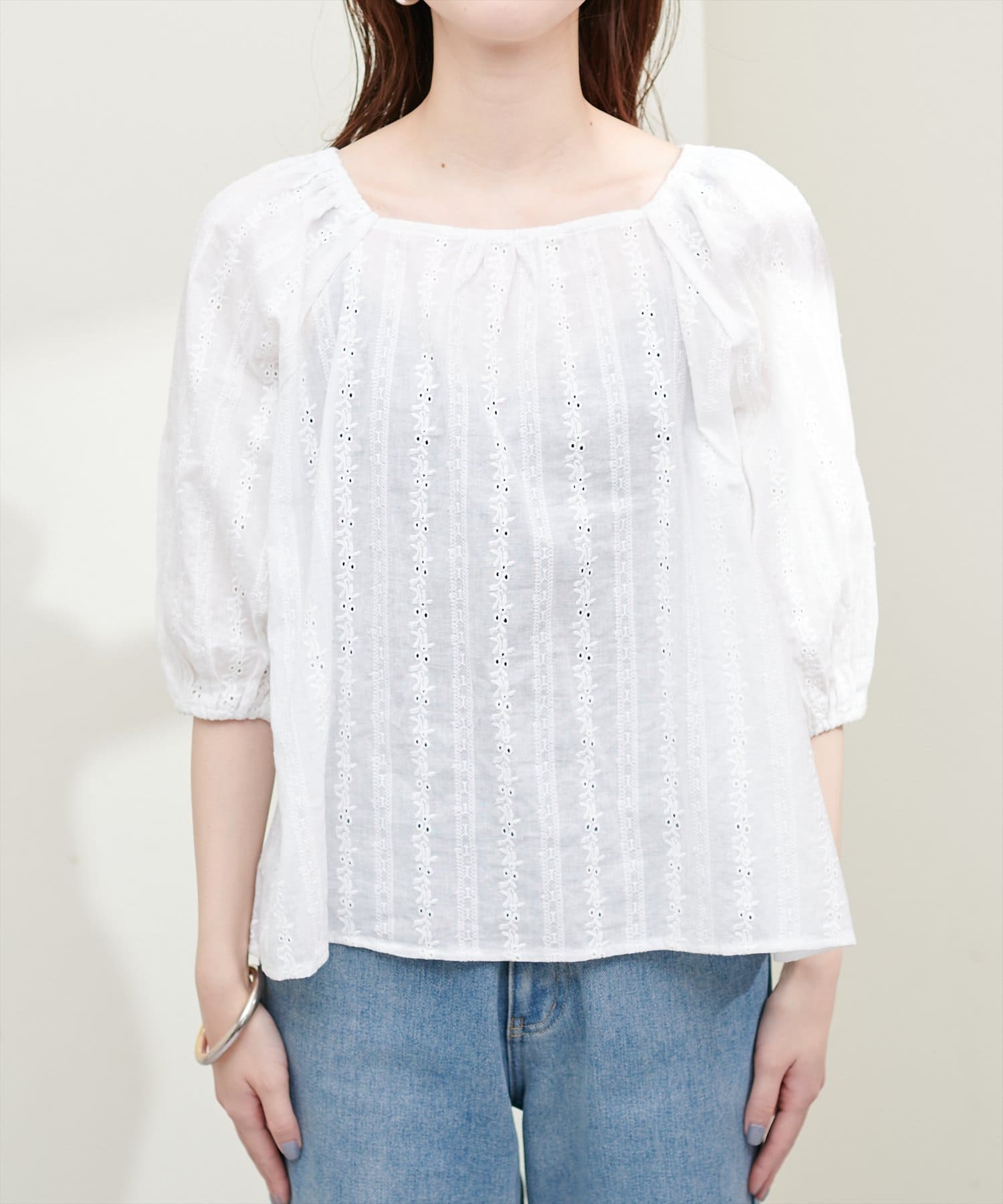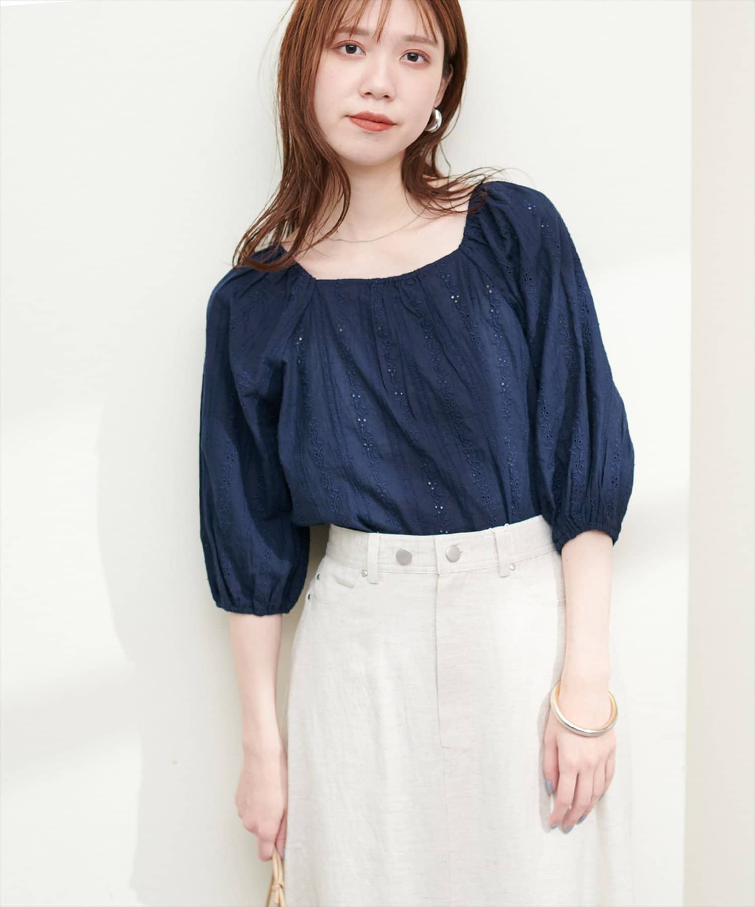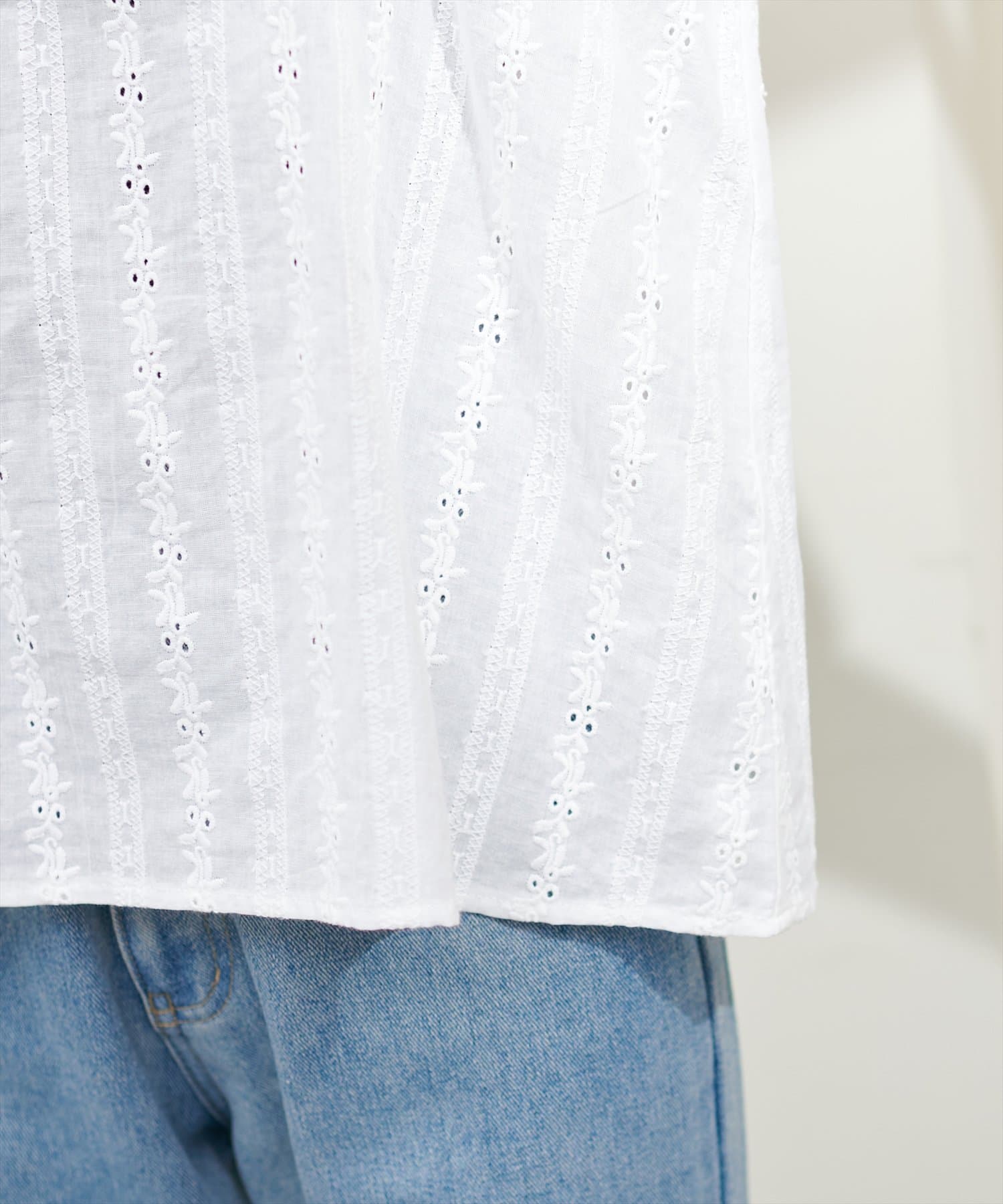 程よい透け感と花柄刺繍がフェミニンな抜け感を演出してくれる1枚です。