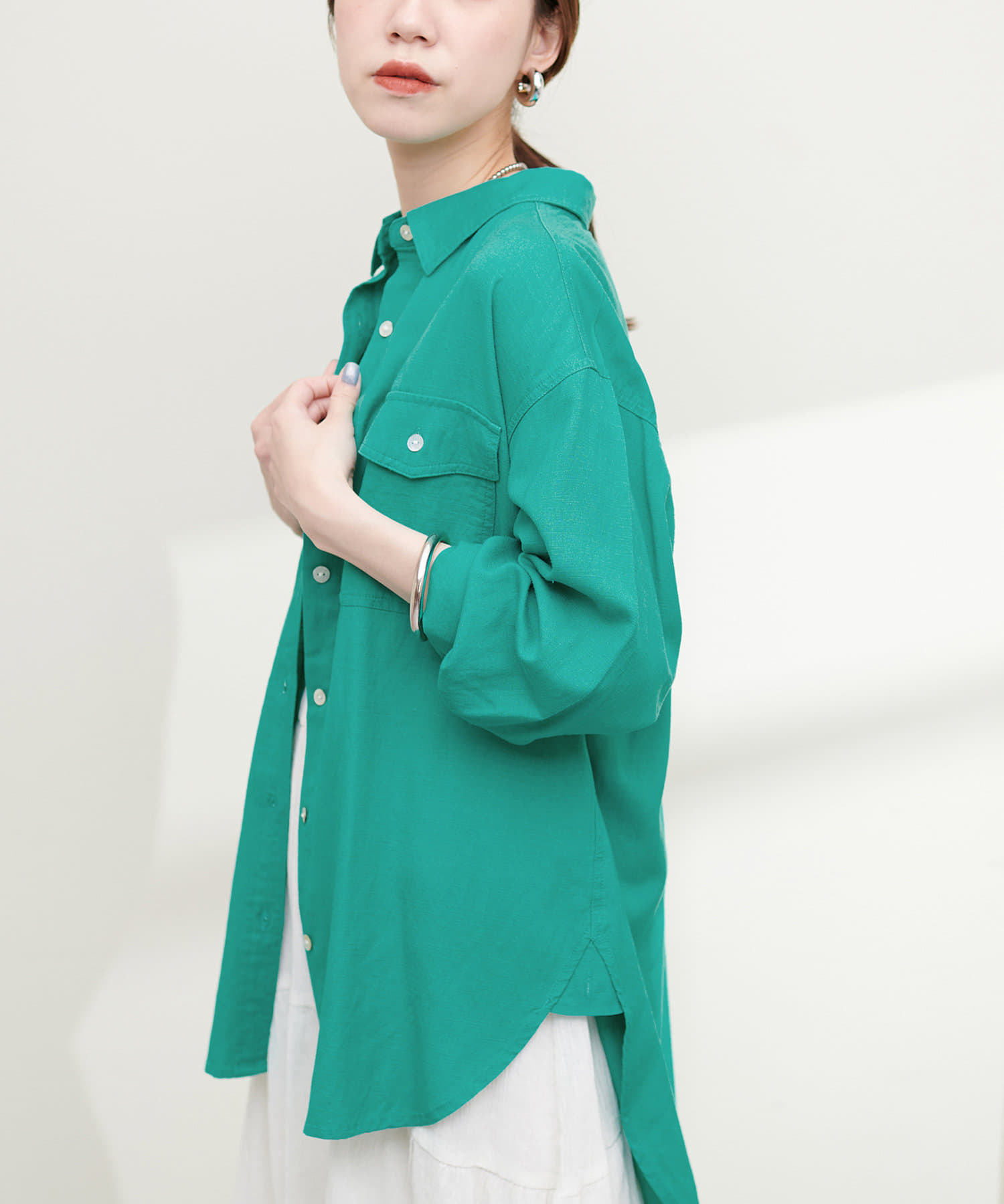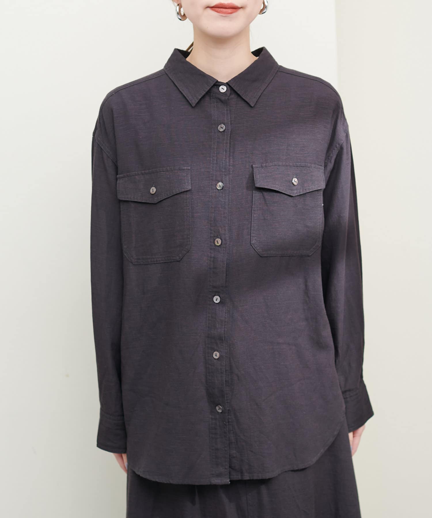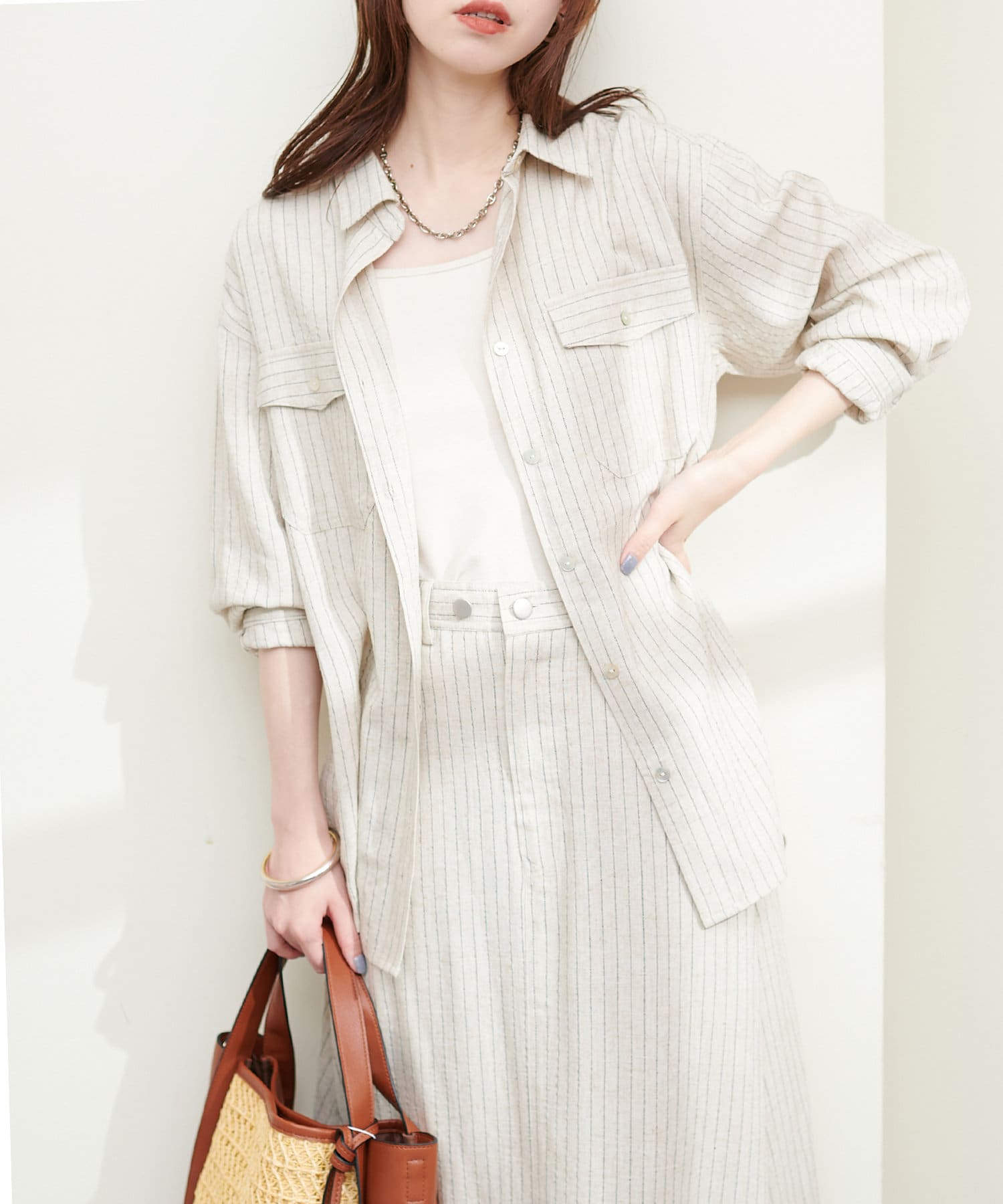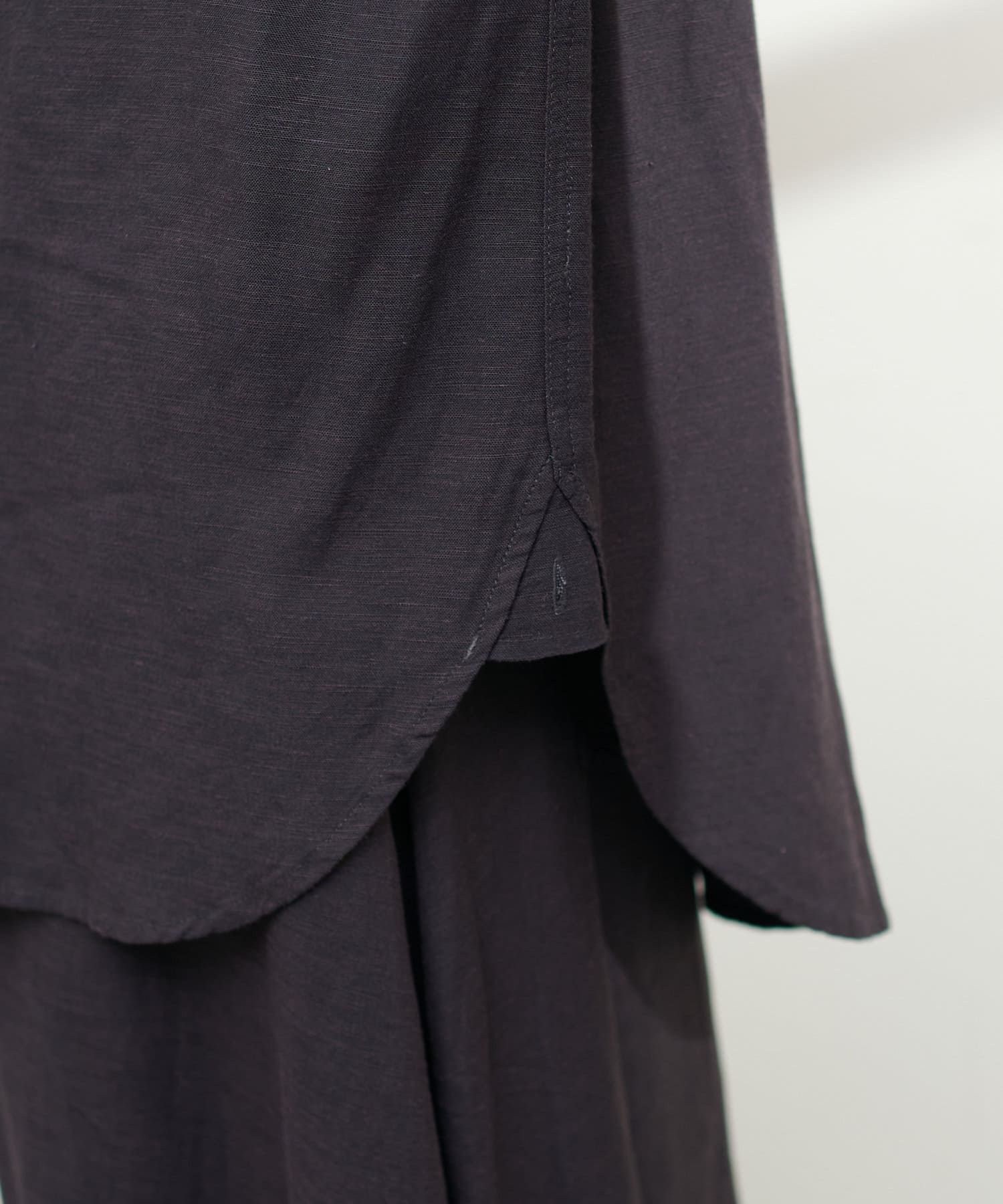 ハリ感のあるさらりとした麻調合繊のロングシャツ。