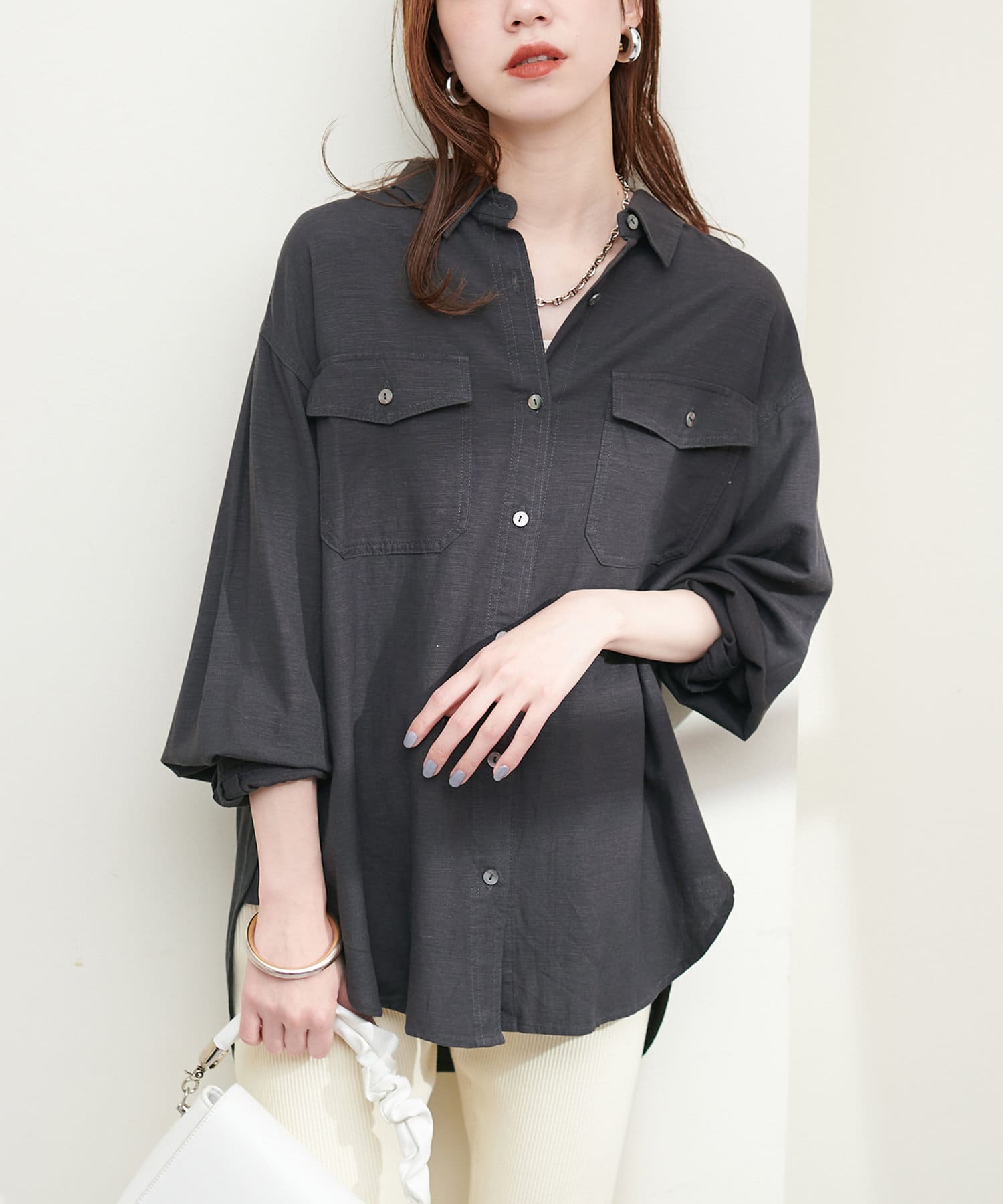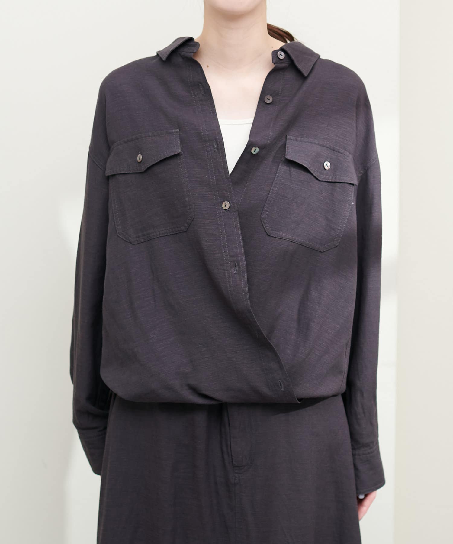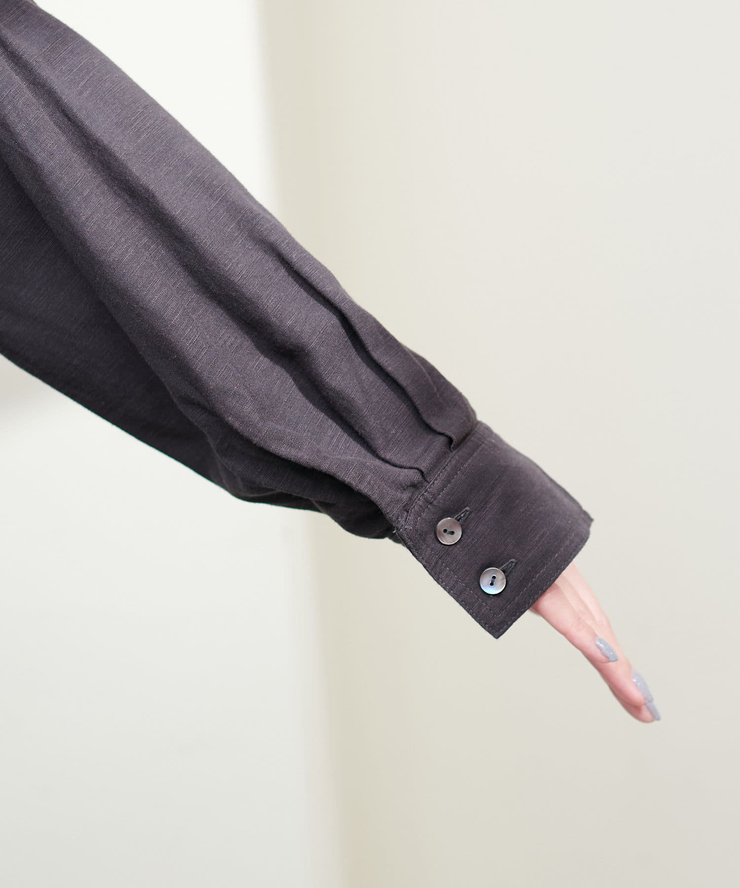 ハリ感のあるさらりとした麻調合繊のロングシャツ。