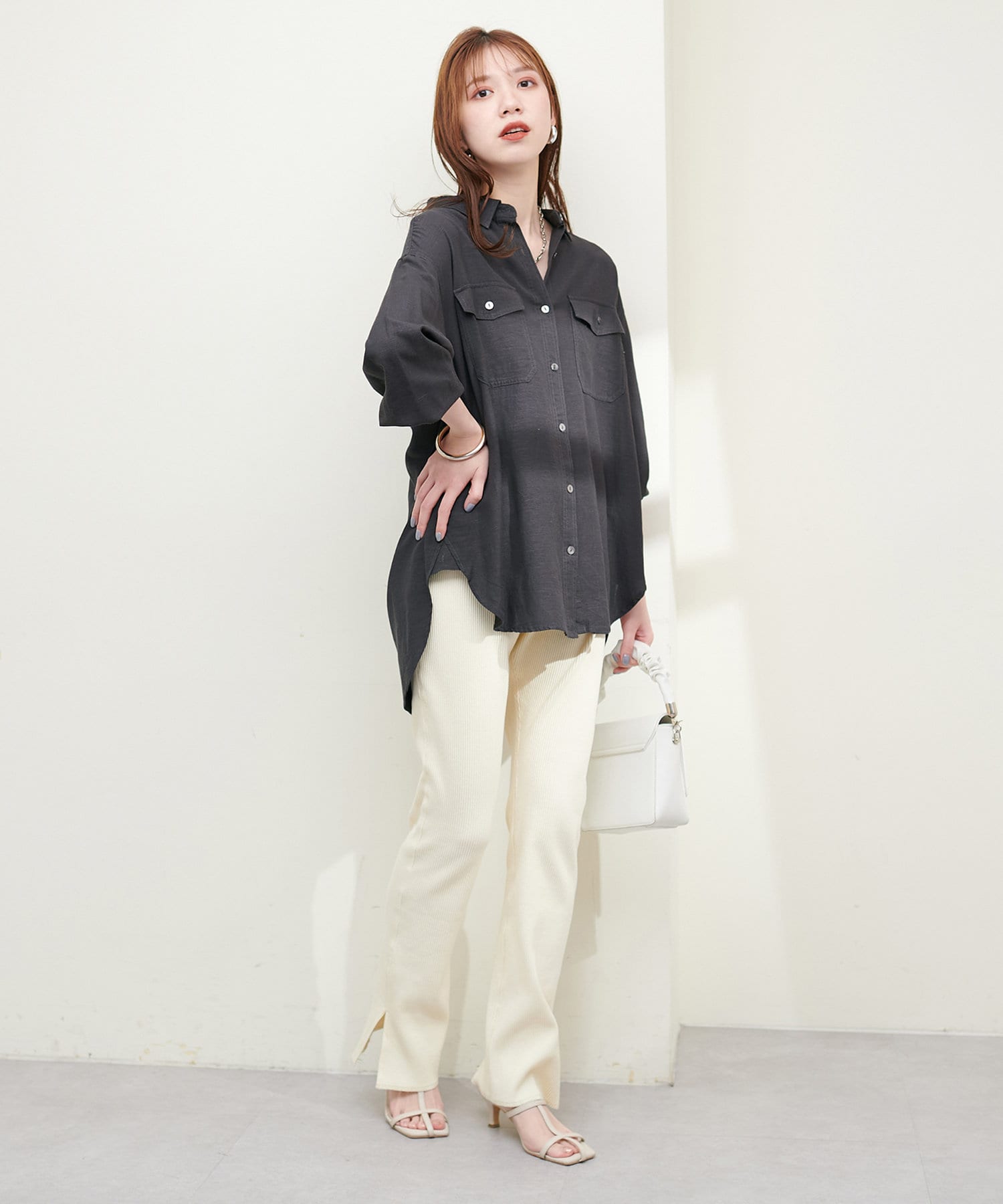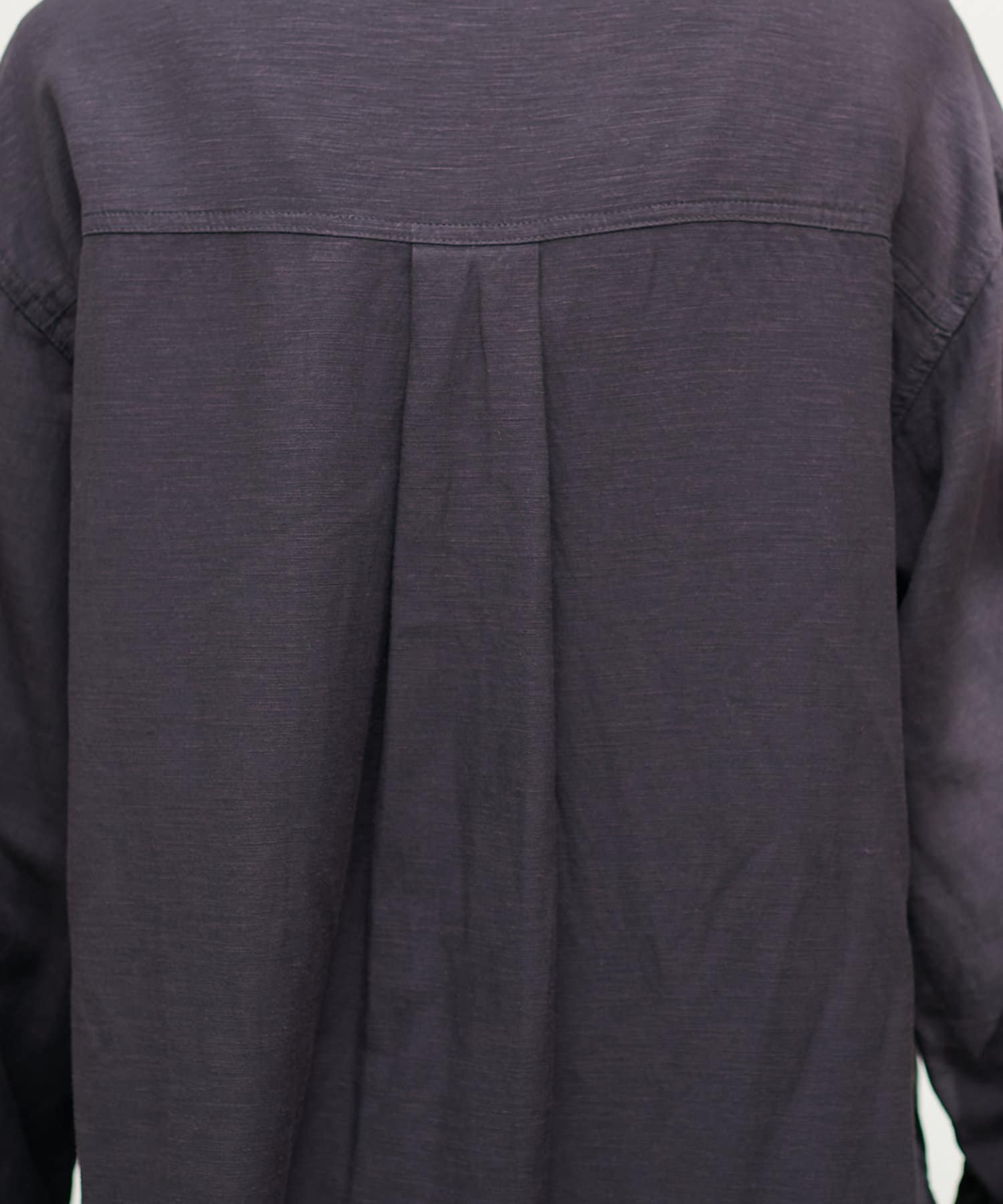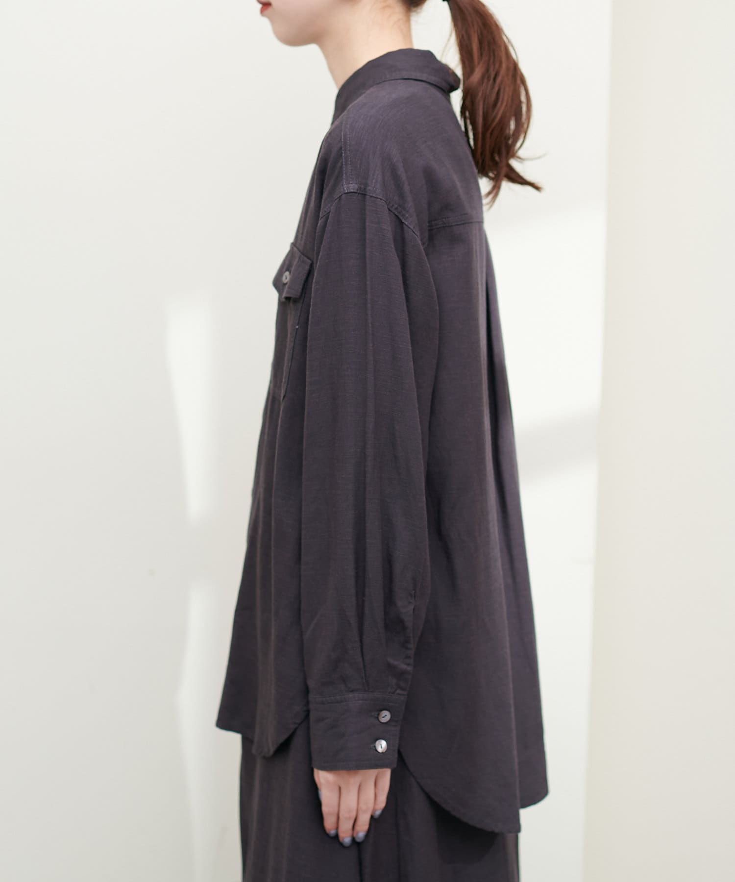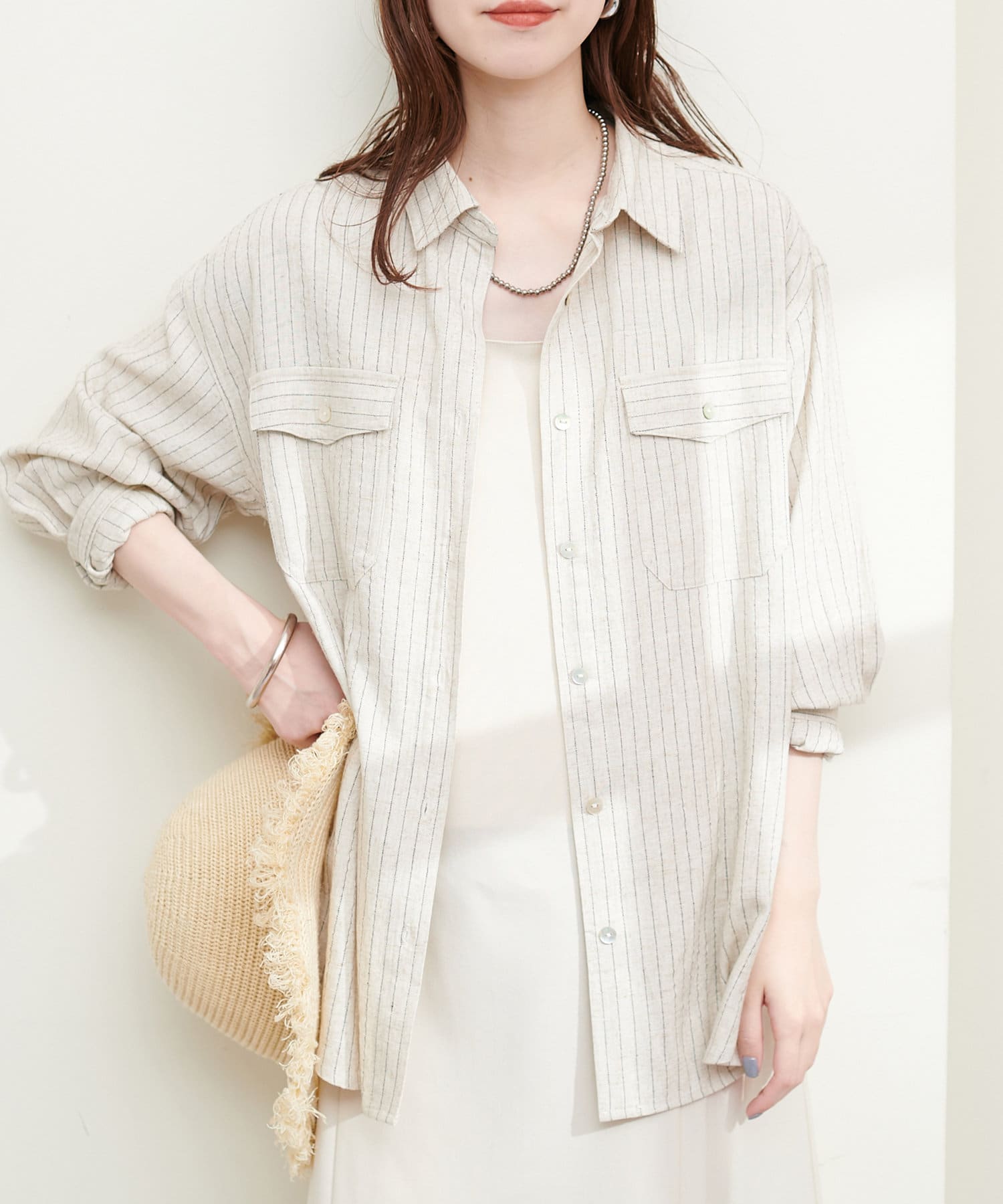 ハリ感のあるさらりとした麻調合繊のロングシャツ。