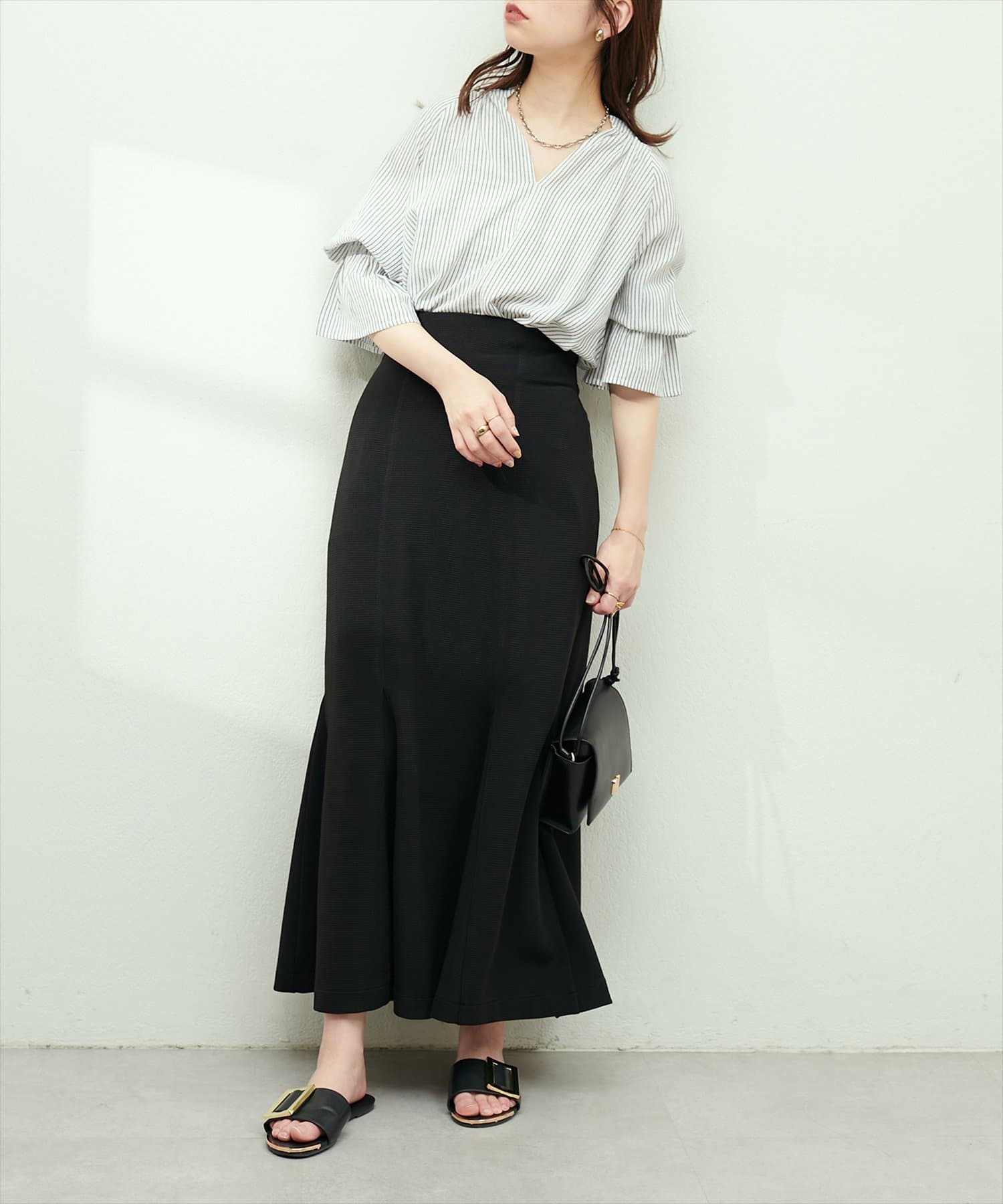 ふんわりとした長めのシルエットなので、スカートは広がり過ぎないシルエットを選ぶと旬な着こなしに仕上がります。