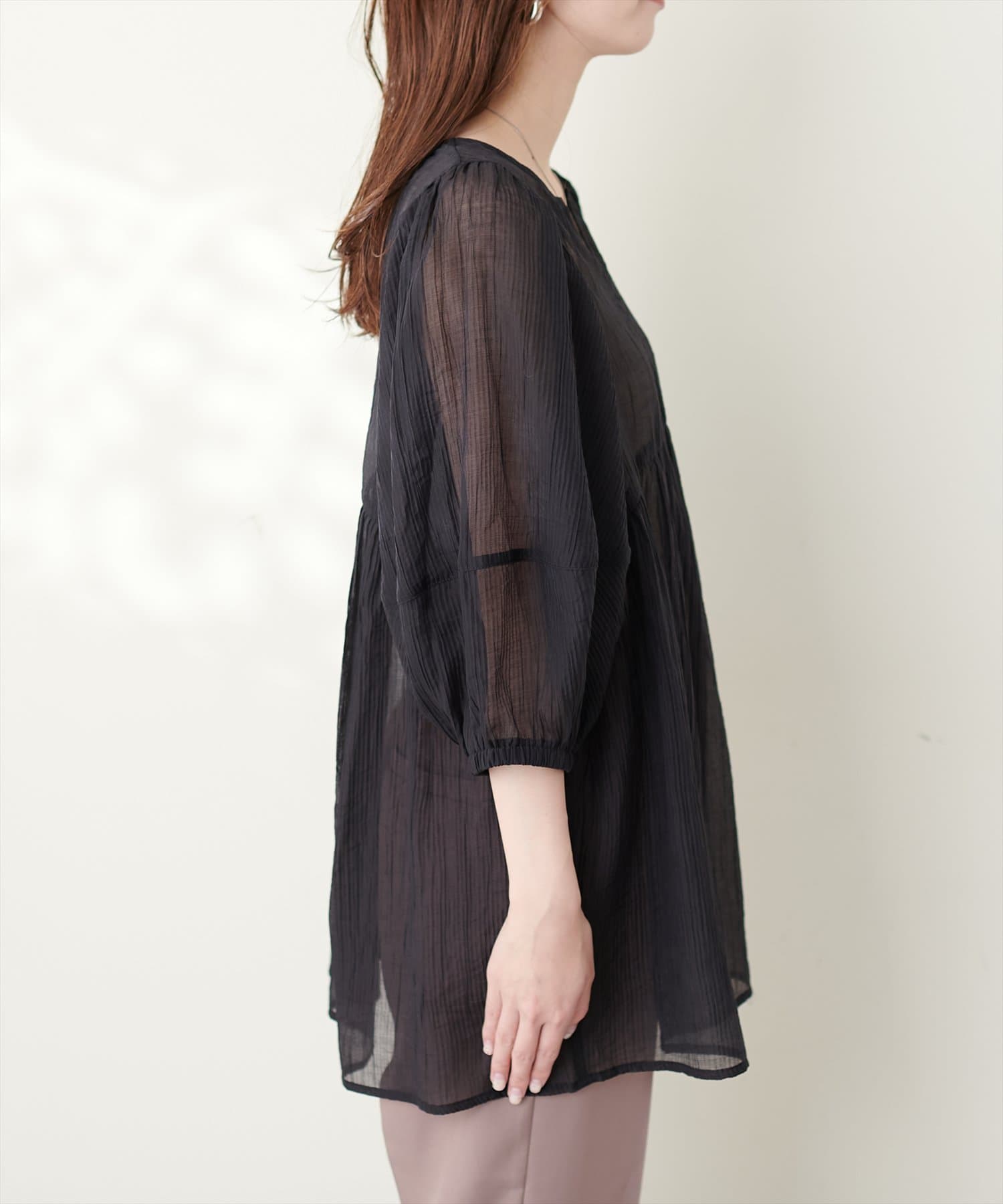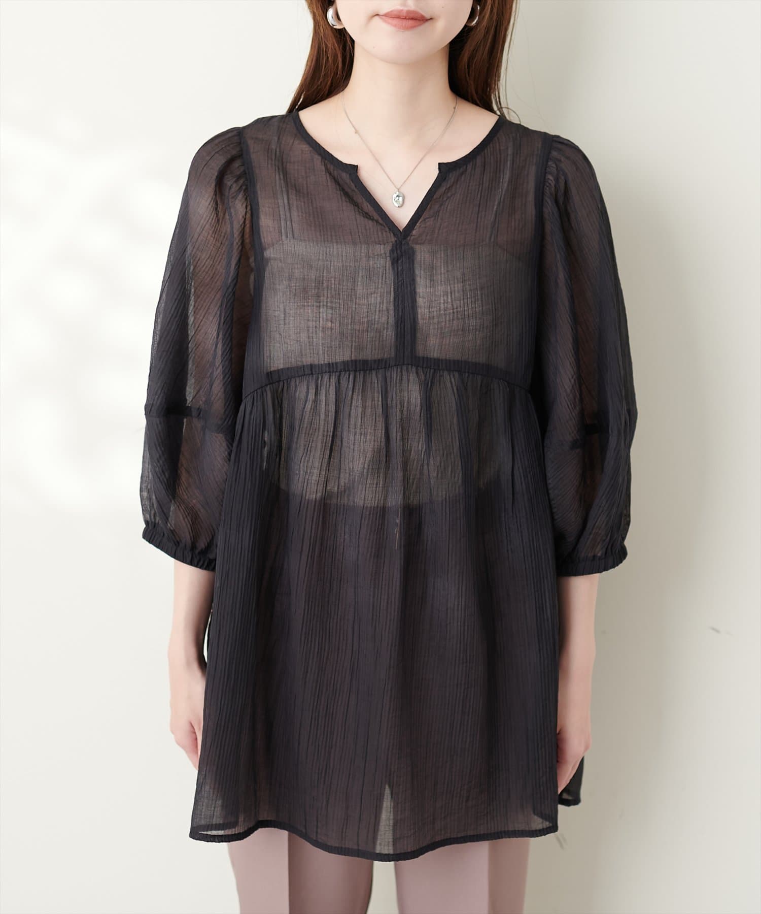 安心感のあるチュニック丈でヒップラインをさりげなくカバーし、高めの位置に切り替えしが入っており