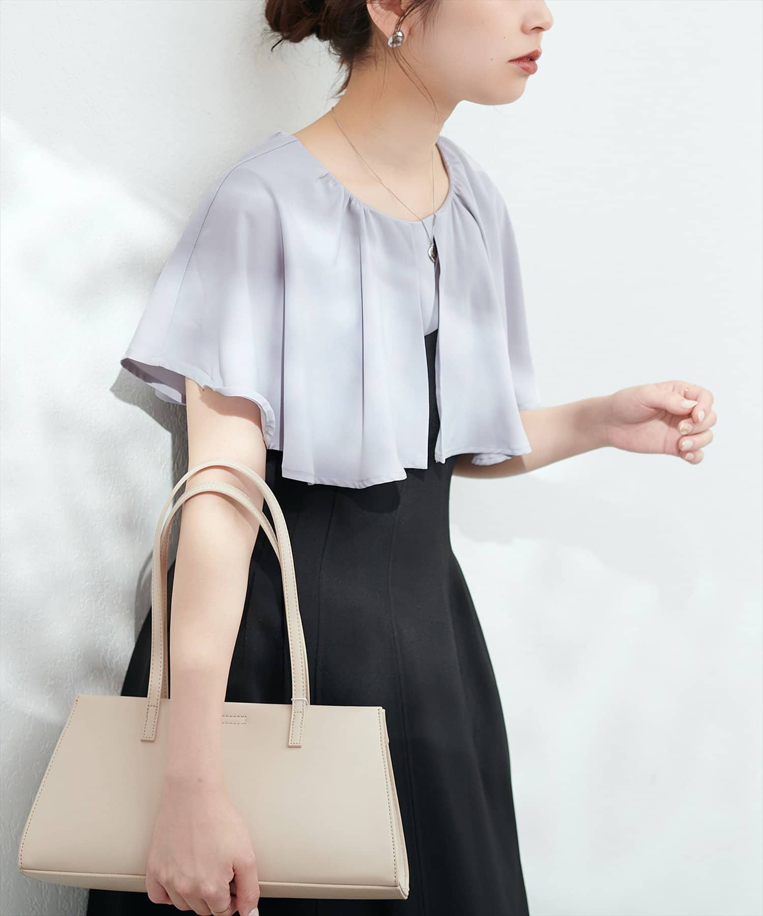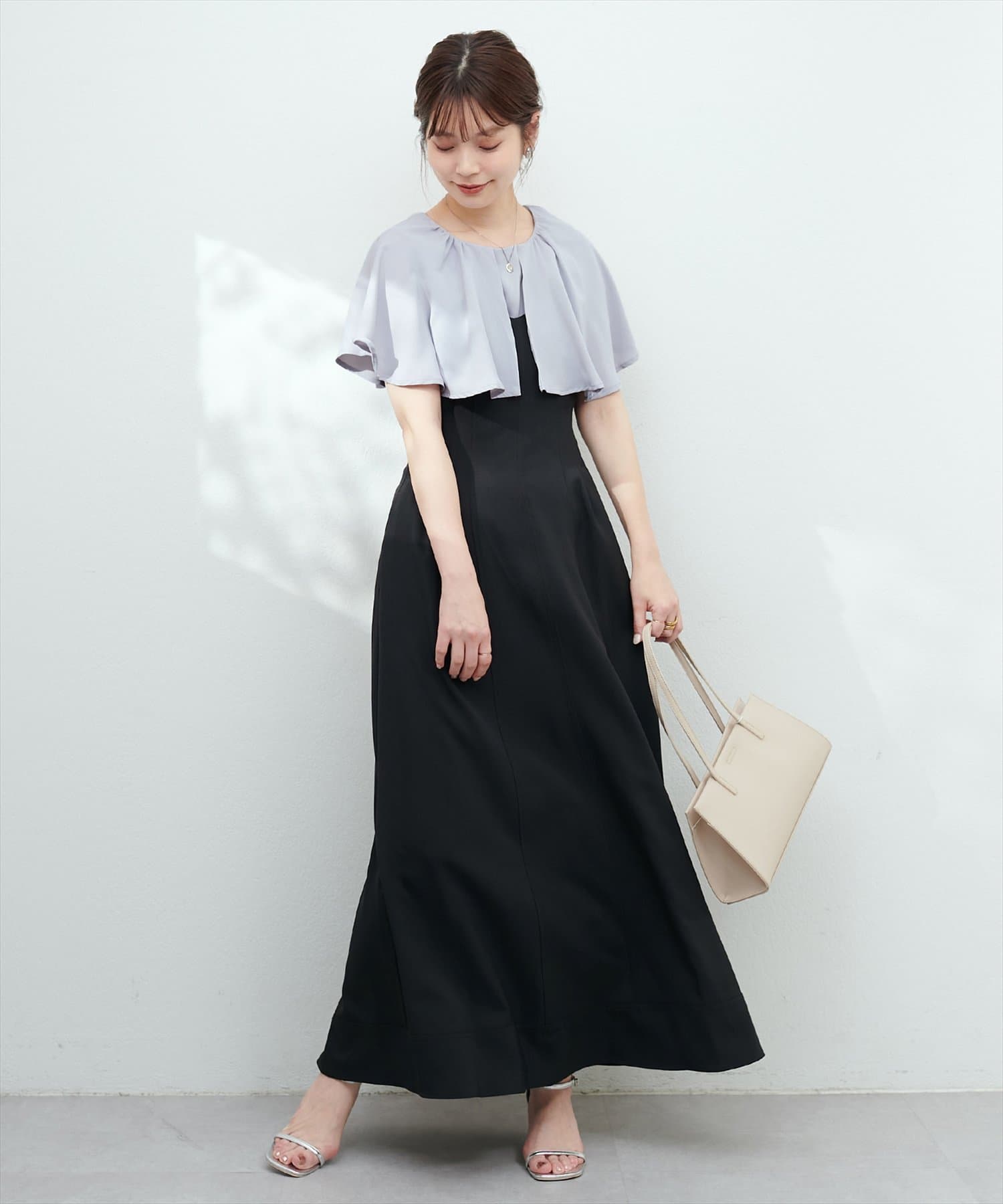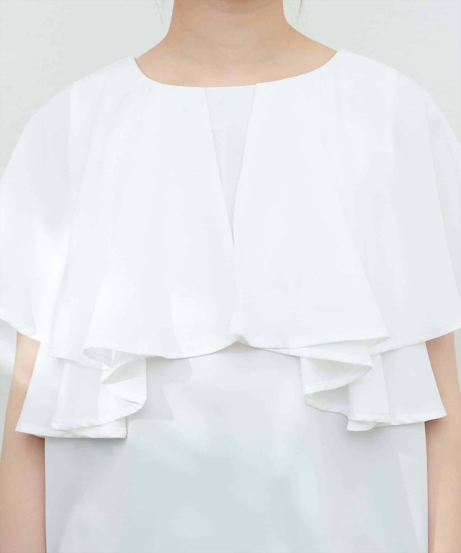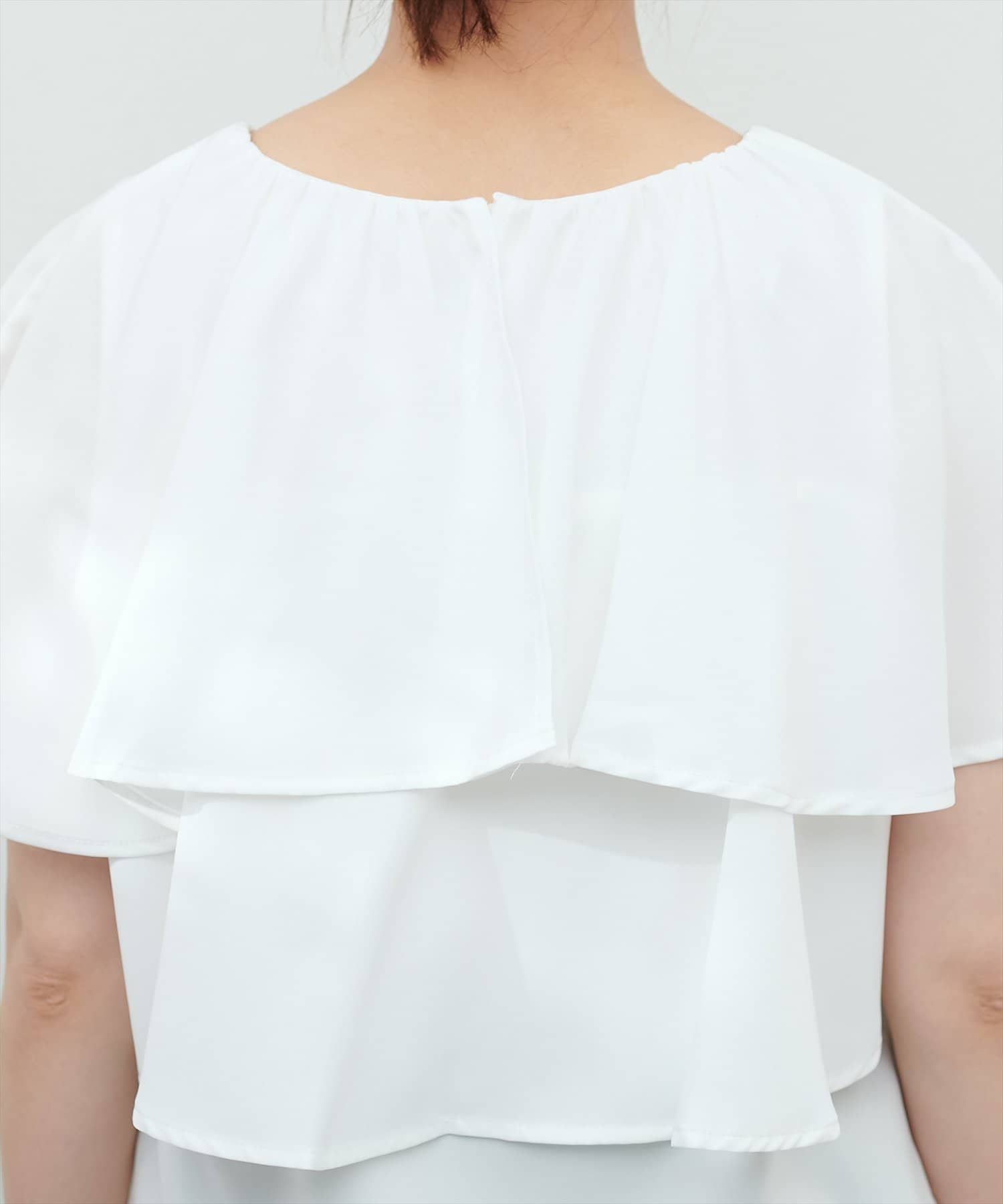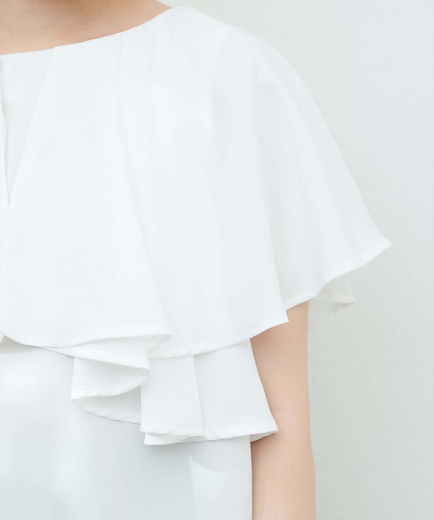 肩まわりを覆ったフリルは後ろまで配置され、ケープのようなデザインで二の腕をカバーしてくれるので、華奢見せ効果も期待できます。