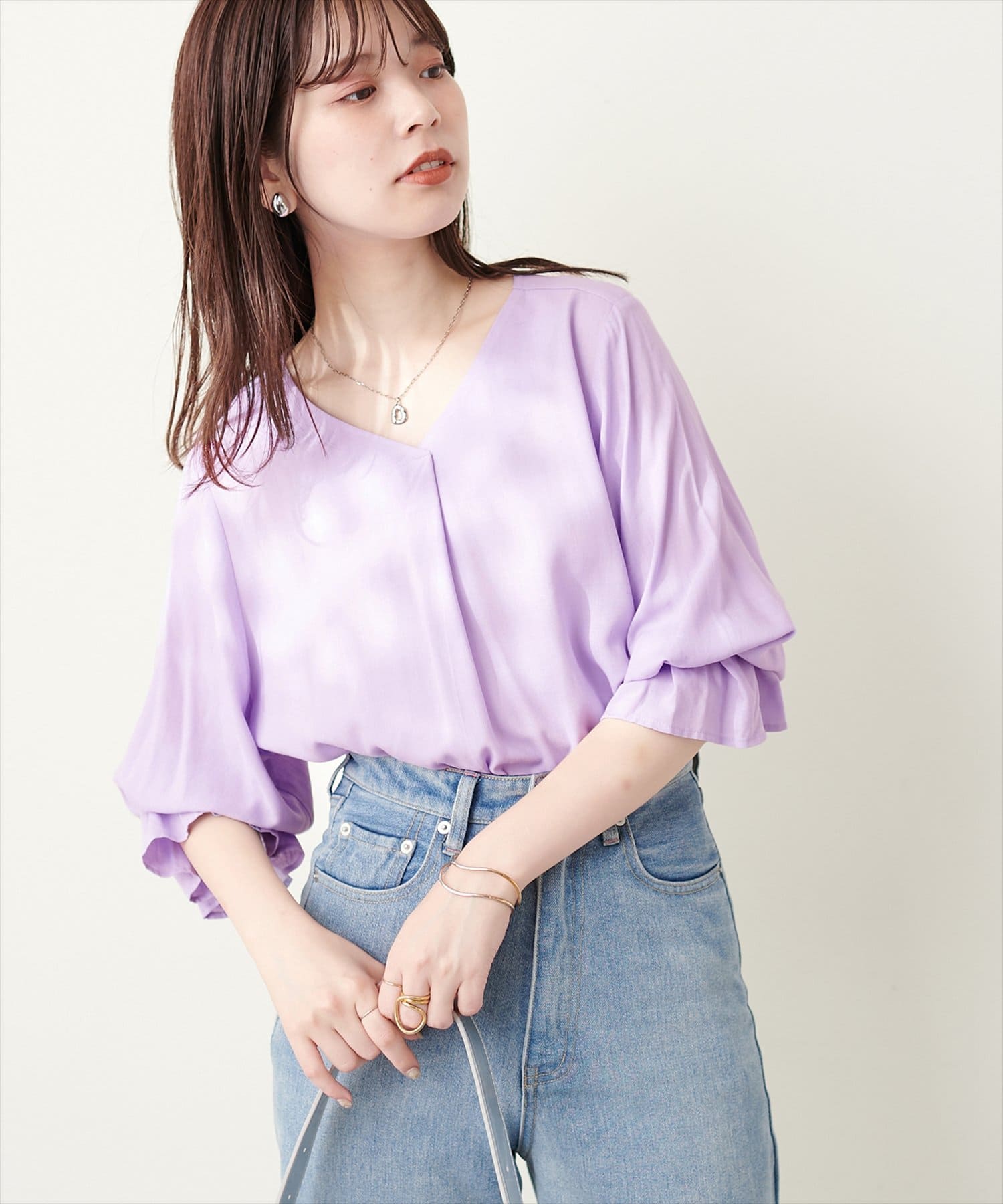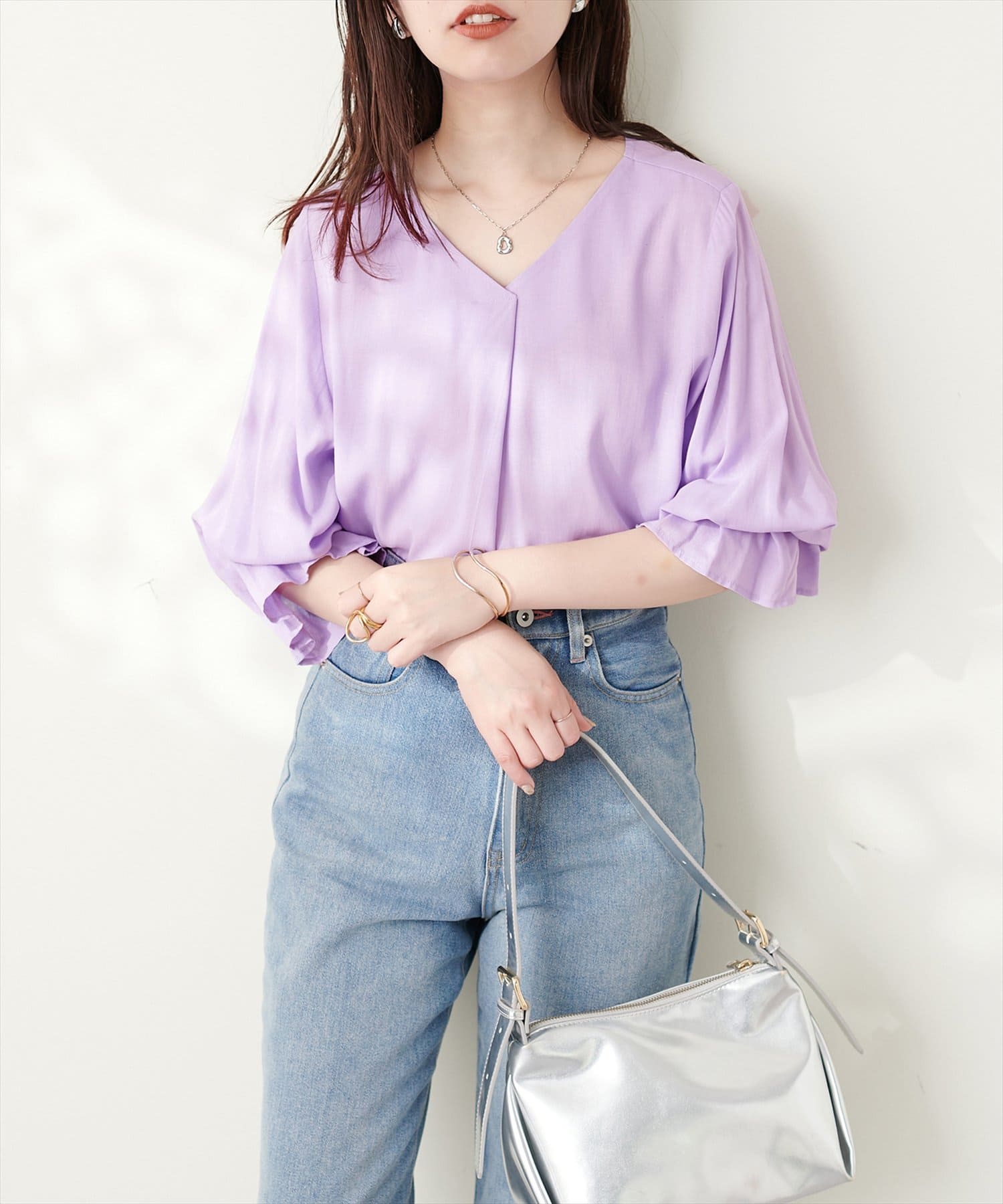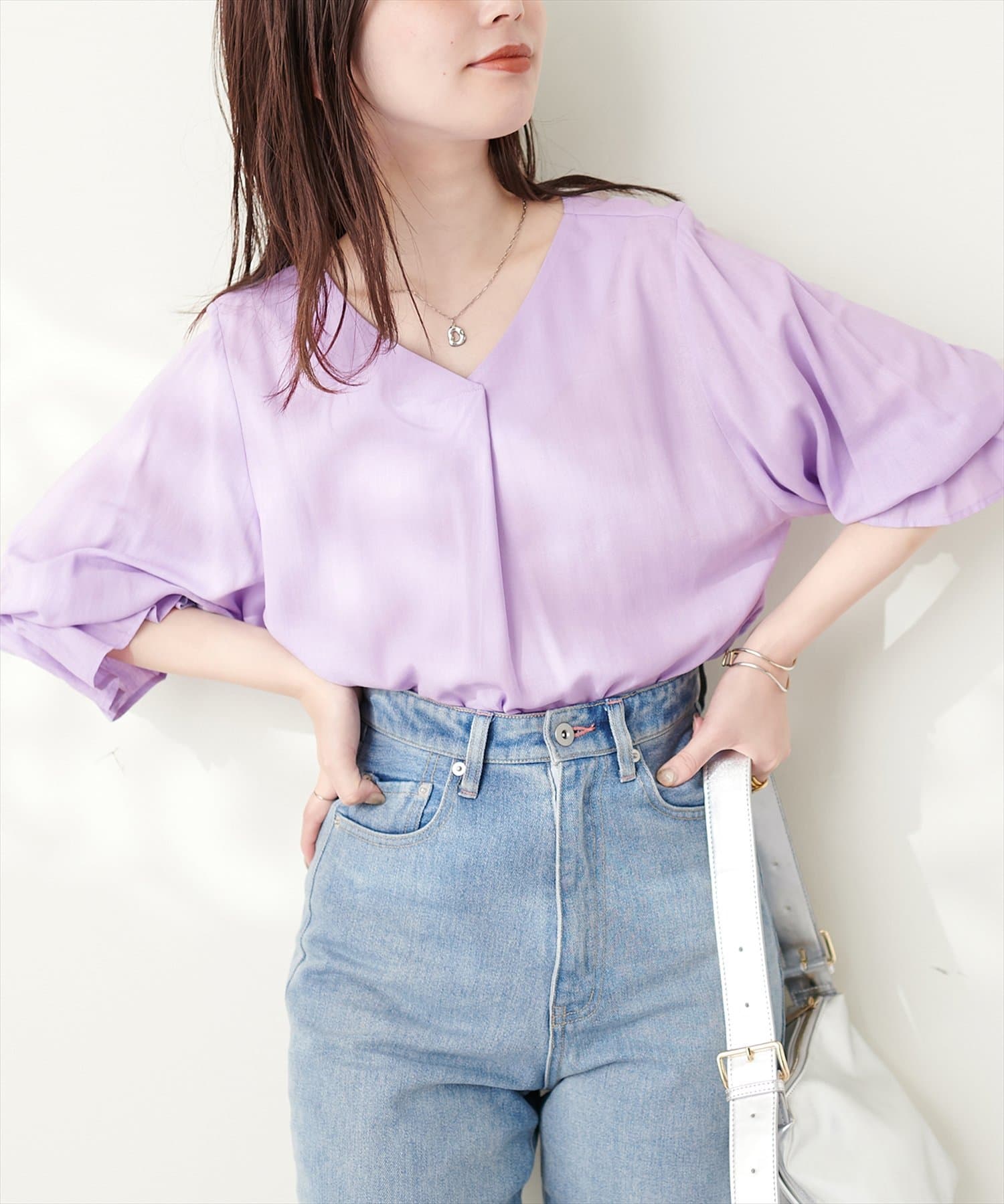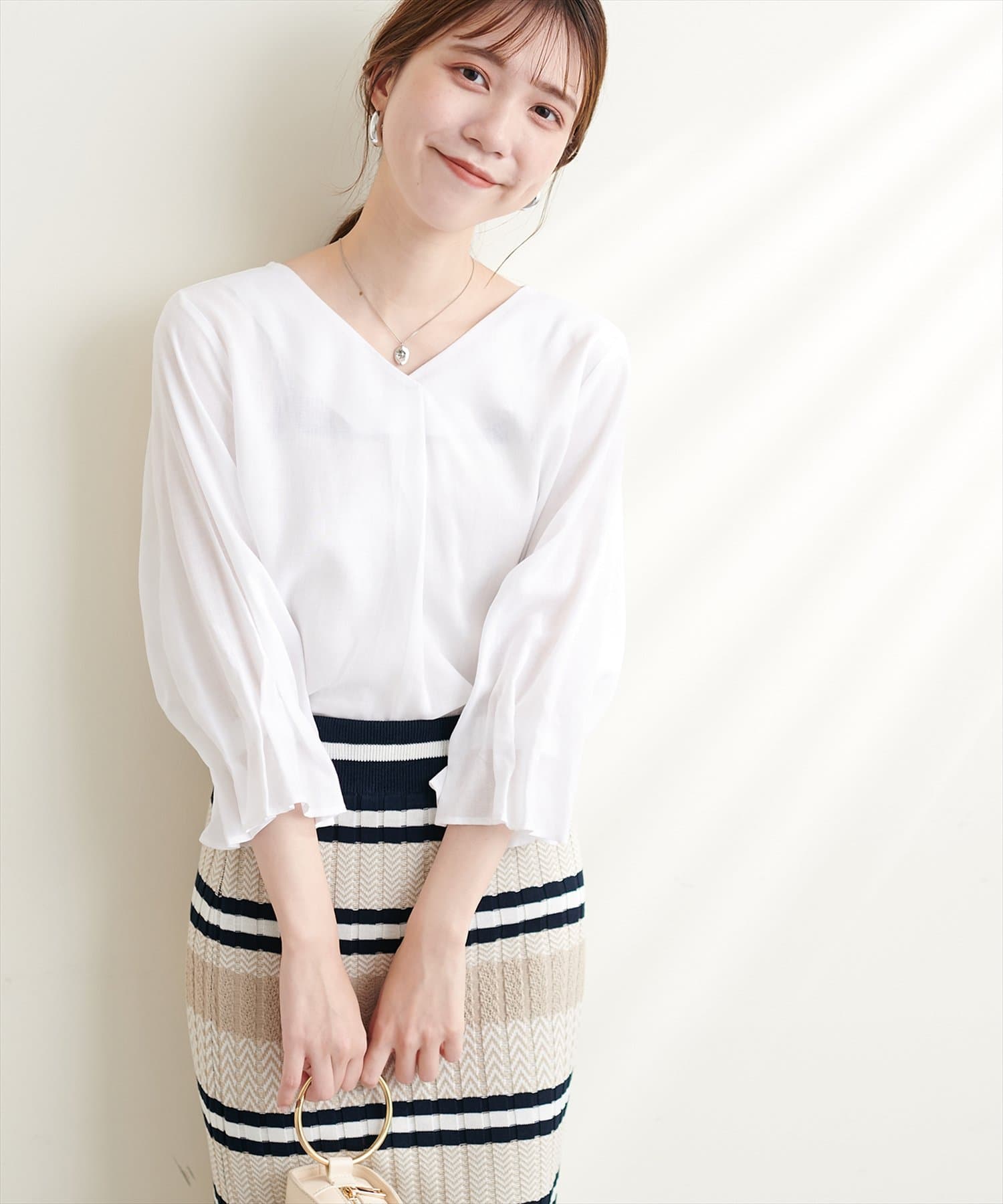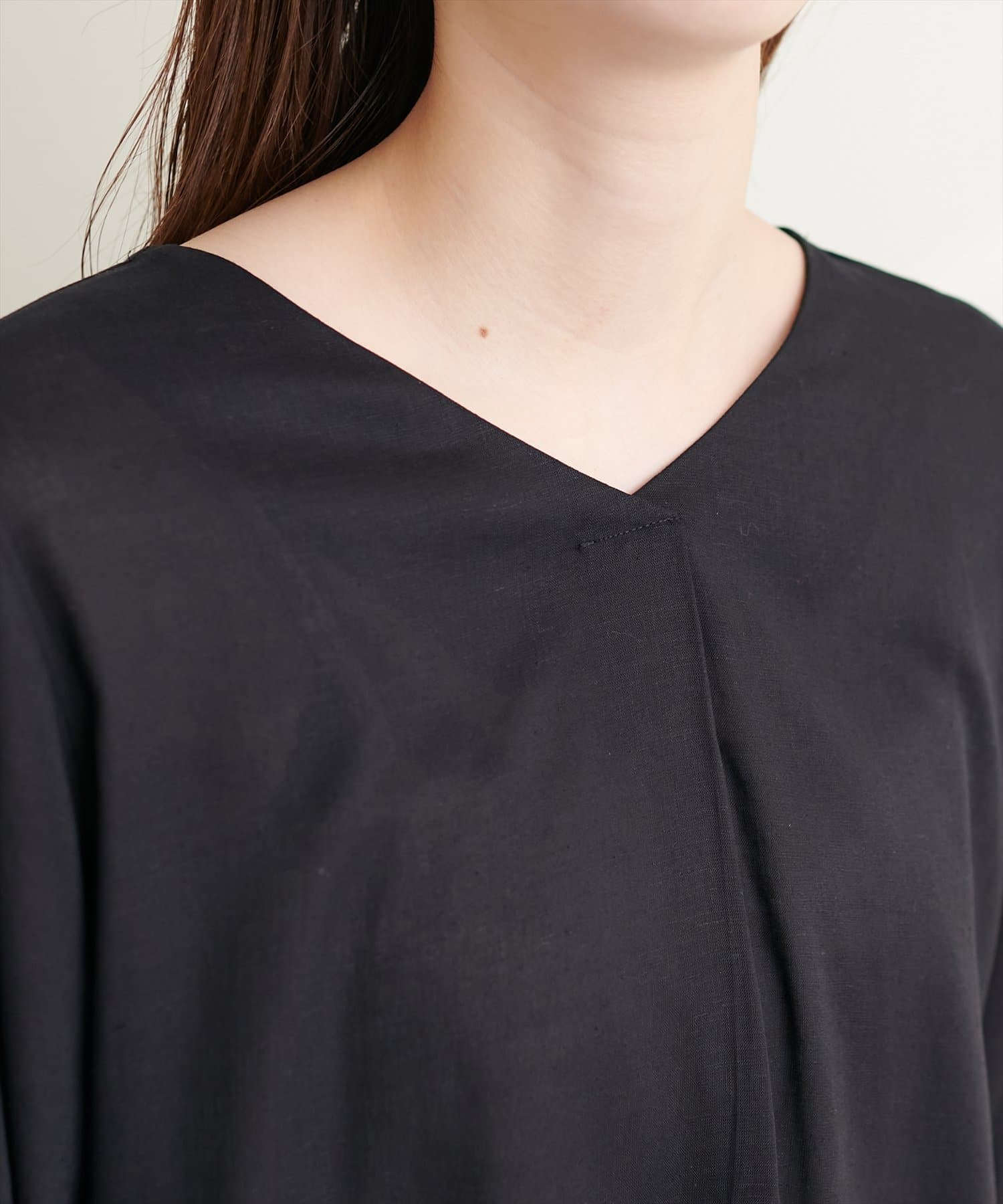 緩やかなVネックがデコルテラインをきれいに見せ、お顔周りをすっきりとした印象に。