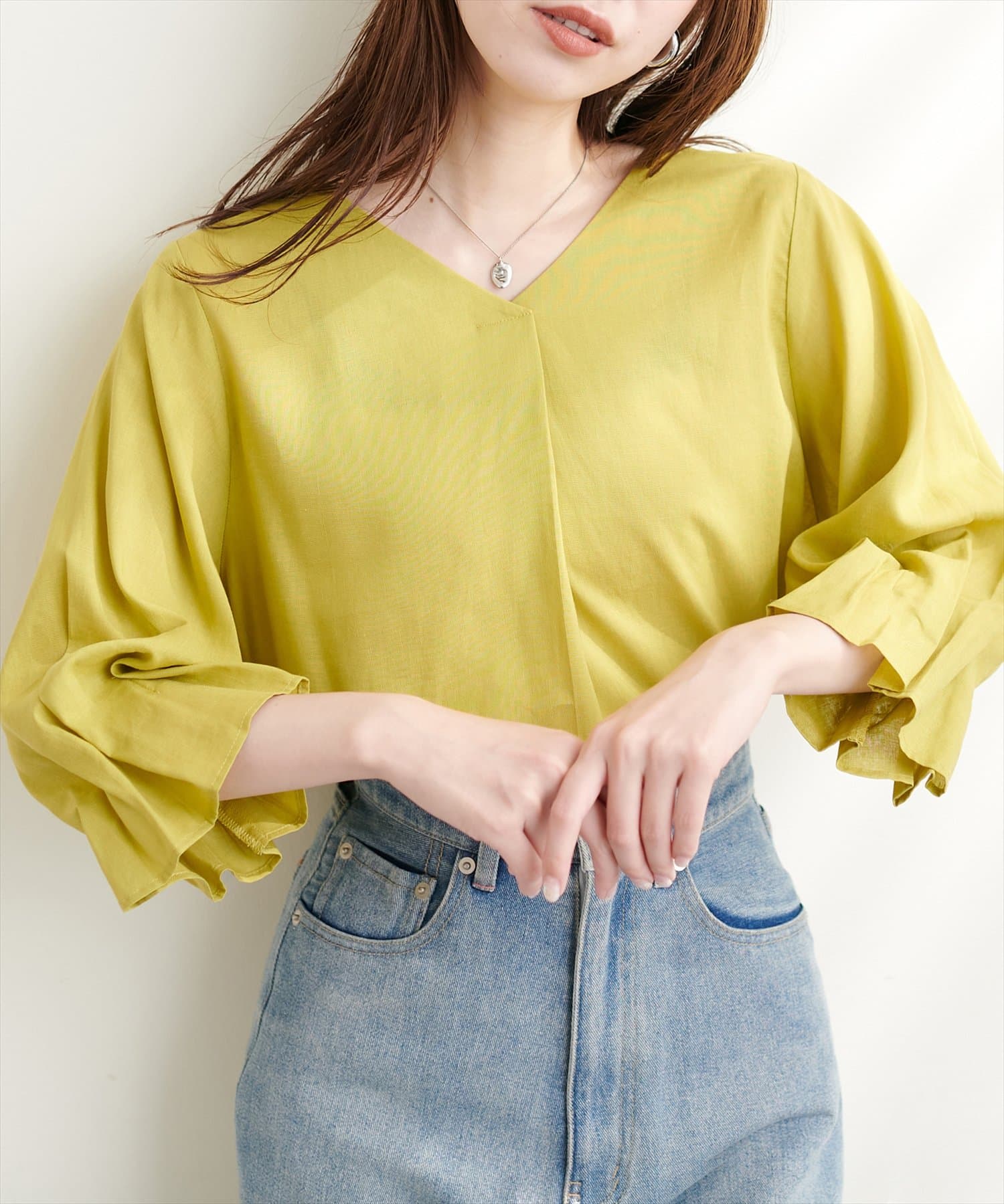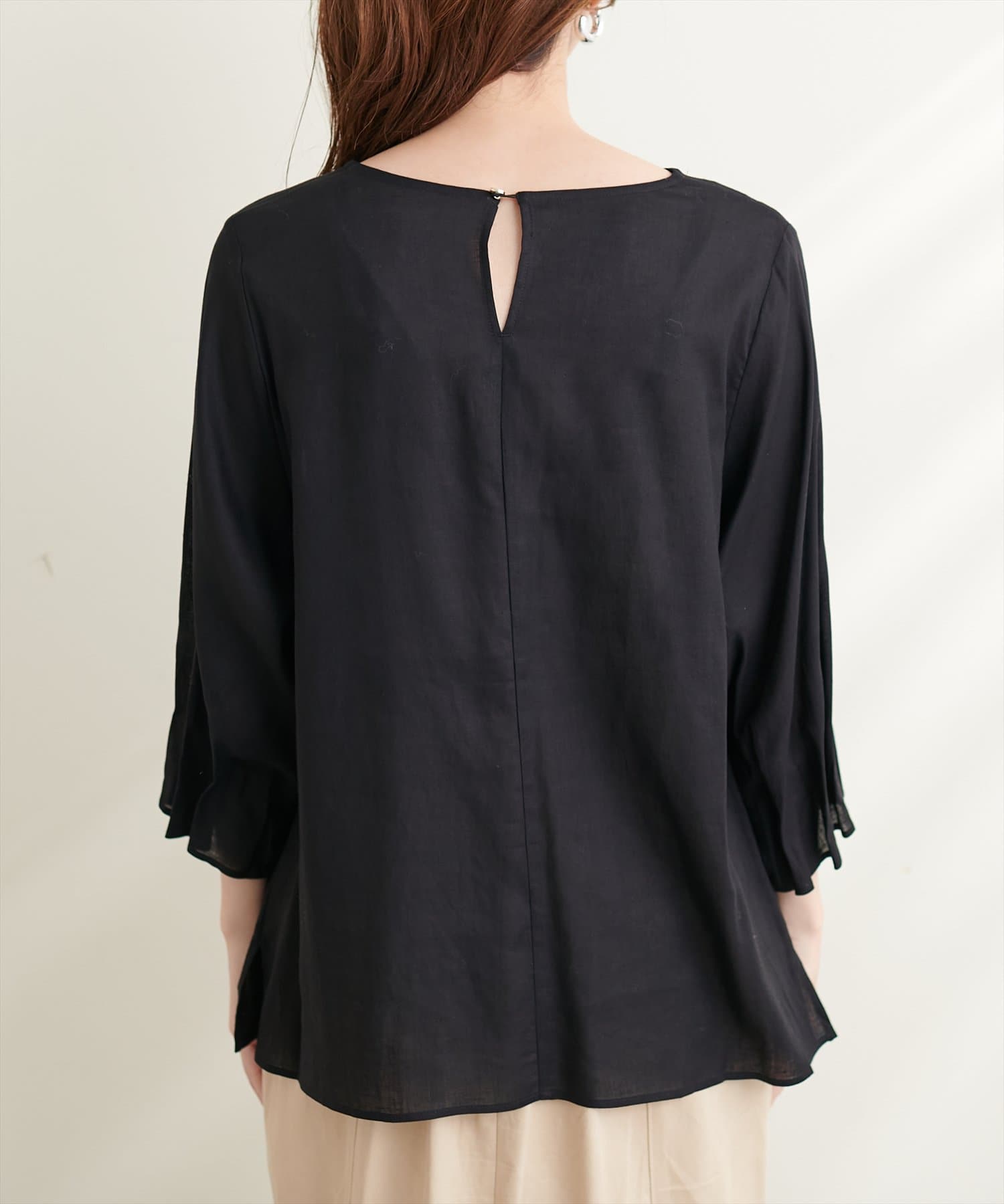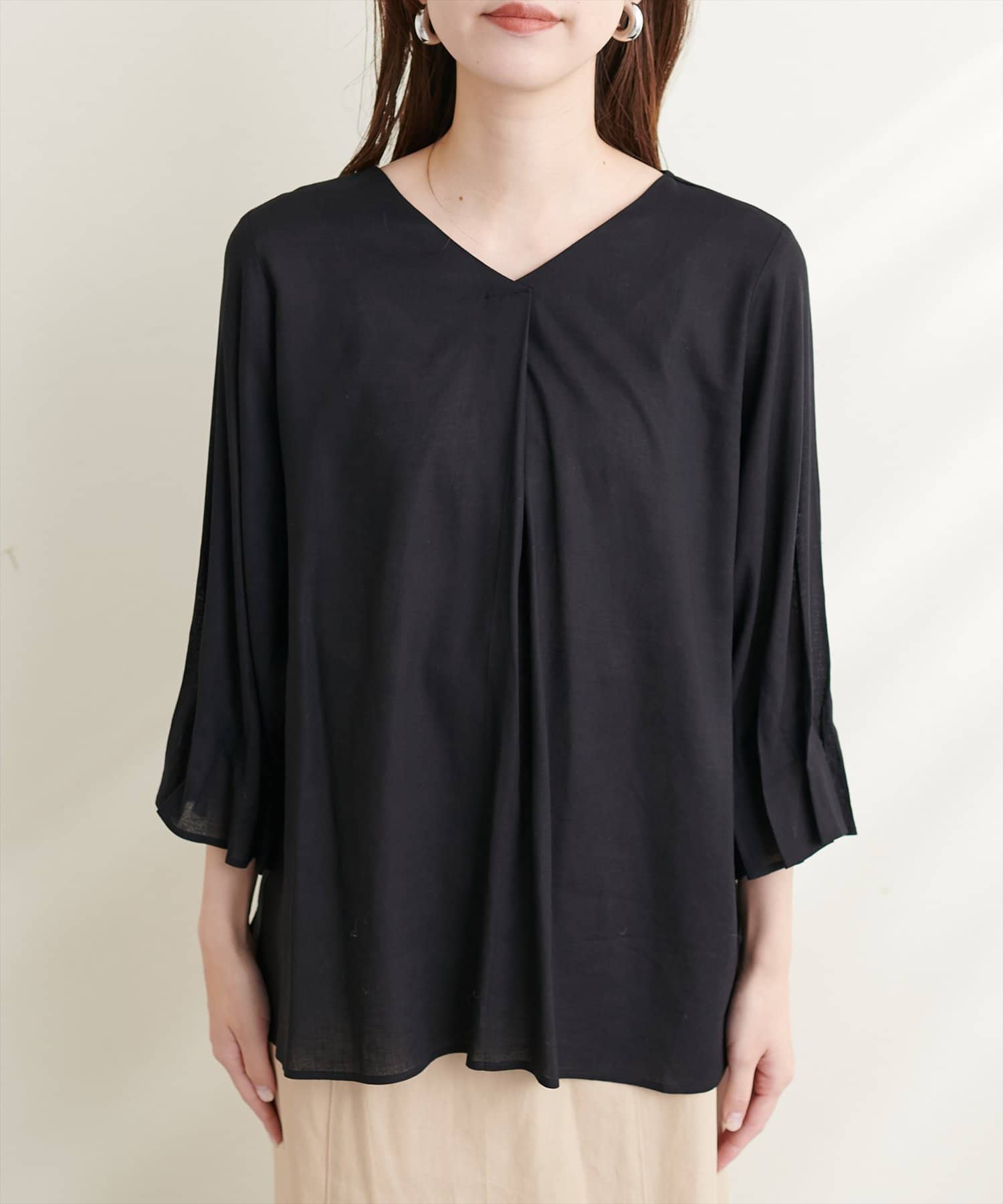 吸水性や速乾性に優れた夏にぴったりの麻素材に、レーヨンをブレンドすることでとろみと落ち感が生まれ、上品な印象にきまるブラウス。