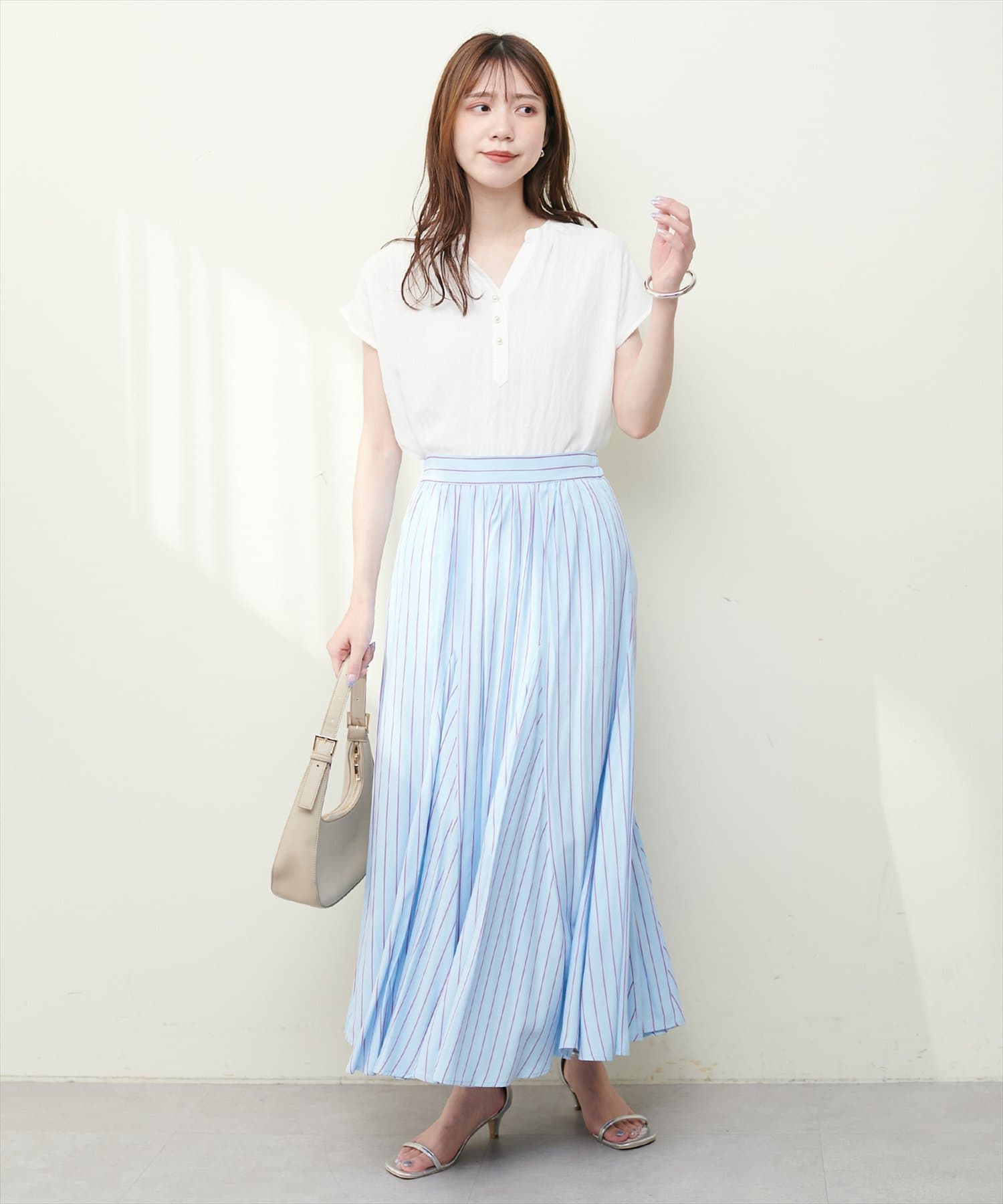 フレアラインなナローシルエットのスカートにウエストインですっきり合わせて頂くだけで、女性らしい上品なスタイリングに仕上がります。