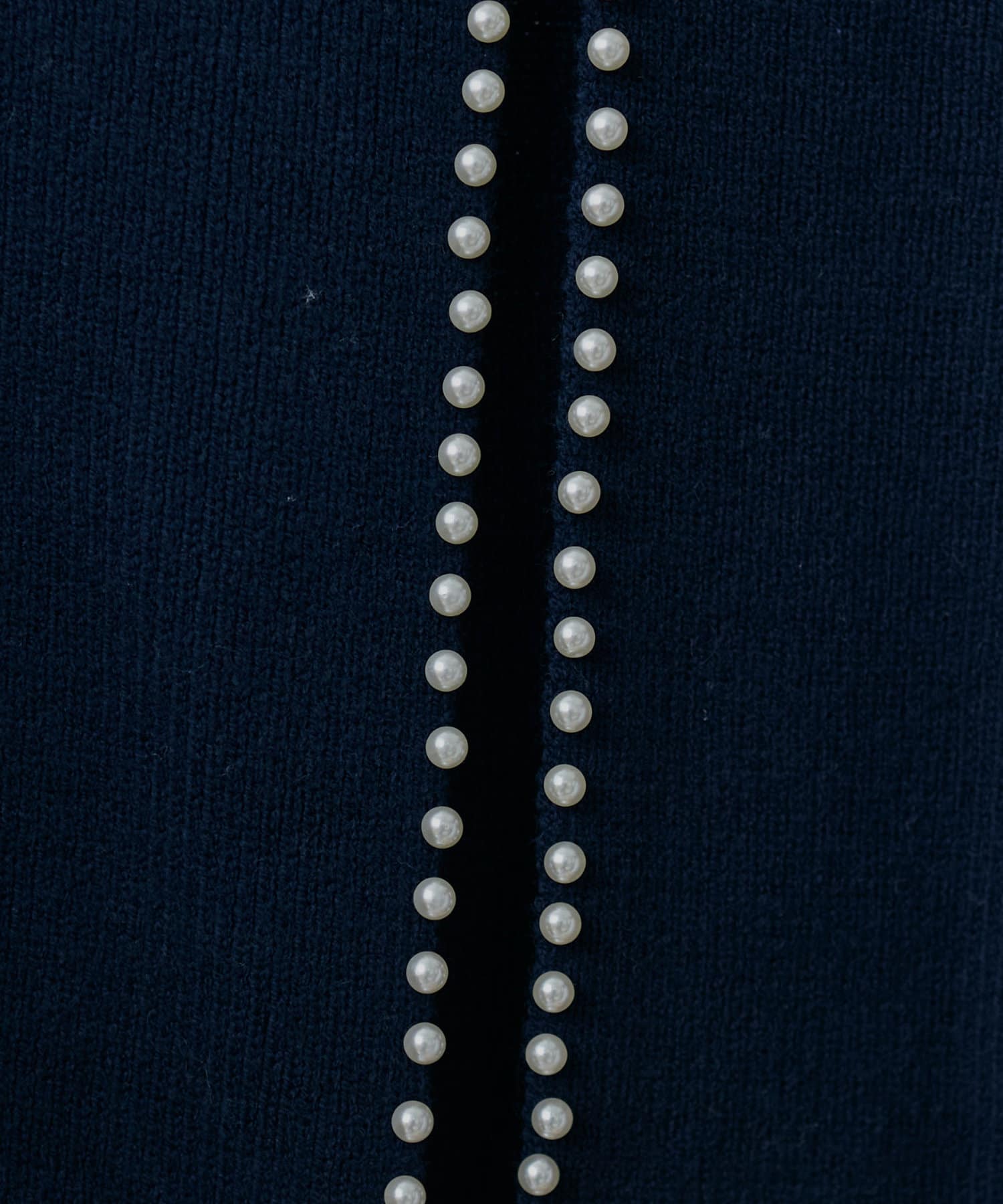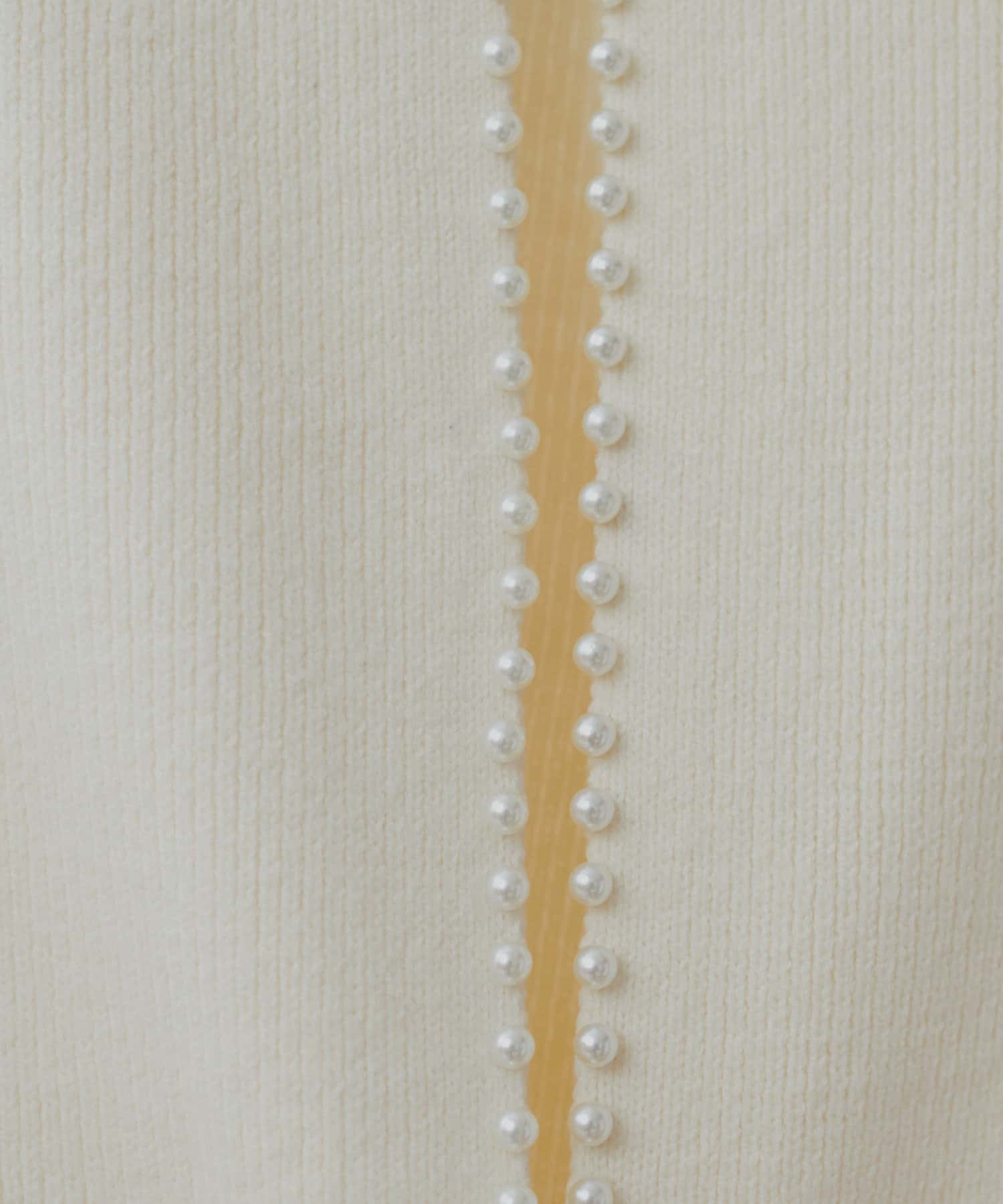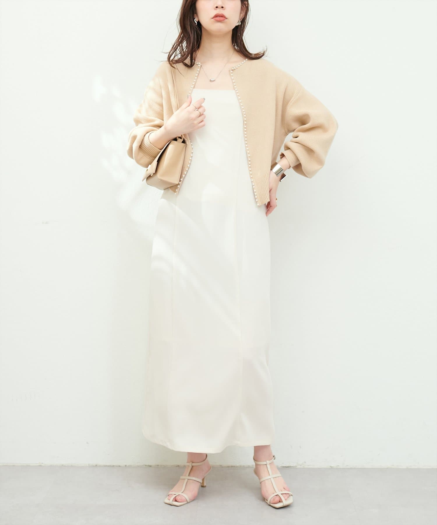 ネックラインからフロントにかけて、贅沢に施したパールが大人上品な印象を与えてくれる1着。