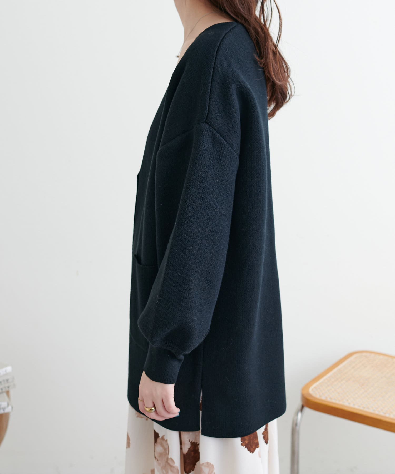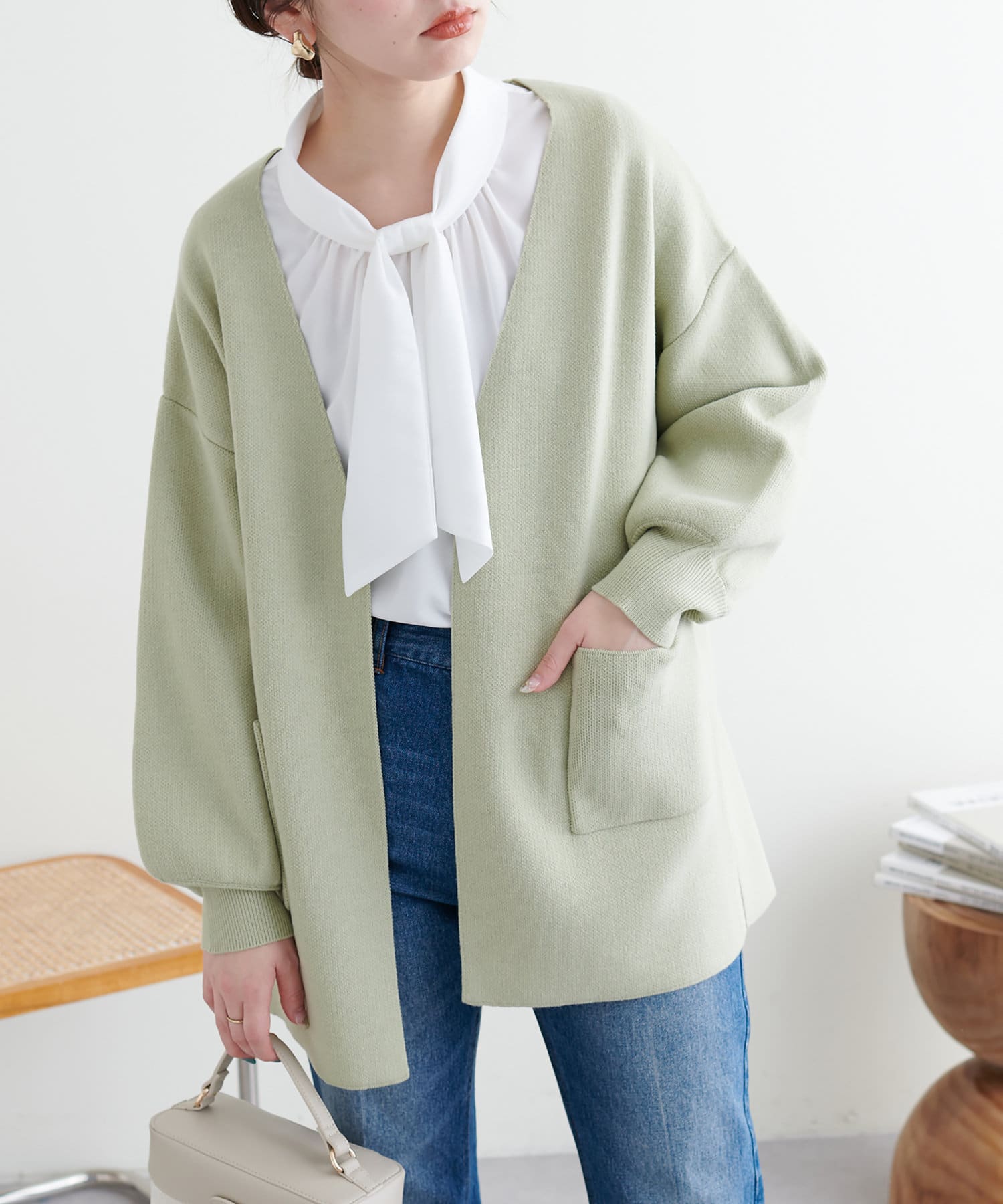 釦なしのすっきりとしたデザインでさっと羽織れるカーディガン。