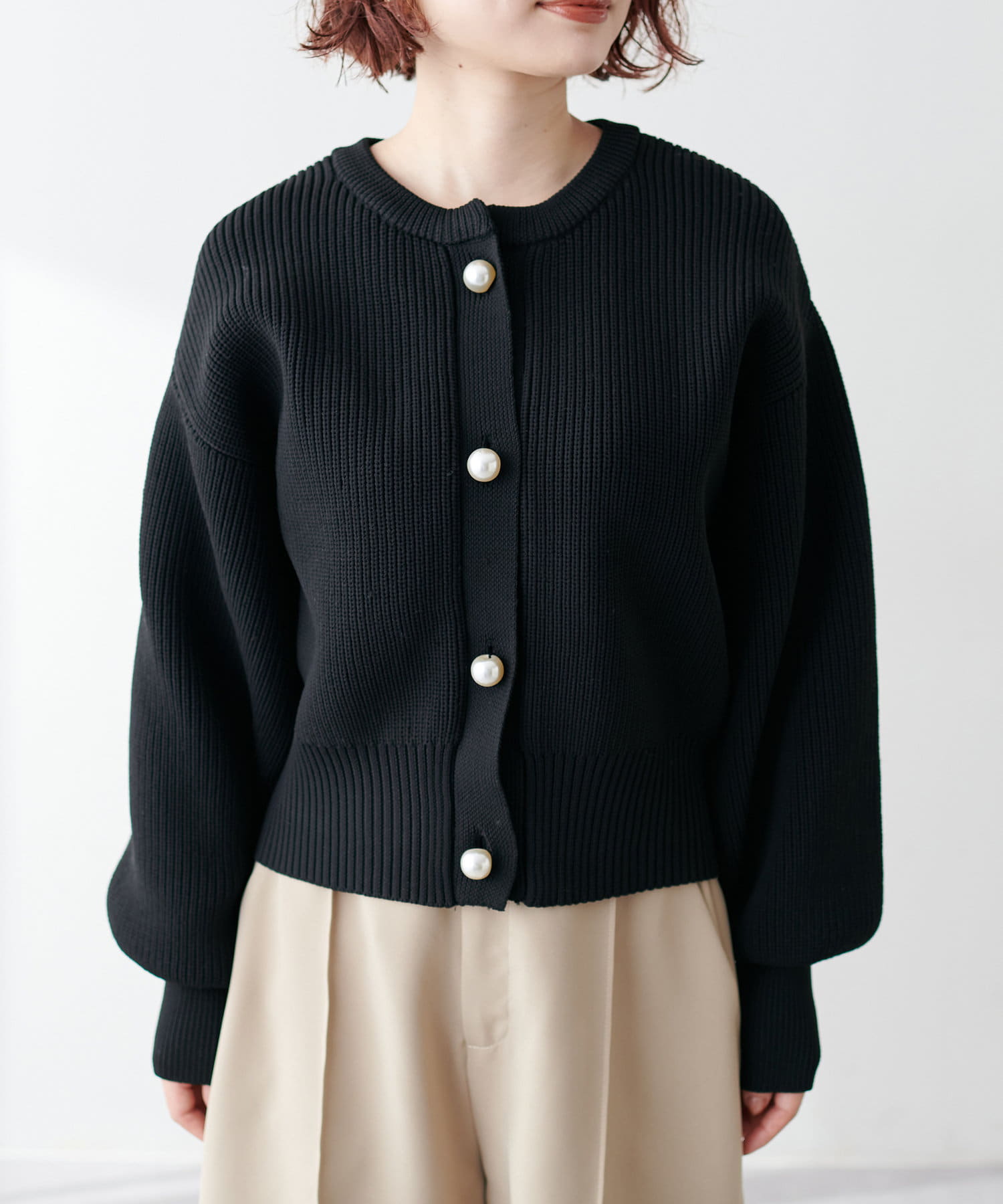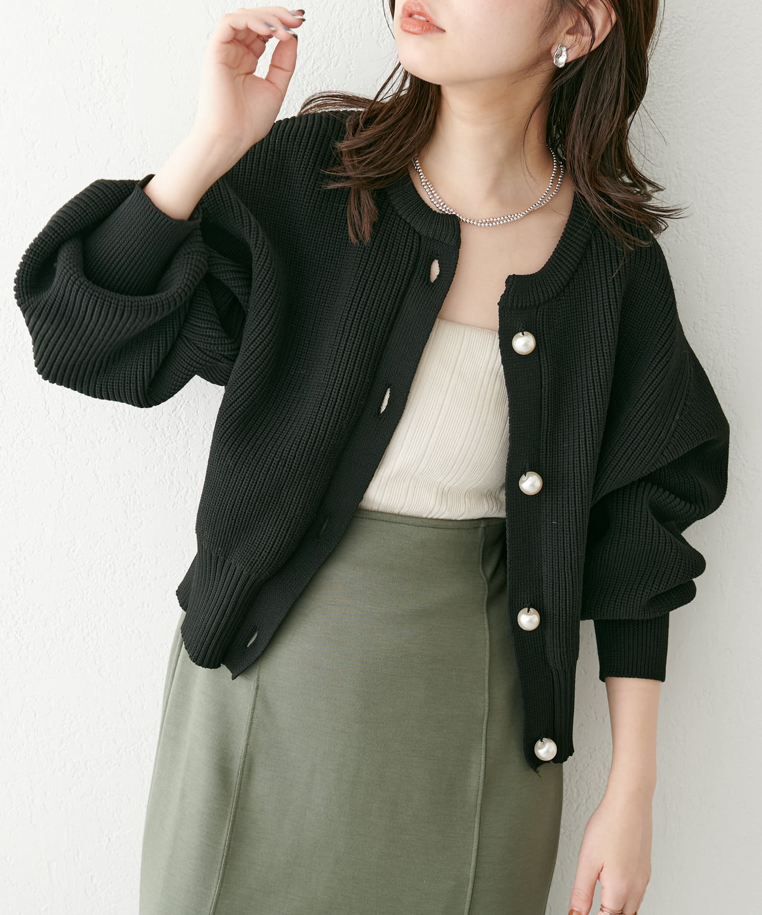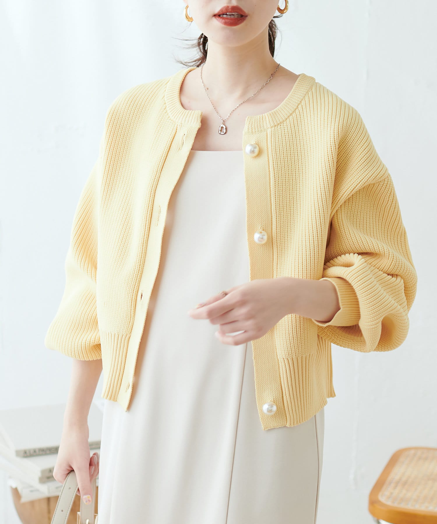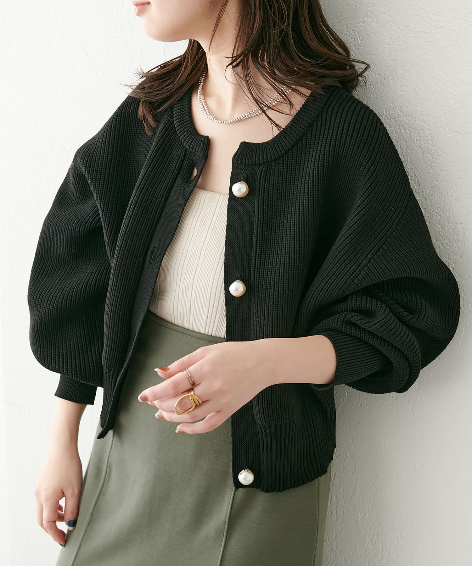 大きなパール釦がレトロな雰囲気を醸し出すニットカーディガン。