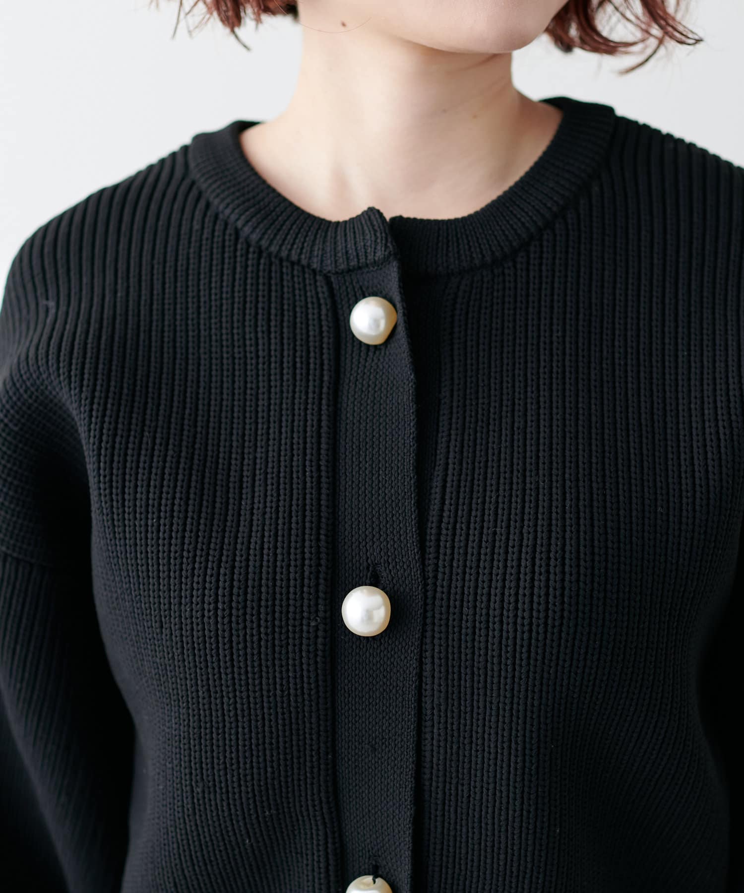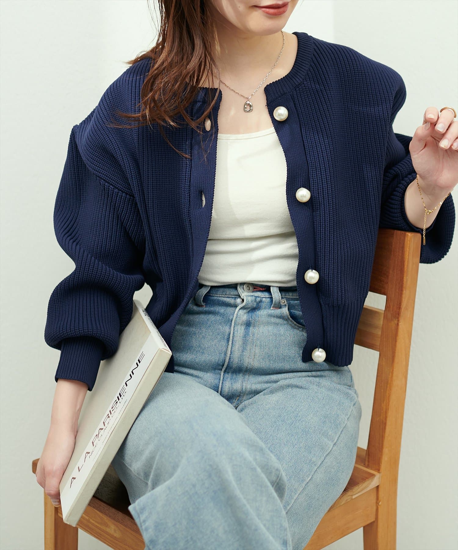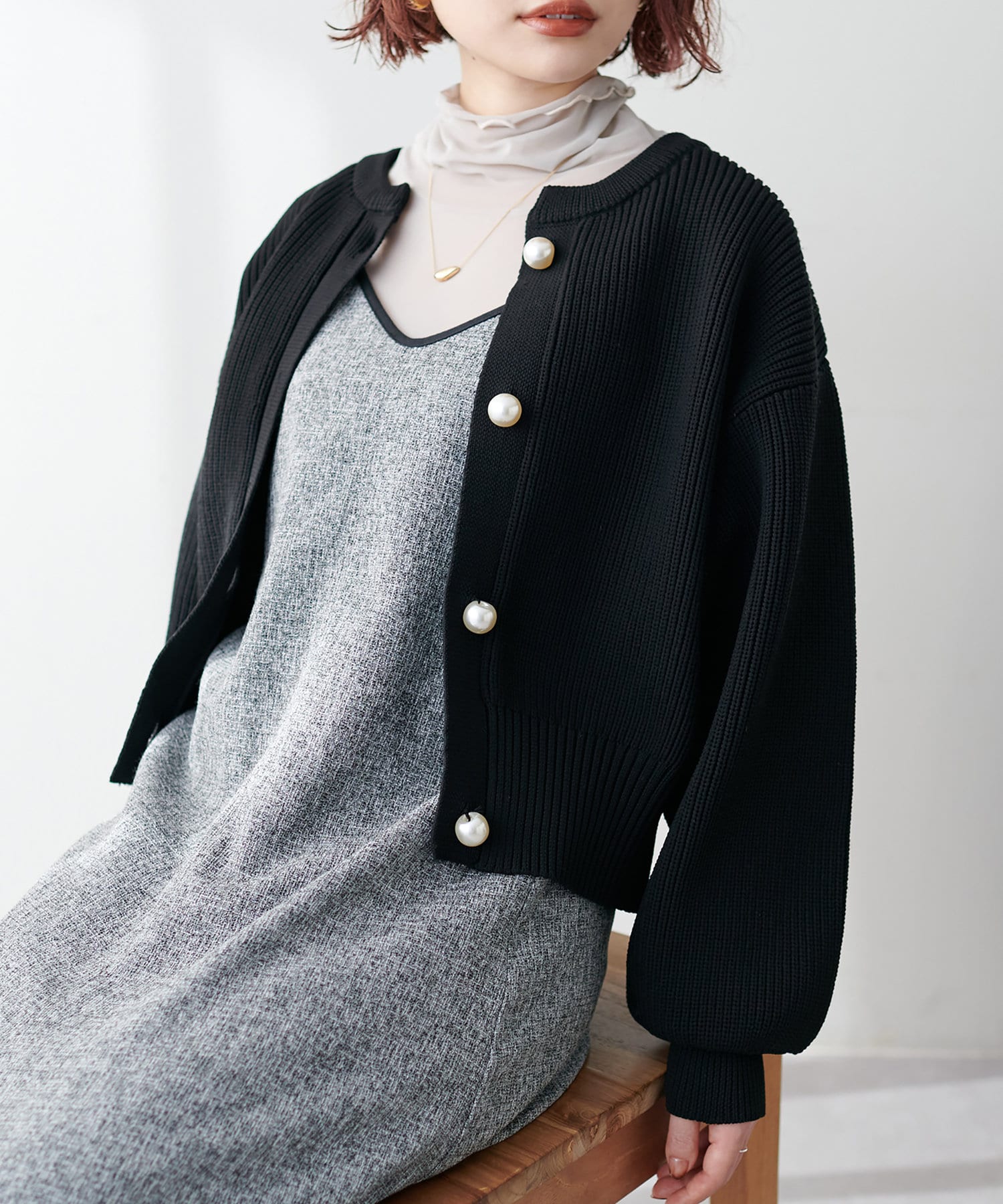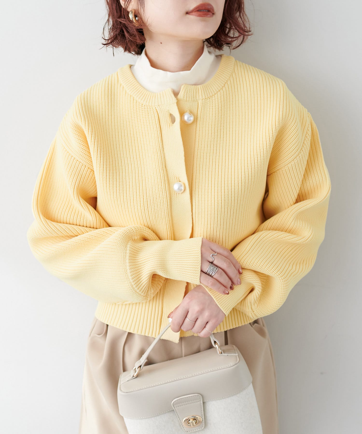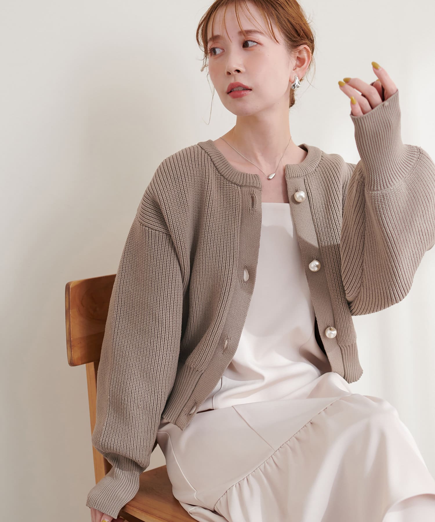 大きなパール釦がレトロな雰囲気を醸し出すニットカーディガン。
