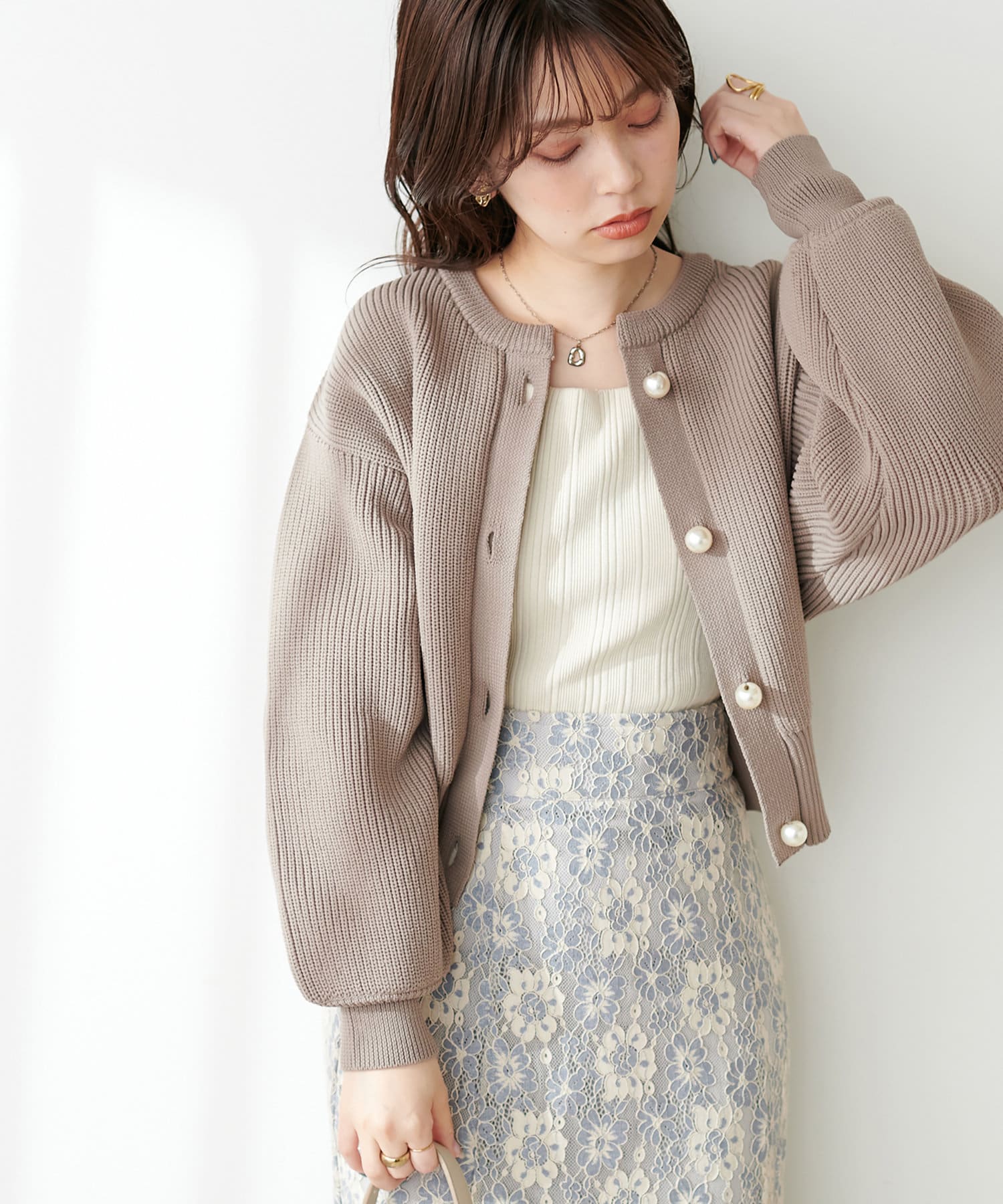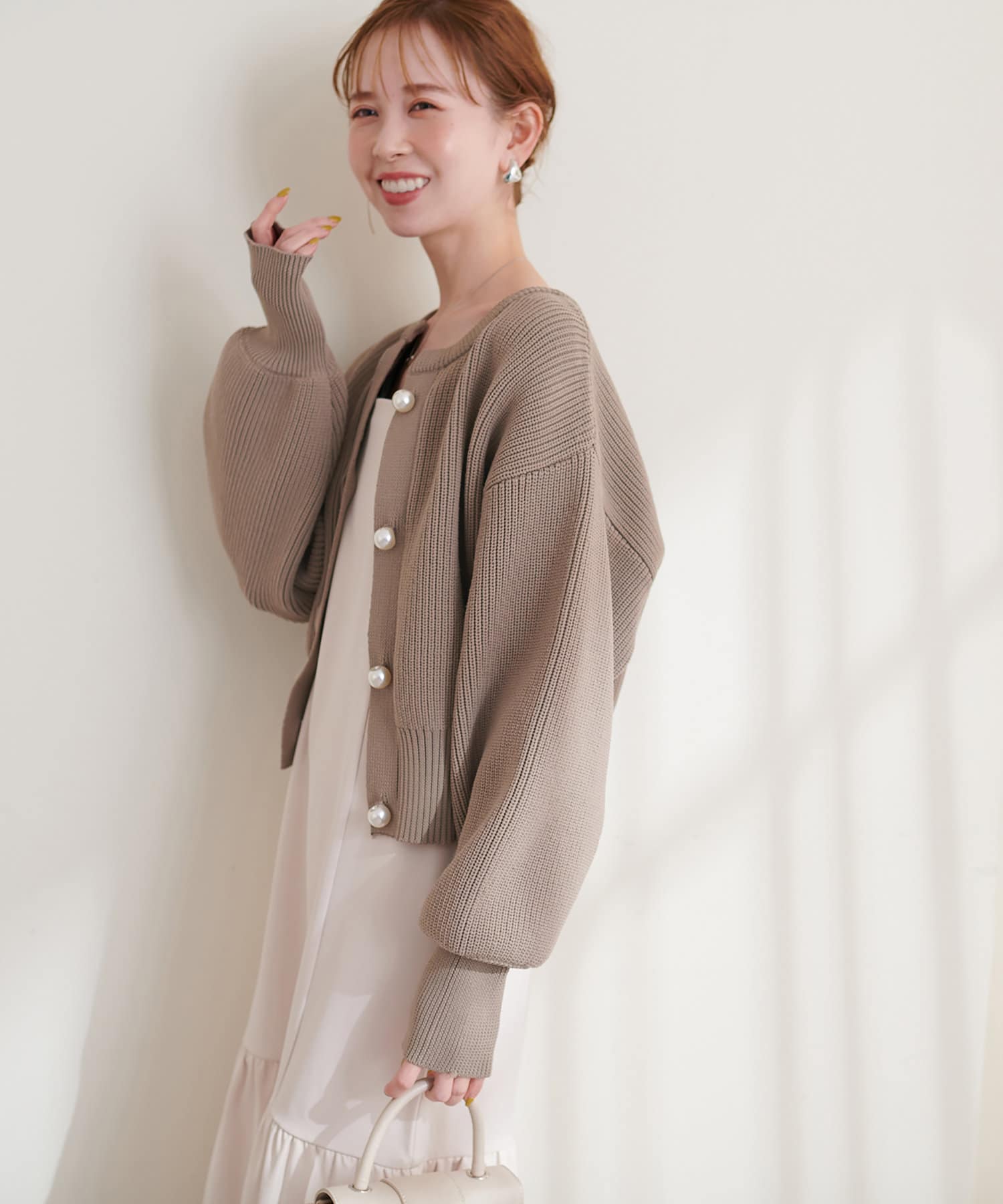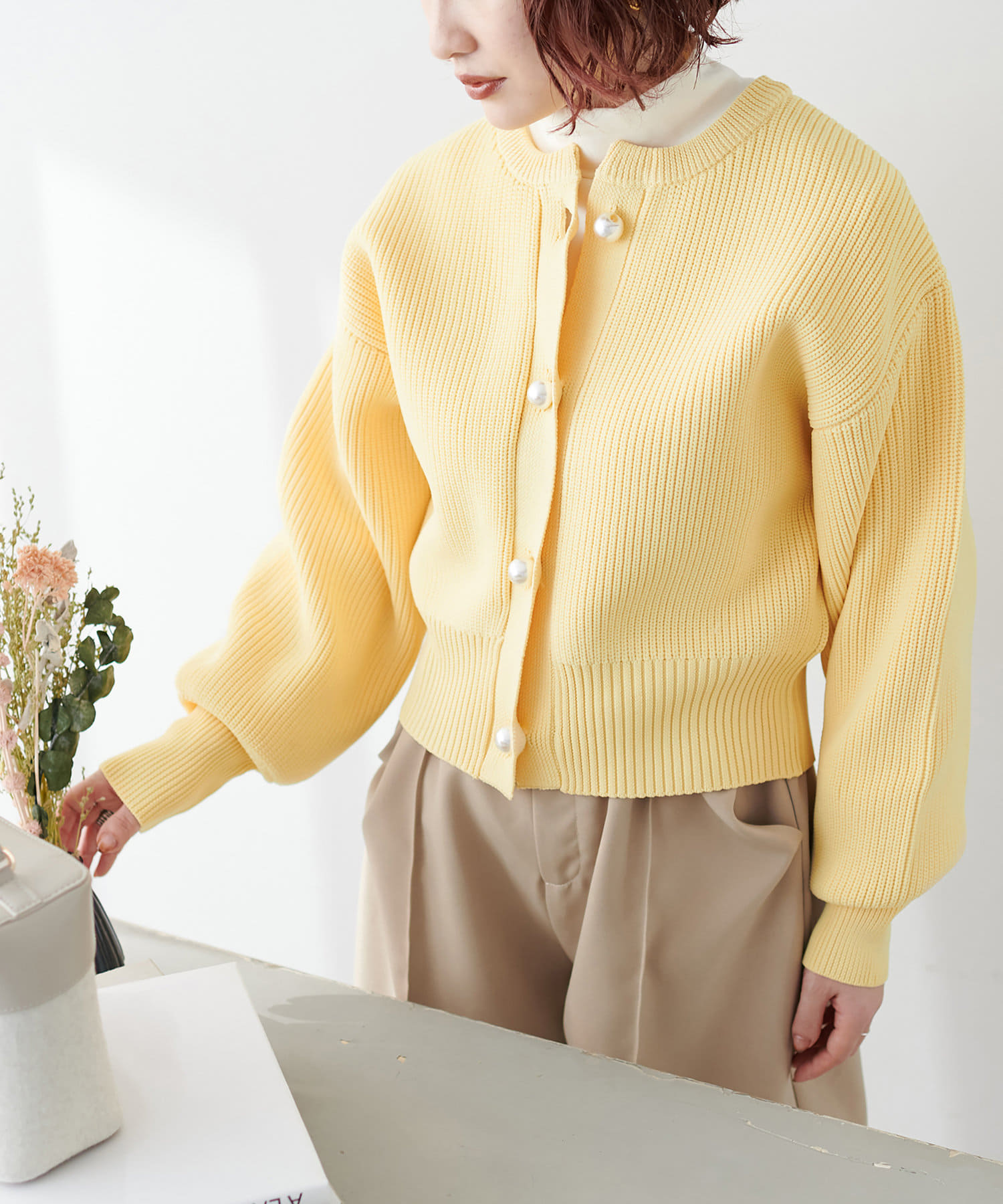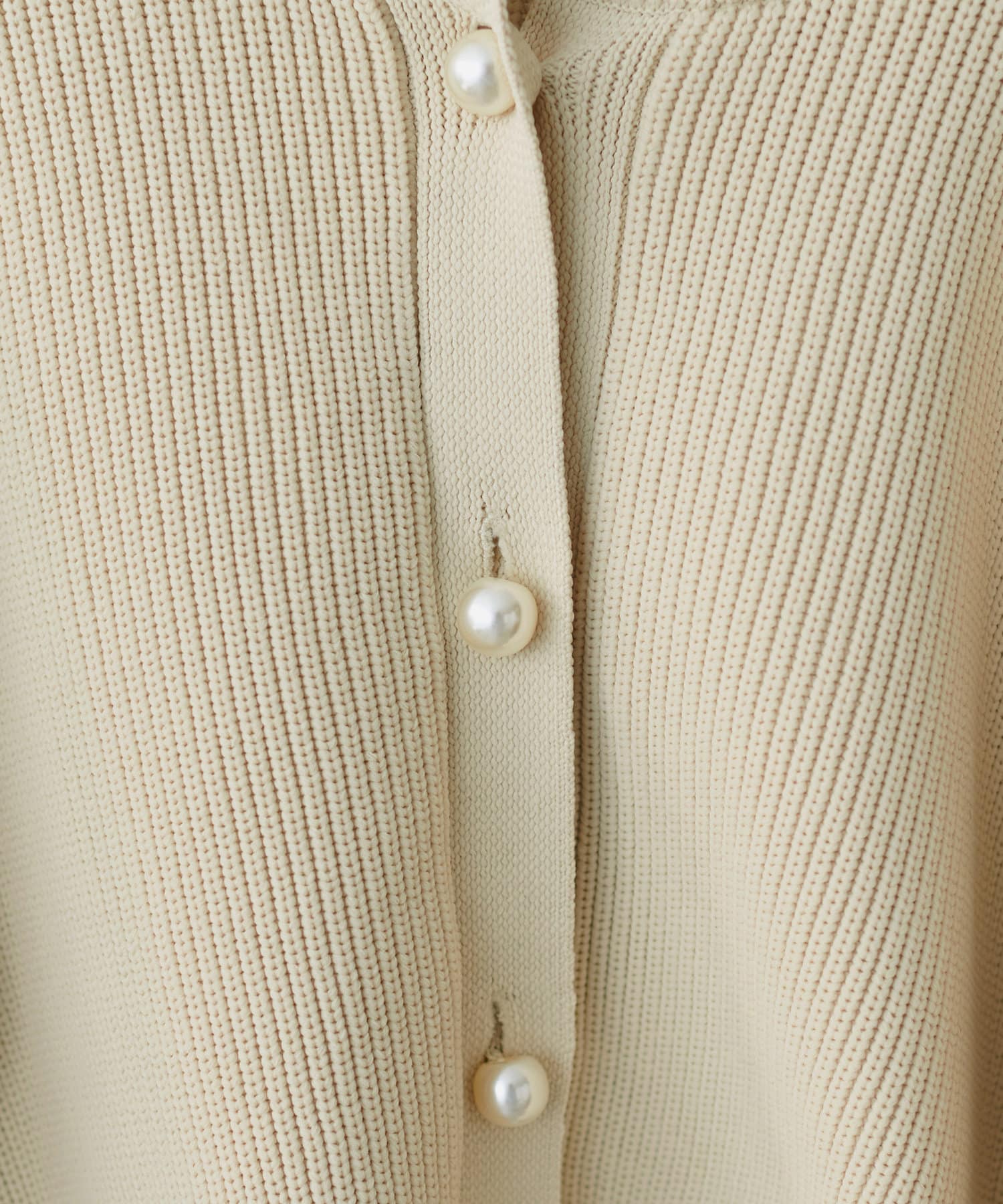 大きなパール釦がレトロな雰囲気を醸し出すニットカーディガン。