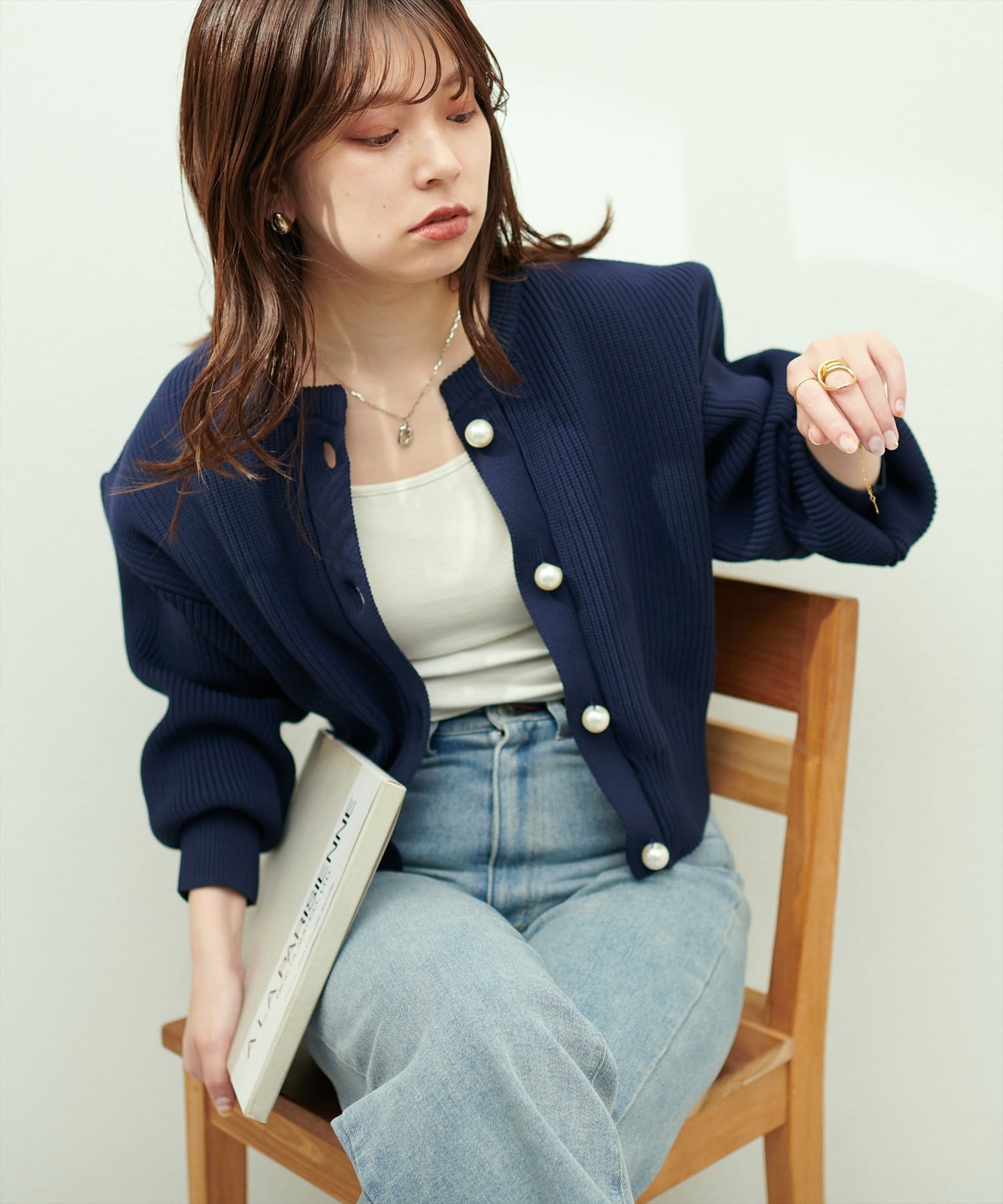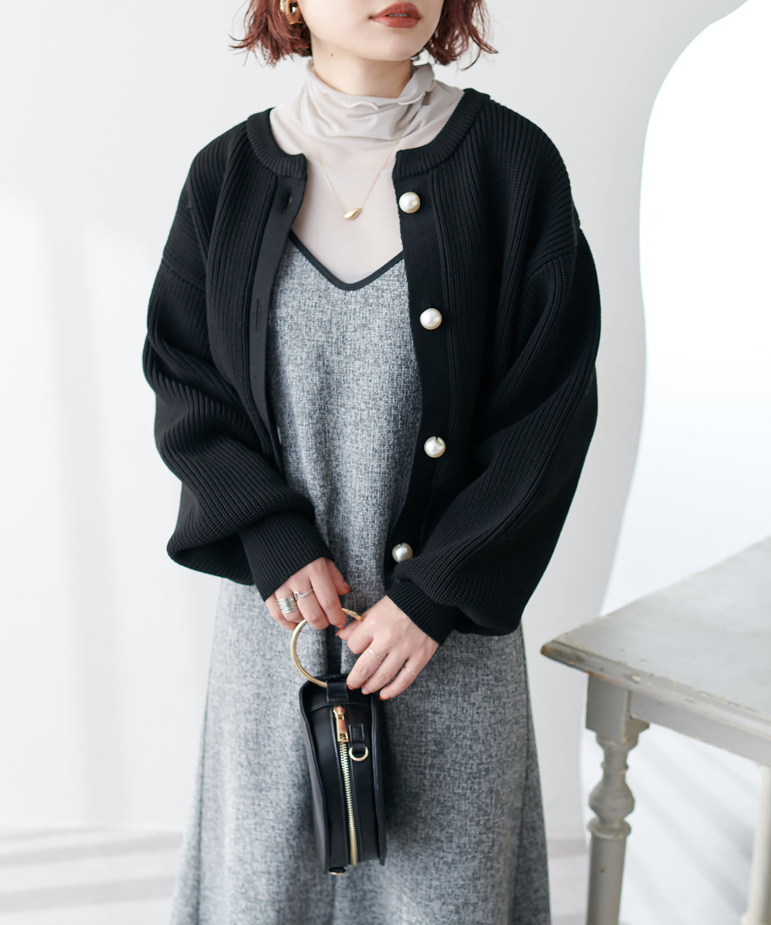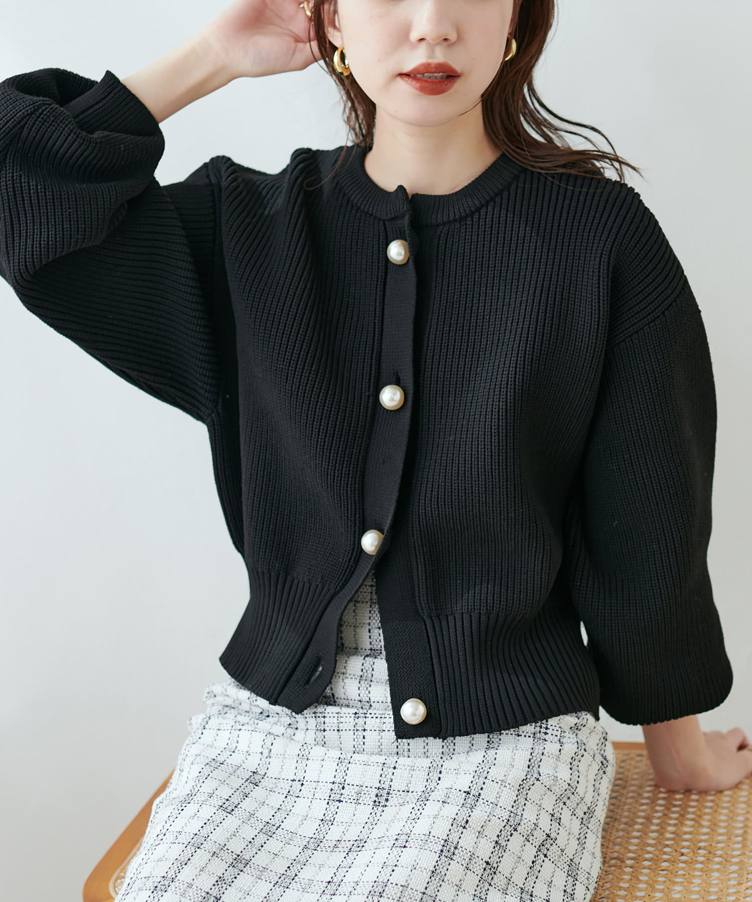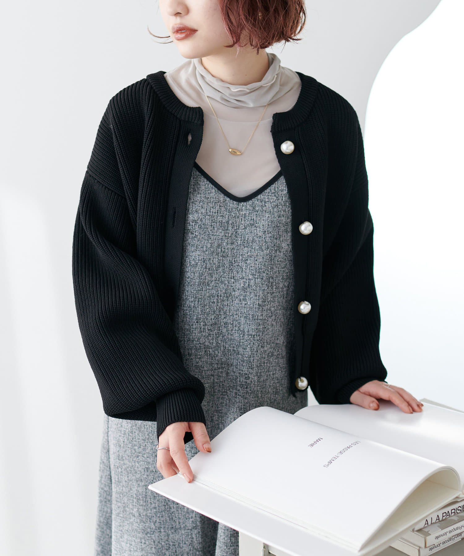 大きなパール釦がレトロな雰囲気を醸し出すニットカーディガン。