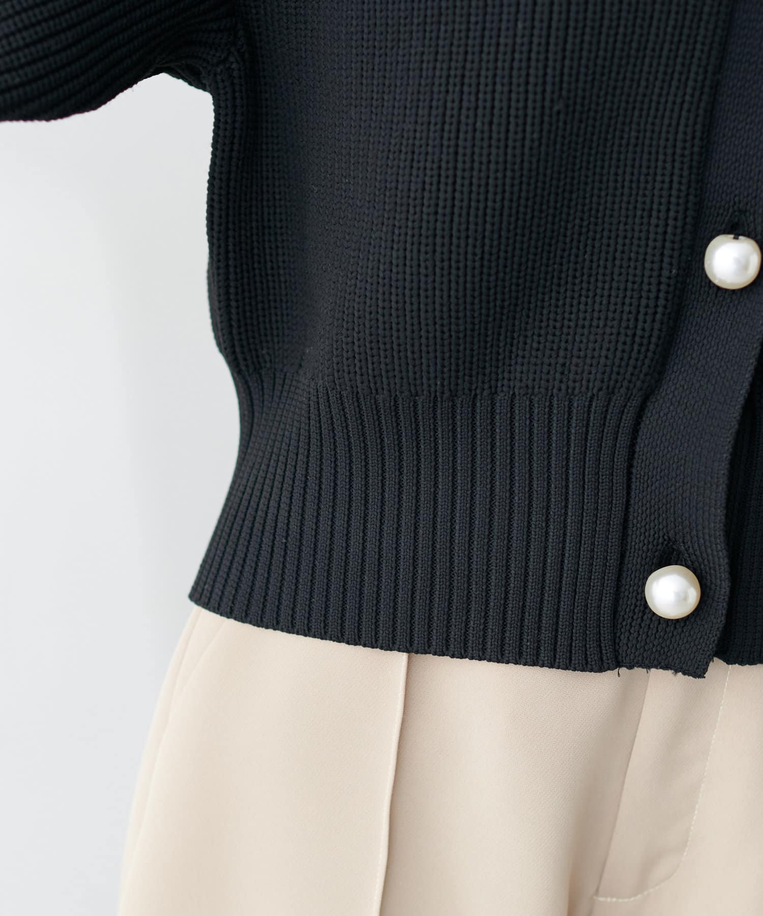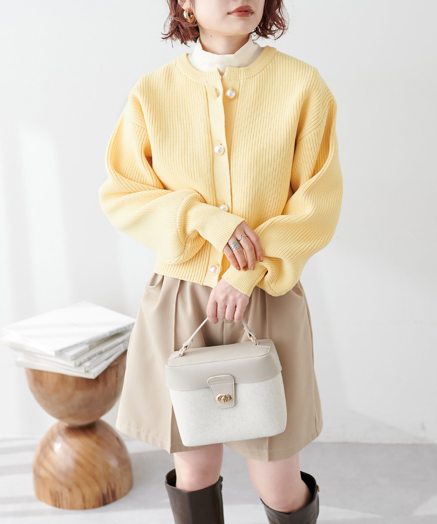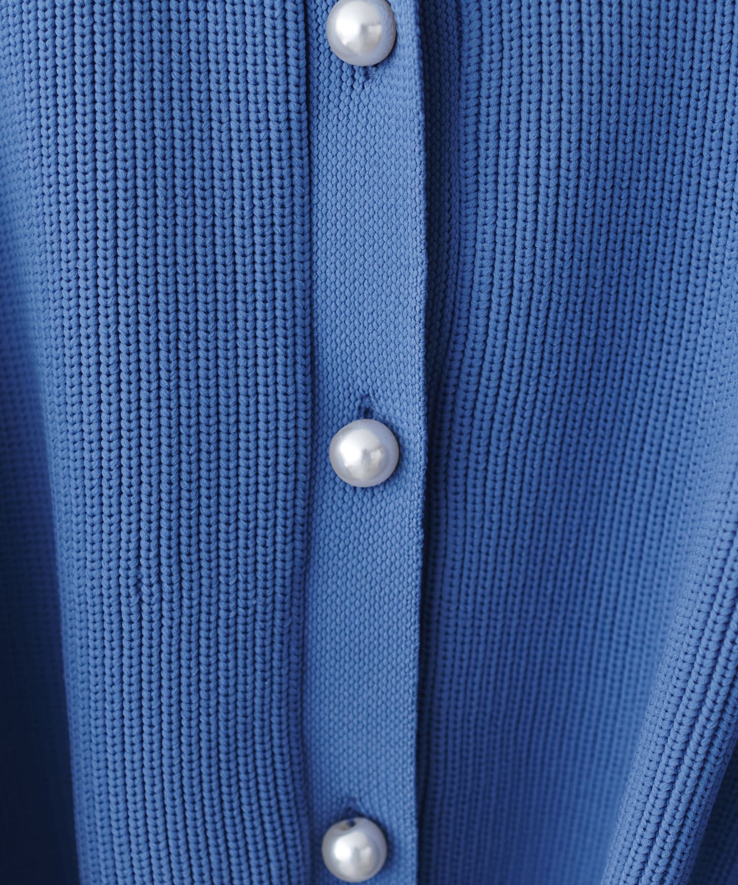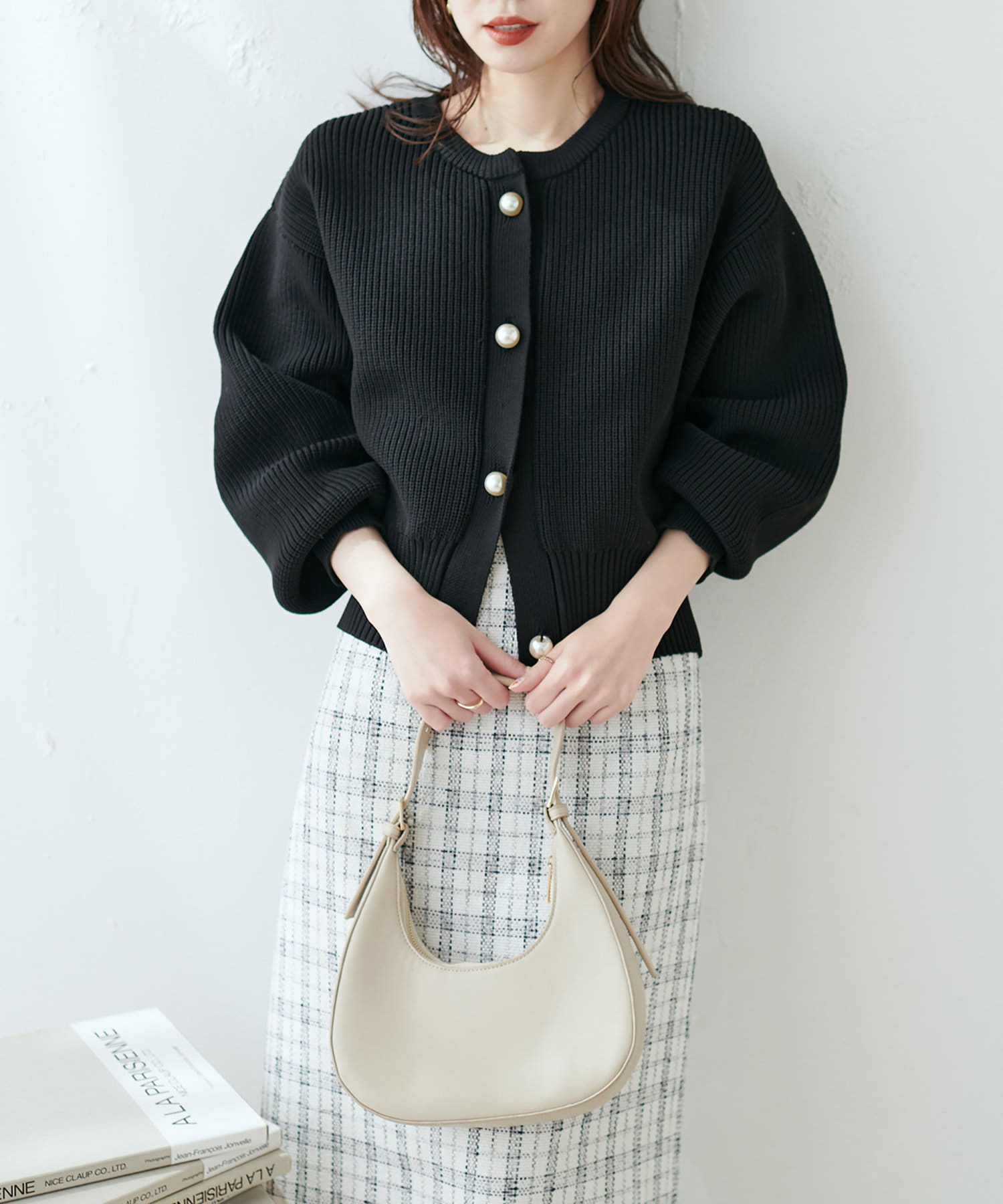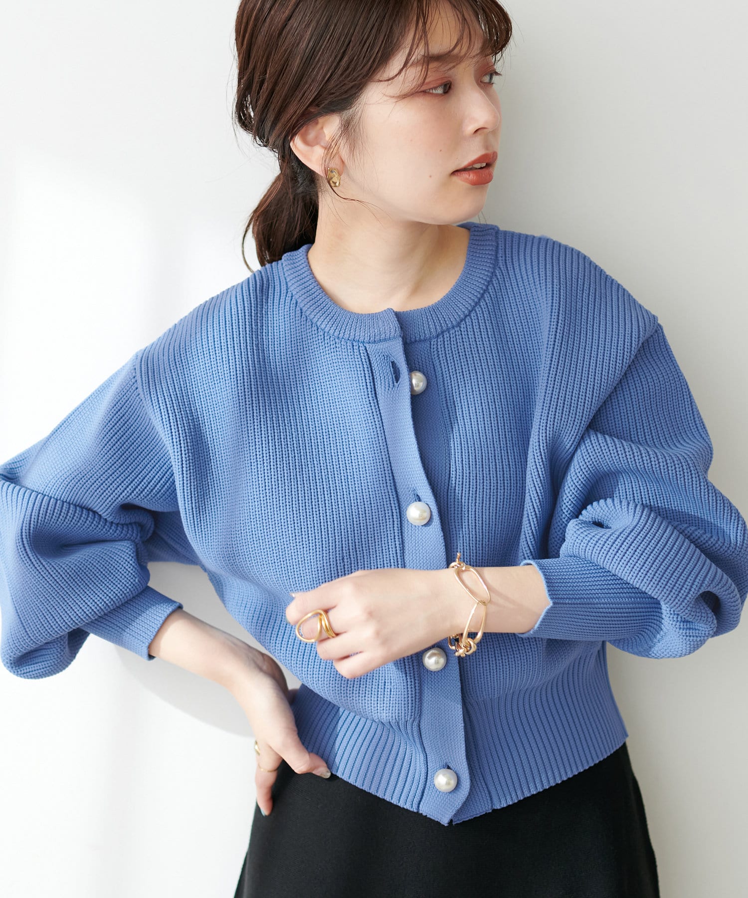 大きなパール釦がレトロな雰囲気を醸し出すニットカーディガン。