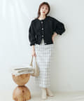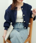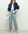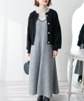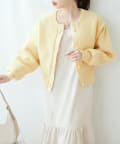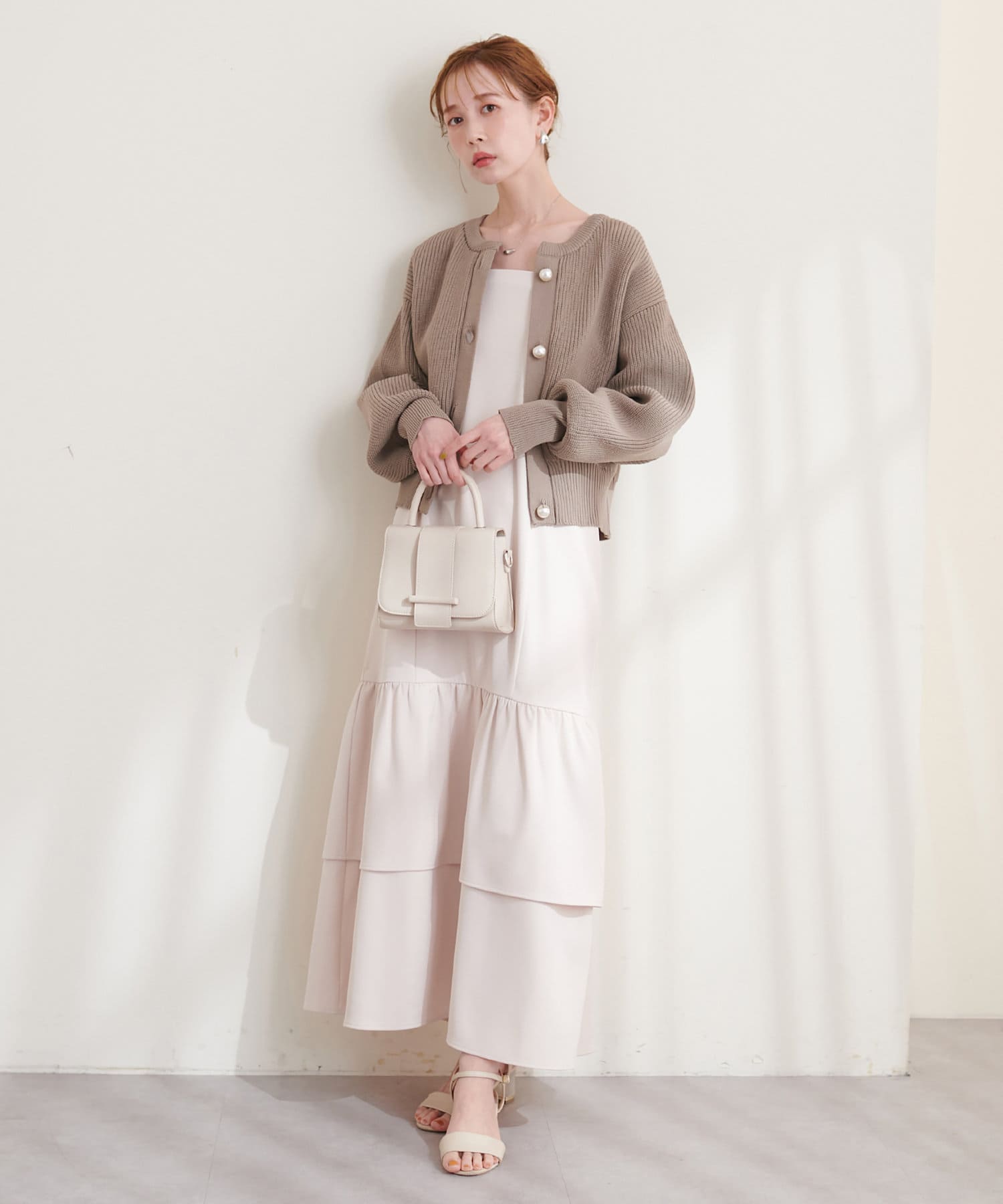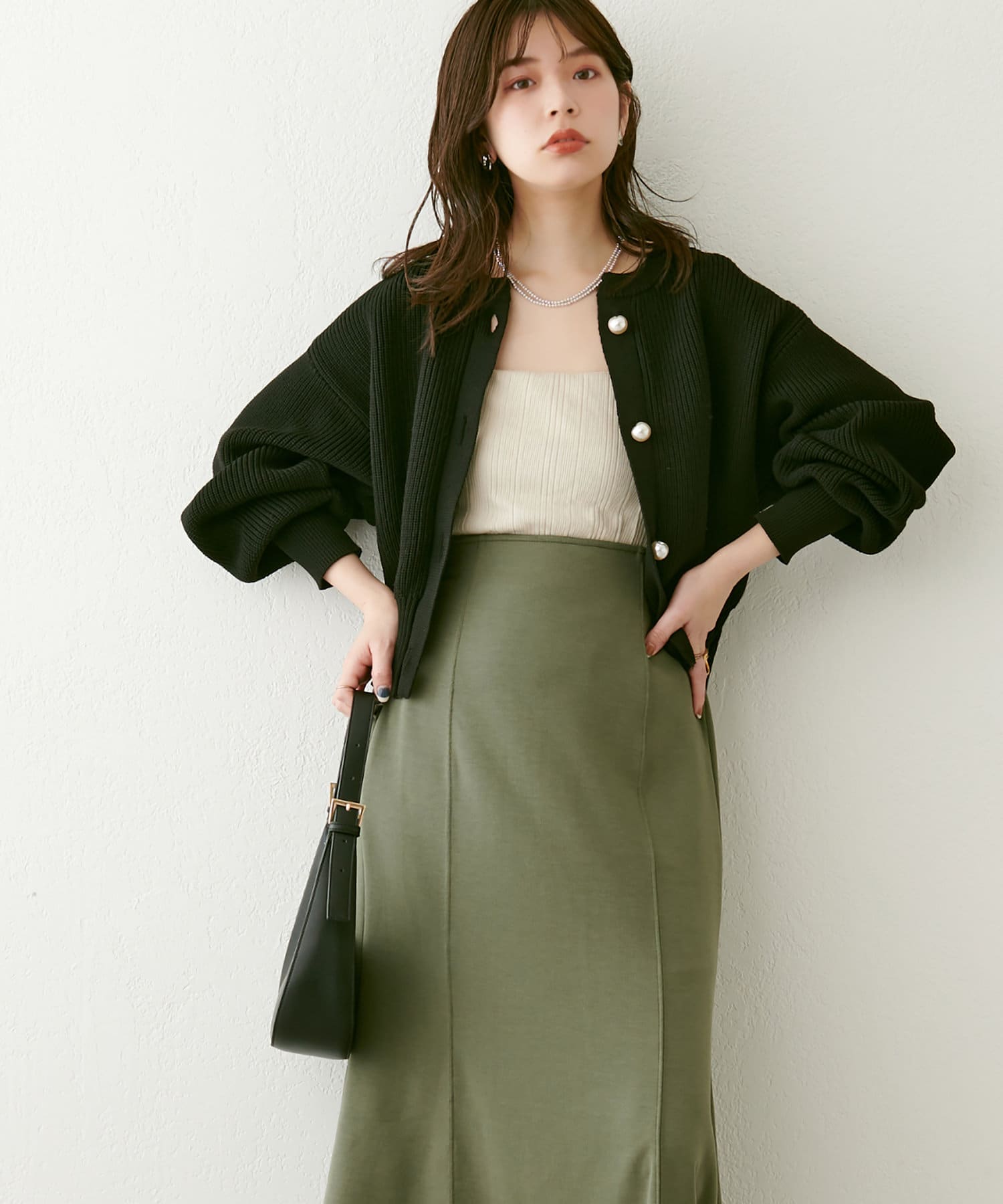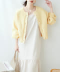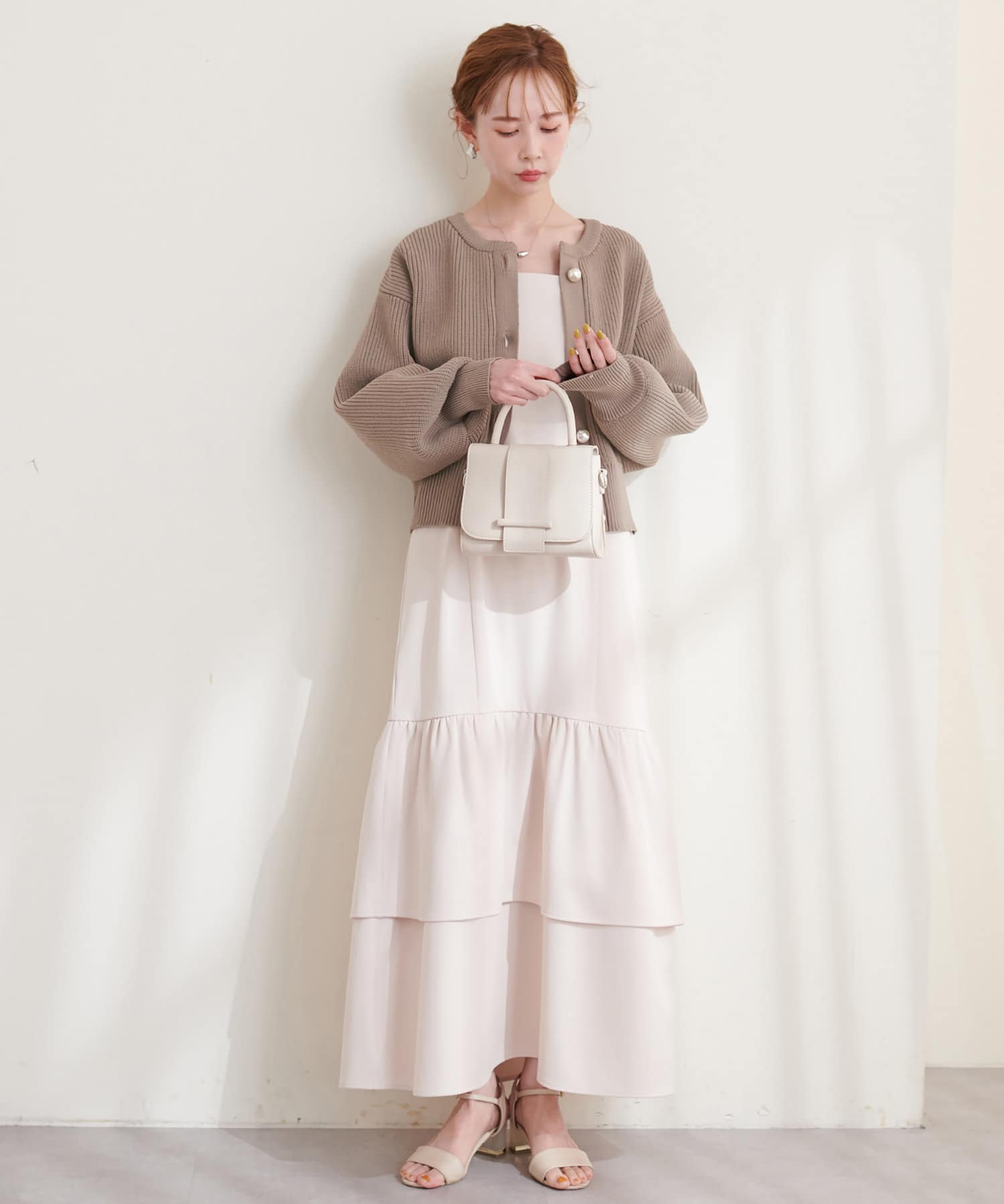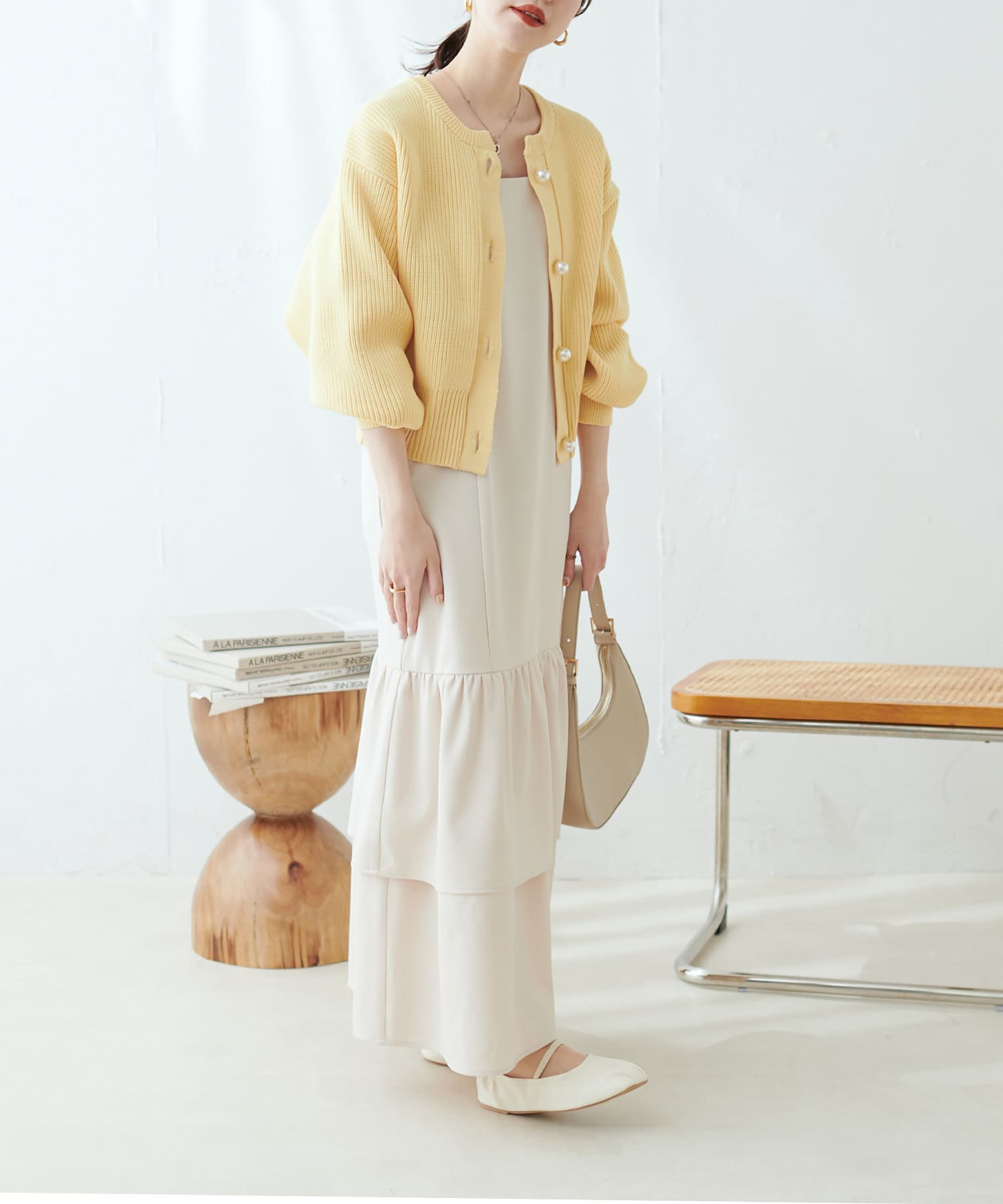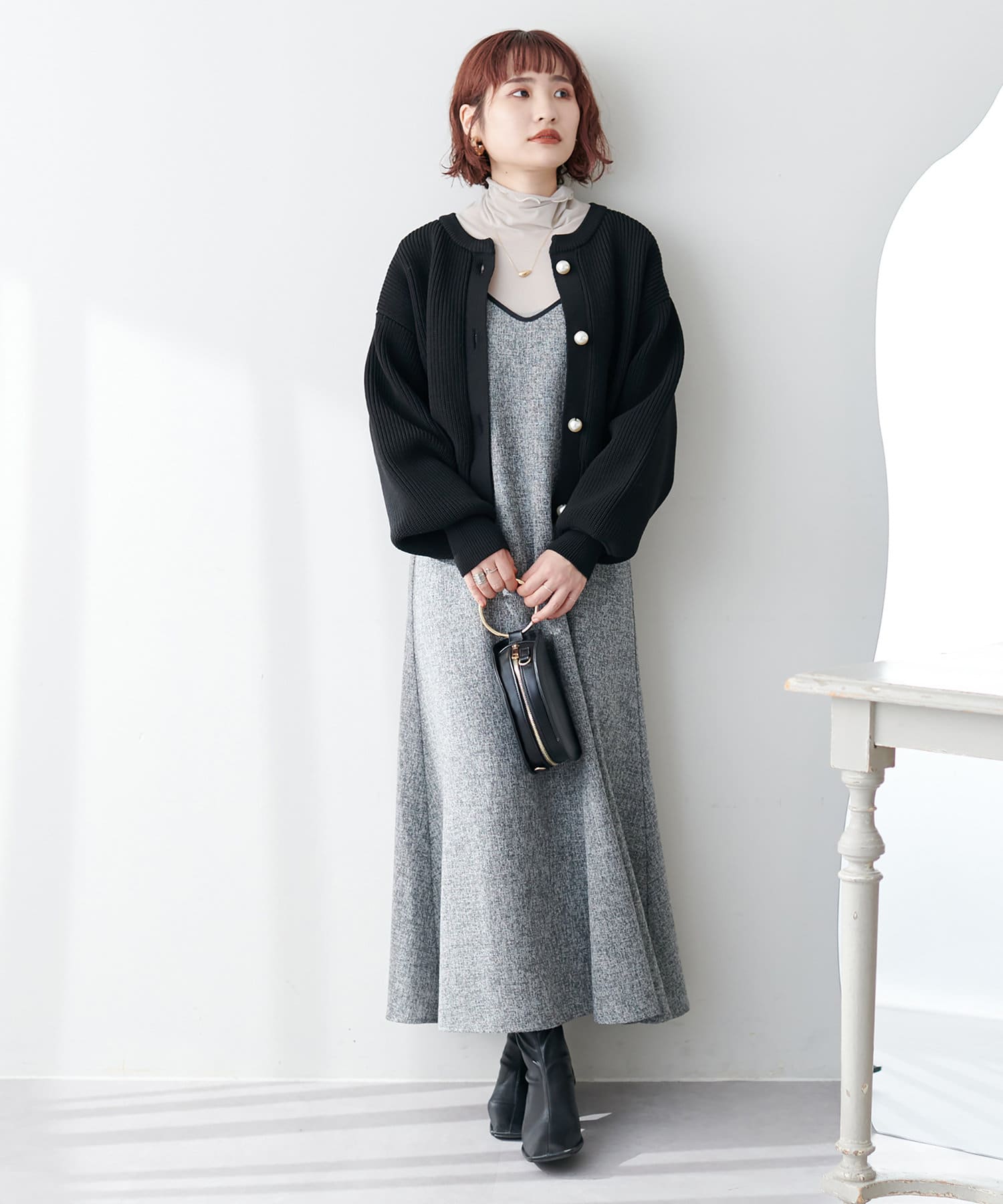 ややショート丈なので、ハイウエストのボトムはもちろんワンピースに重ねるのもおすすめ。