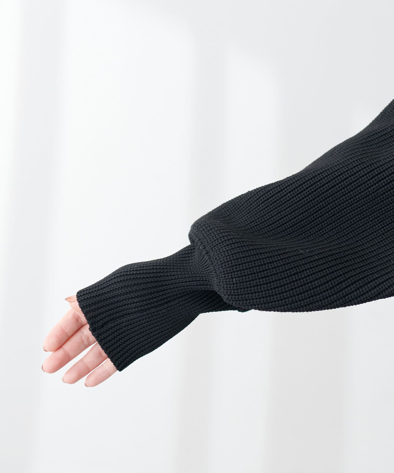 ドロップショルダーで身頃がゆったりしており、ポリニットで編地がしっかりしているので真冬も暖か。