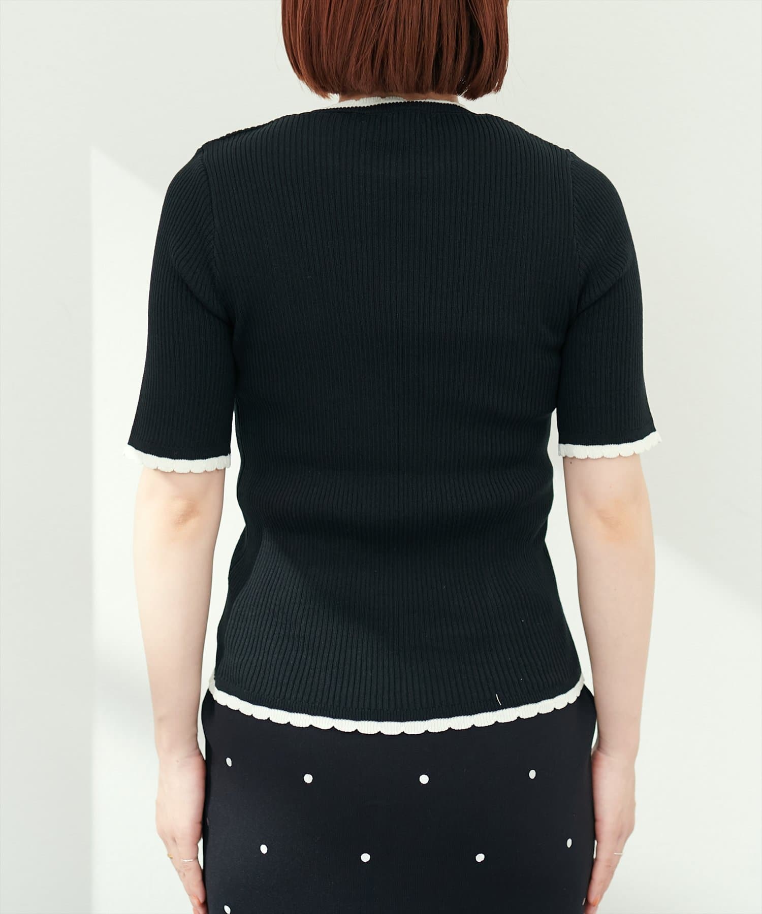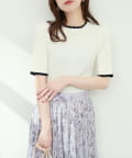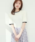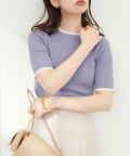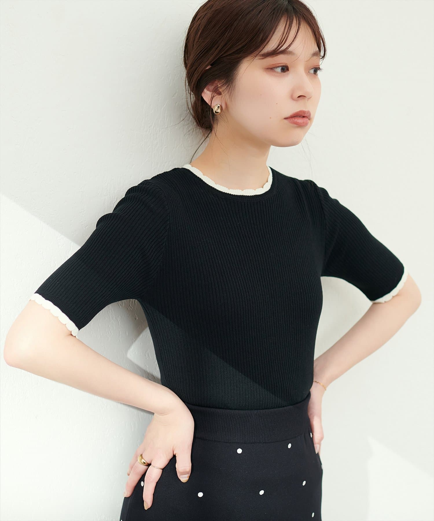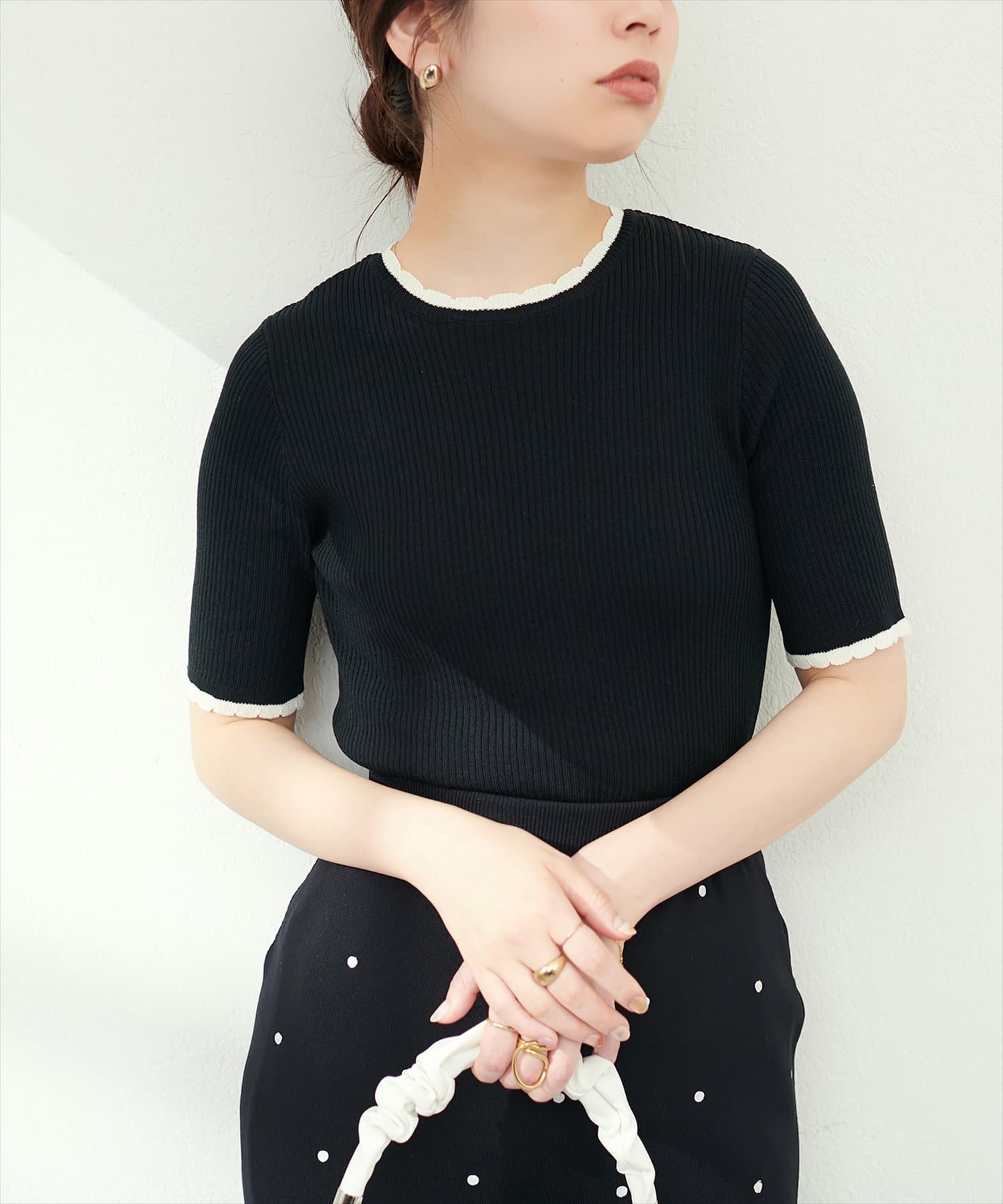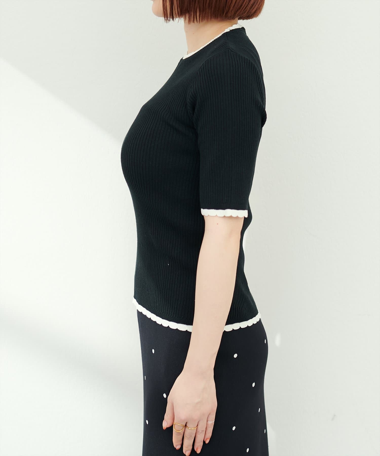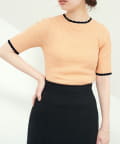 配色がアクセントになったラウンドネックの半袖リブニット。