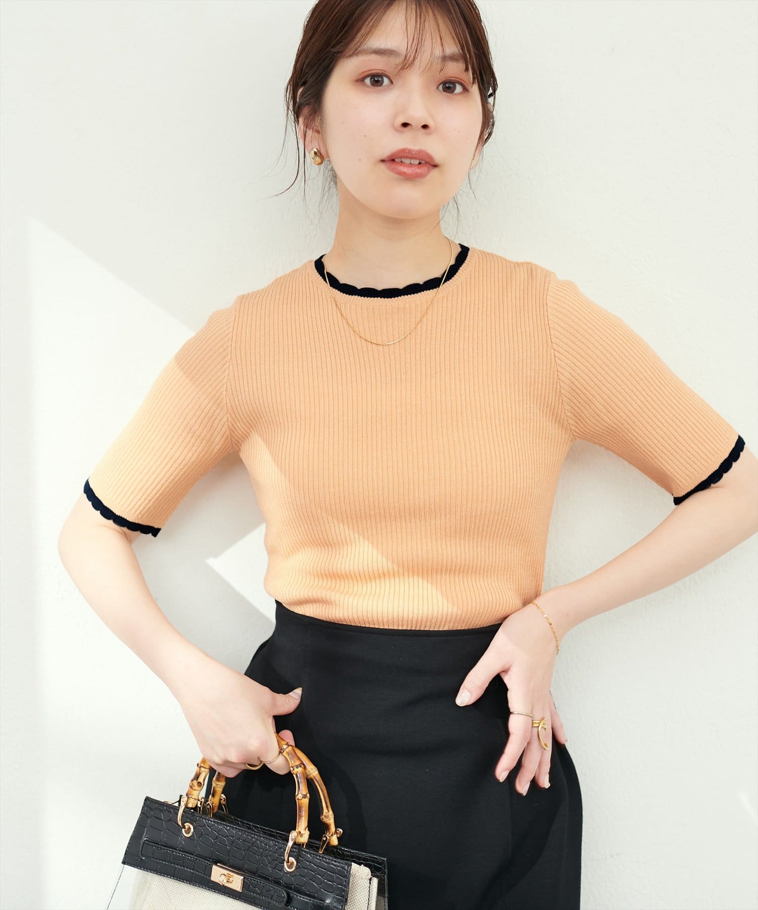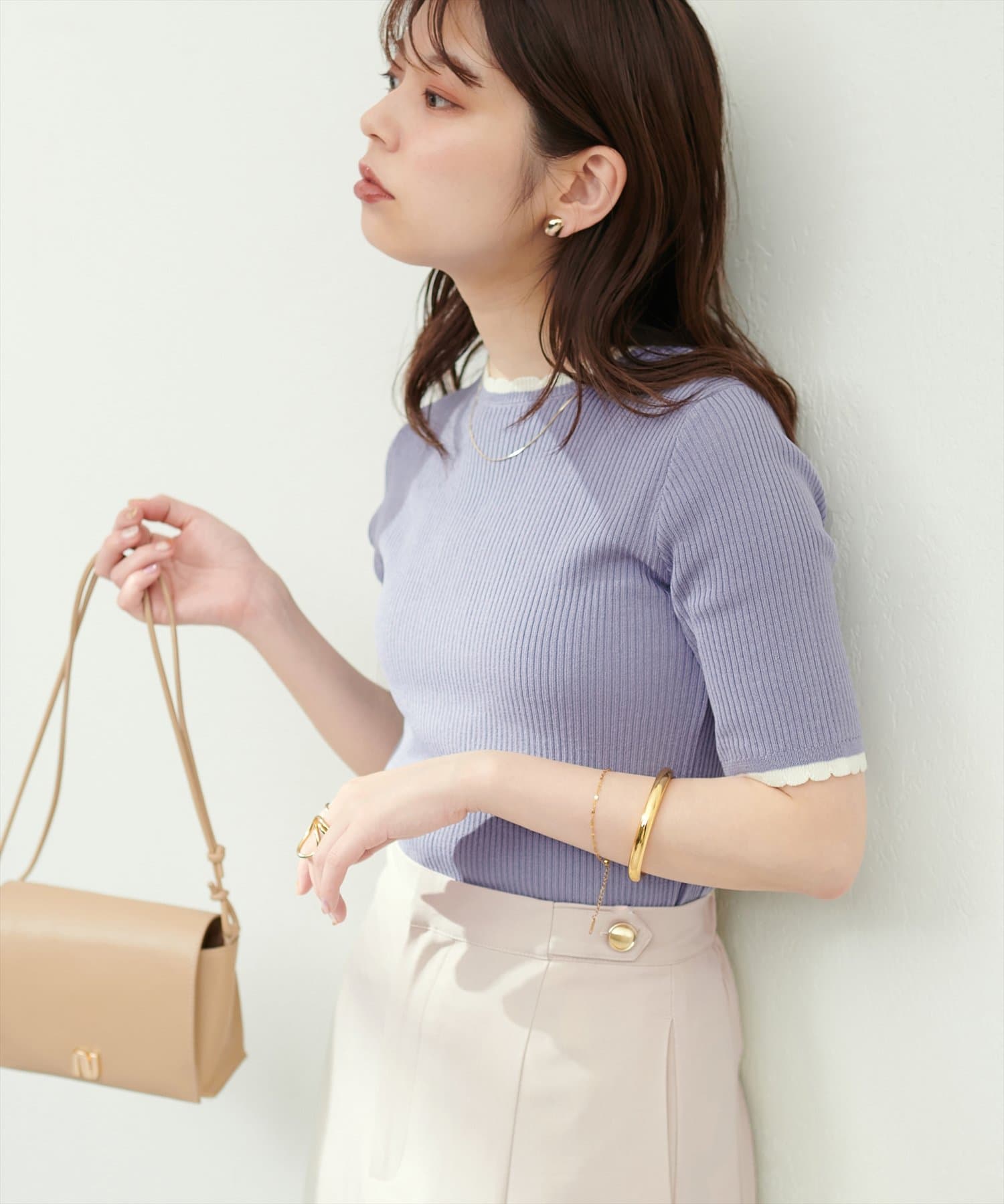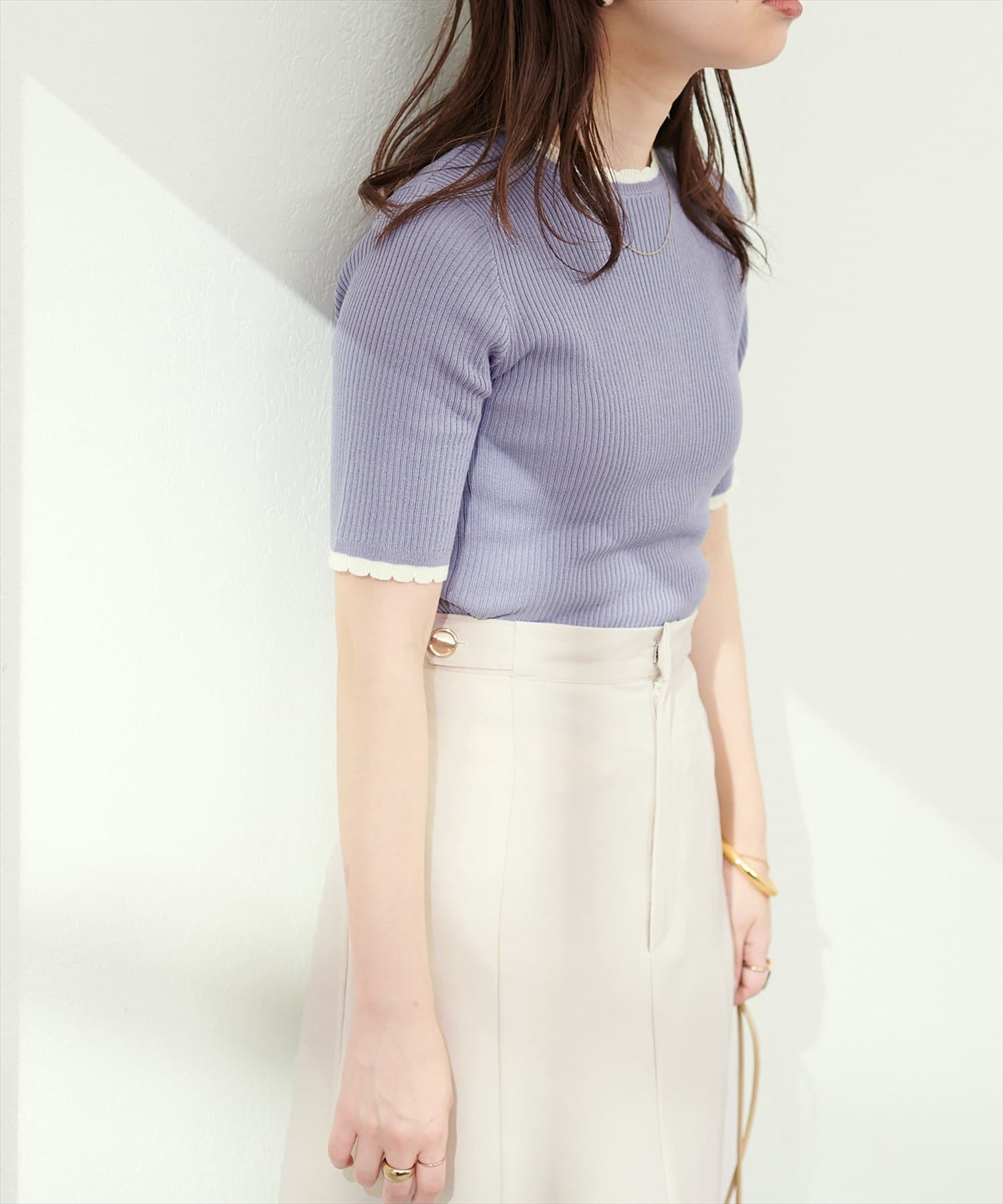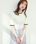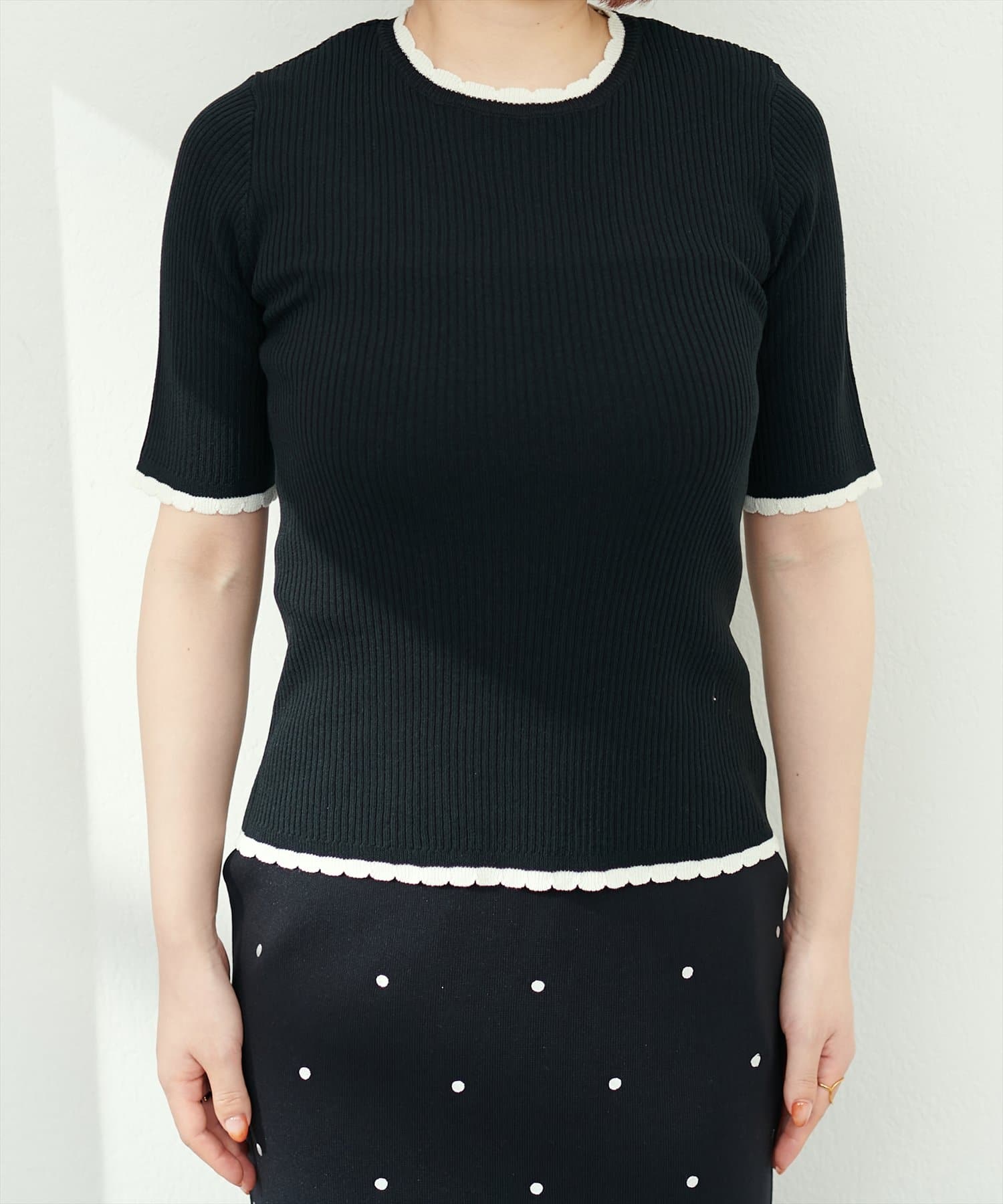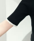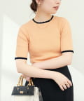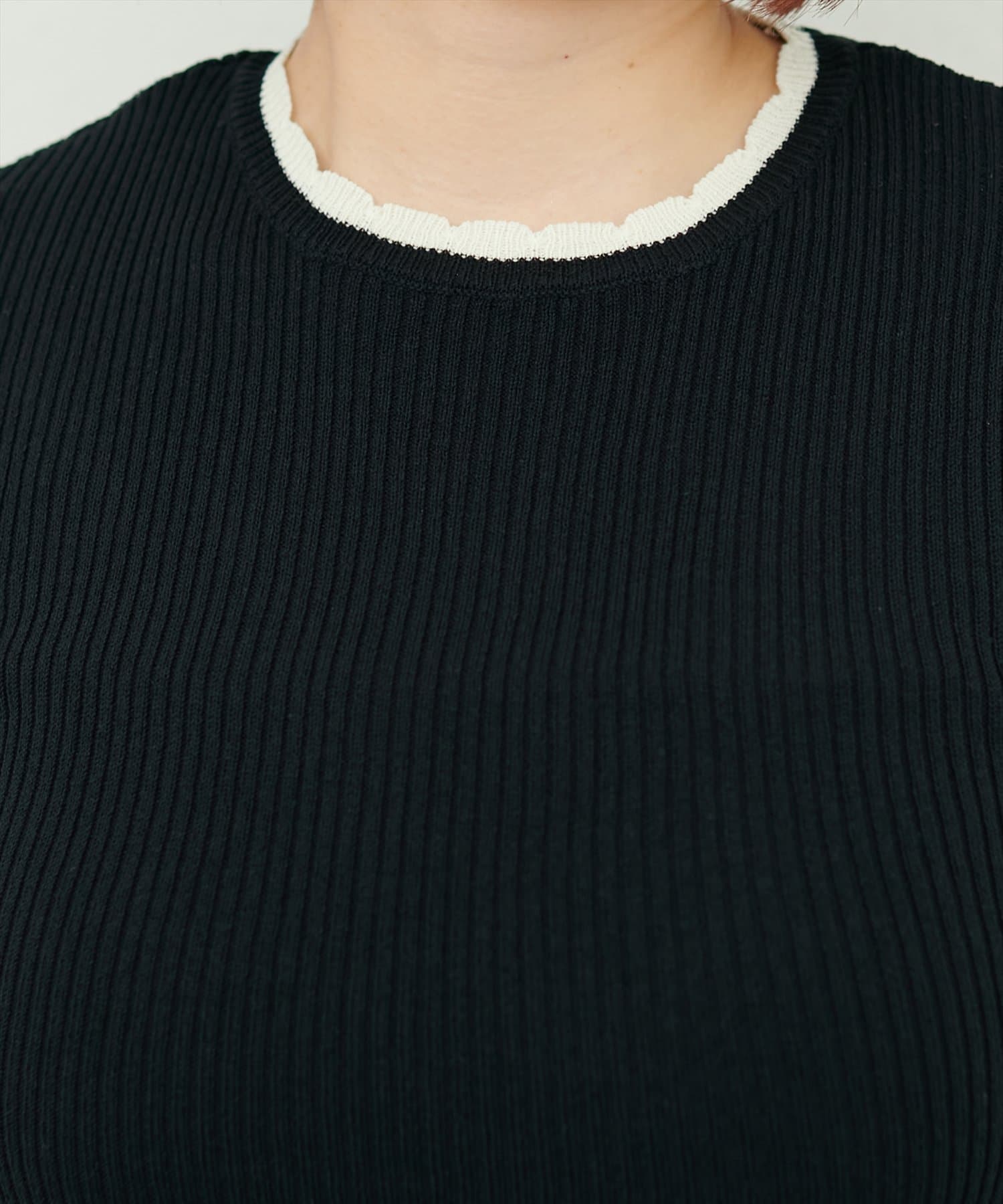 配色がアクセントになったラウンドネックの半袖リブニット。