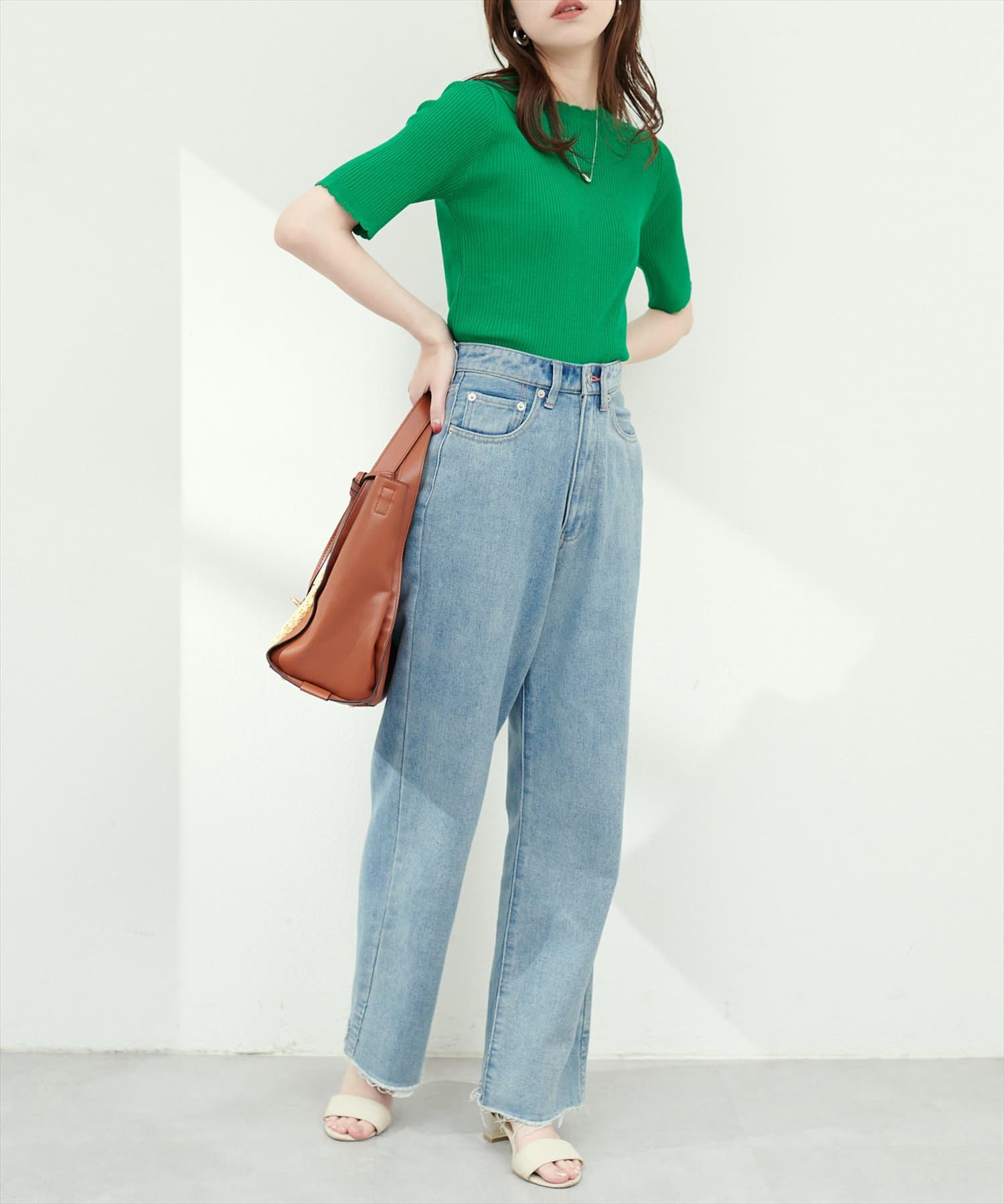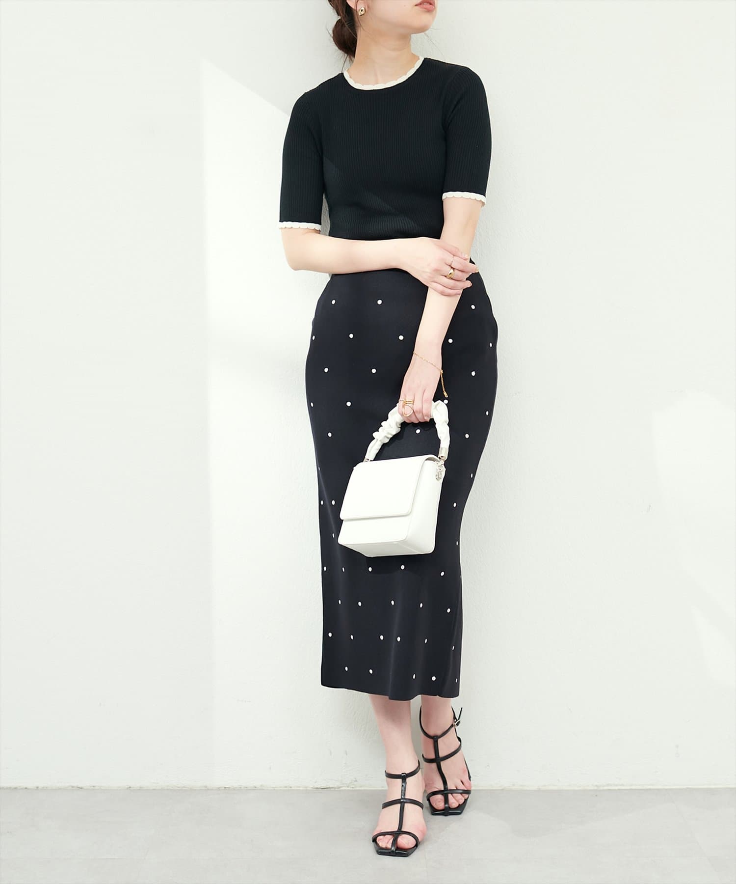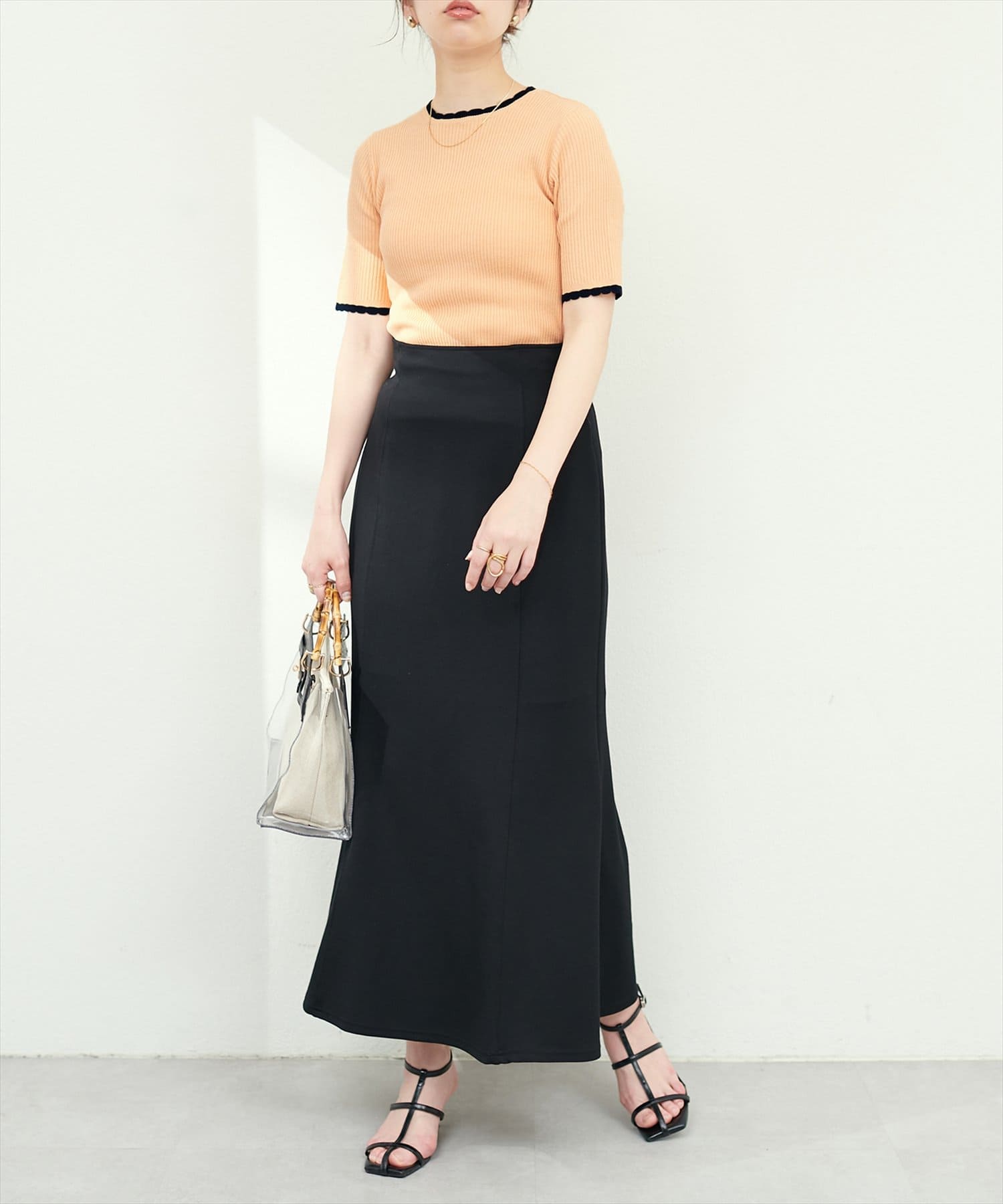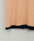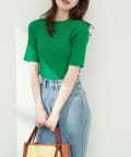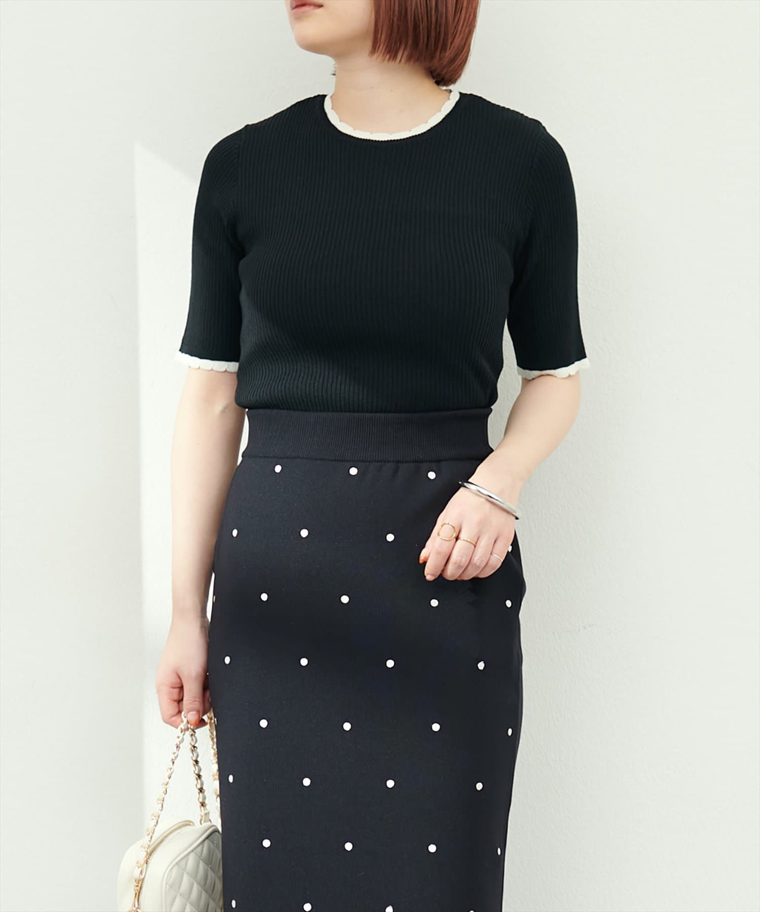 配色がアクセントになったラウンドネックの半袖リブニット。