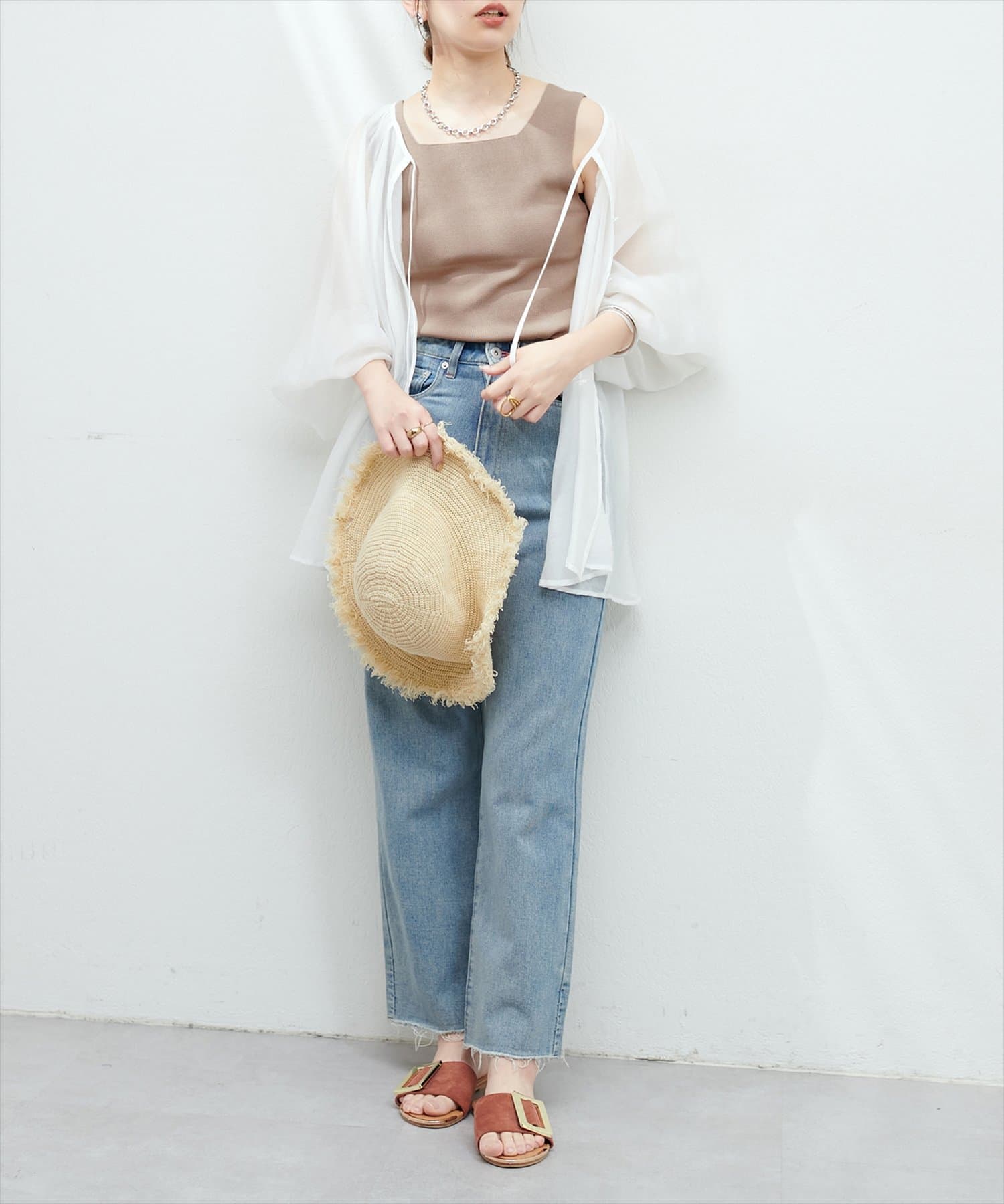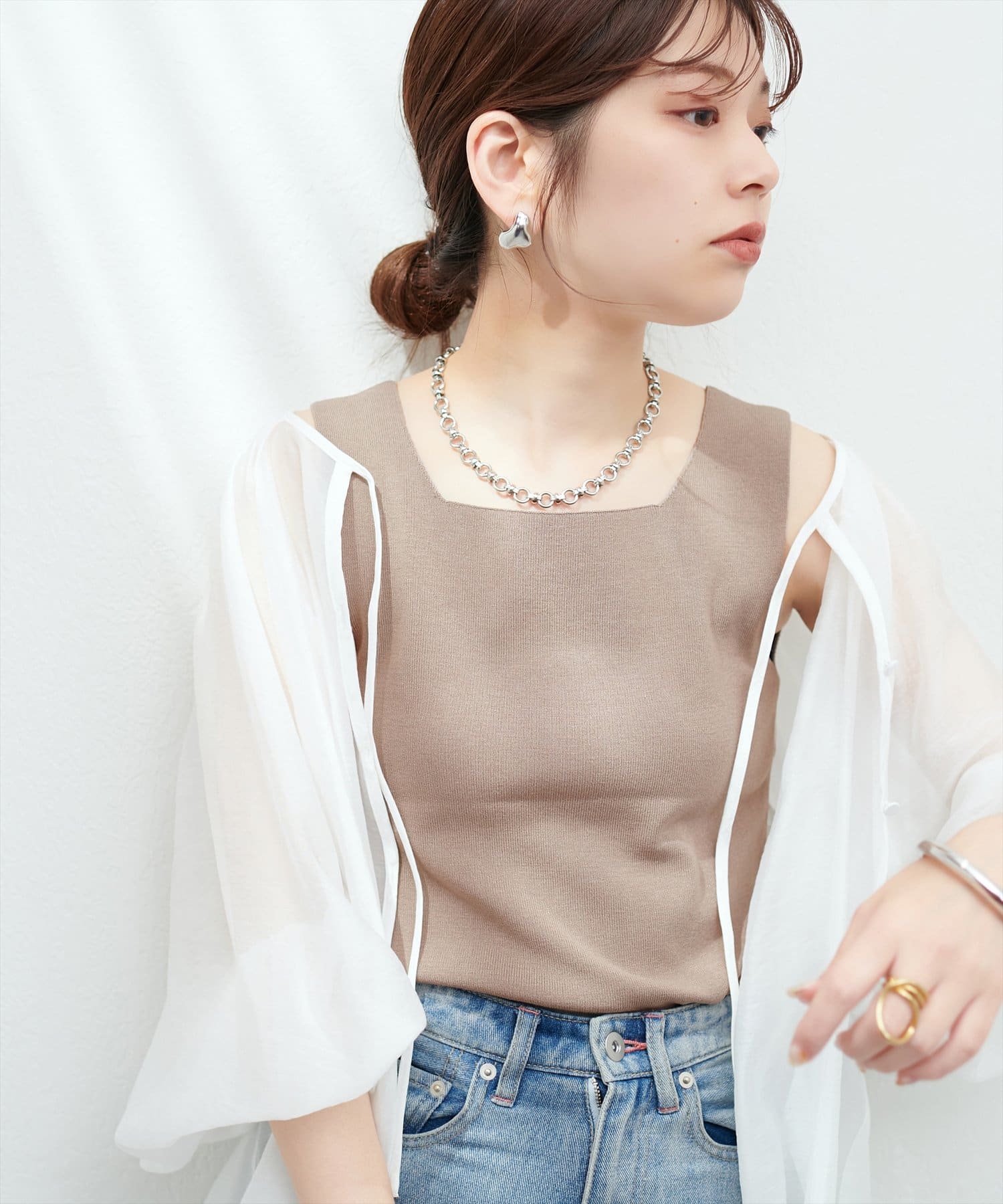 トレンドのシアーシャツやリネンシャツのインナーにするのがおすすめ。